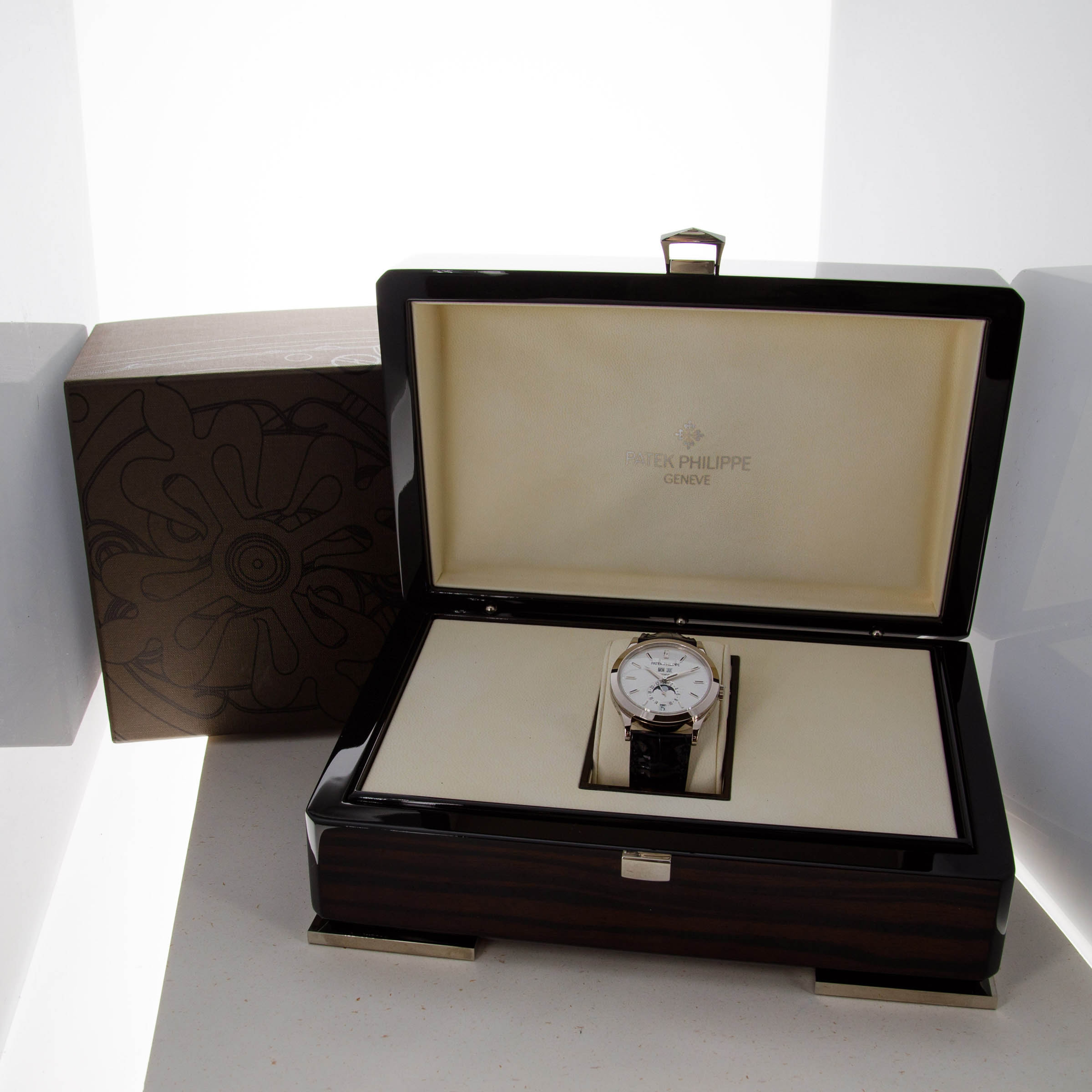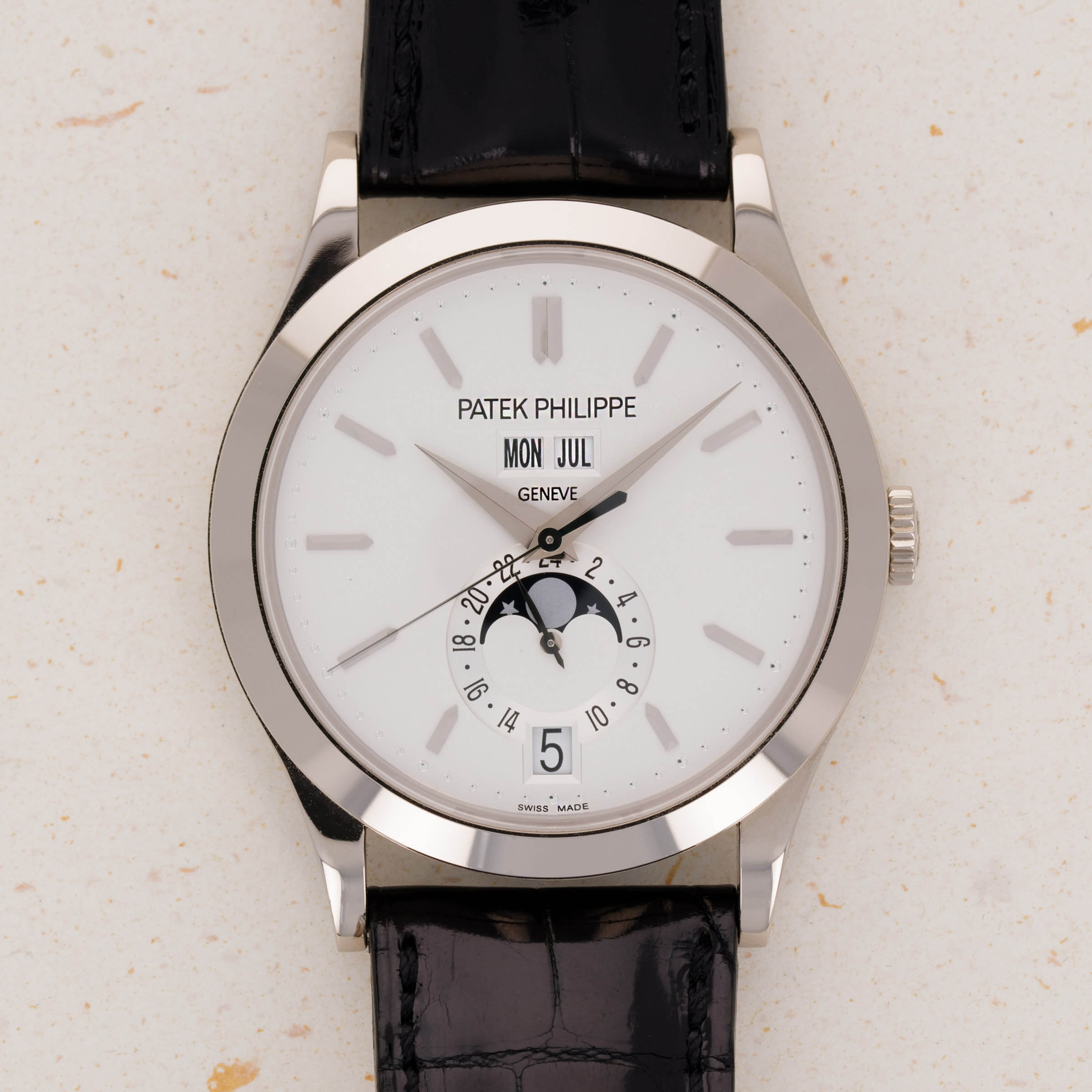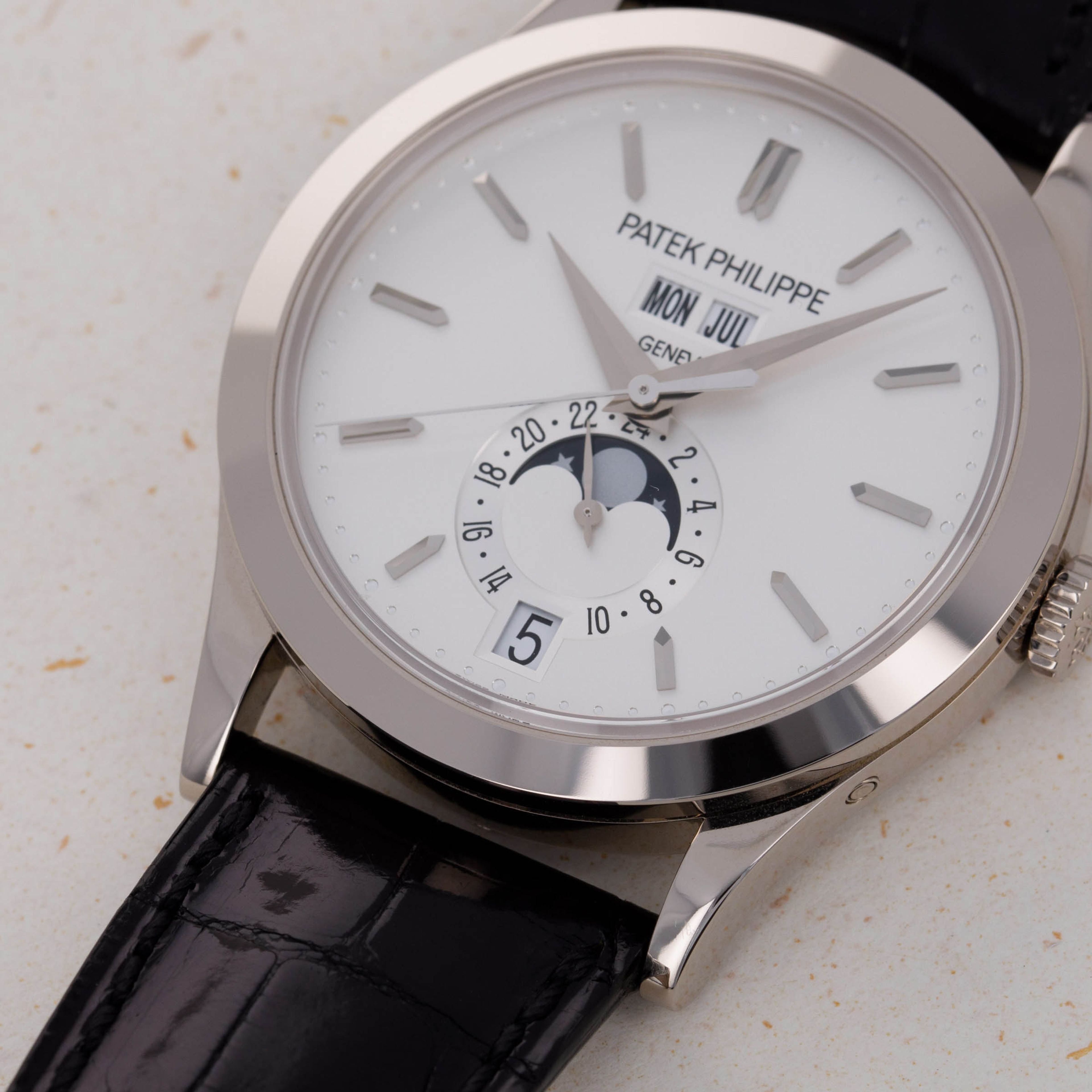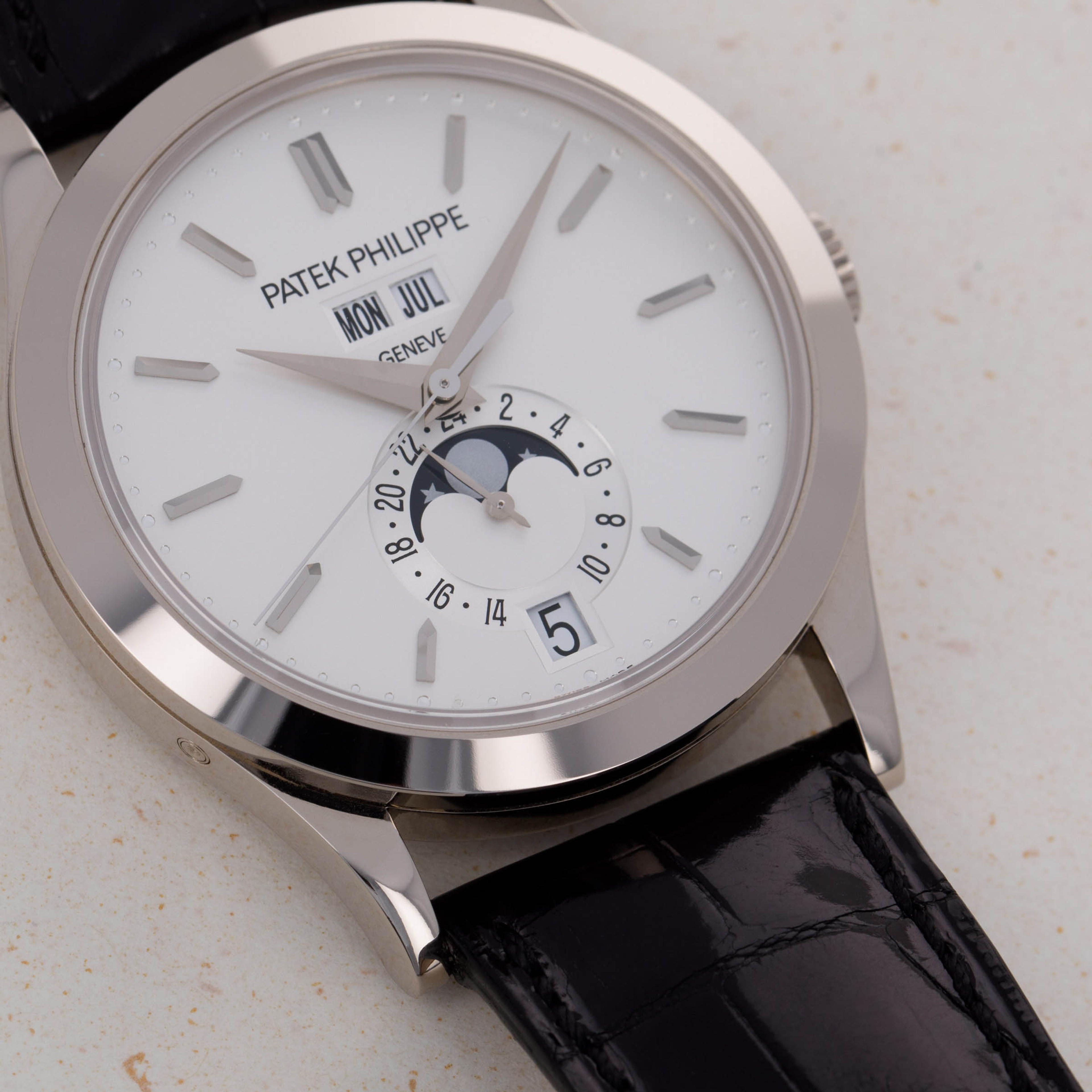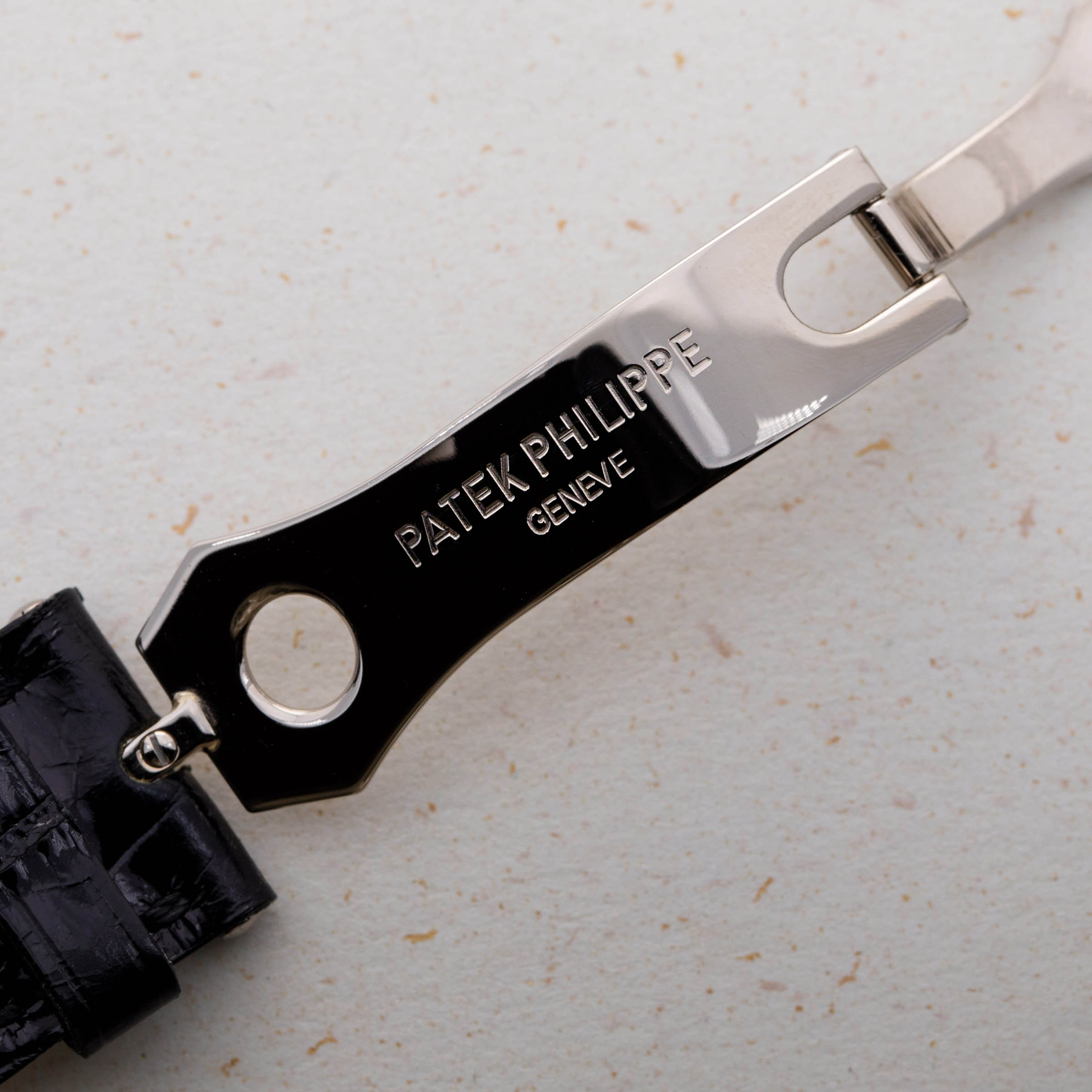 Renowned for their groundbreaking innovations in watchmaking, Patek Philippe holds an indisputable position as one of the most esteemed watchmakers to ever grace the industry. Central to their array of complications is the iconic annual calendar, a balance between the complex perpetual calendar and the triple calendar. The inaugural model, the ref. 5035, debuted in 1996, marking Patek Philippe's recognition of the need for an intermediate calendar. The watch we have here, however, is a modern interpretation of the ref. 5035, the Annual Calendar ref. 5396 which was debuted in 2006. Made of 18kt white gold, it features a 38.5mm x 11.2mm Calatrava-style case and a polished bezel that exudes understated elegance and sits comfortably on the wrist. Notable for its symmetrical dial layout in silver, the ref. 5396 features day and month apertures at 12 o’clock, a central time display, a sub-dial with moon-phase and 24-hour indicator, and a perfectly positioned date window at 6 o'clock. Its overarching design echoes the classic ref. 3448 from the 1960s, showcasing a timeless and elegant aesthetic. This Patek Philippe ref. 5396G-011 Annual Calendar emerges as a compelling modern dress watch, combining simplicity, mechanical complexity, and classic appeal in perfect harmony.