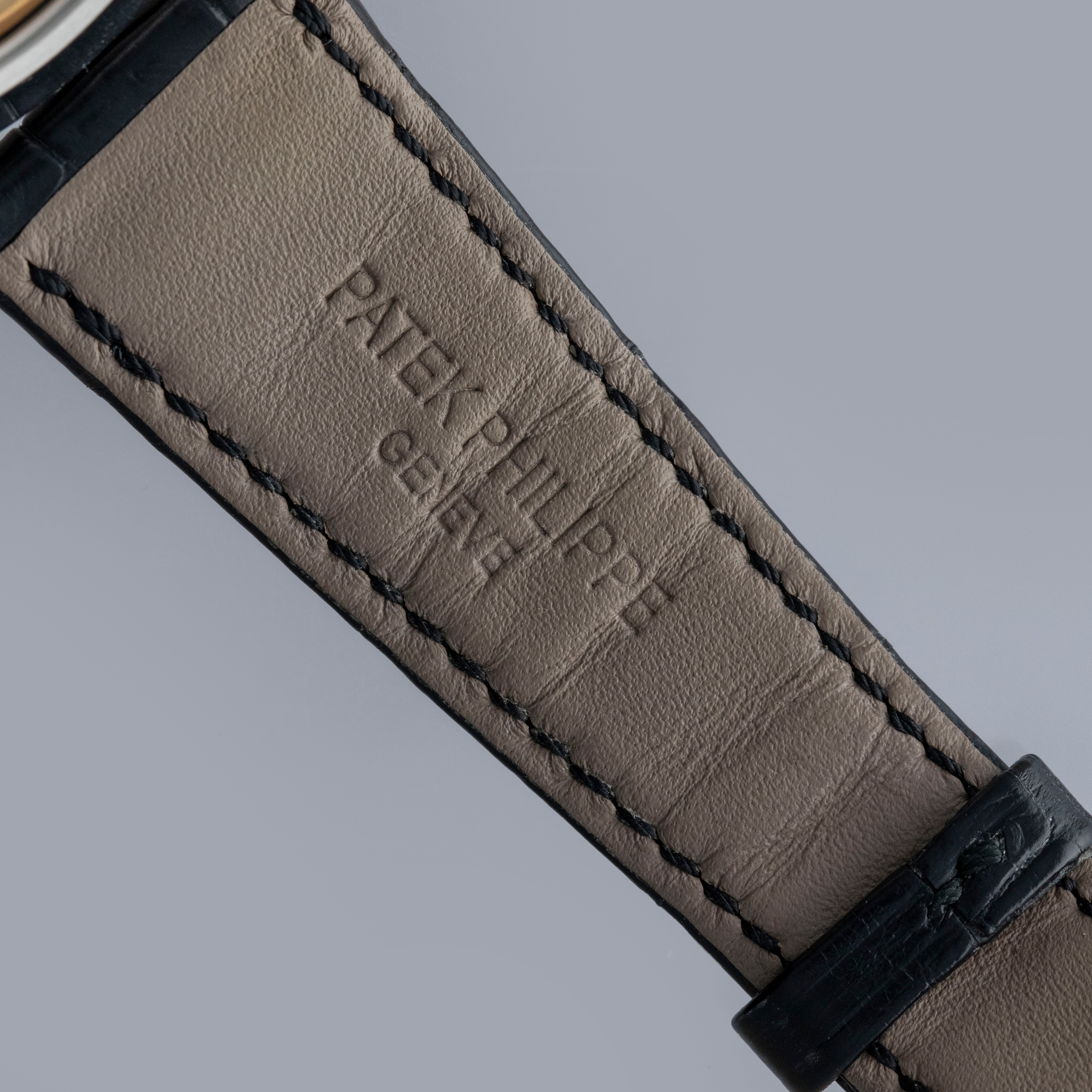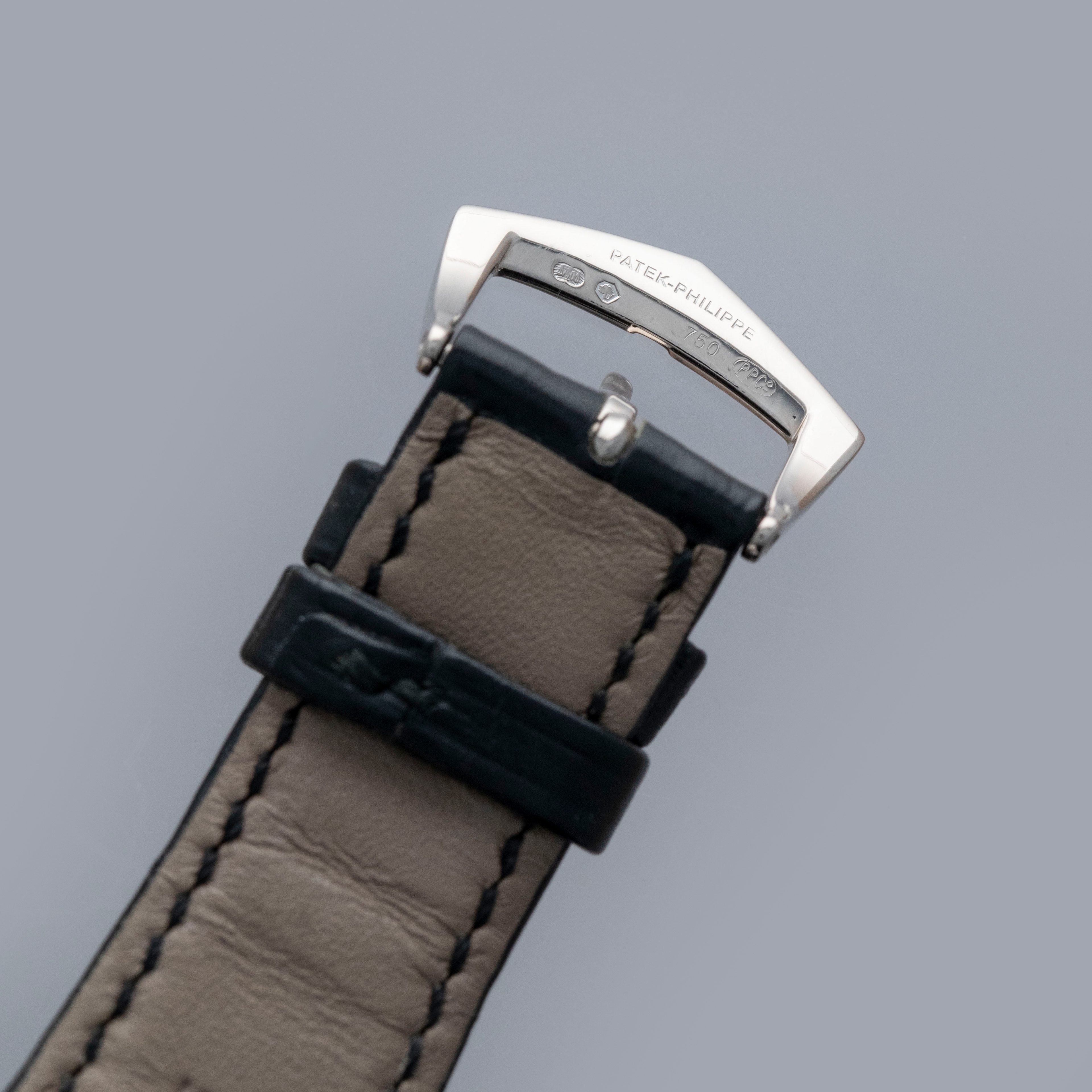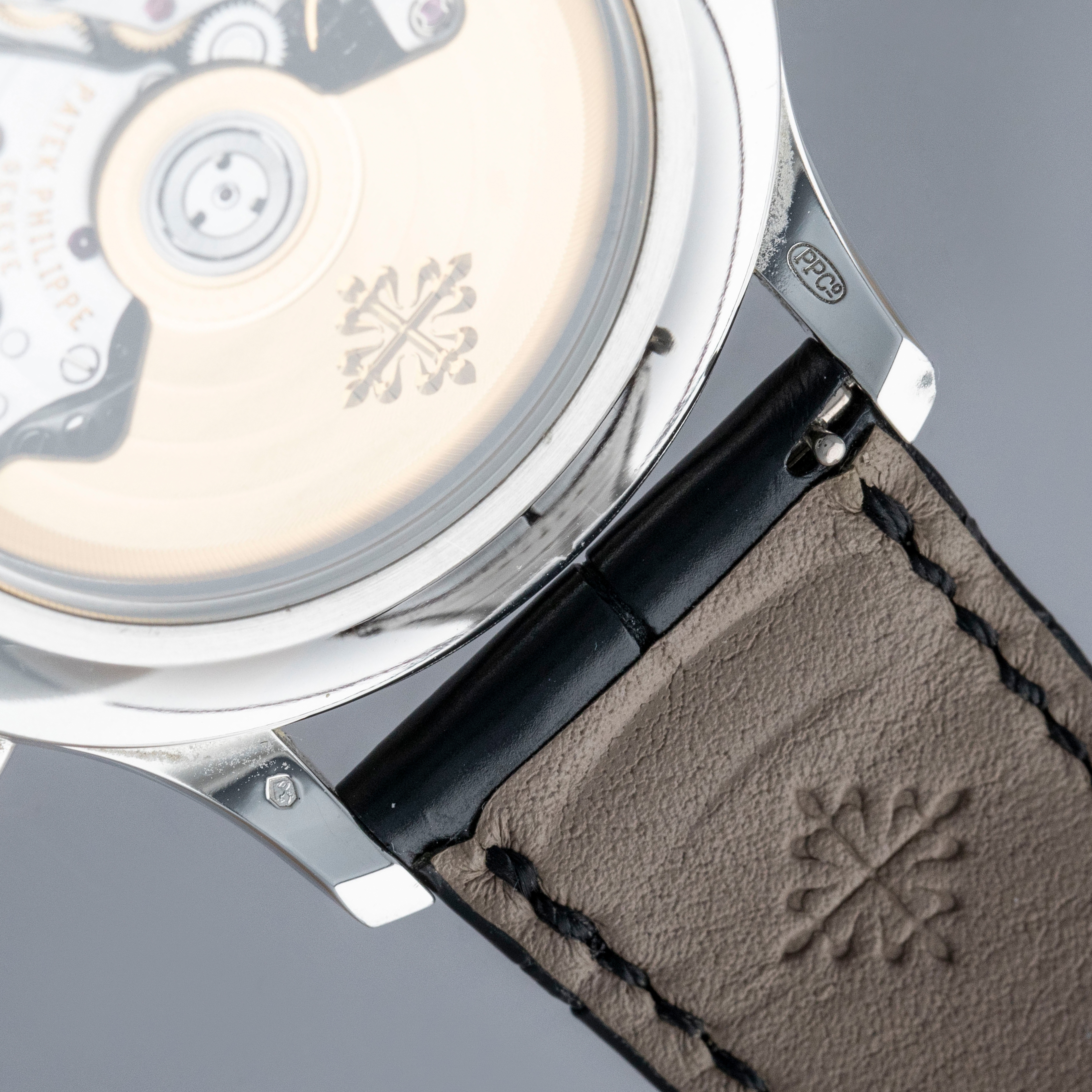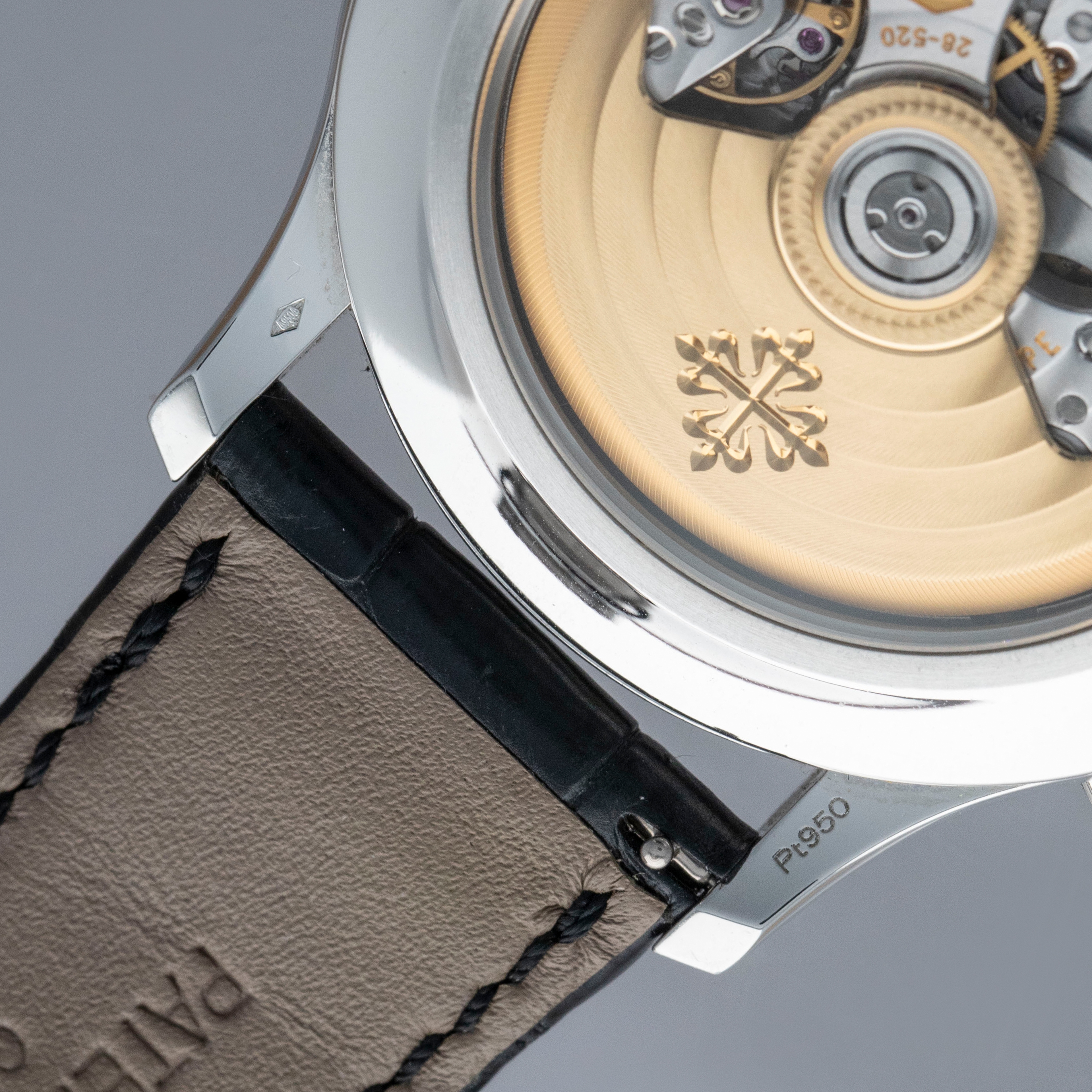 Watch is in overall near-mint condition. The platinum case shows light signs of wear, with light marks visible on the polished sections, while the case back displays some light surface scratches around the edge. All hallmarks remain crisp and well defined. The dial and hands remain like new. It is fitted with a black Patek alligator strap and a platinum pin buckle, both remaining in excellent condition. Comes complete with inner and outer boxes, booklets, document holder, and certificate of origin.