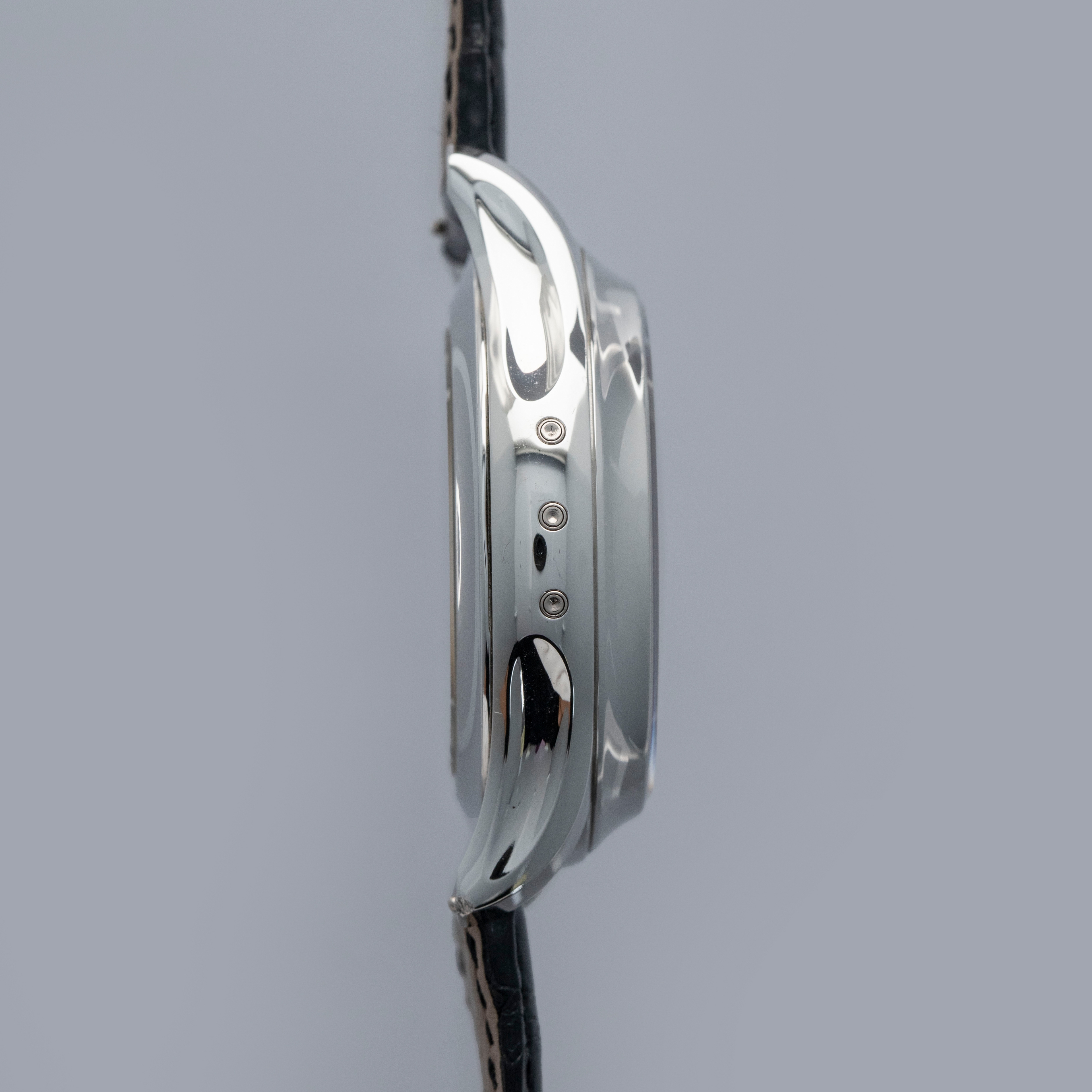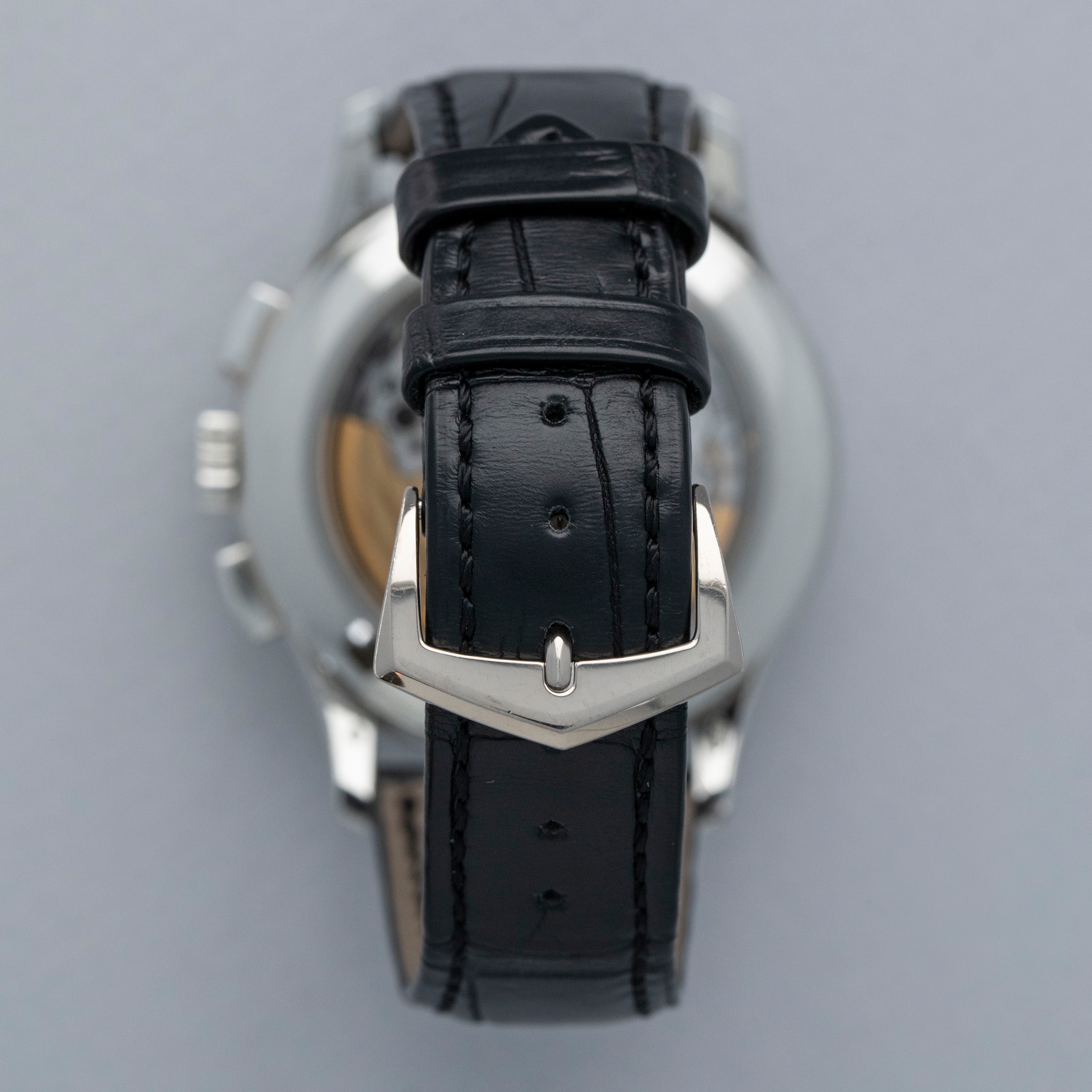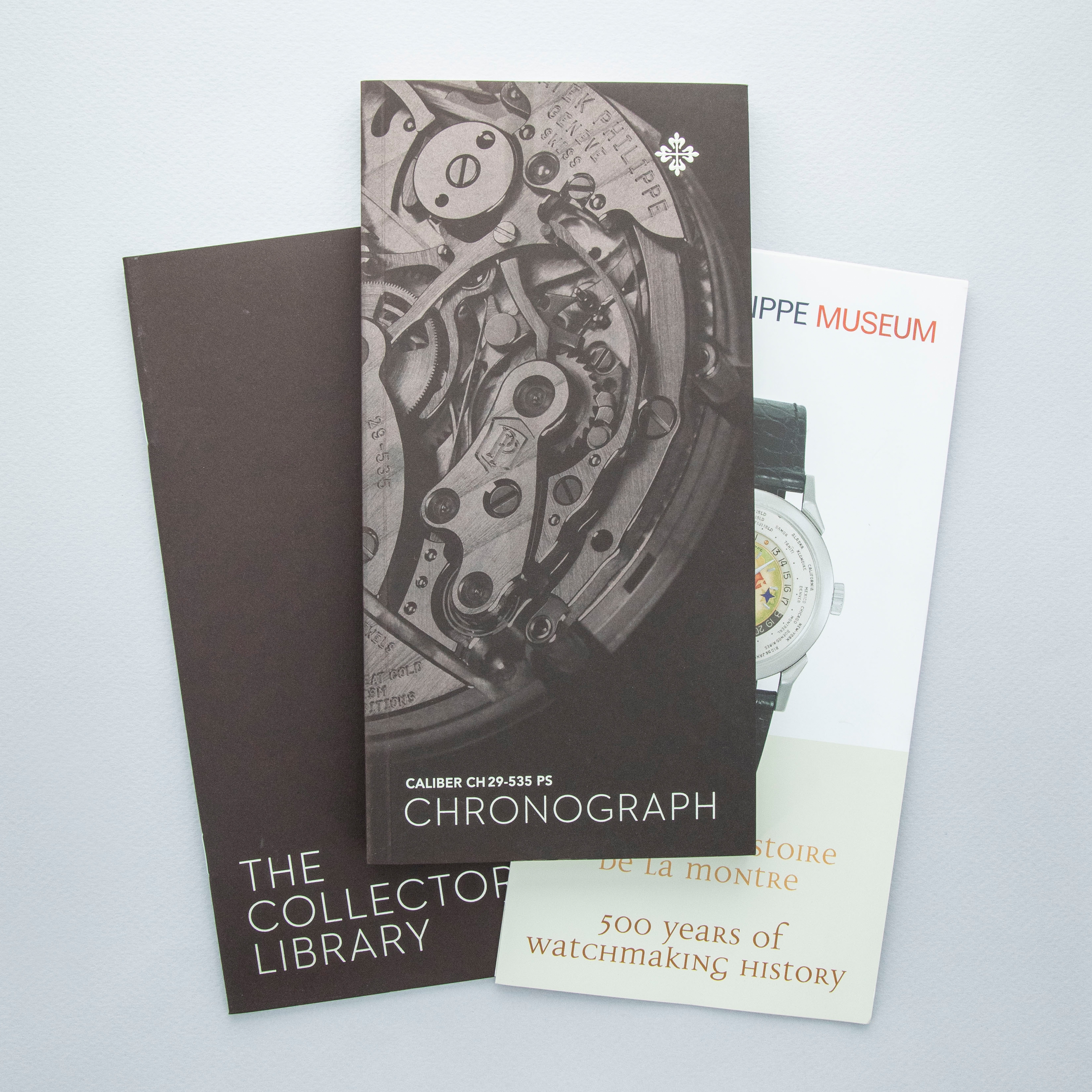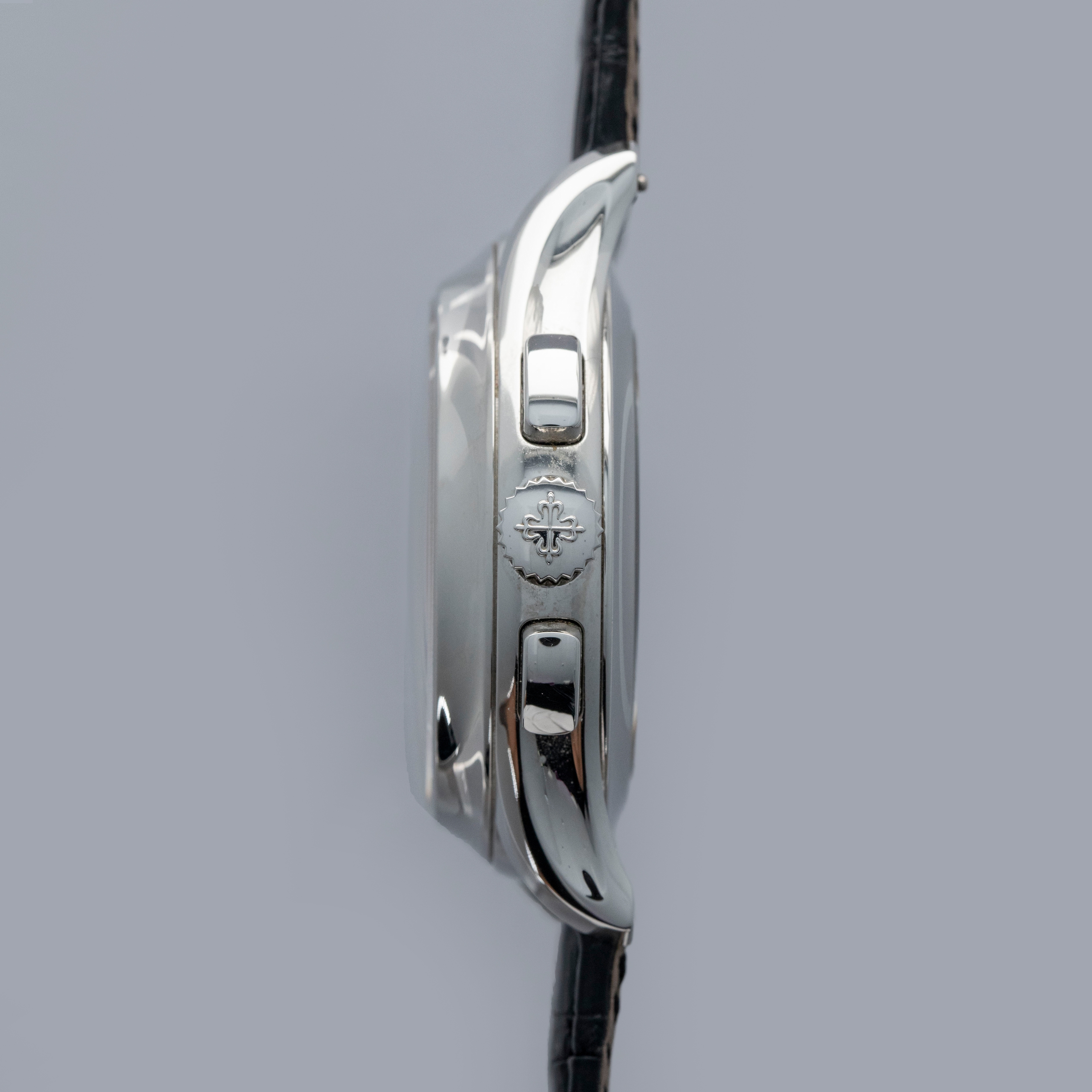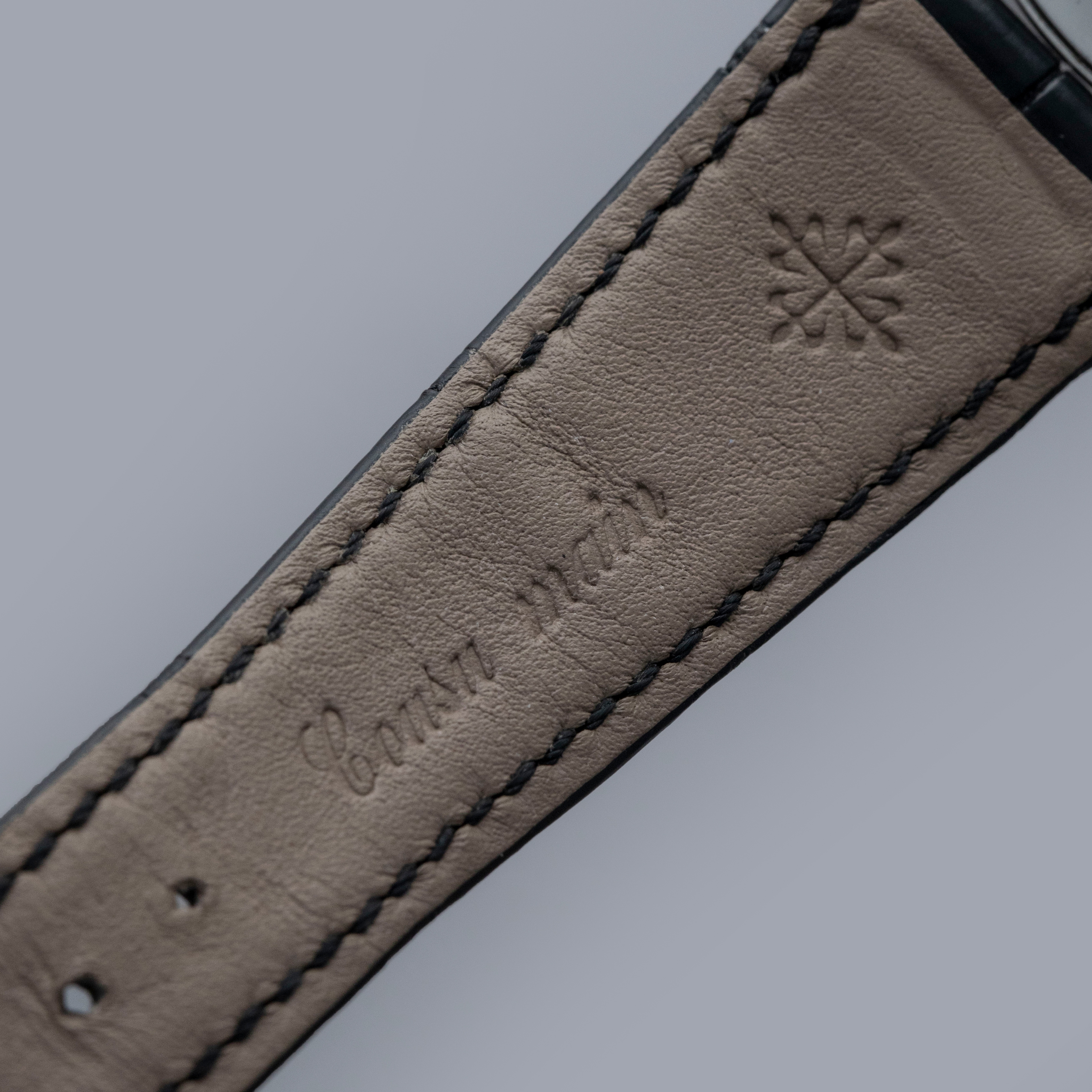 Watch is in overall near-mint condition. The platinum case shows light signs of wear, with light marks visible on the polished sections, while the case back displays some light surface scratches around the edge. All hallmarks remain crisp and well defined. The dial and hands remain like new. It is fitted with a black Patek alligator strap and a platinum pin buckle, both remaining in excellent condition. Comes complete with inner and outer boxes, booklets, document holder, and certificate of origin.