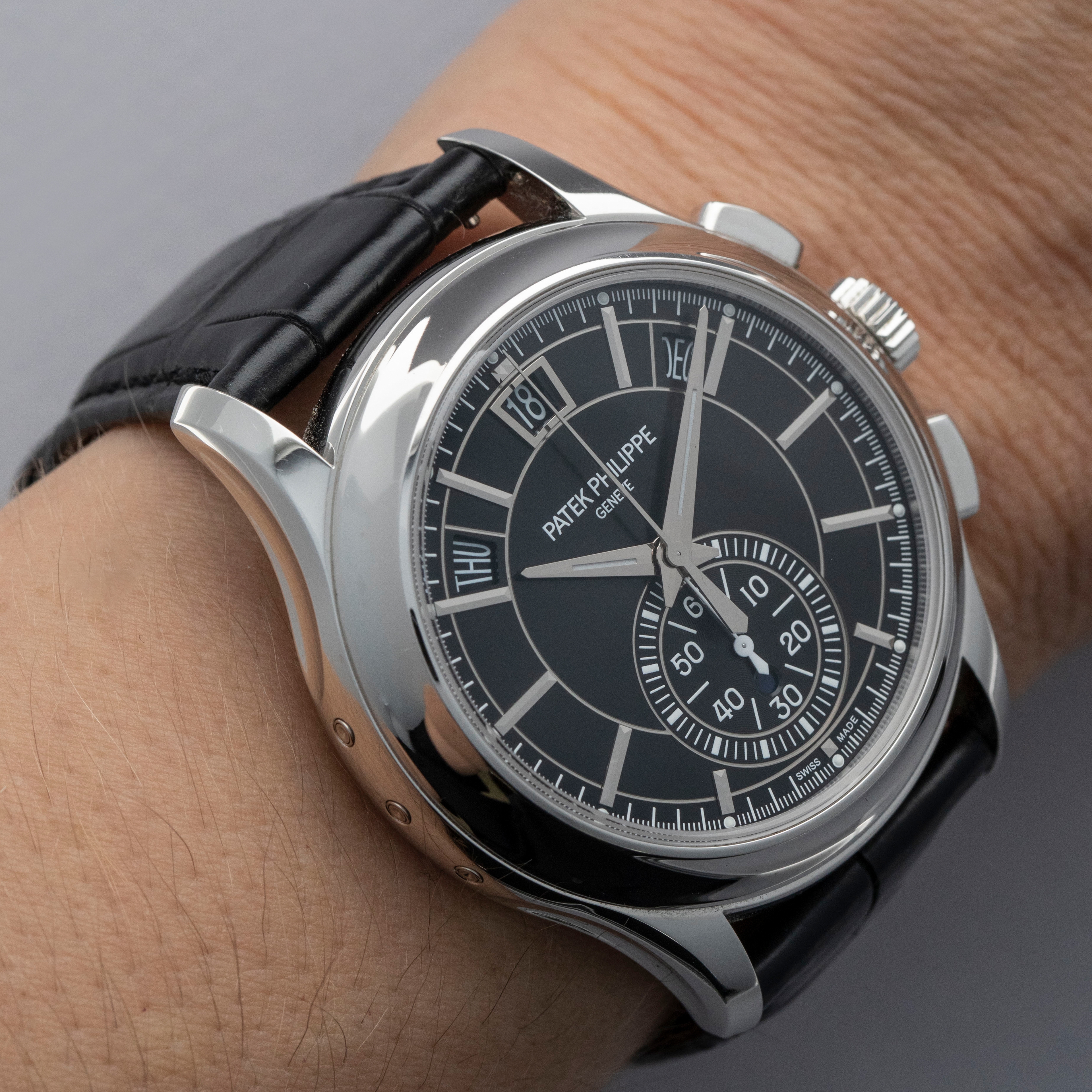 Boasting a monochromatic black dial, the ref. 5905P's display is immediately legible, especially given how complicated the movement beneath it is, with its trio of apertures for its annual calendar complication and chronograph subdial at 6 o'clock for its spilit-second chronograph.
