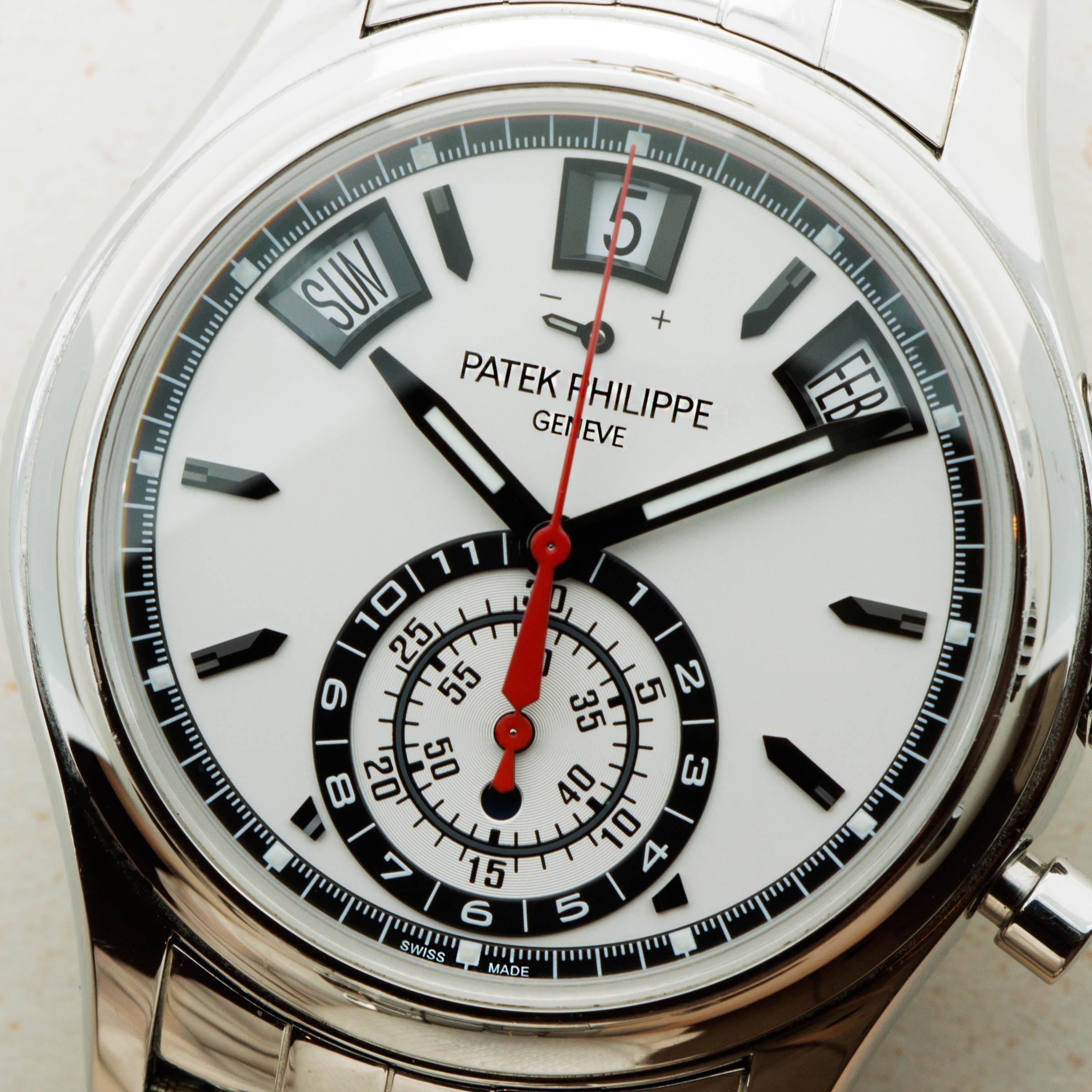 Boasting al egible bright white dial with black accents throughout, the ref. 5960/1A's dial is immediately reminiscent of the Nautilus ref. 5711 "Piano," except in this case the black accents ensure a whole host of complications are visible, and not just the time.