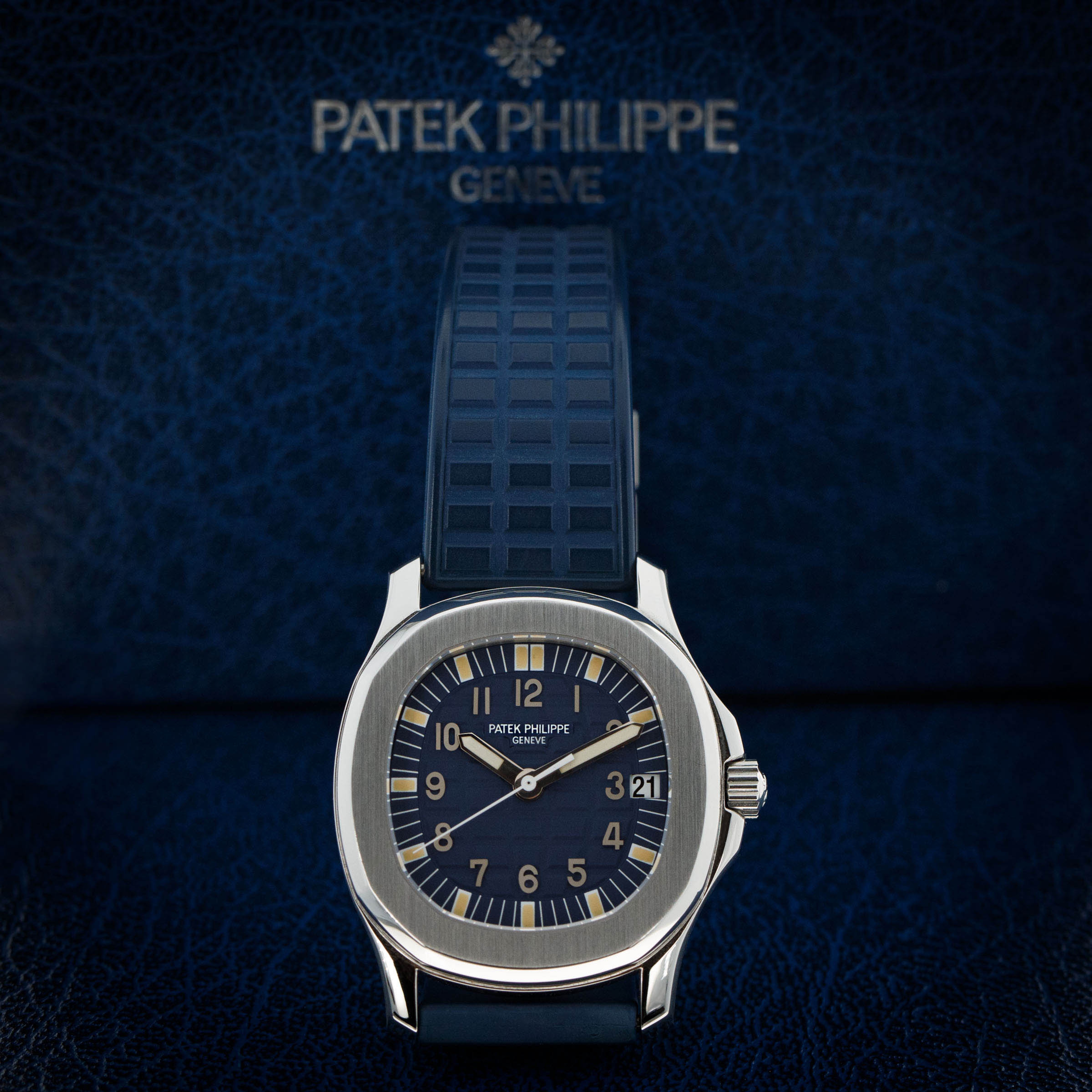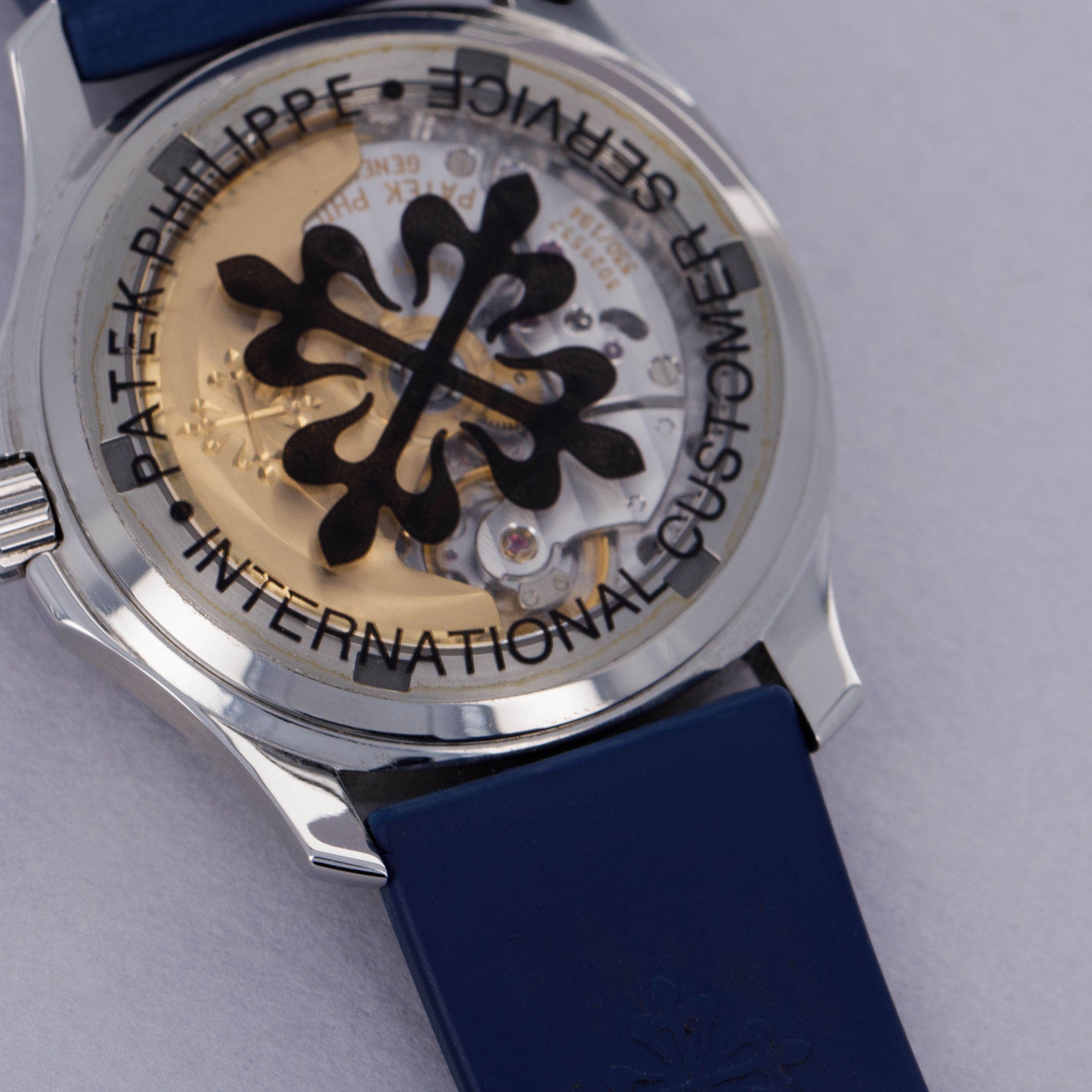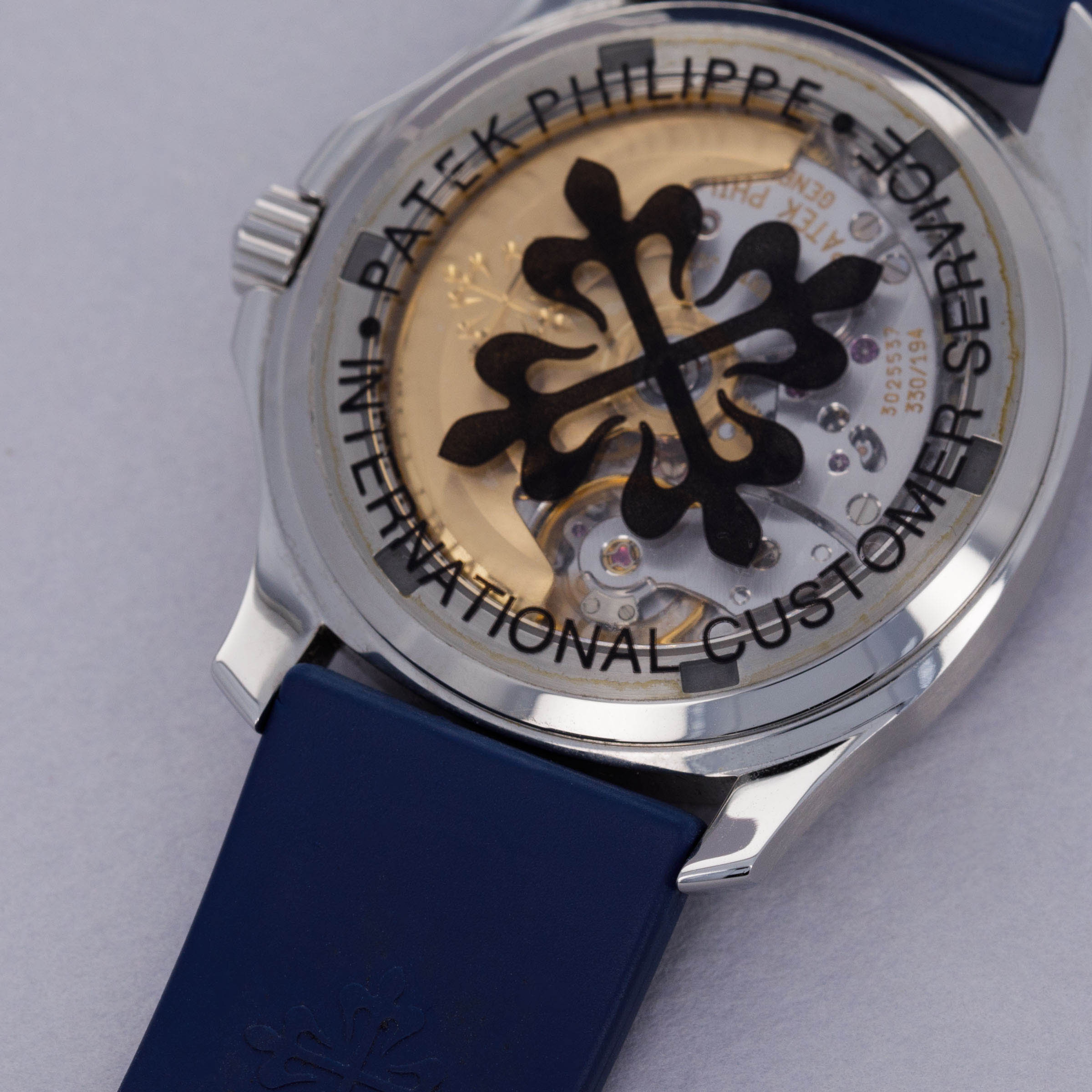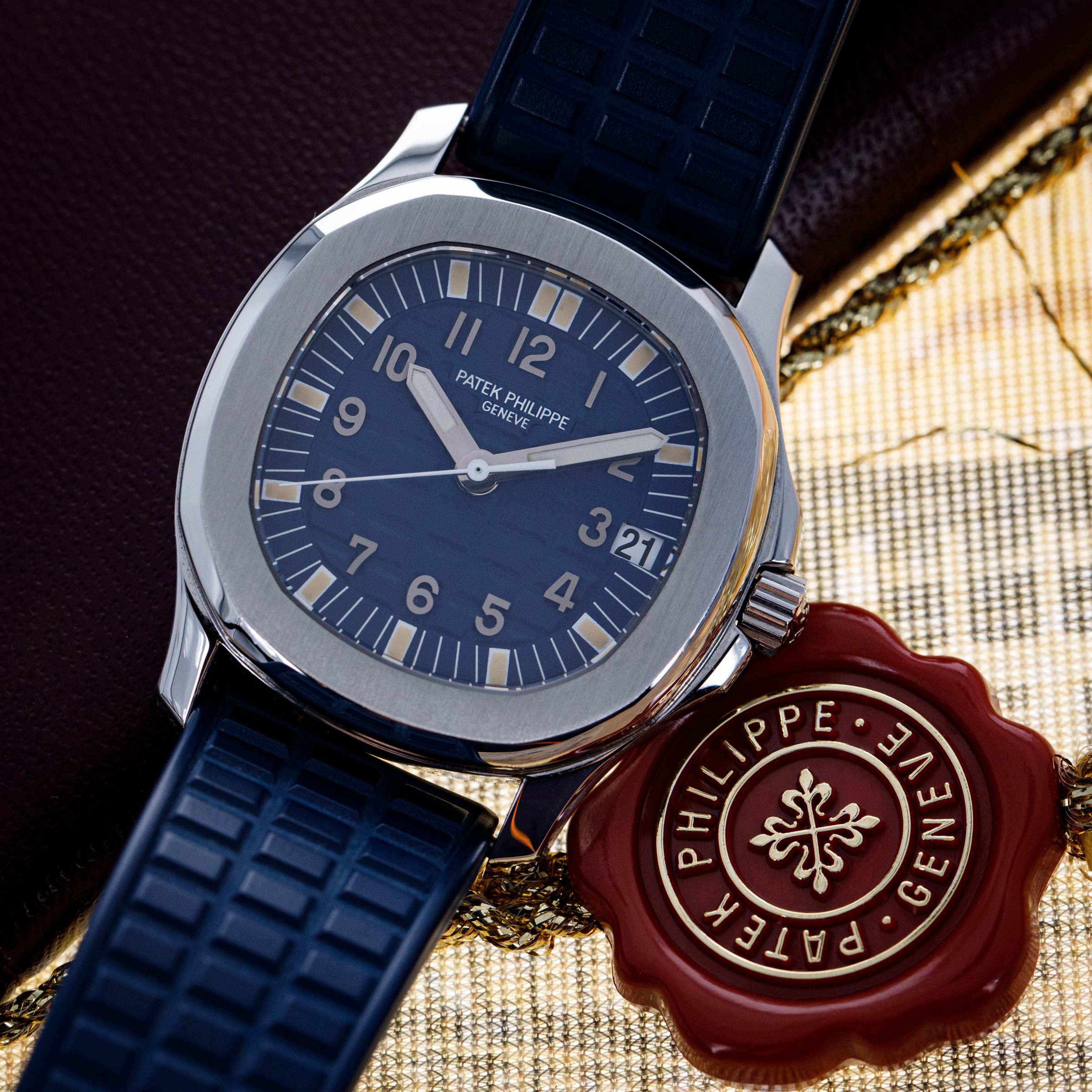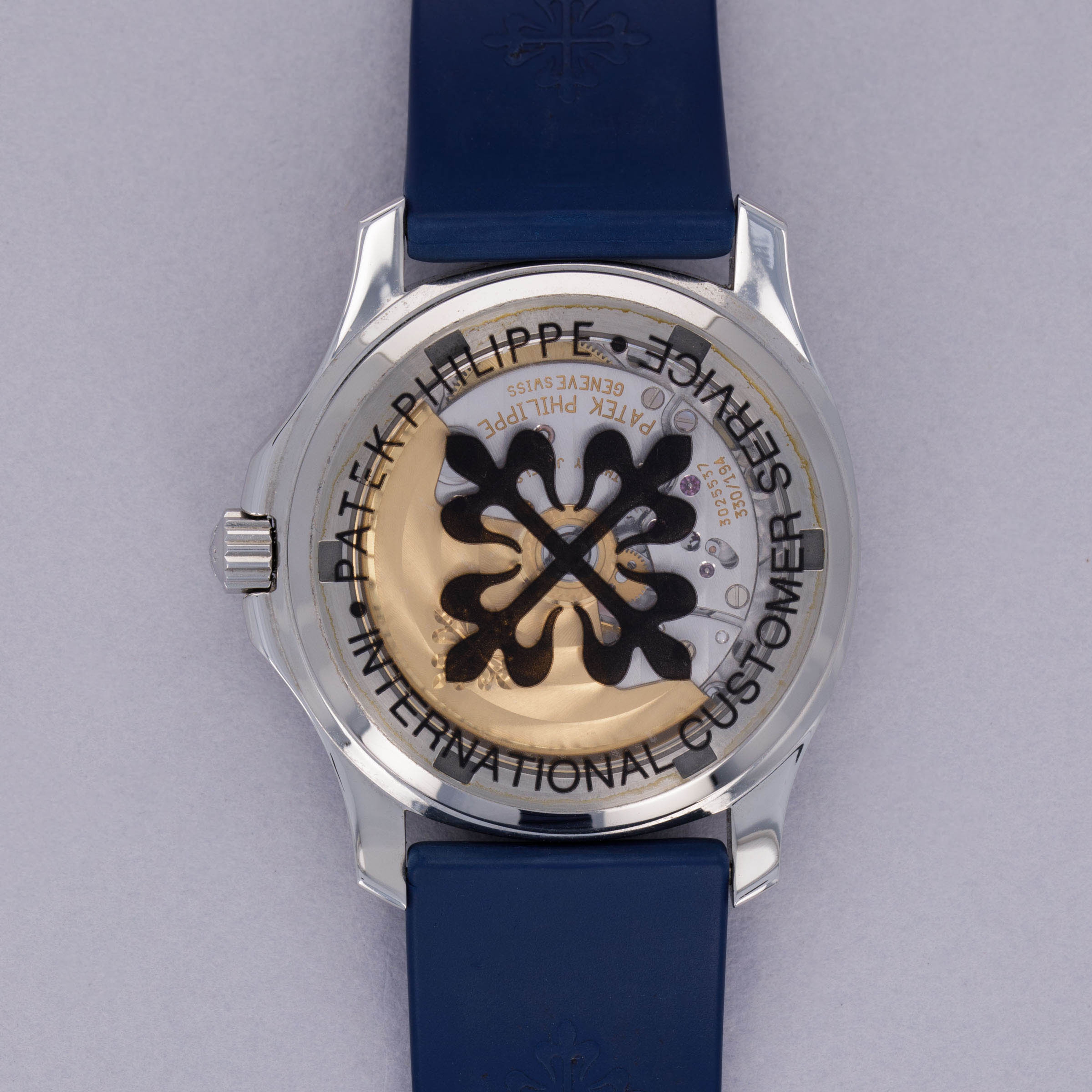 Watch is in near-mint overall condition. Watch was serviced by Patek Philippe at some point and appears to have been seldom used since. Case was polished at service and shows little to no signs of surface wear. Caseback service sticker still affixed. Blue tropical rubber strap has been cut to fit a 6 3/4" wrist. Watch comes with original blue colored limited edition inner and outer box, as well as guarantee papers and service box.