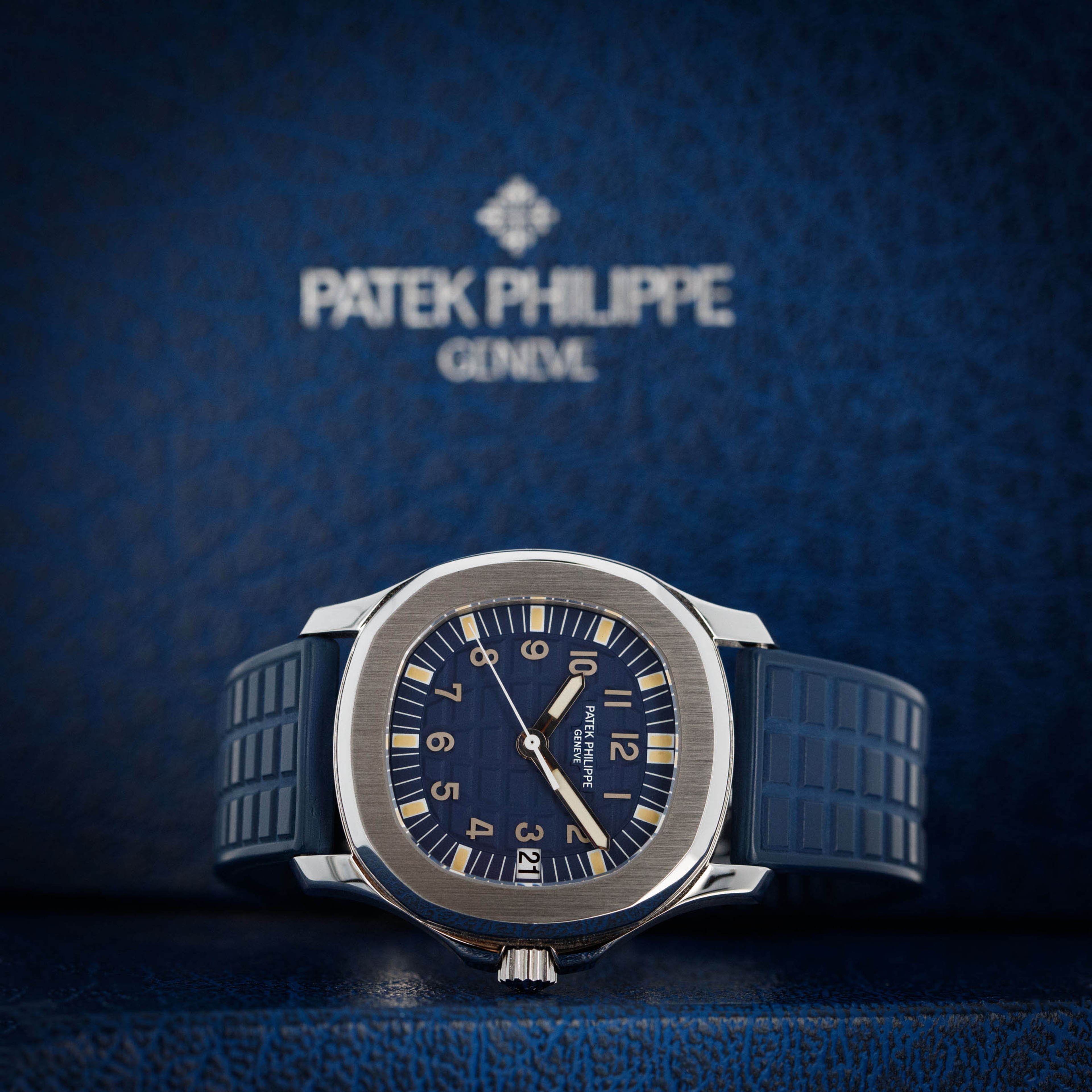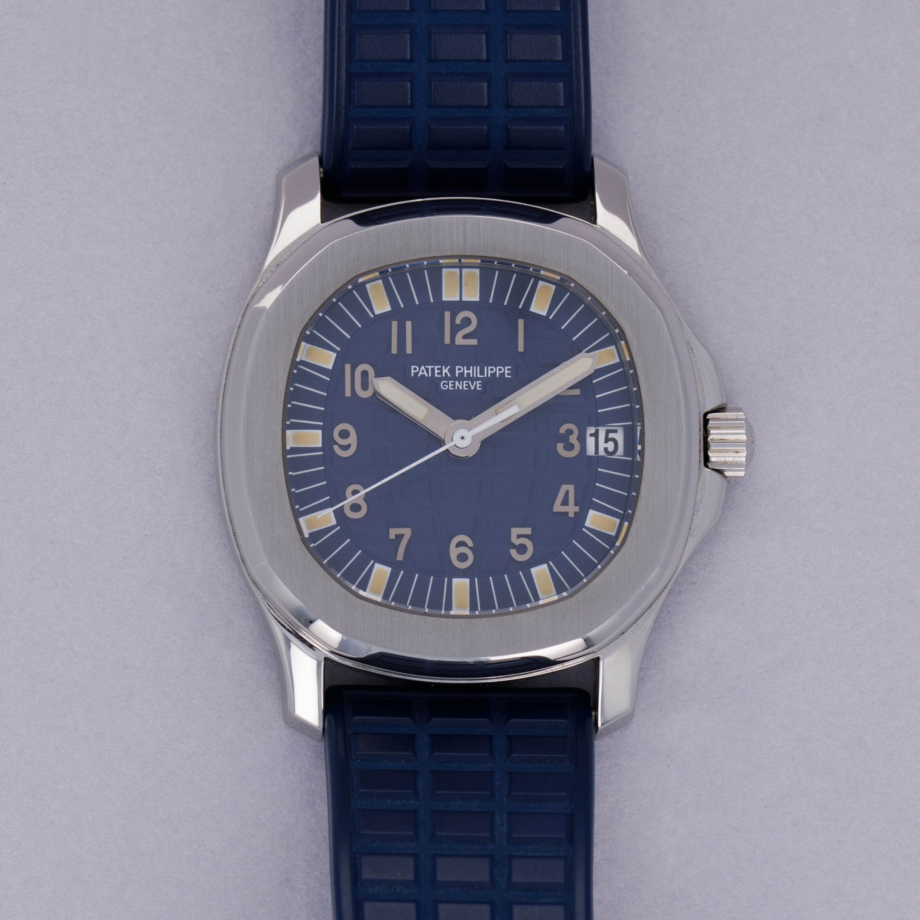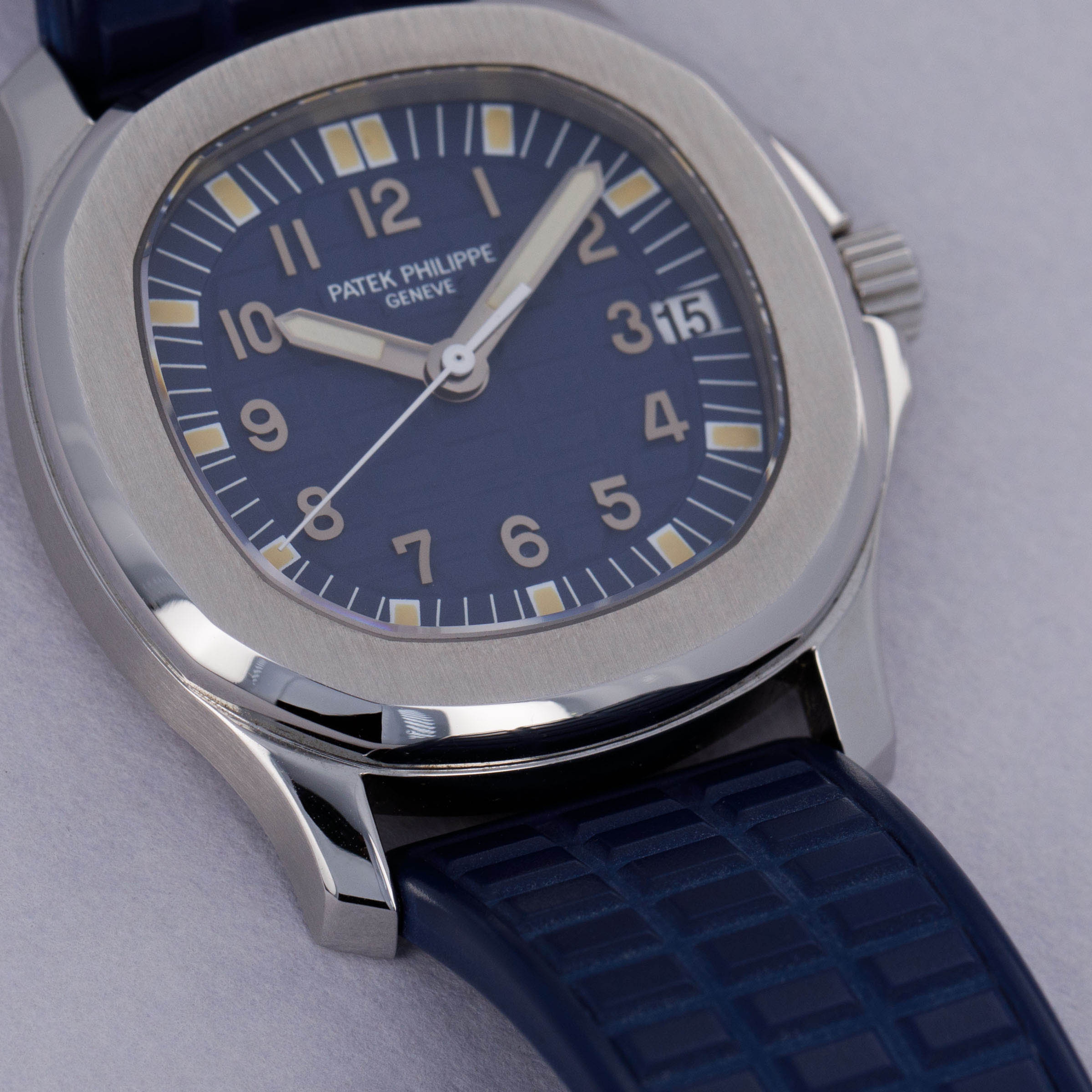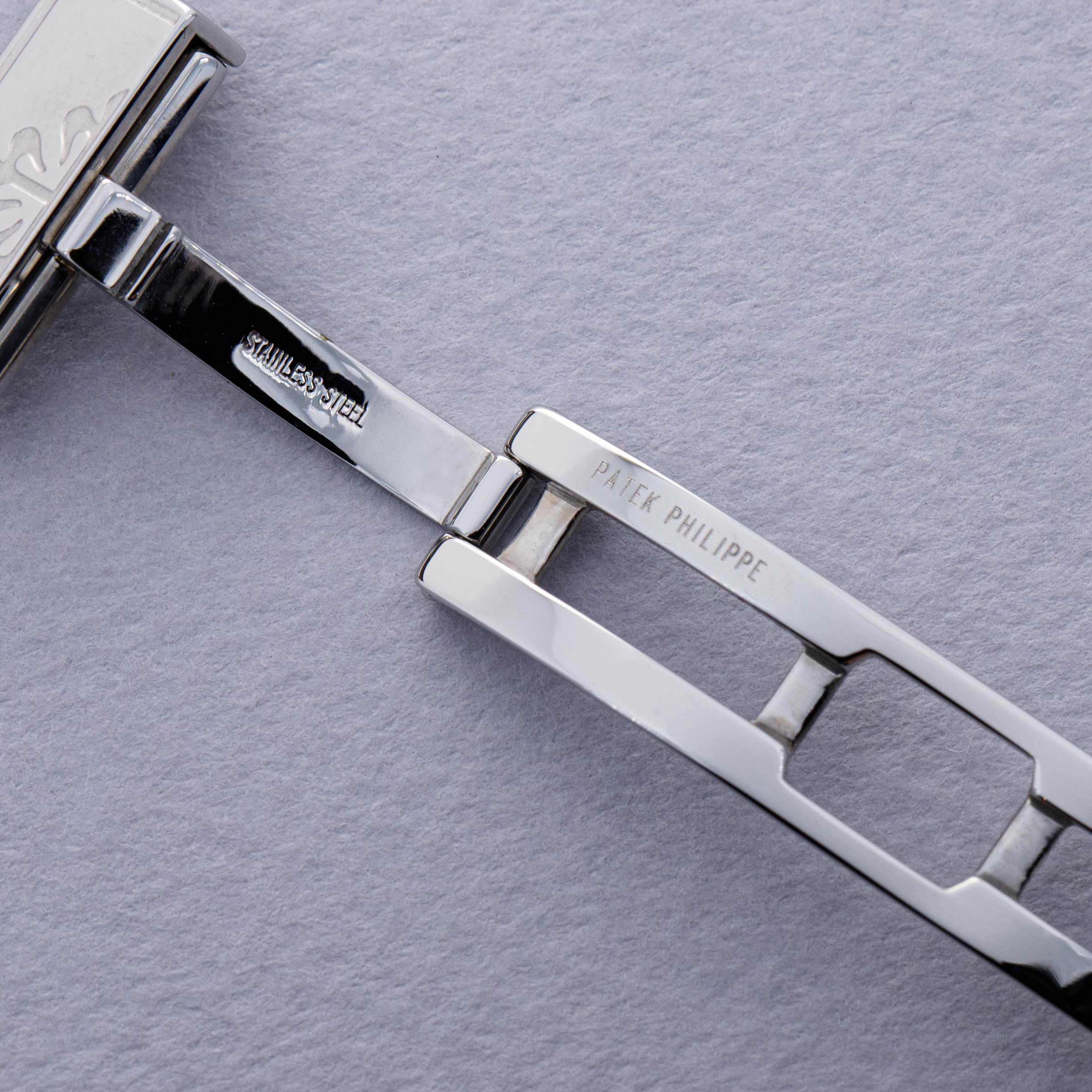 Watch is in near-mint overall condition. Watch was serviced by Patek Philippe at some point and appears to have been seldom used since. Case was polished at service and shows little to no signs of surface wear. Caseback service sticker still affixed. Blue tropical rubber strap has been cut to fit a 6 3/4" wrist. Watch comes with original blue colored limited edition inner and outer box, as well as guarantee papers and service box.