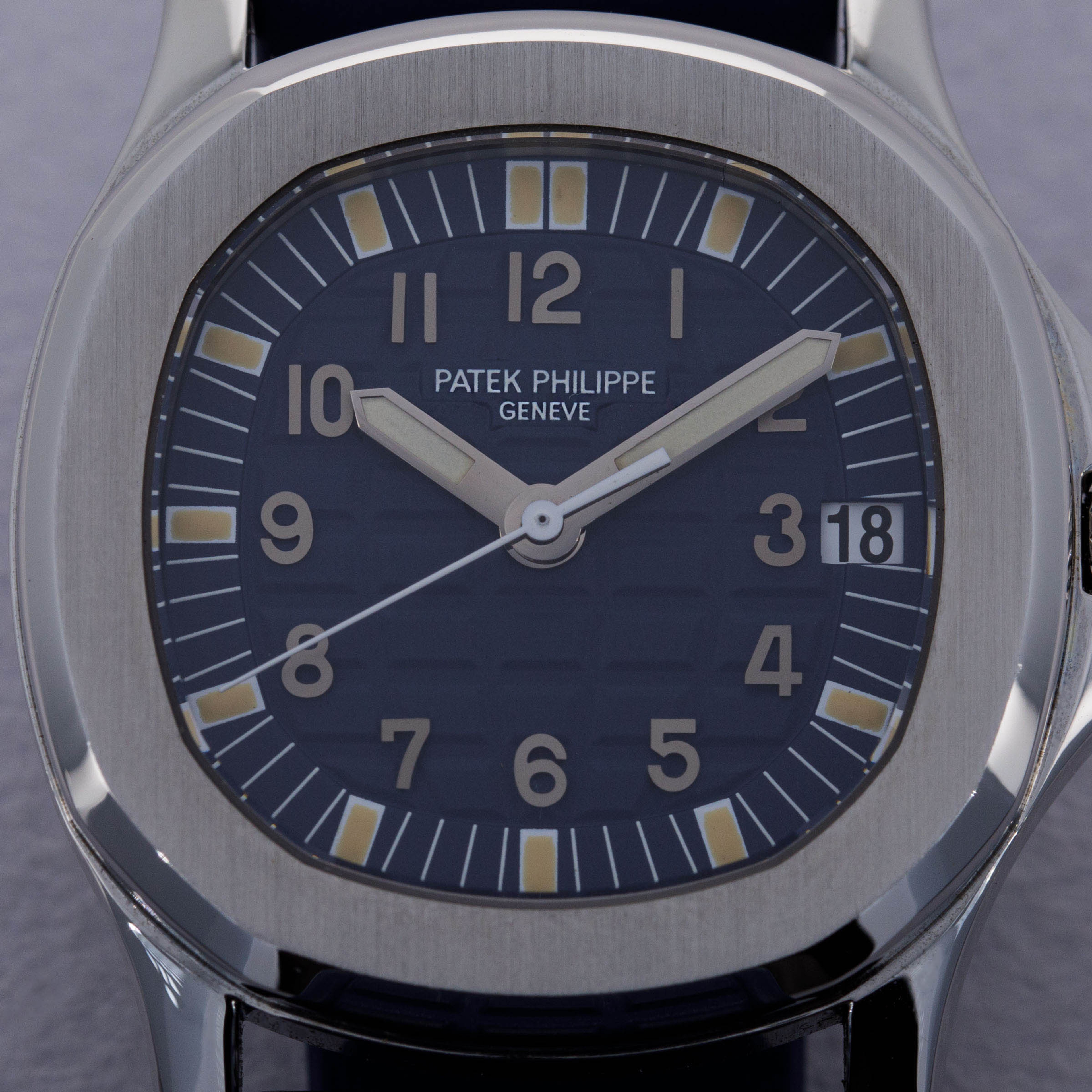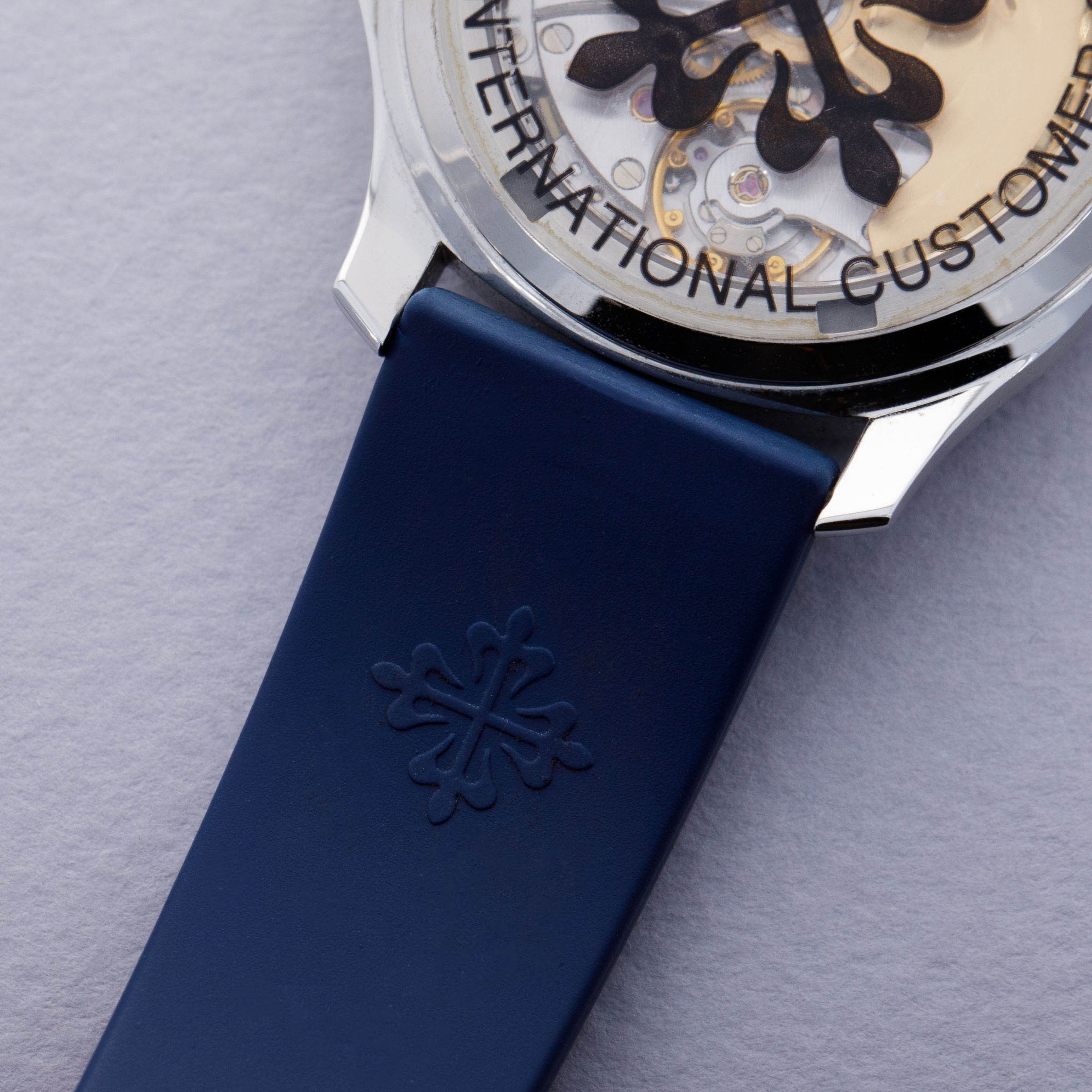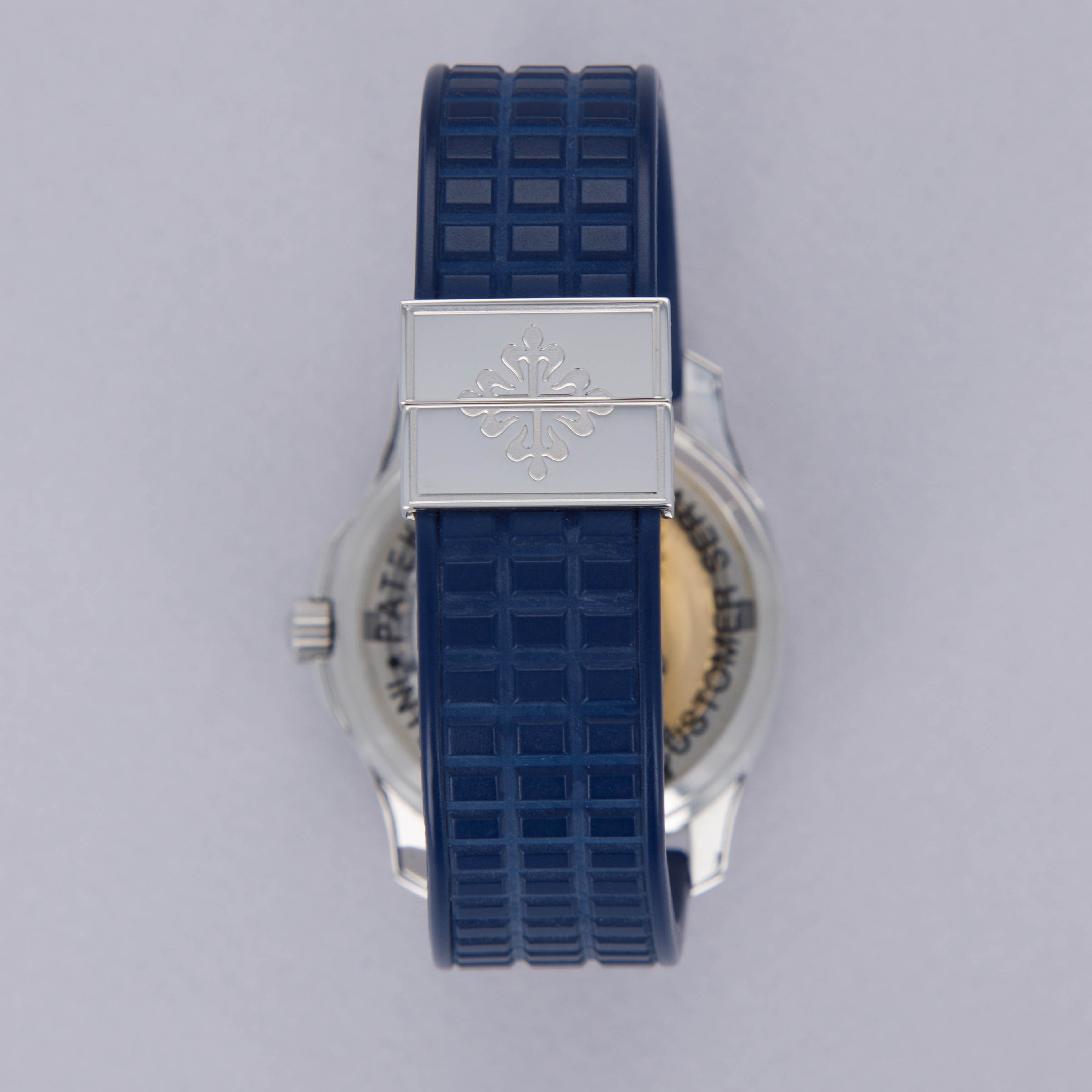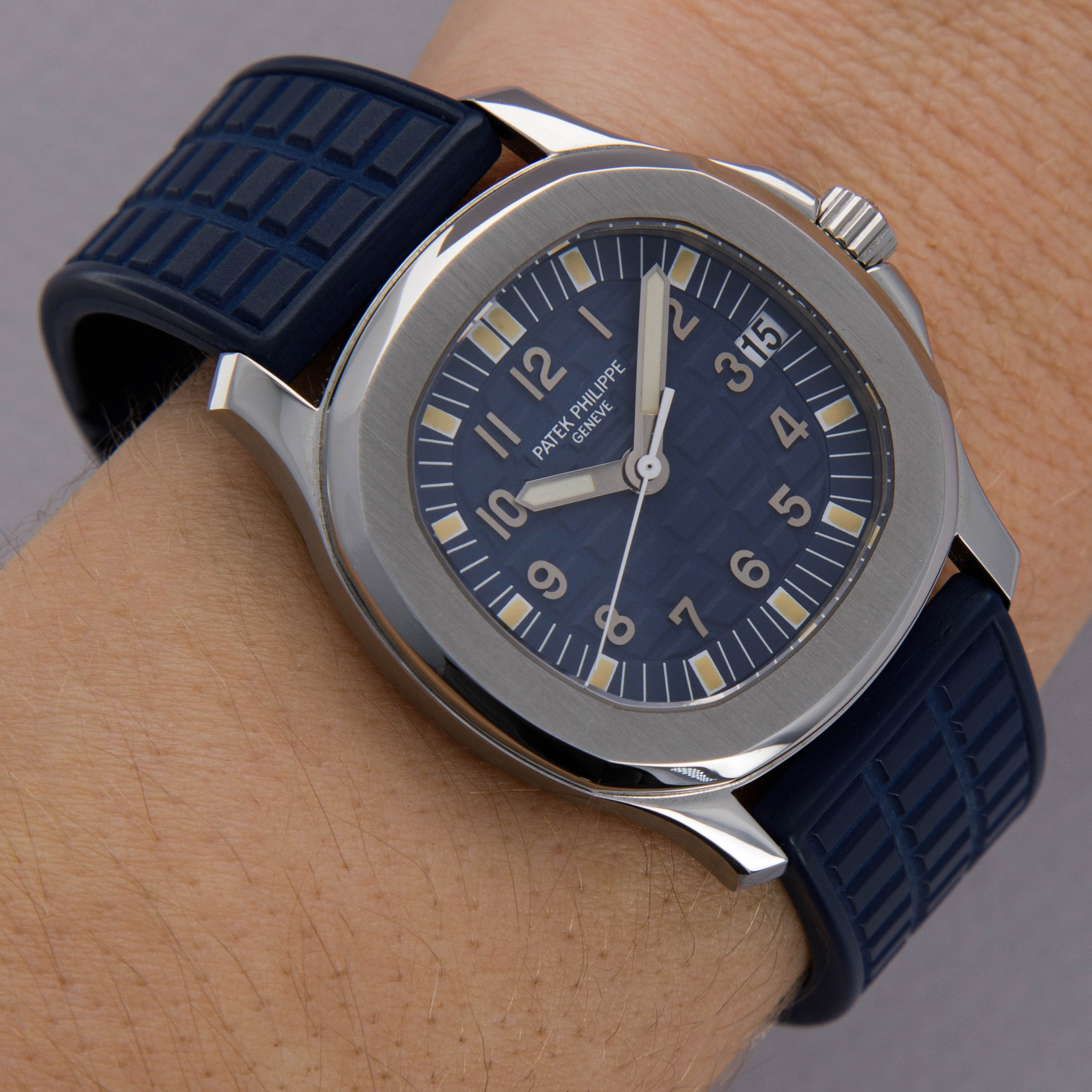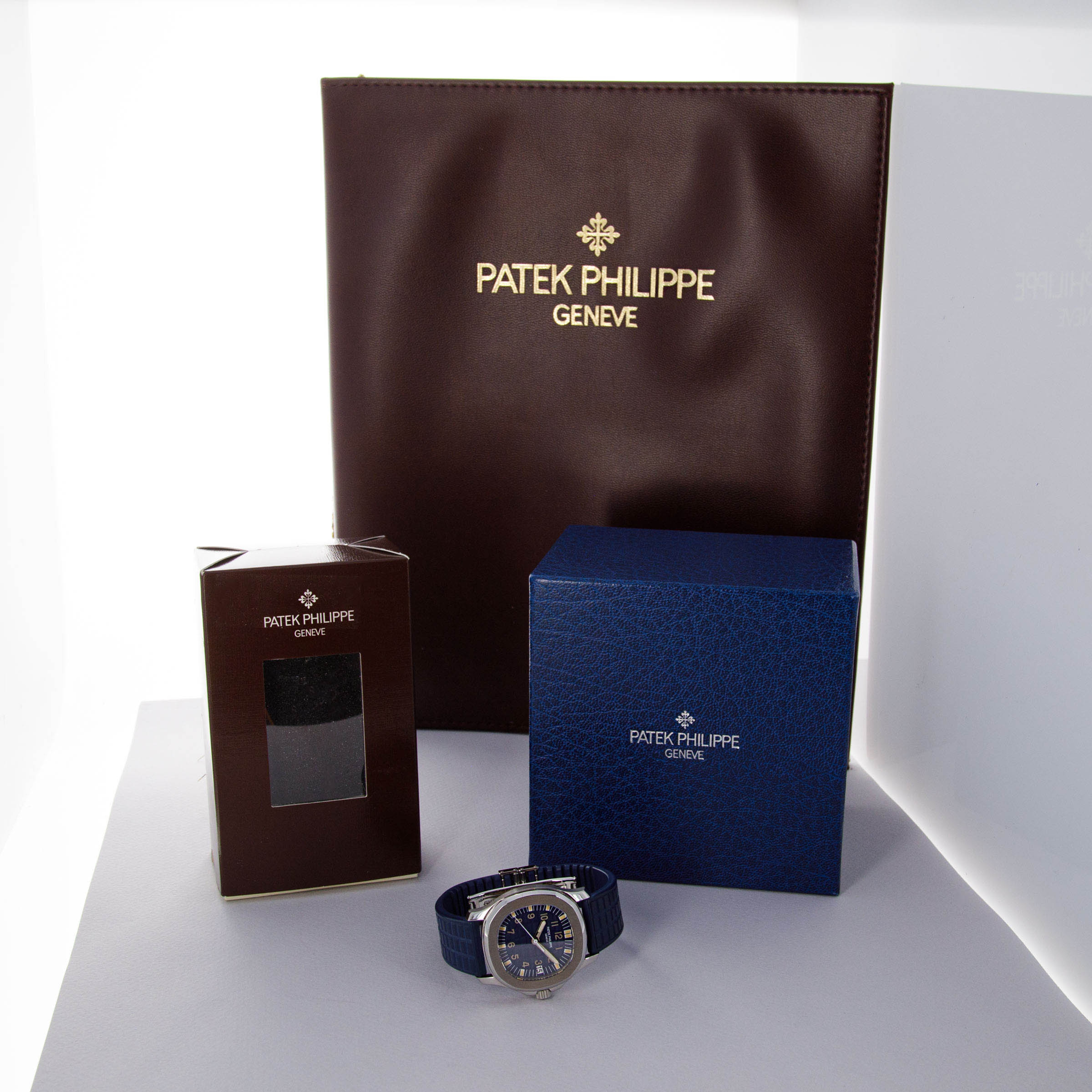 Watch is in near-mint overall condition. Watch was serviced by Patek Philippe at some point and appears to have been seldom used since. Case was polished at service and shows little to no signs of surface wear. Caseback service sticker still affixed. Blue tropical rubber strap has been cut to fit a 6 3/4" wrist. Watch comes with original blue colored limited edition inner and outer box, as well as guarantee papers and service box.