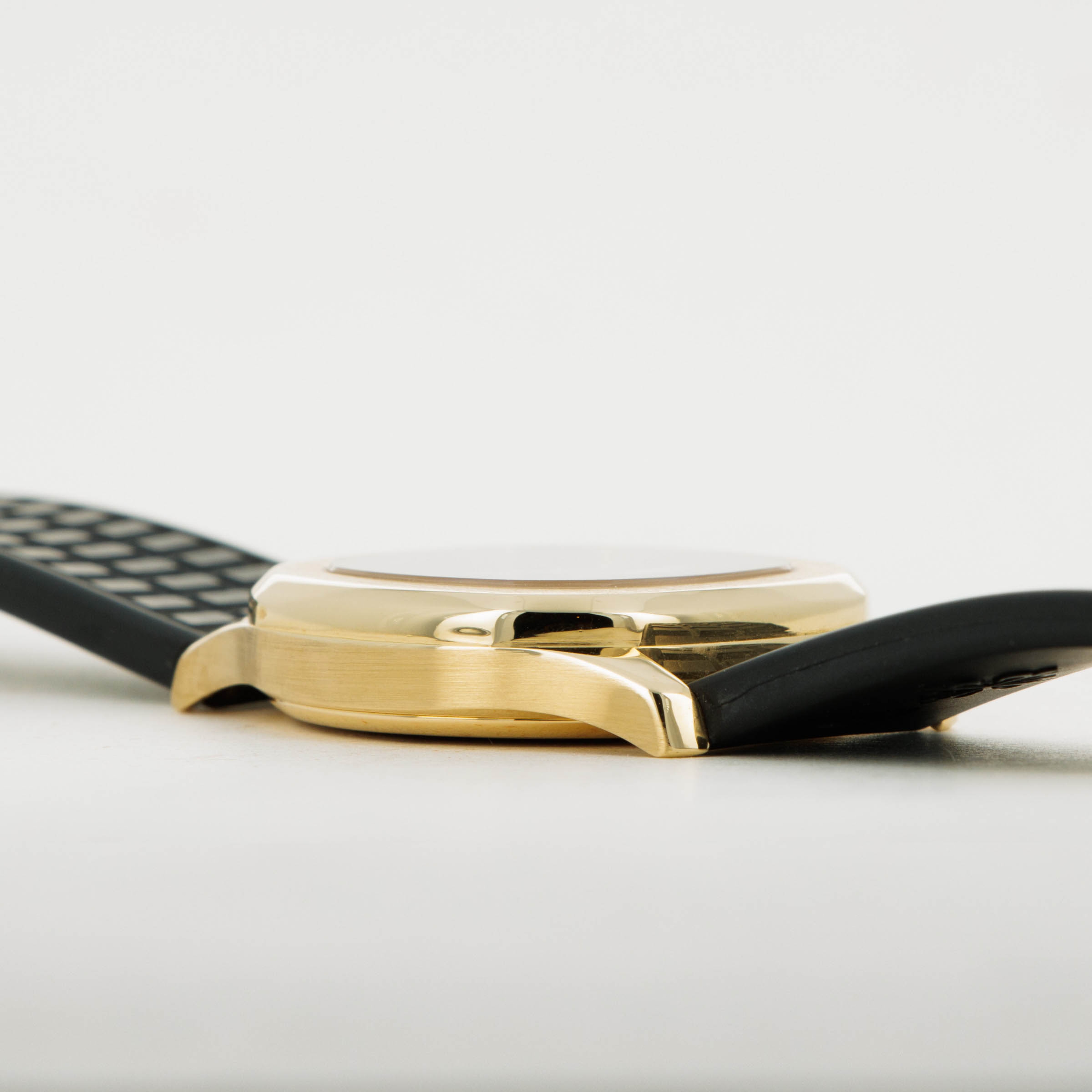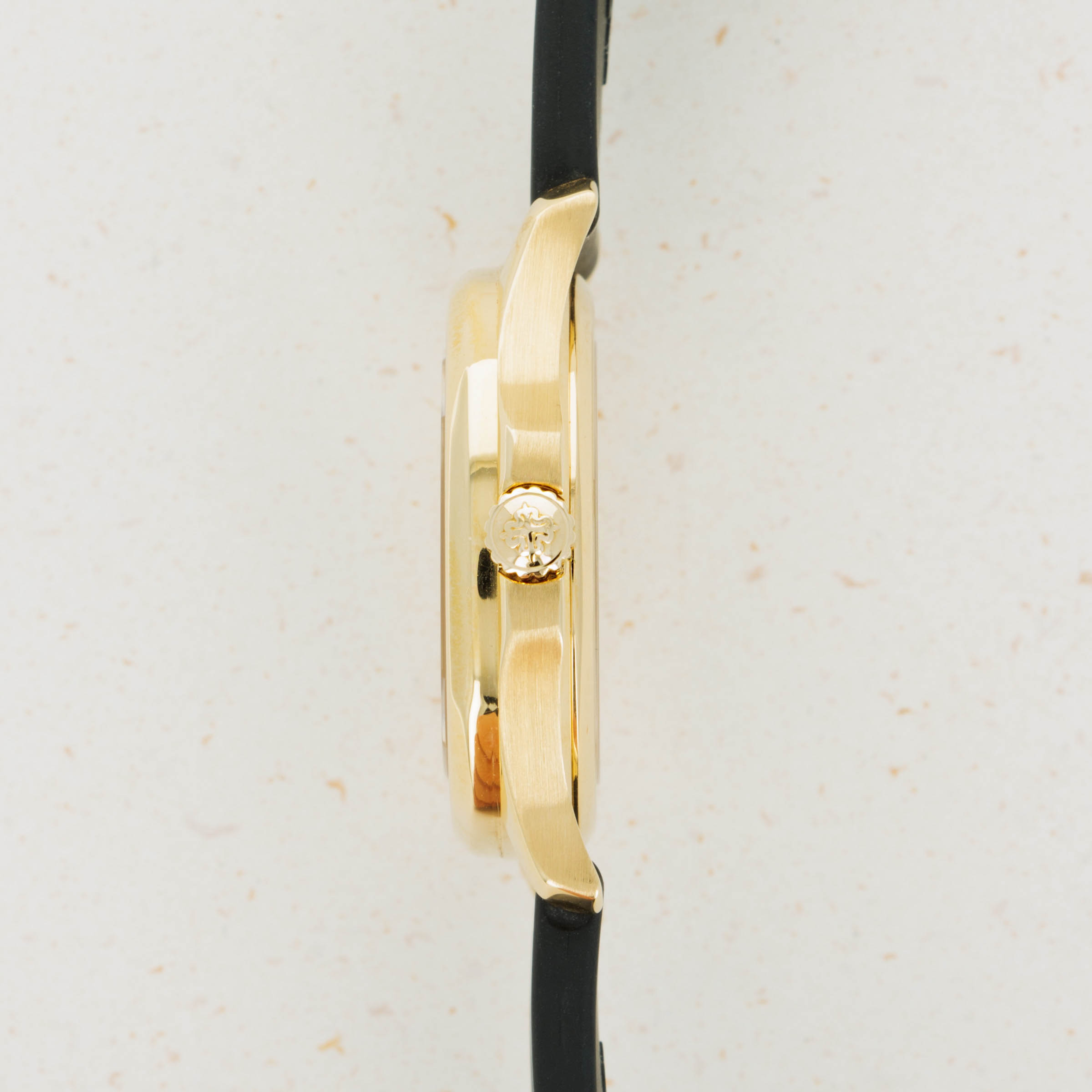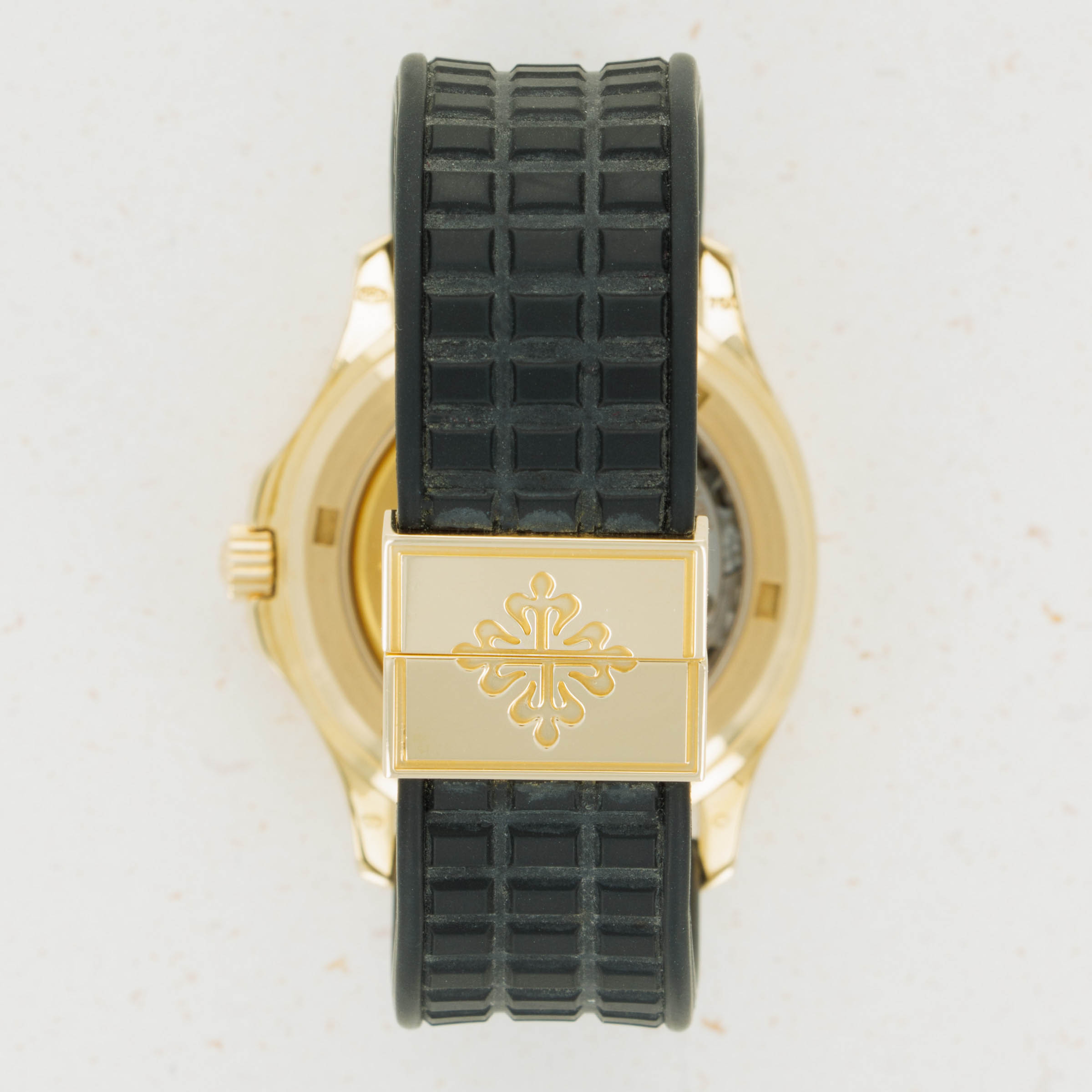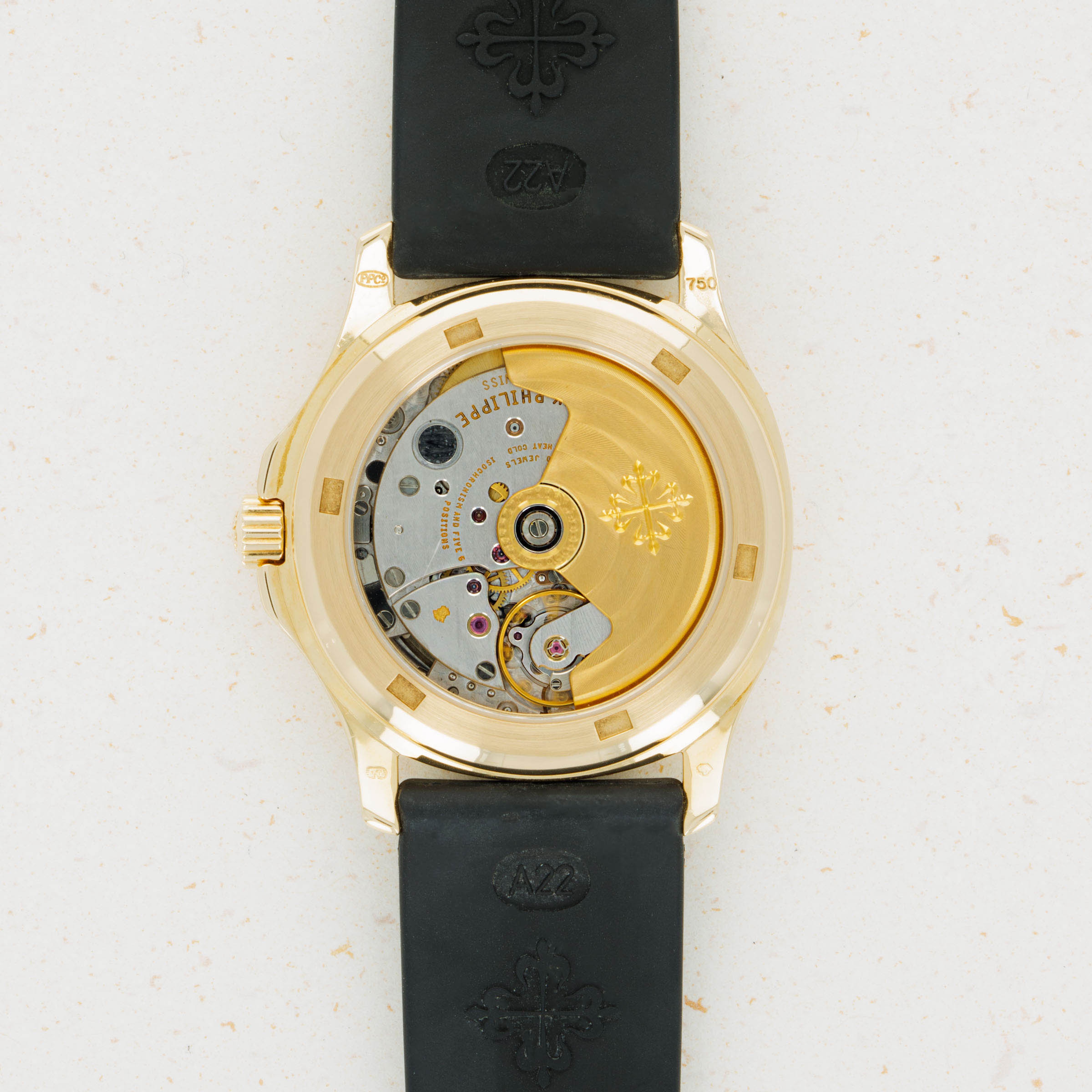 Debuting in 1997, the Patek Philippe Aquanaut was released to engage with a newly minted clientele with money in their pocket thanks to the stock market’s explosion during the dot.com era. Released under the same premise as the Nautilus when it was released in 1976, the Aquanaut was a trendy watch that broke from traditional Patek Philippe aesthetic stylings. Featuring a first for Patek with its composite strap, the Aquanaut needed to be delicately launched. So it was first released as a limited-edition offering of 1000 pieces with the ref. 5060A. Thanks to its success, in 1998, the year following, Patek launched a new variant of the Aquanaut, the ref. 5066 in stainless steel and in 18kt yellow gold, which is the example we have here. Featuring the same 36mm stainless case design and the same automatic cal. 330 SC movement as the ref. 5060, the ref. 5066 is very similar to its predecessor. However, in what was certainly a welcome change considering Patek Philippe’s famed finishing, the ref. 5066 did introduce a new sapphire crystal exhibition caseback to the collection. This allowed the 120m water-resistant Aquanaut 5066 reference to become the most water-resistant timepiece to sport an exhibition caseback, an impressive feat for Patek Philippe considering their pedigree was in complicated classical timepieces, not sports watches. An icon of modern watchmaking, the Aquanaut has transcended horology, and with the ref. 5066 marking the beginning of its production as a serially-produced watch, it is a remarkably important and collectible reference. Furthermore, the ref. 5066J stood as one of the most luxurious Aquanauts in production until its discontinuation in 2007.