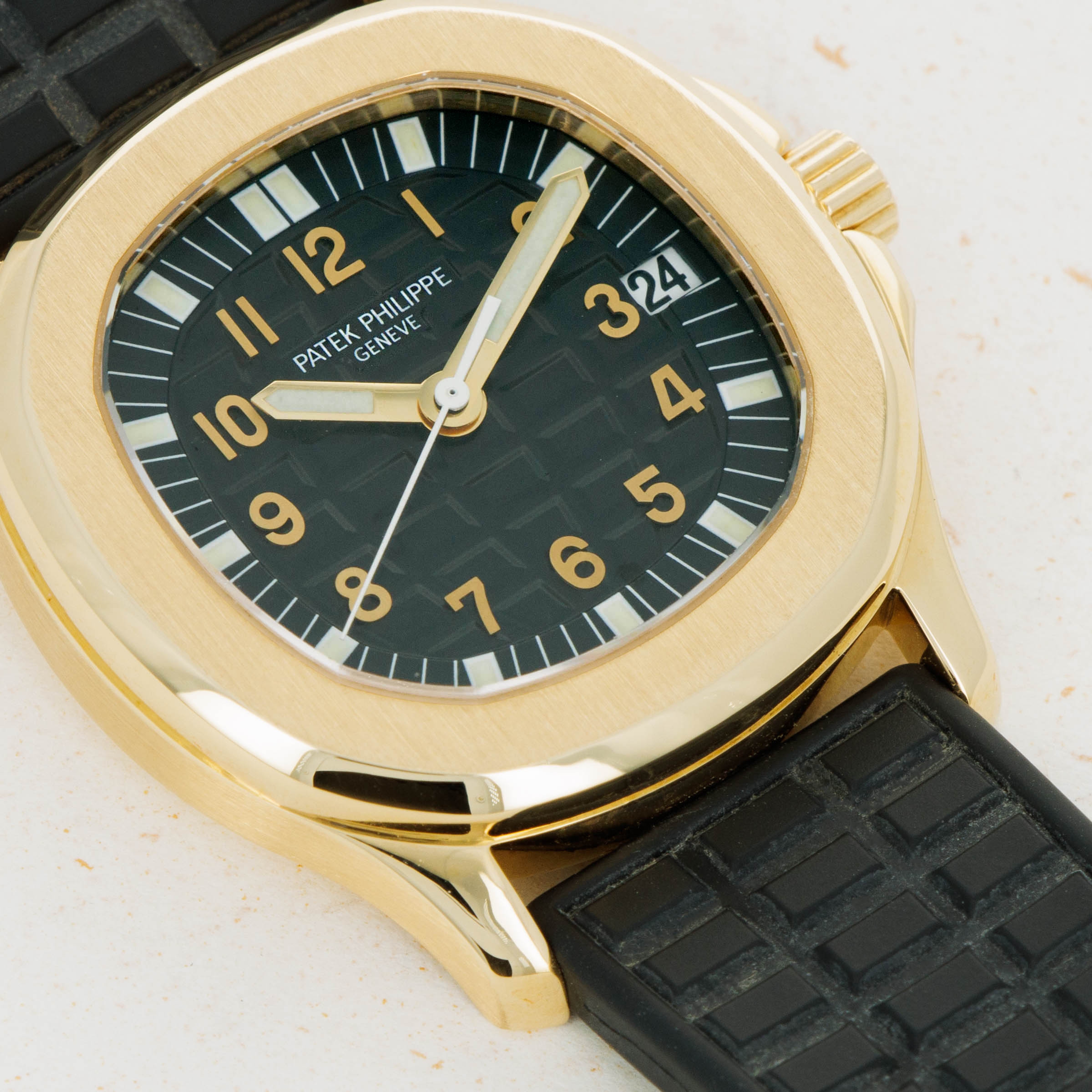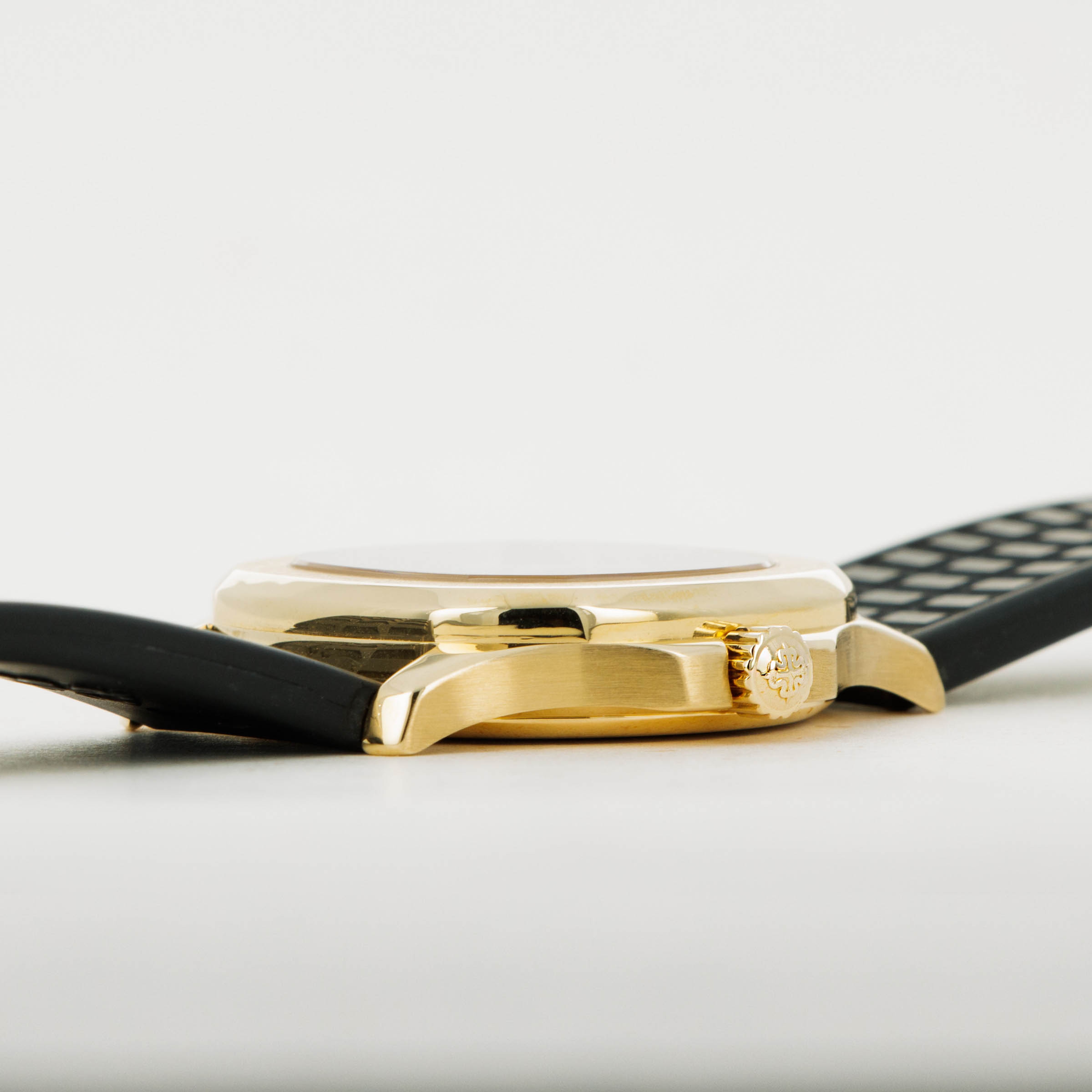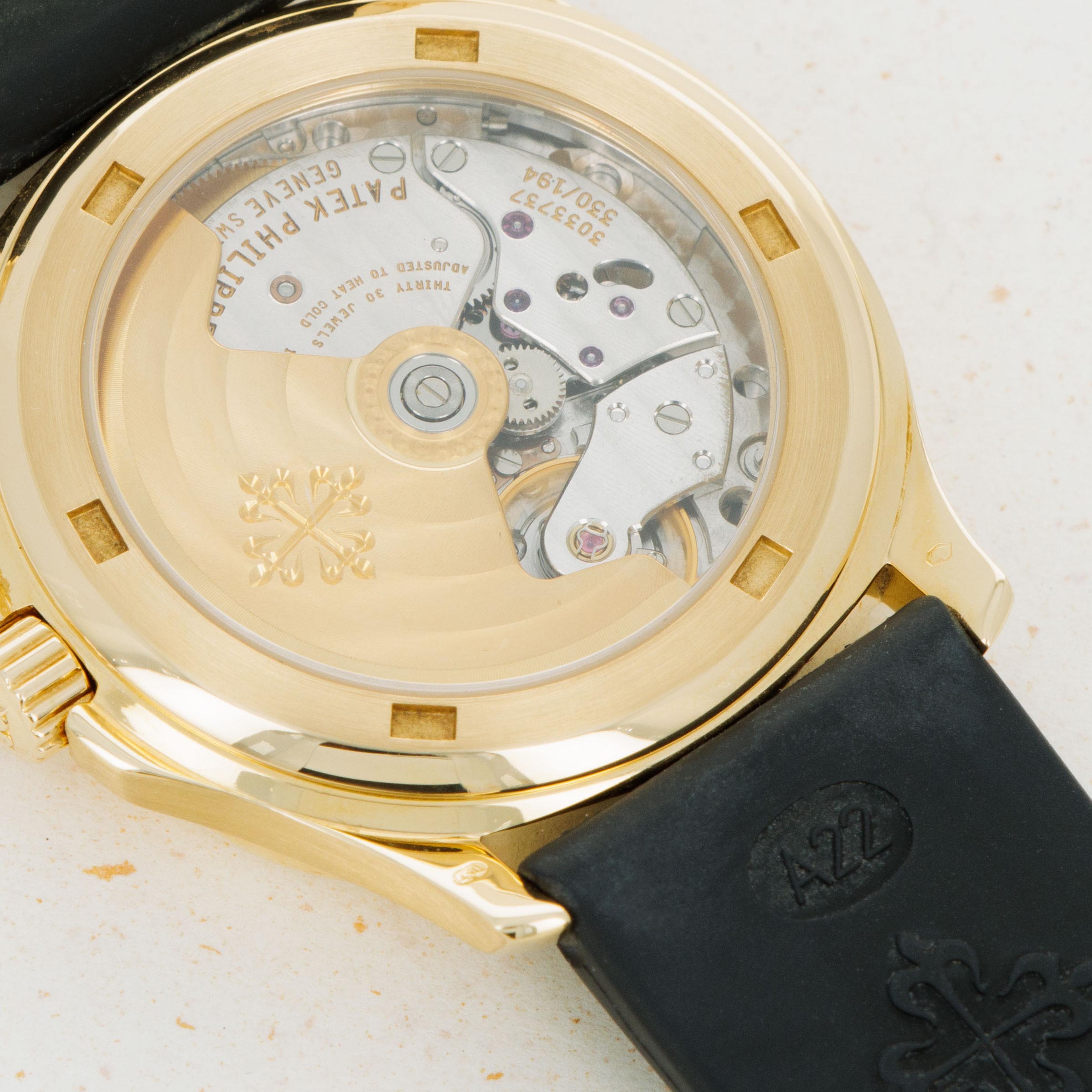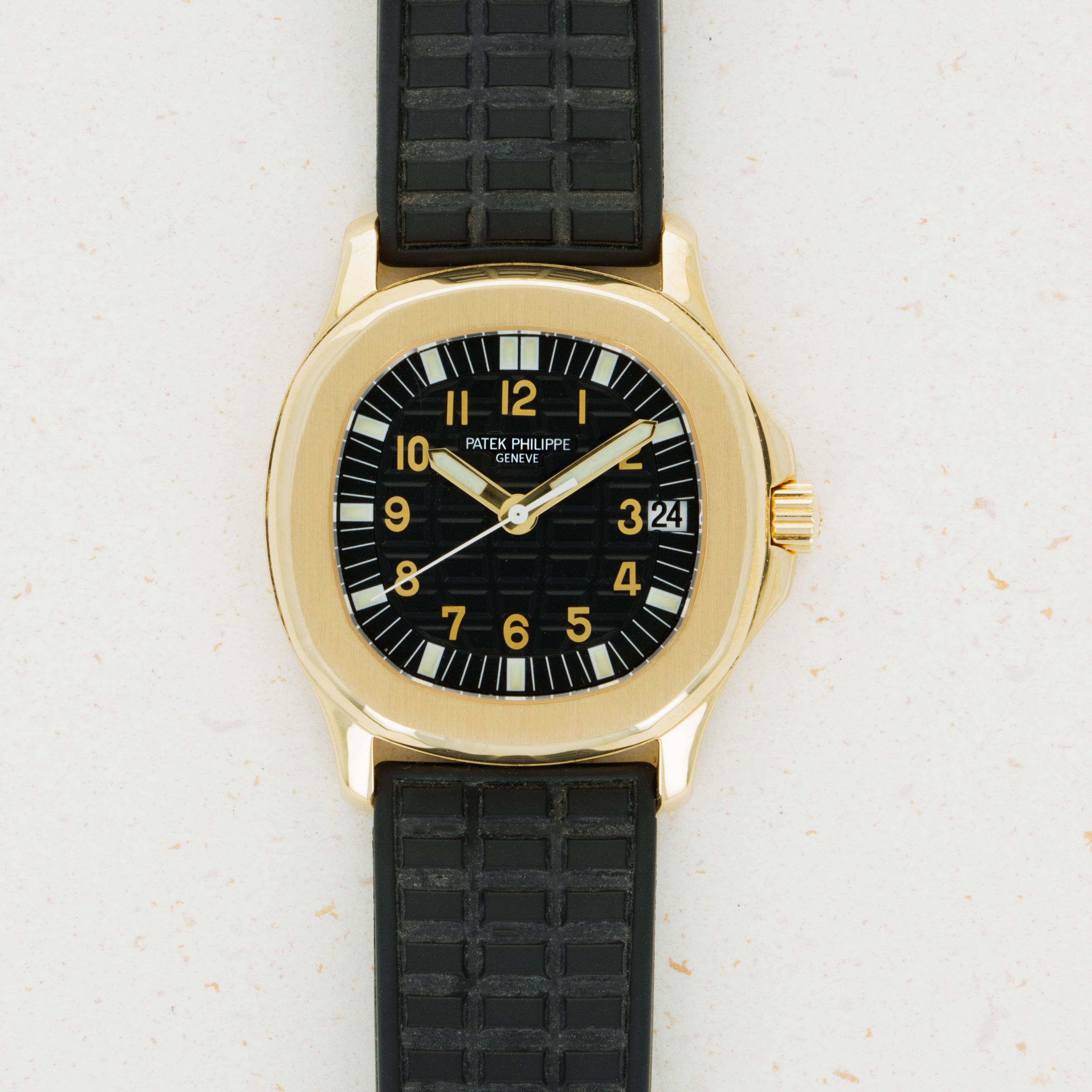 Debuting in 1997, the Patek Philippe Aquanaut was released to engage with a newly minted clientele with money in their pocket thanks to the stock market’s explosion during the dot.com era. Released under the same premise as the Nautilus when it was released in 1976, the Aquanaut was a trendy watch that broke from traditional Patek Philippe aesthetic stylings. Featuring a first for Patek with its composite strap, the Aquanaut needed to be delicately launched. So it was first released as a limited-edition offering of 1000 pieces with the ref. 5060A. Thanks to its success, in 1998, the year following, Patek launched a new variant of the Aquanaut, the ref. 5066 in stainless steel and in 18kt yellow gold, which is the example we have here. Featuring the same 36mm stainless case design and the same automatic cal. 330 SC movement as the ref. 5060, the ref. 5066 is very similar to its predecessor. However, in what was certainly a welcome change considering Patek Philippe’s famed finishing, the ref. 5066 did introduce a new sapphire crystal exhibition caseback to the collection. This allowed the 120m water-resistant Aquanaut 5066 reference to become the most water-resistant timepiece to sport an exhibition caseback, an impressive feat for Patek Philippe considering their pedigree was in complicated classical timepieces, not sports watches. An icon of modern watchmaking, the Aquanaut has transcended horology, and with the ref. 5066 marking the beginning of its production as a serially-produced watch, it is a remarkably important and collectible reference. Furthermore, the ref. 5066J stood as one of the most luxurious Aquanauts in production until its discontinuation in 2007.