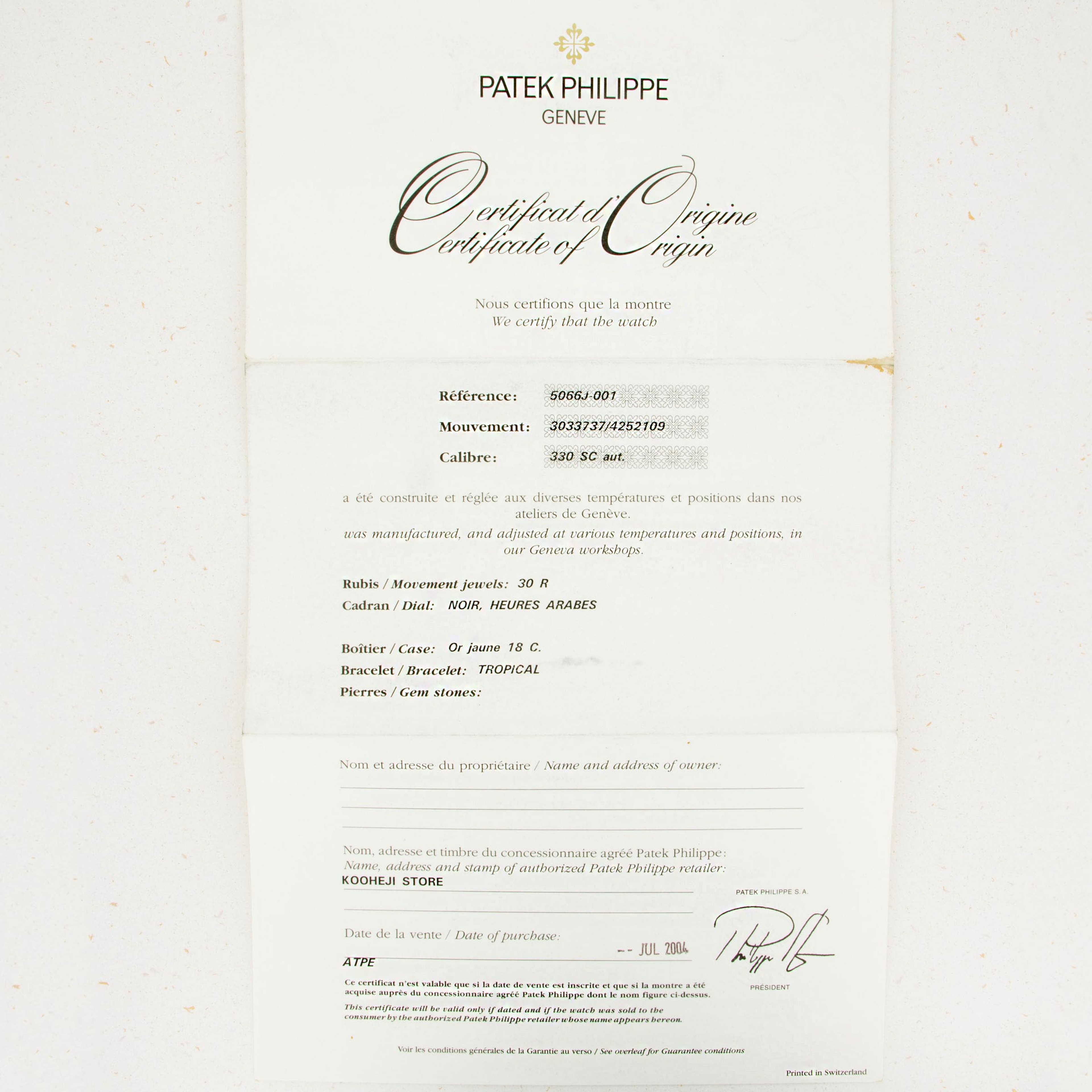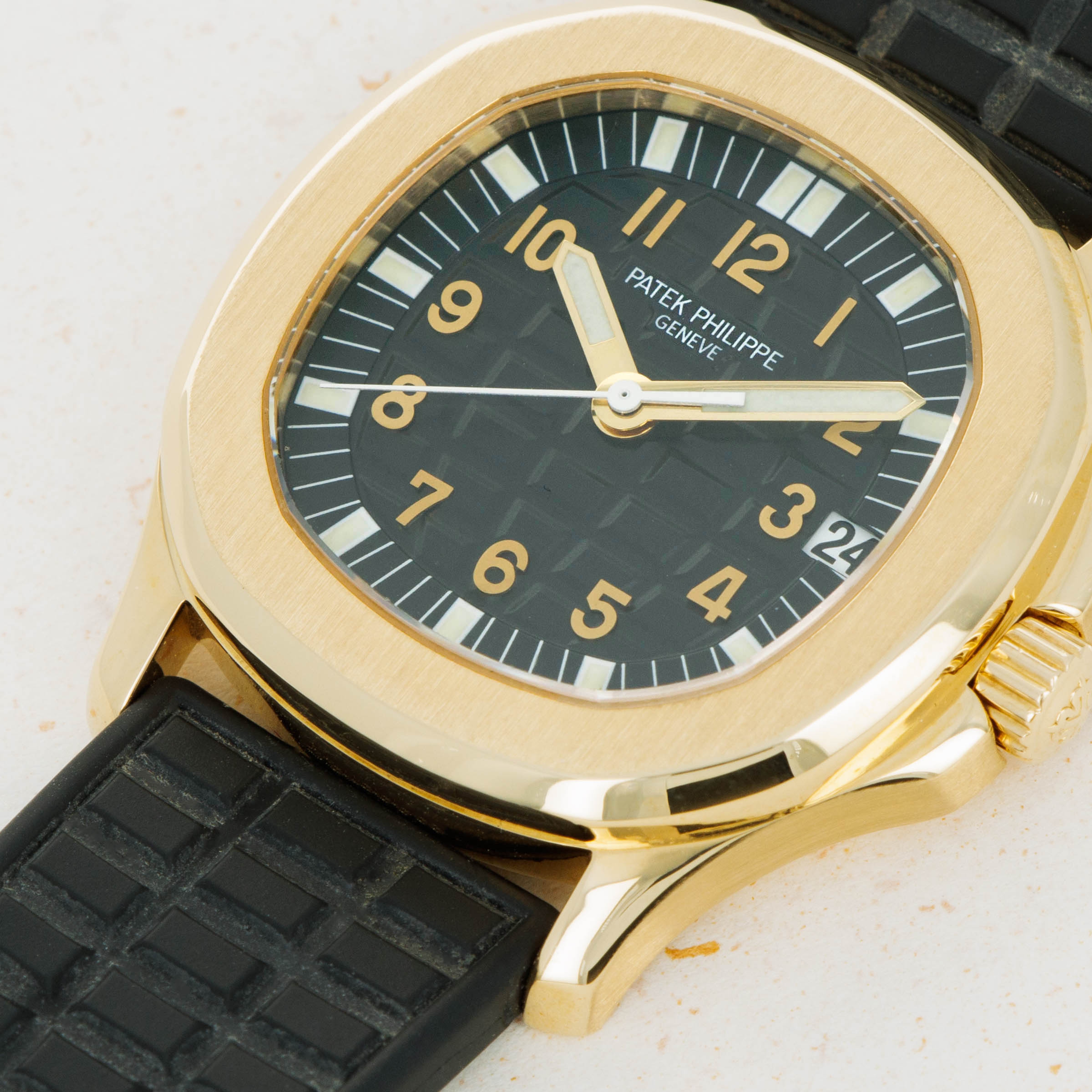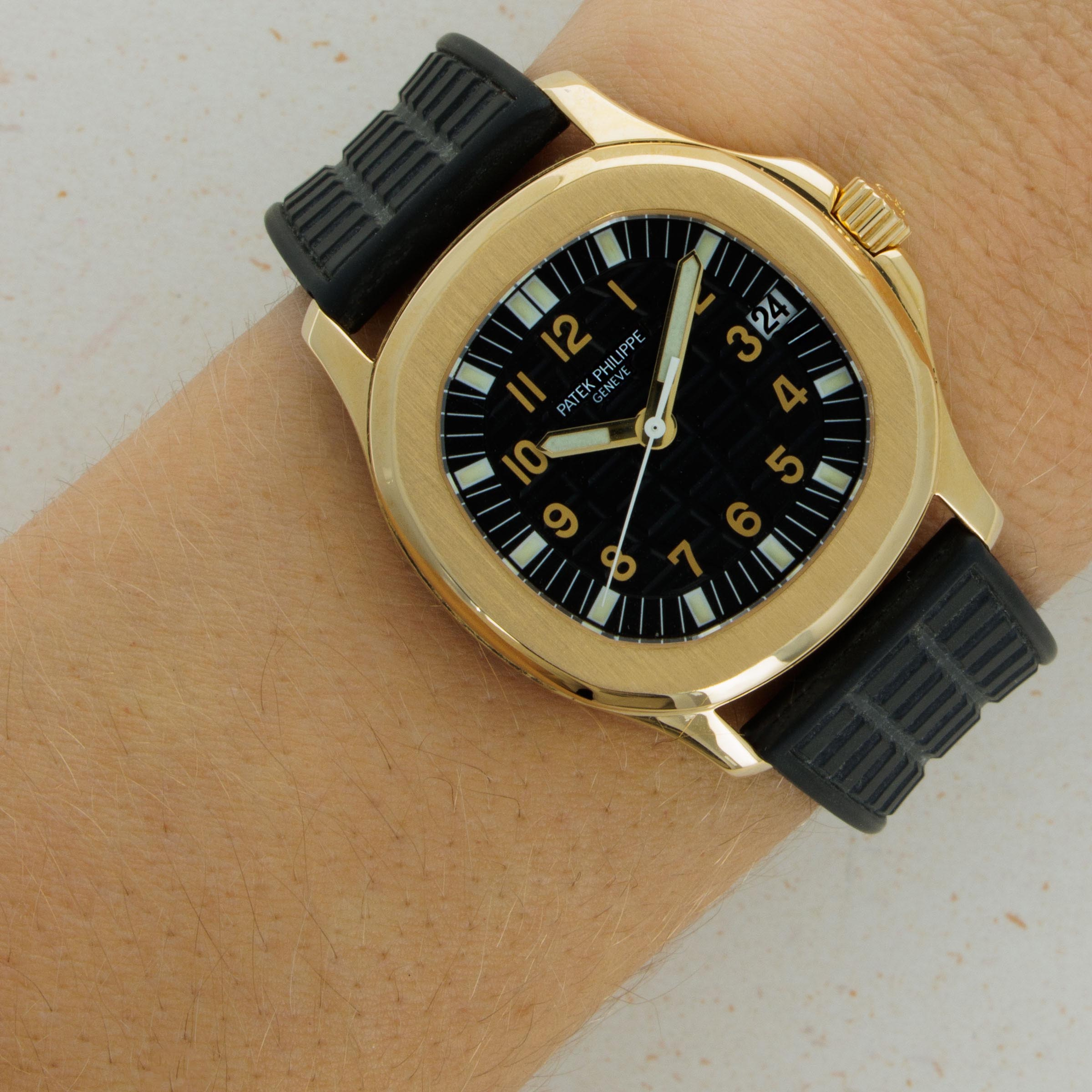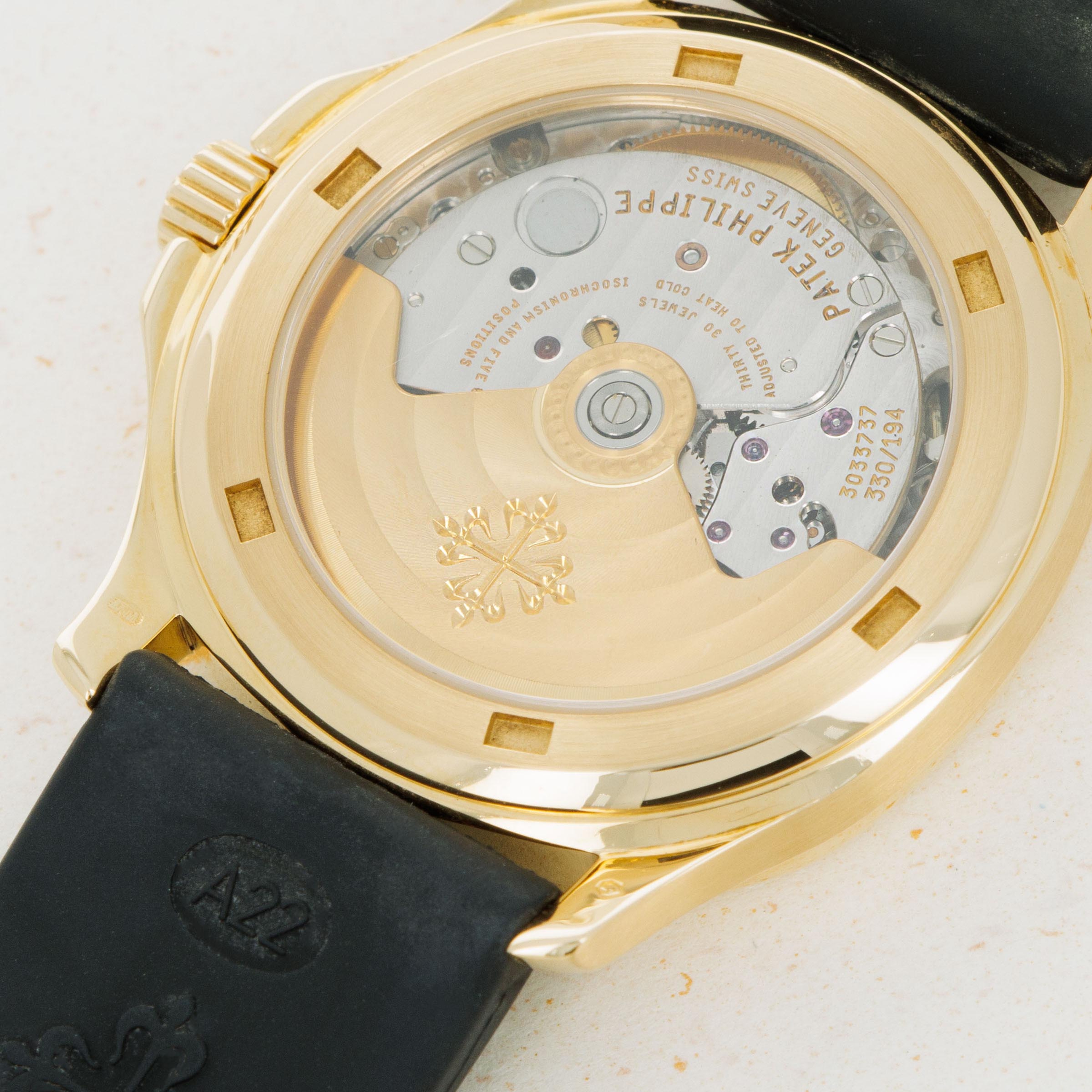 Debuting in 1997, the Patek Philippe Aquanaut was released to engage with a newly minted clientele with money in their pocket thanks to the stock market’s explosion during the dot.com era. Released under the same premise as the Nautilus when it was released in 1976, the Aquanaut was a trendy watch that broke from traditional Patek Philippe aesthetic stylings. Featuring a first for Patek with its composite strap, the Aquanaut needed to be delicately launched. So it was first released as a limited-edition offering of 1000 pieces with the ref. 5060A. Thanks to its success, in 1998, the year following, Patek launched a new variant of the Aquanaut, the ref. 5066 in stainless steel and in 18kt yellow gold, which is the example we have here. Featuring the same 36mm stainless case design and the same automatic cal. 330 SC movement as the ref. 5060, the ref. 5066 is very similar to its predecessor. However, in what was certainly a welcome change considering Patek Philippe’s famed finishing, the ref. 5066 did introduce a new sapphire crystal exhibition caseback to the collection. This allowed the 120m water-resistant Aquanaut 5066 reference to become the most water-resistant timepiece to sport an exhibition caseback, an impressive feat for Patek Philippe considering their pedigree was in complicated classical timepieces, not sports watches. An icon of modern watchmaking, the Aquanaut has transcended horology, and with the ref. 5066 marking the beginning of its production as a serially-produced watch, it is a remarkably important and collectible reference. Furthermore, the ref. 5066J stood as one of the most luxurious Aquanauts in production until its discontinuation in 2007.