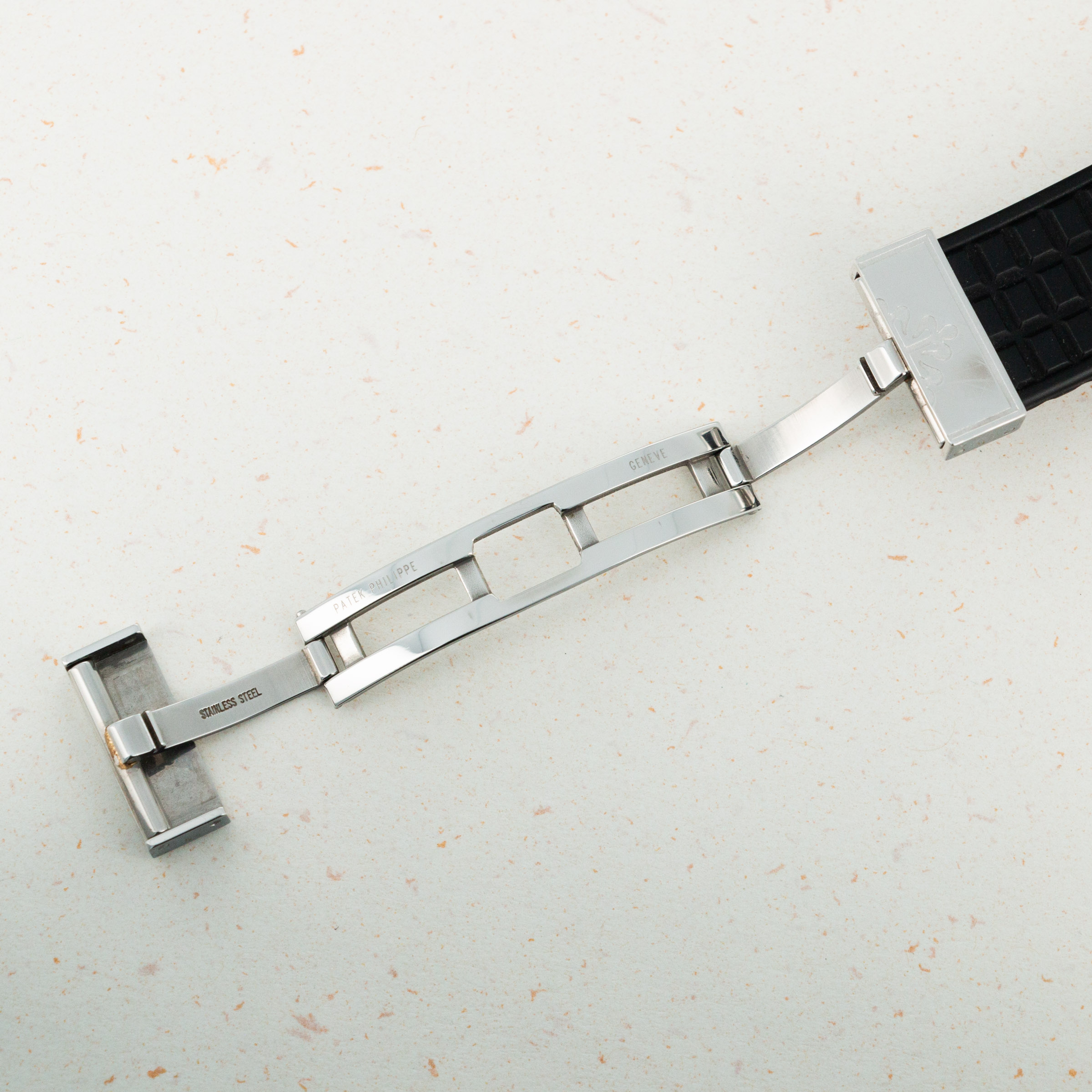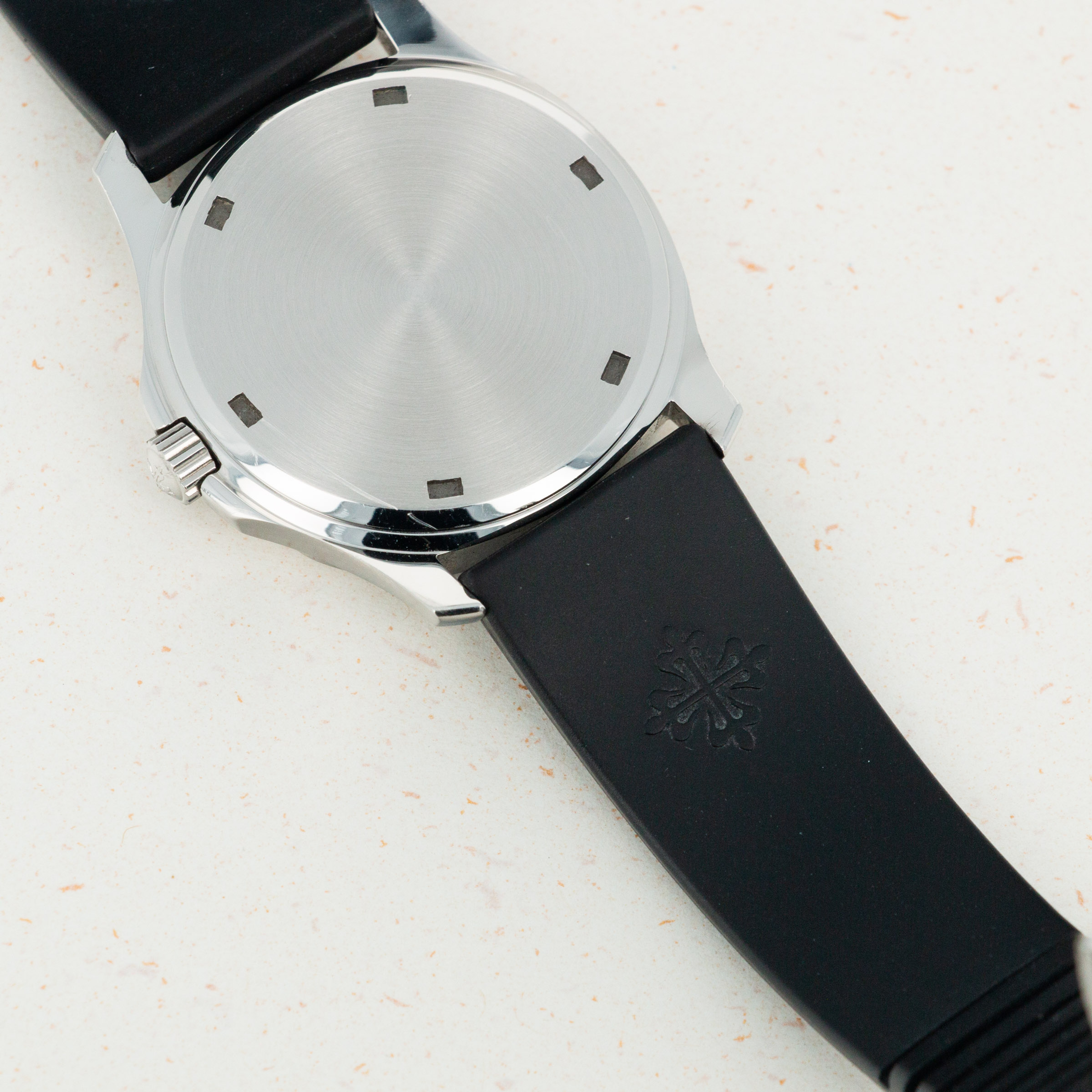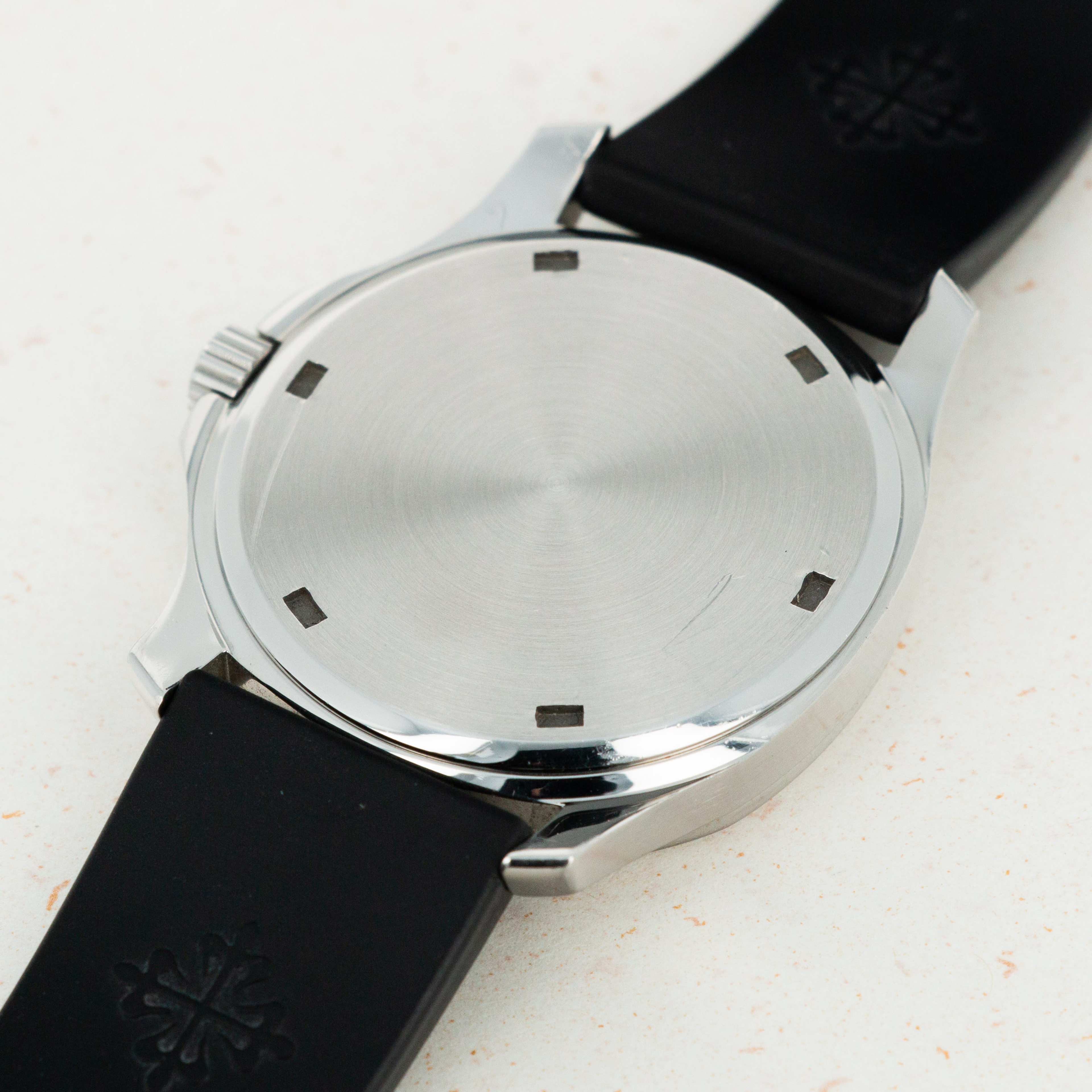 The overall condition of the watch is brilliant. Hairline abrasions are visible throughout -namely on the bezel, case sides and caseback. The dial is phenomenal with rich yellow patina on the indexes. Rubber strap is sized for a 6.75 inch wrist. The buckle has faint needlelike scratches. Being that the deployant does not possess the early 'Nautilus' signature, we speculate that it could have been replaced at some point or it was delivered as such.