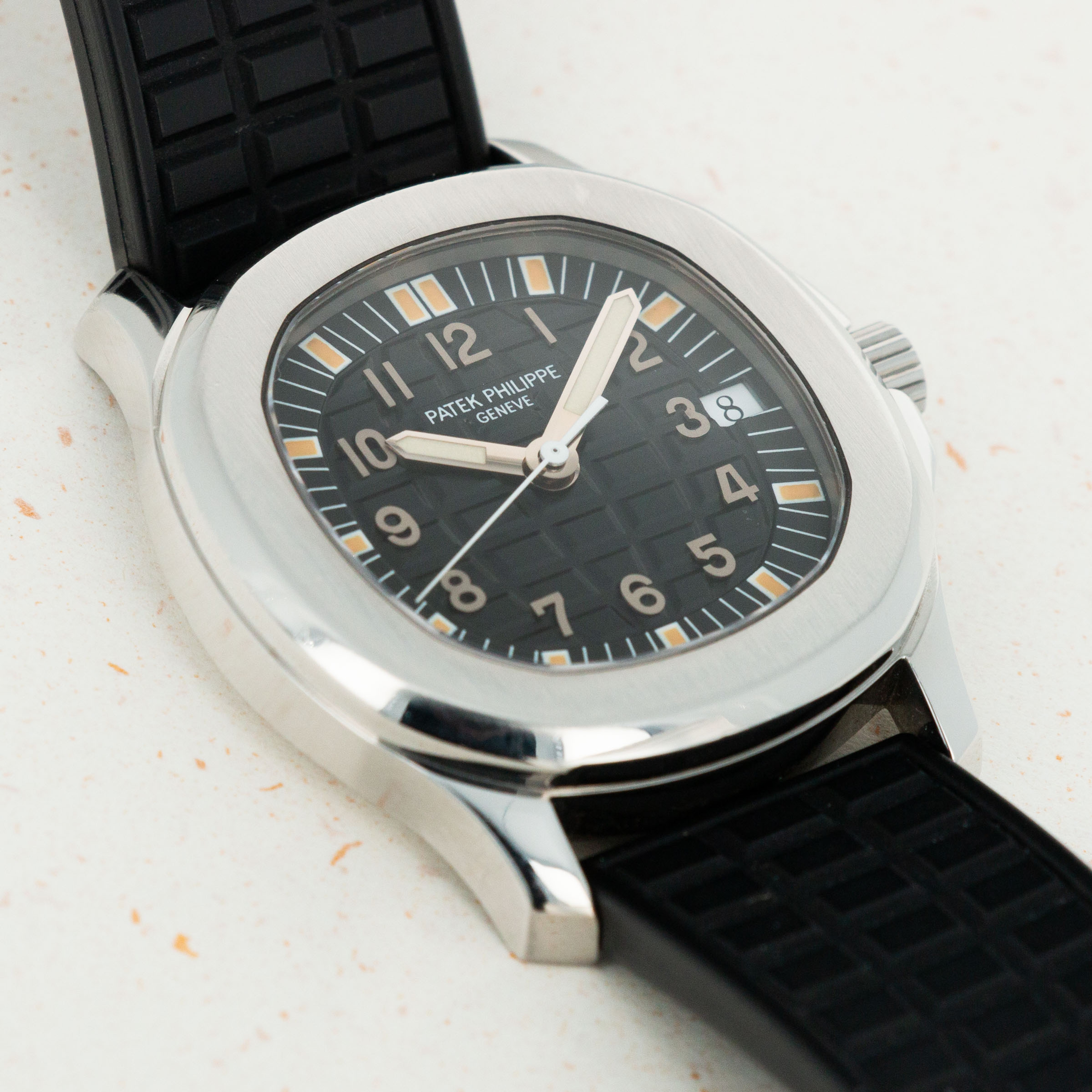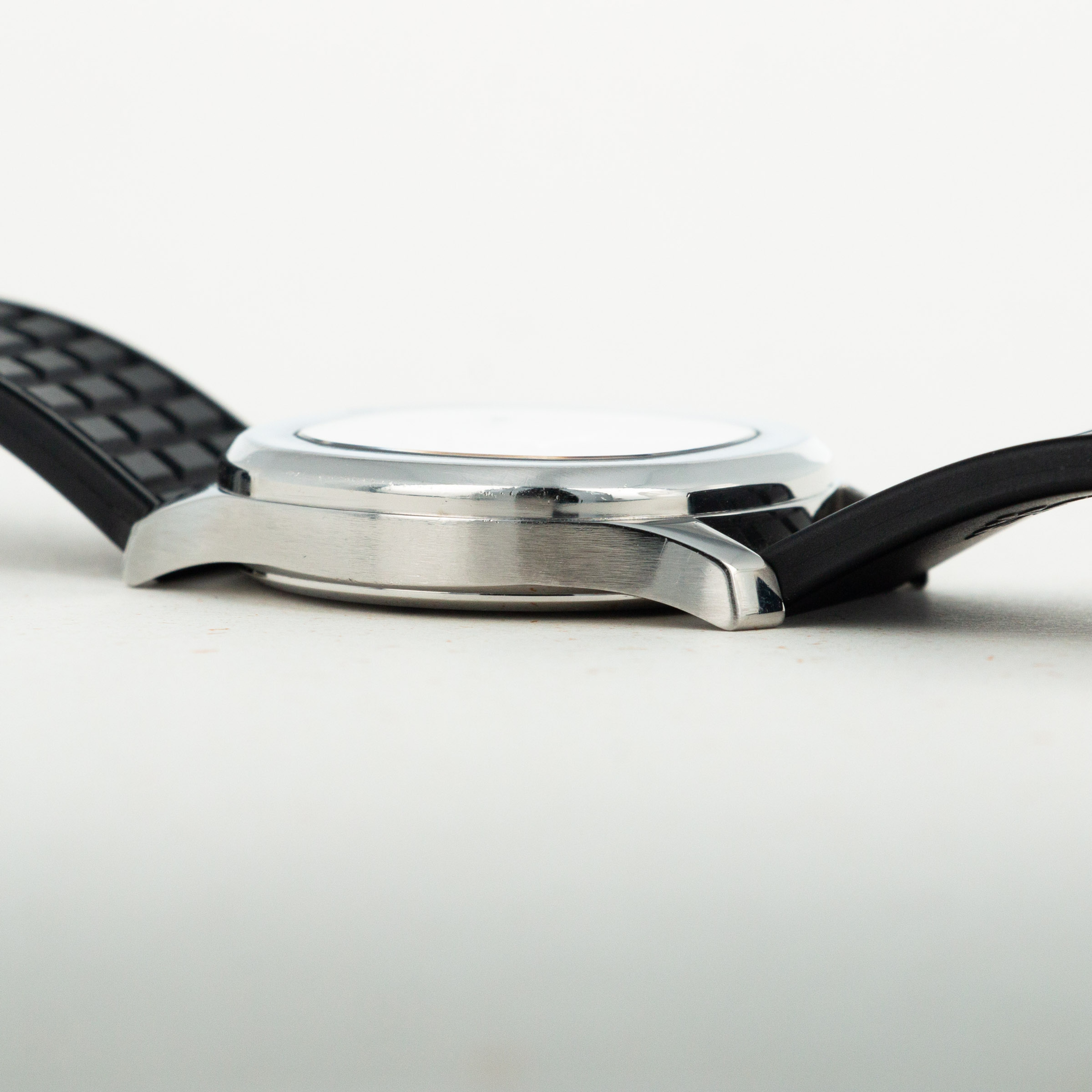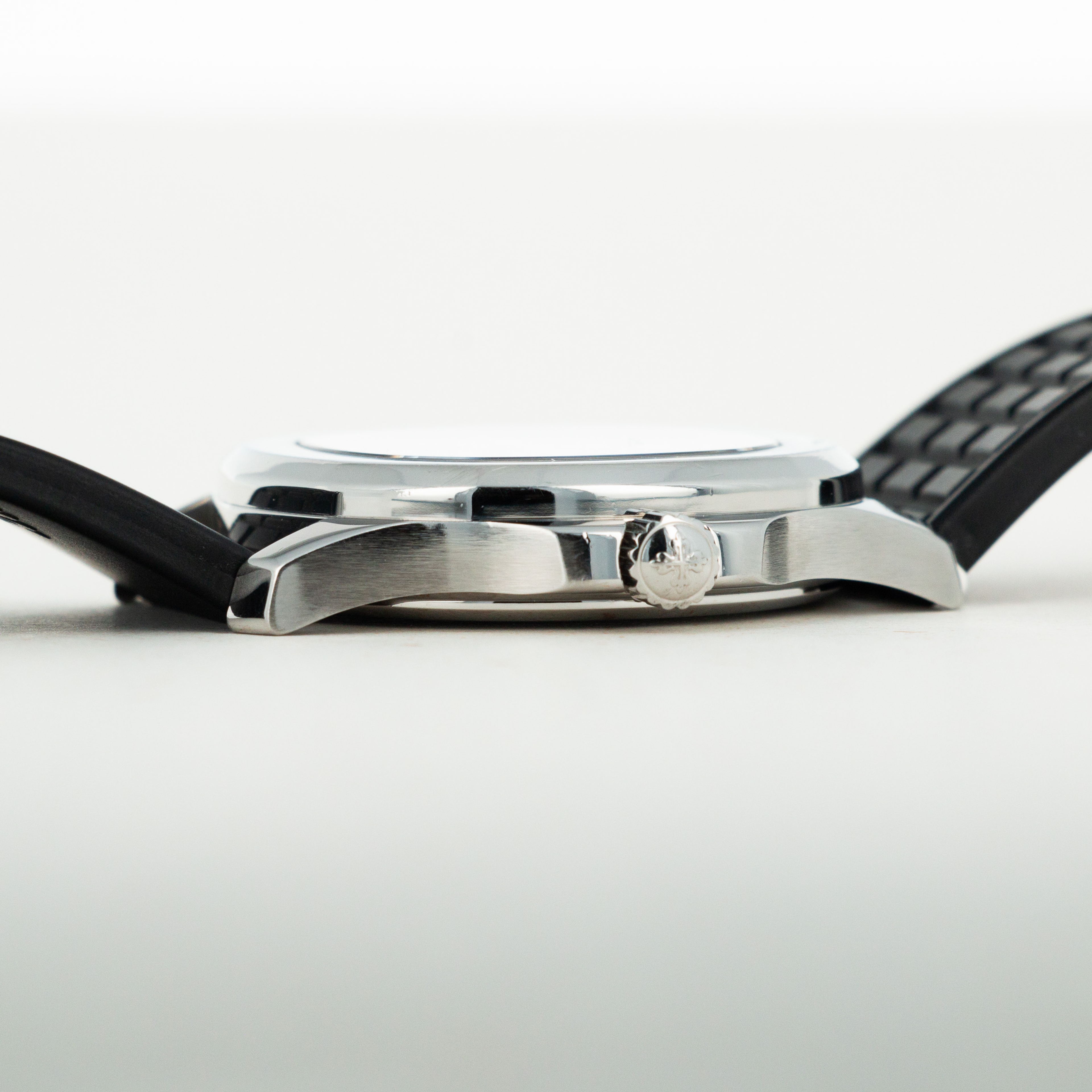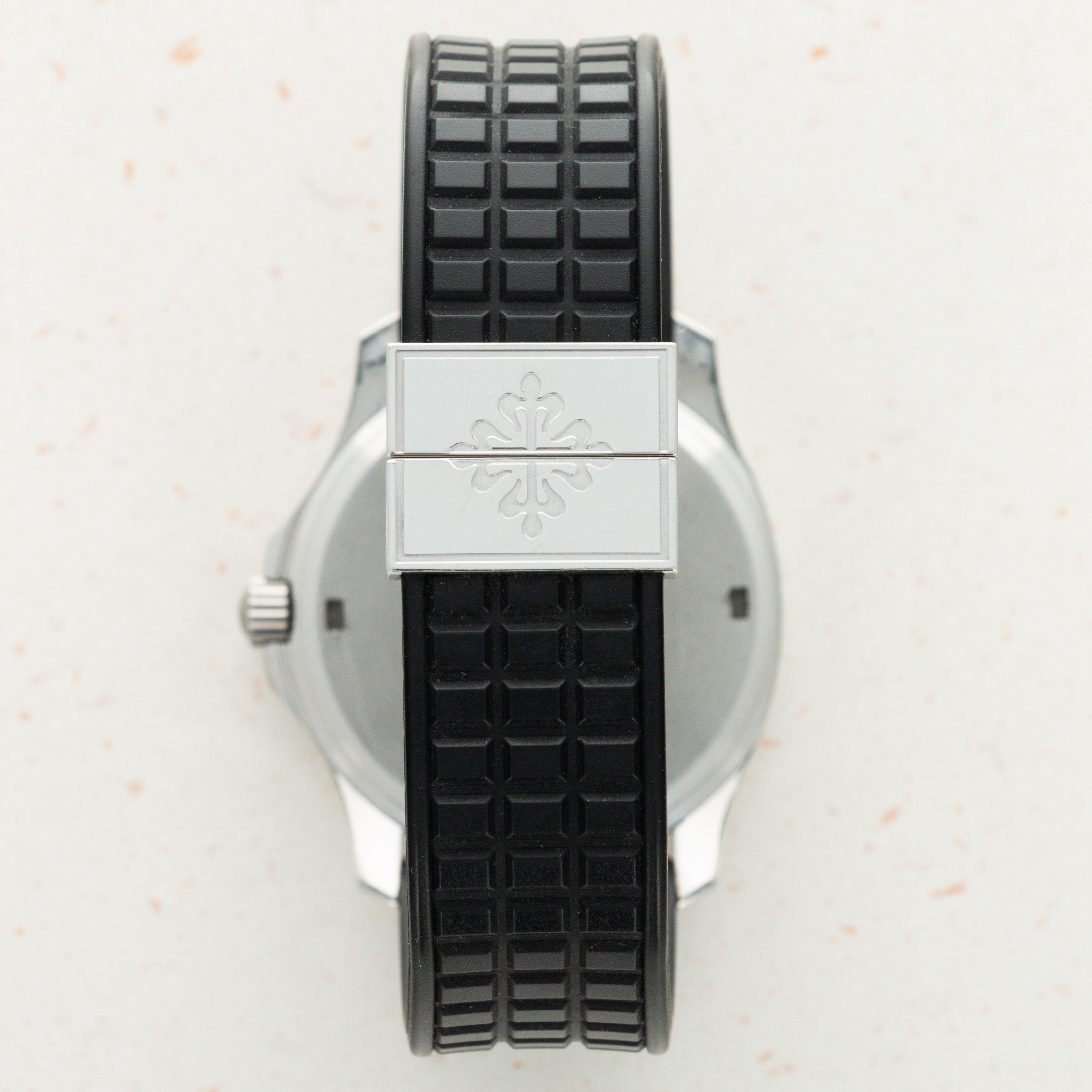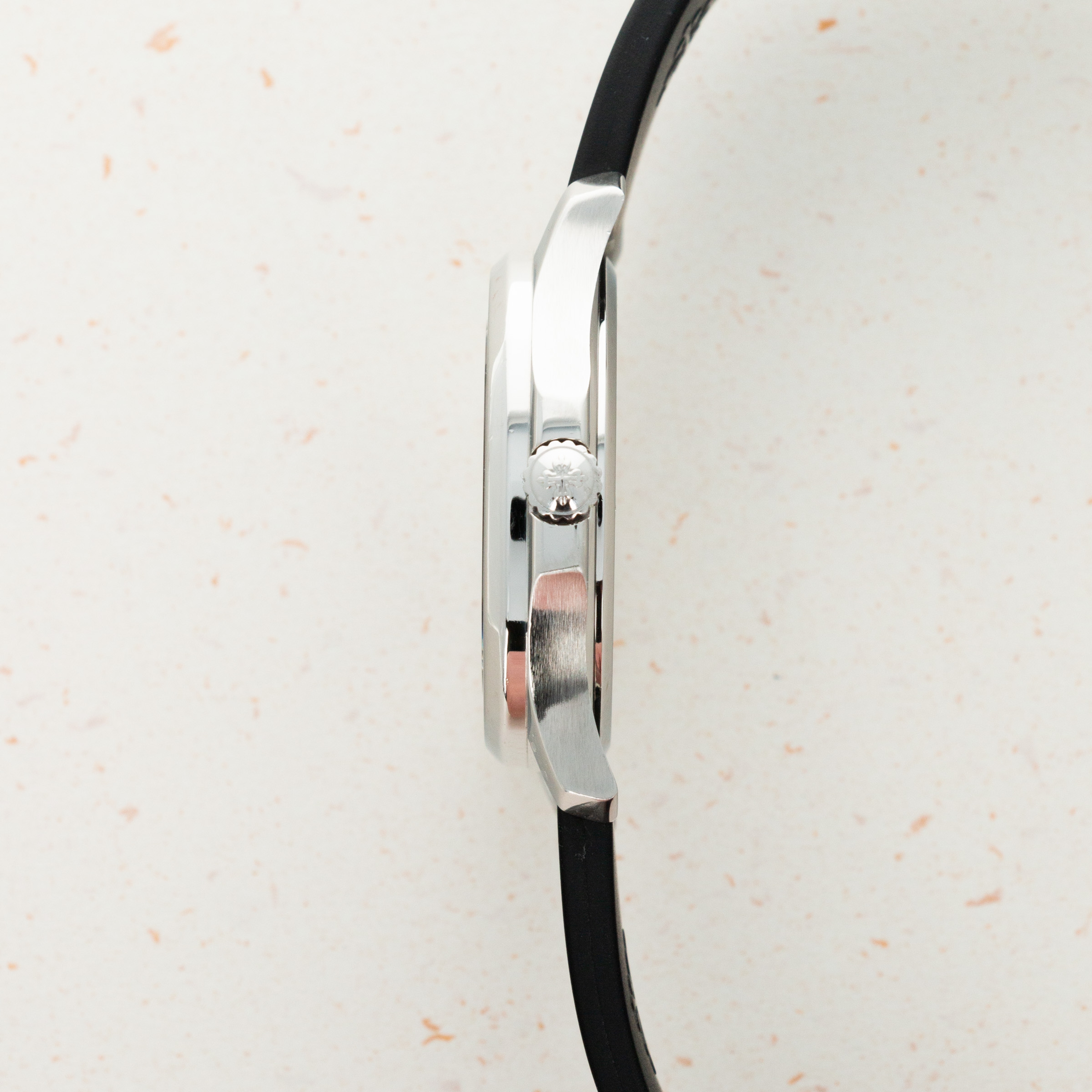 Introduced in 1998, the Aquanaut was Patek Philippe's attempt at appealing to a younger audience. No longer featuring an integrated bracelet like its big brother the Nautilus, it was first released on a rubber strap. 5060 was the very first model of the Aquanaut, and it came with a solid caseback (as opposed to the later display back variants). All in all, approximately 1000 pieces were created, split between steel and gold versions. There are rumors that it was produced at the behest of former Libyan dictator Muammar Gaddafi, with the dial design inspired by a grenade.