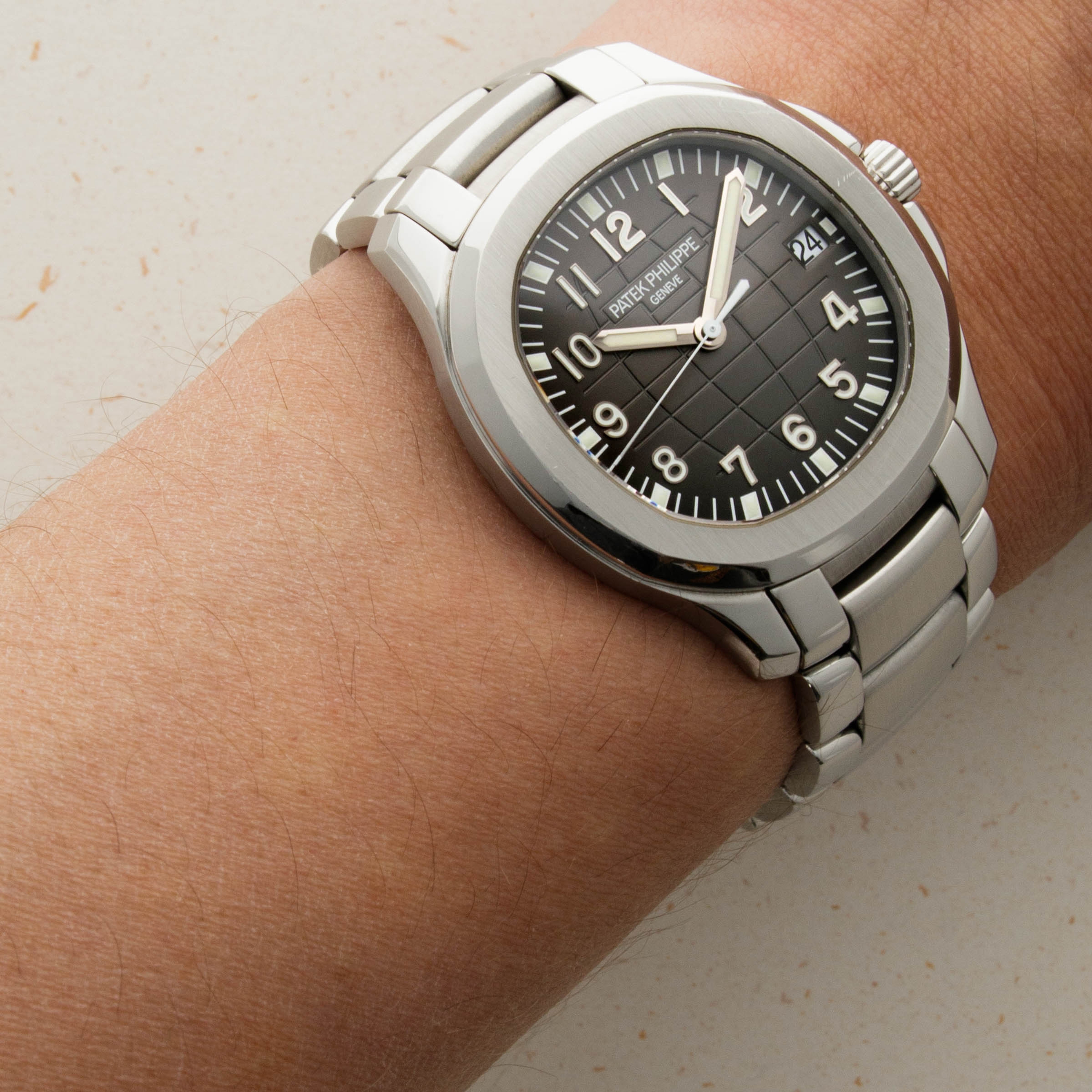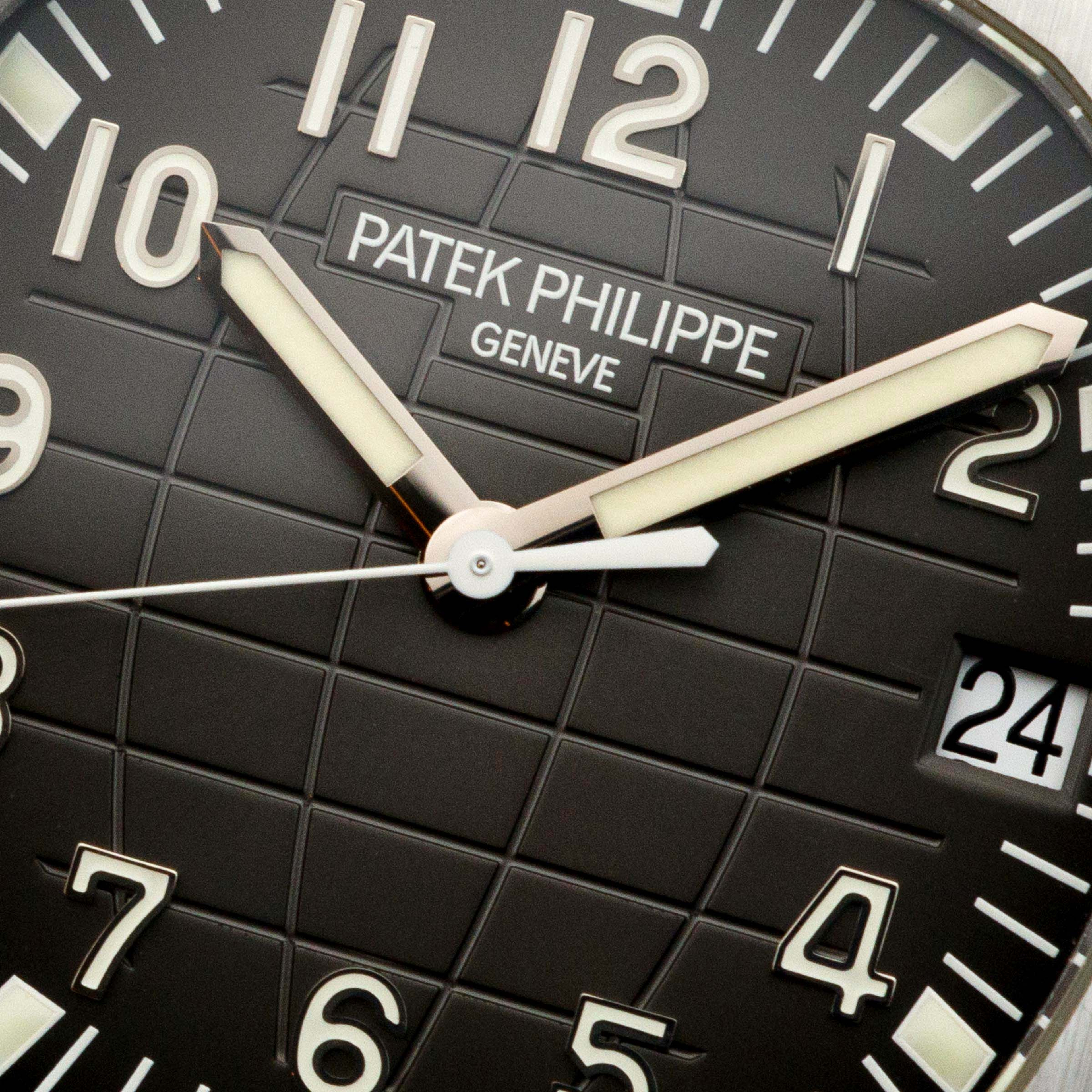 The ref. 5167's sleek black dial features an engraved crosshatch pattern that, when combined with its applied Arabic numerals, gives the Aquanaut a militaristic and rugged appearance.