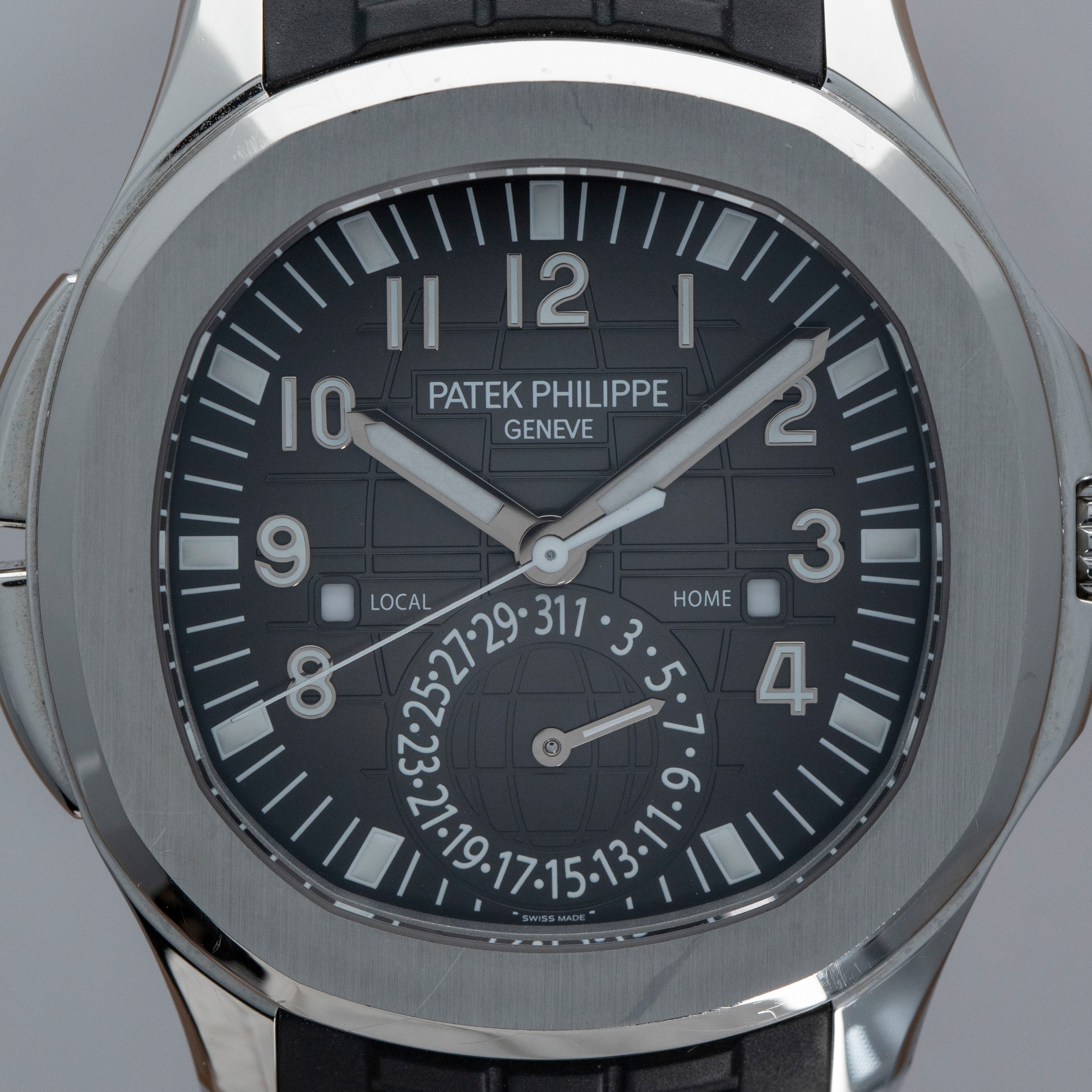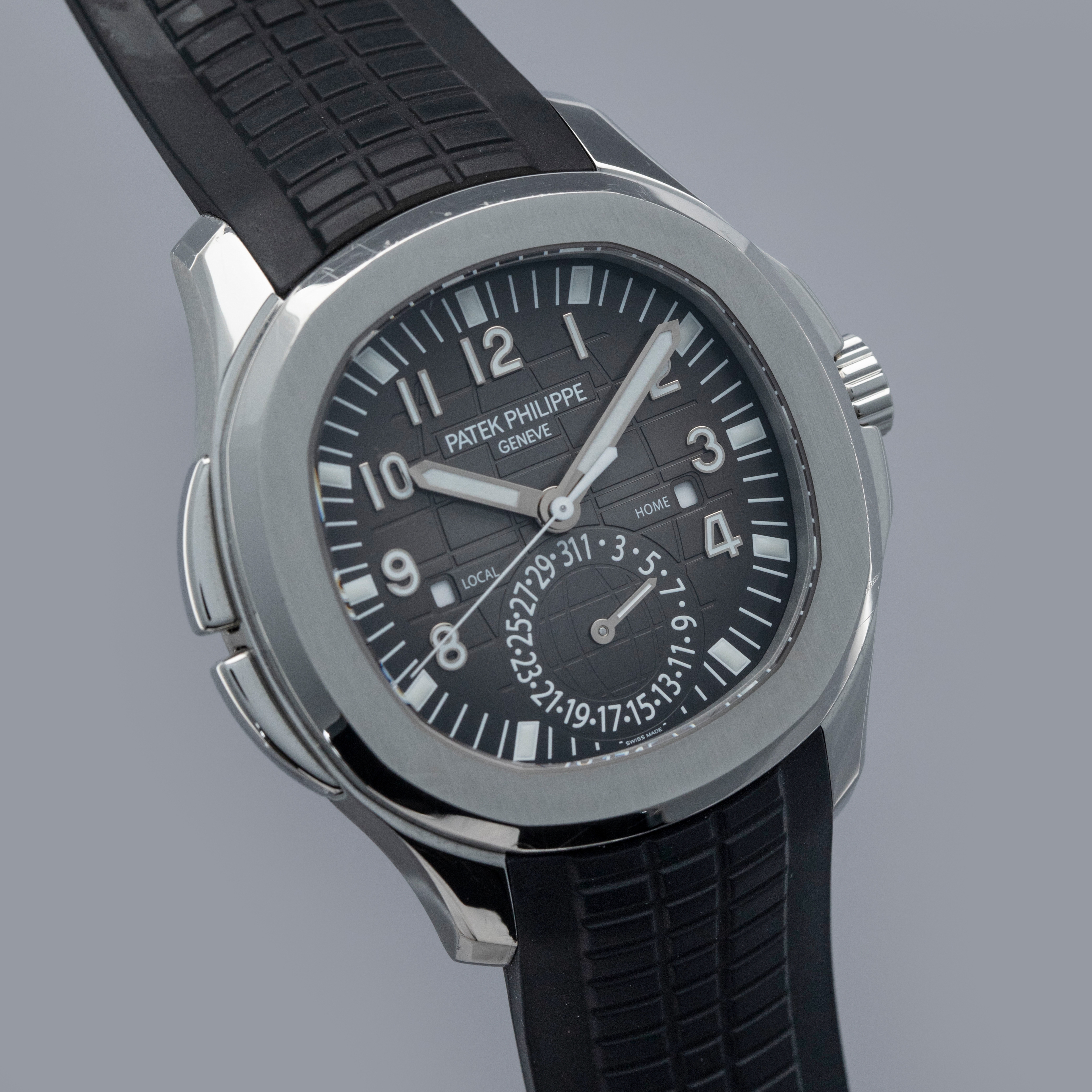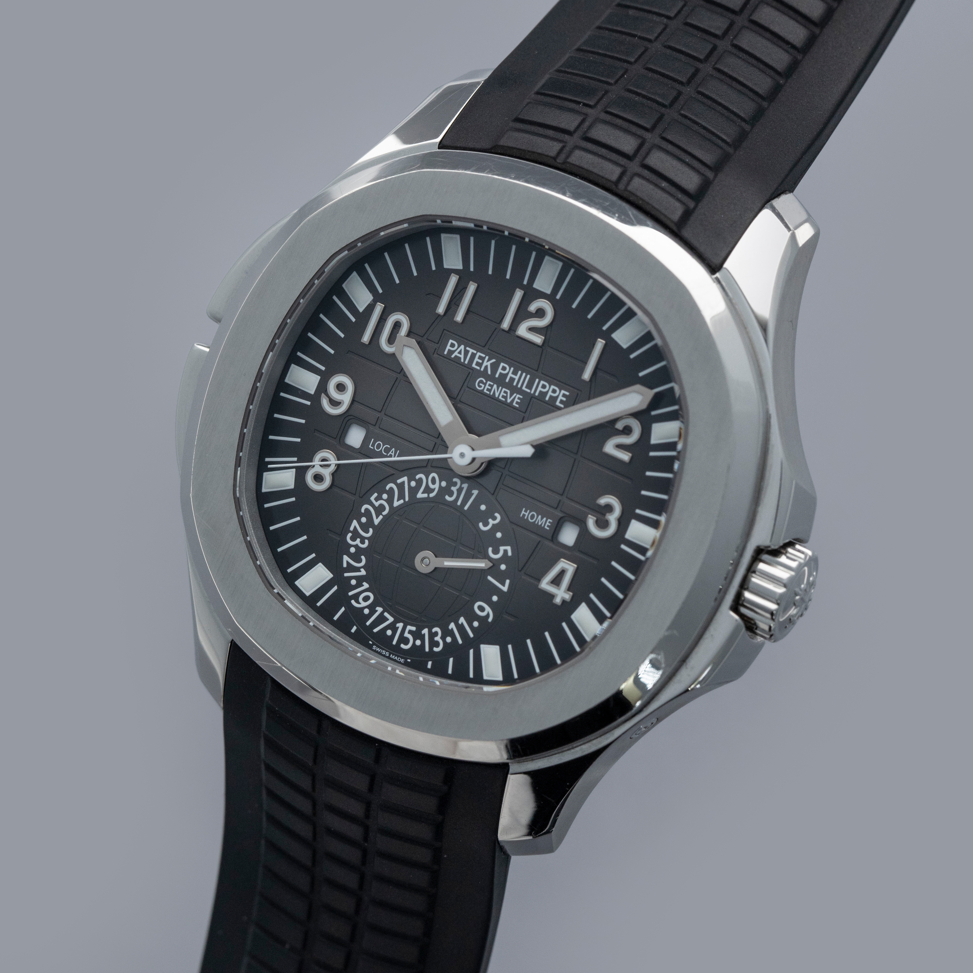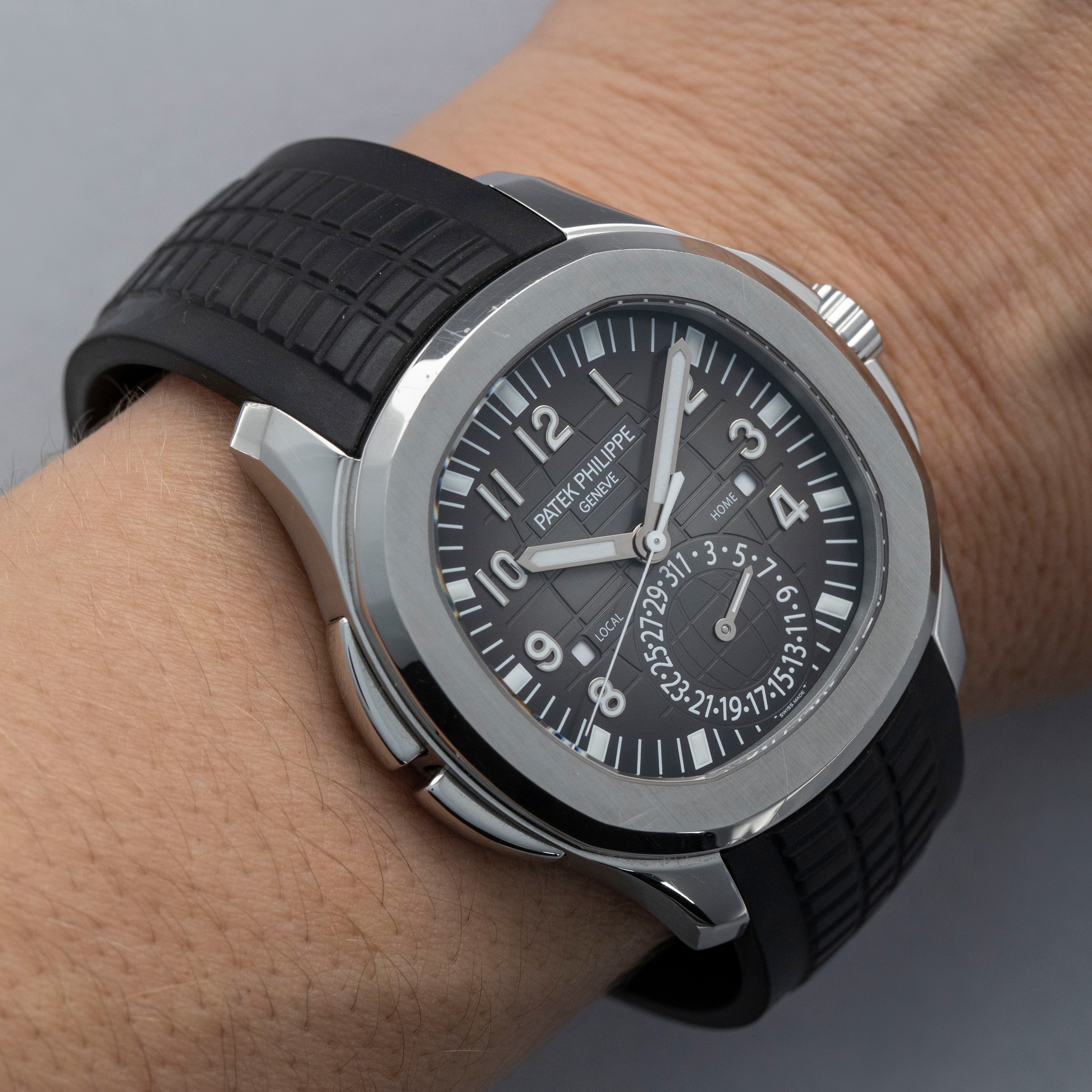 The ref. 5164A's sleek black dial features an engraved crosshatch pattern that flows onto the tropical rubber strap like the other Aquanaut variants, giving the ref. 5164A an entirely integrated aesthetic. Differentiating it from its sibling variants, the ref. 5164A's dial also features a second ghost dual-time hand, a pointer date subdial sandwiched by an AM/PM indicator.