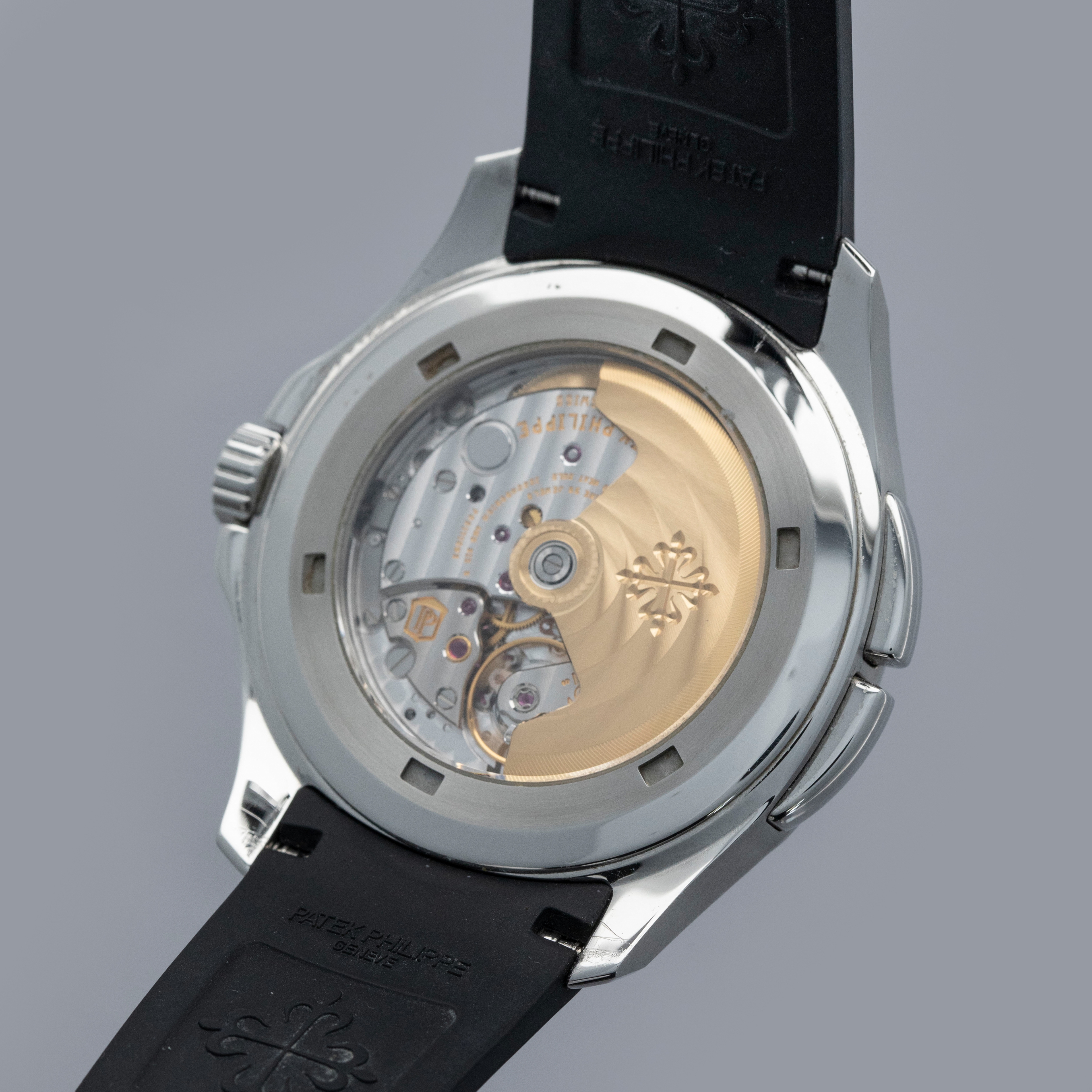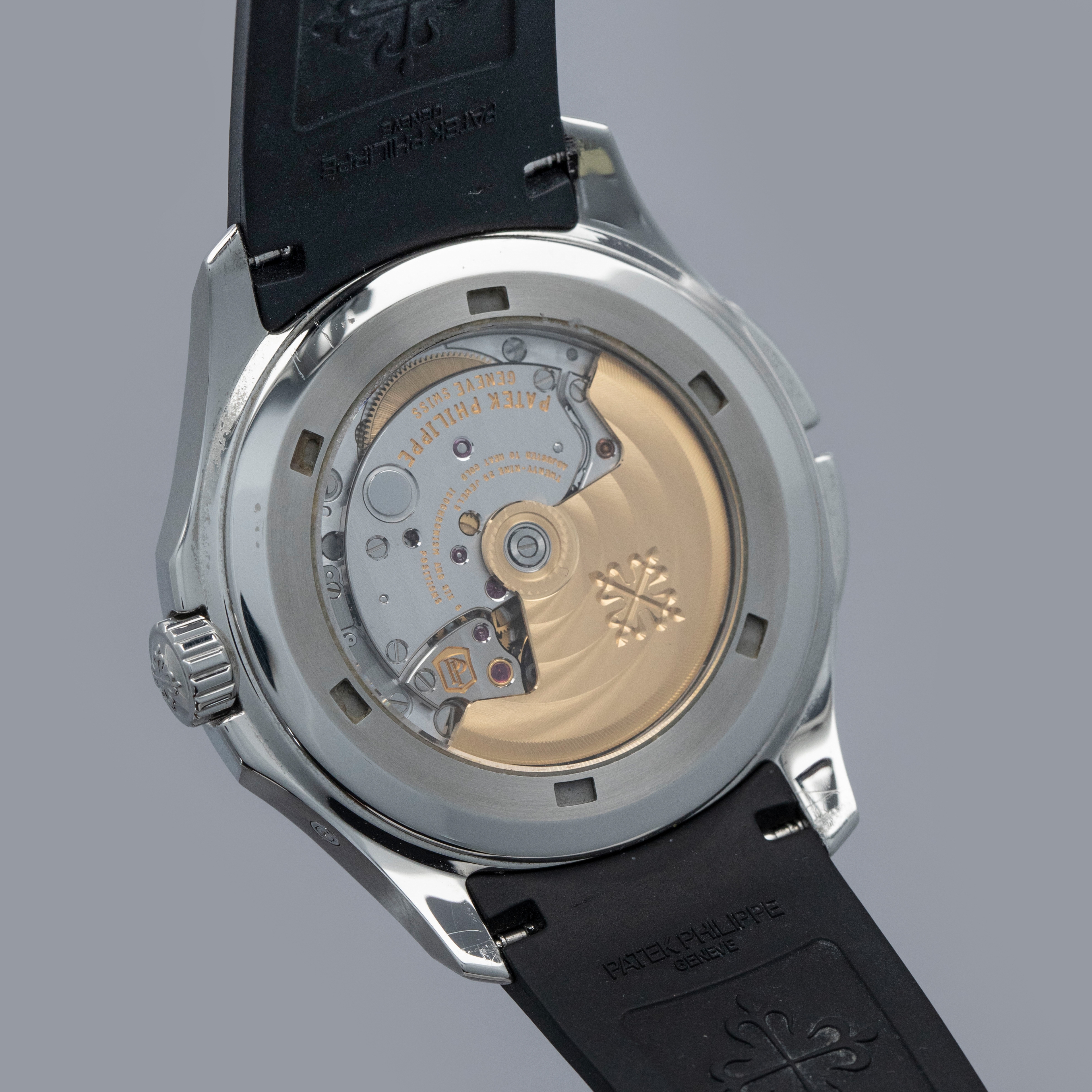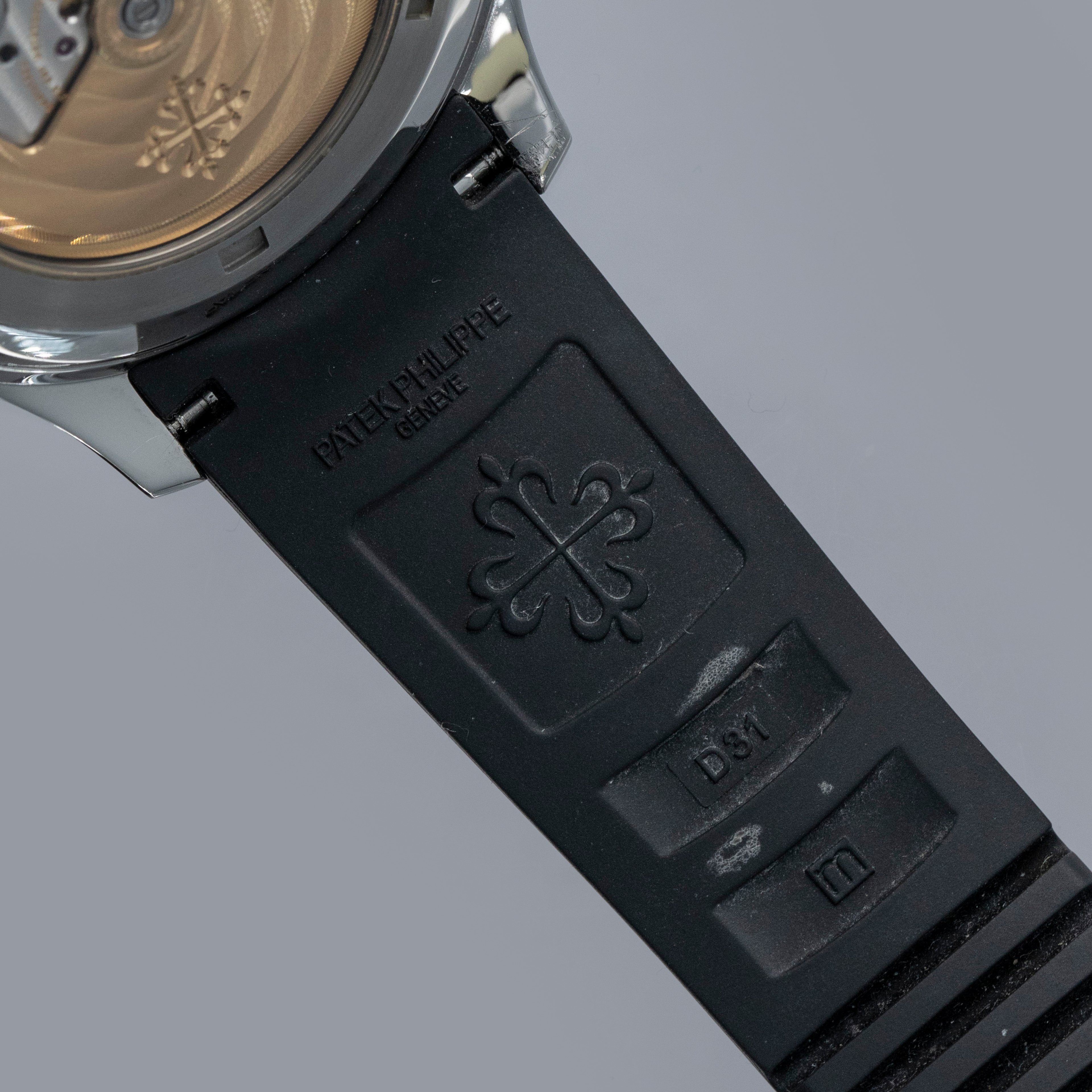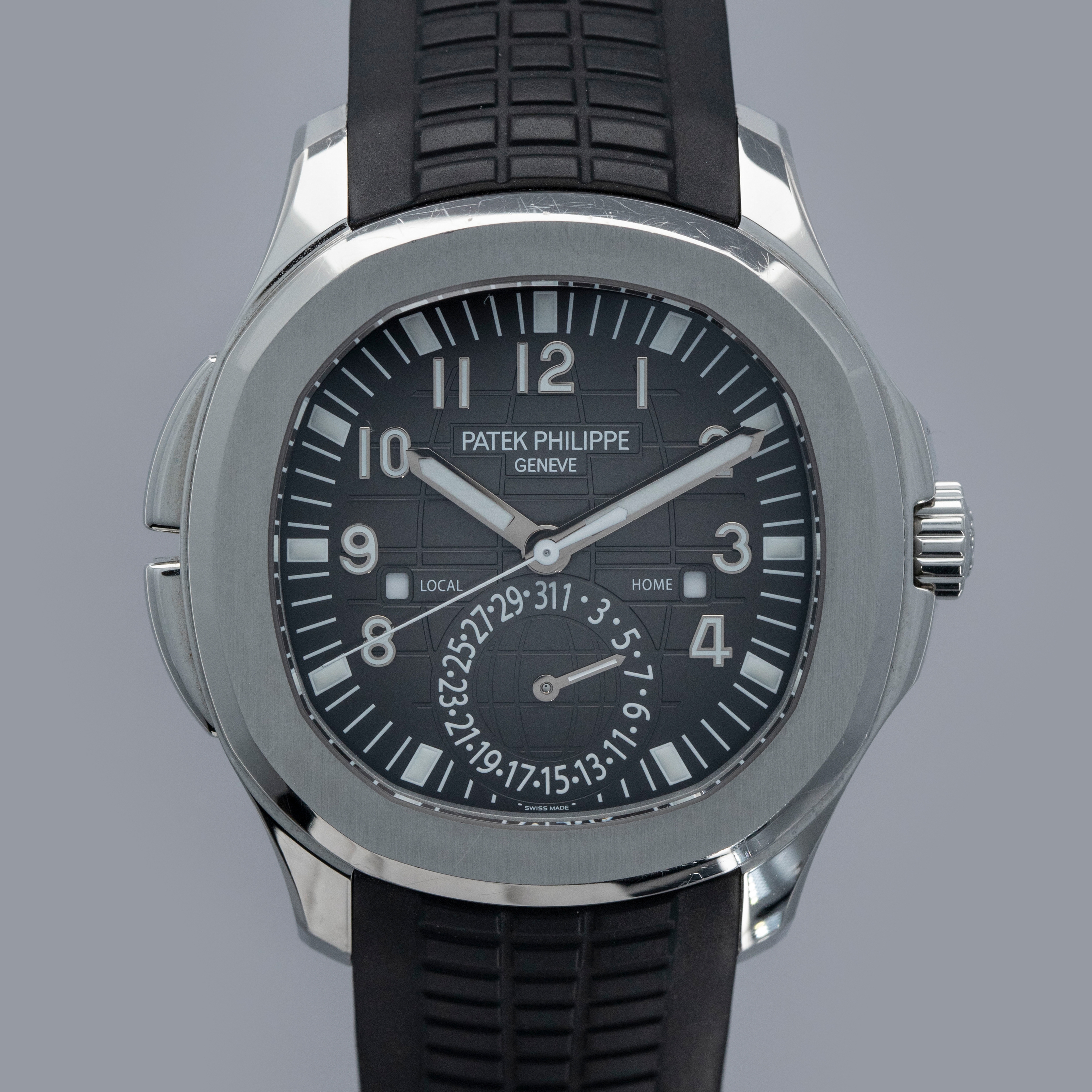 The ref. 5164A's sleek black dial features an engraved crosshatch pattern that flows onto the tropical rubber strap like the other Aquanaut variants, giving the ref. 5164A an entirely integrated aesthetic. Differentiating it from its sibling variants, the ref. 5164A's dial also features a second ghost dual-time hand, a pointer date subdial sandwiched by an AM/PM indicator.