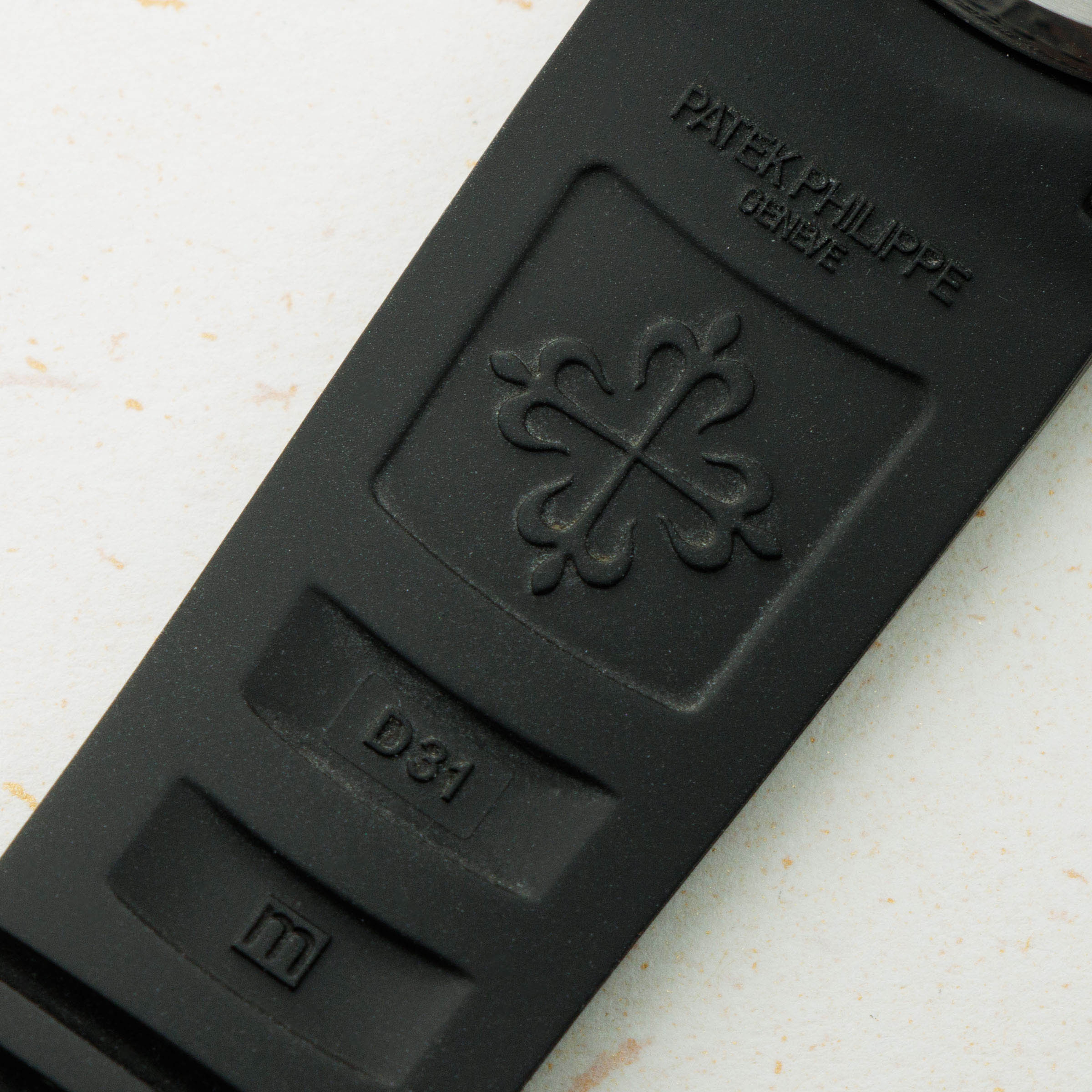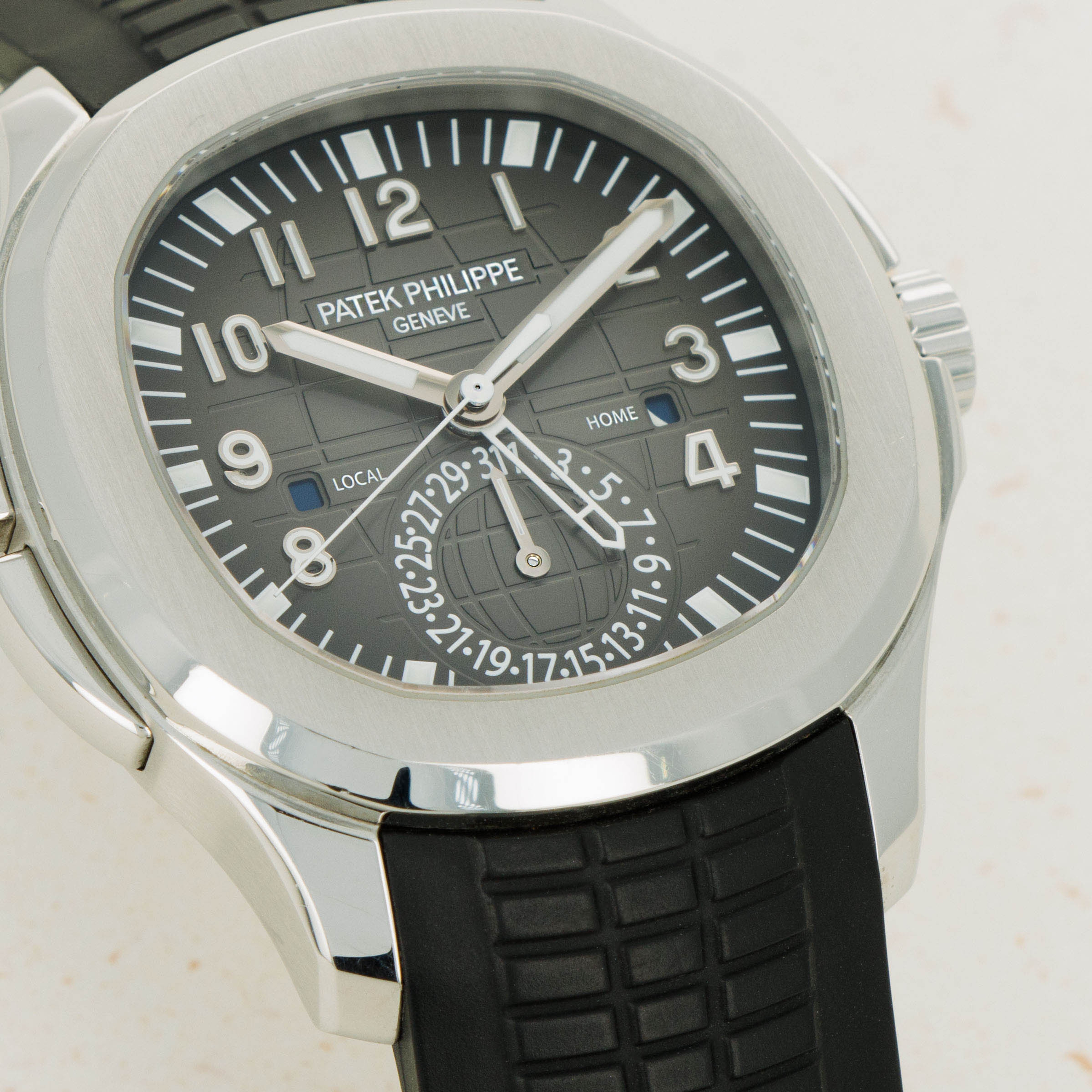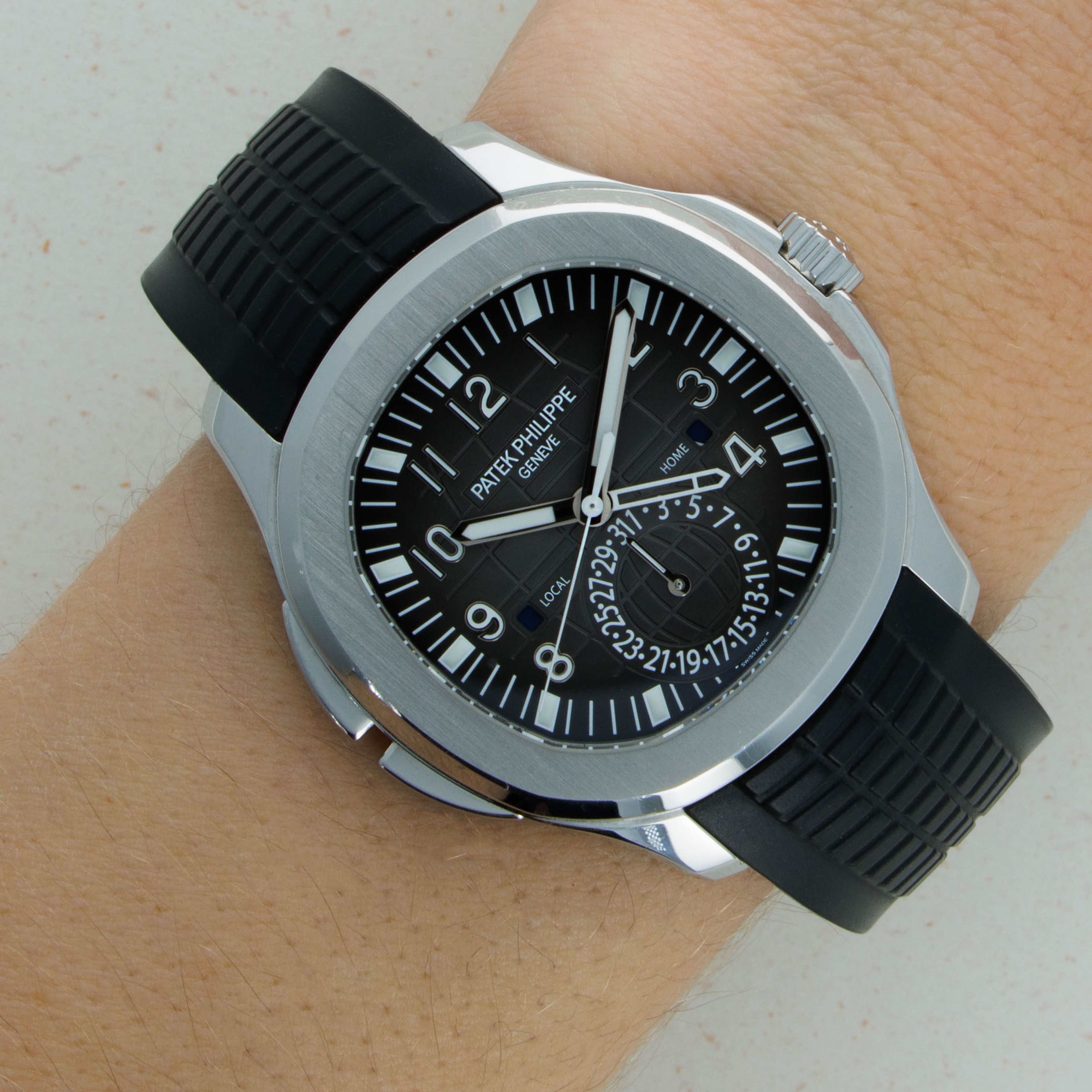 The ref. 5164A's sleek black dial features an engraved crosshatch pattern that flows onto the tropical rubber strap like the other Aquanaut variants, giving the ref. 5164A an entirely integrated aesthetic. Differentiating it from its sibling variants, the ref. 5164A's dial also features a second ghost dual-time hand, a pointer date subdial sandwiched by an AM/PM indicator.