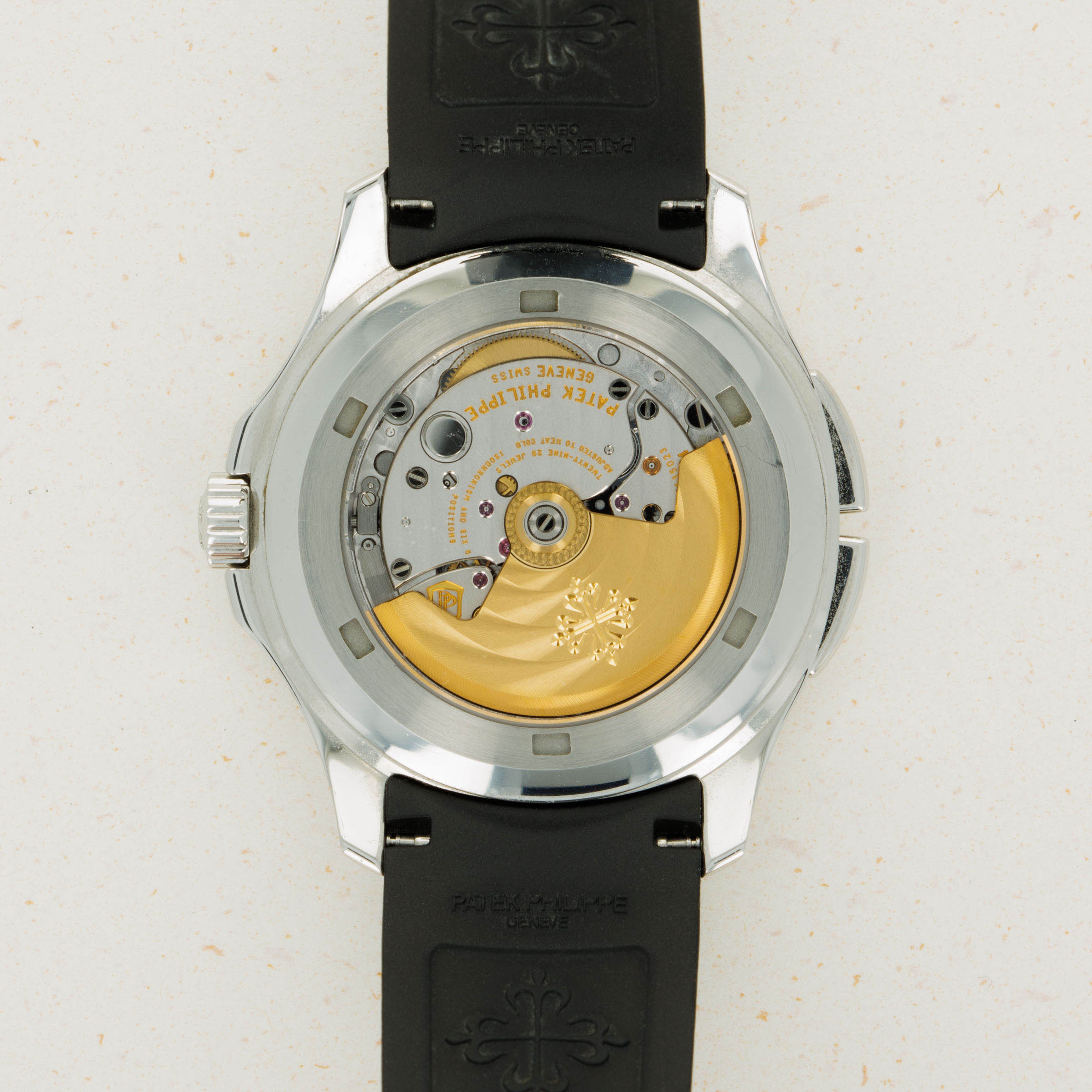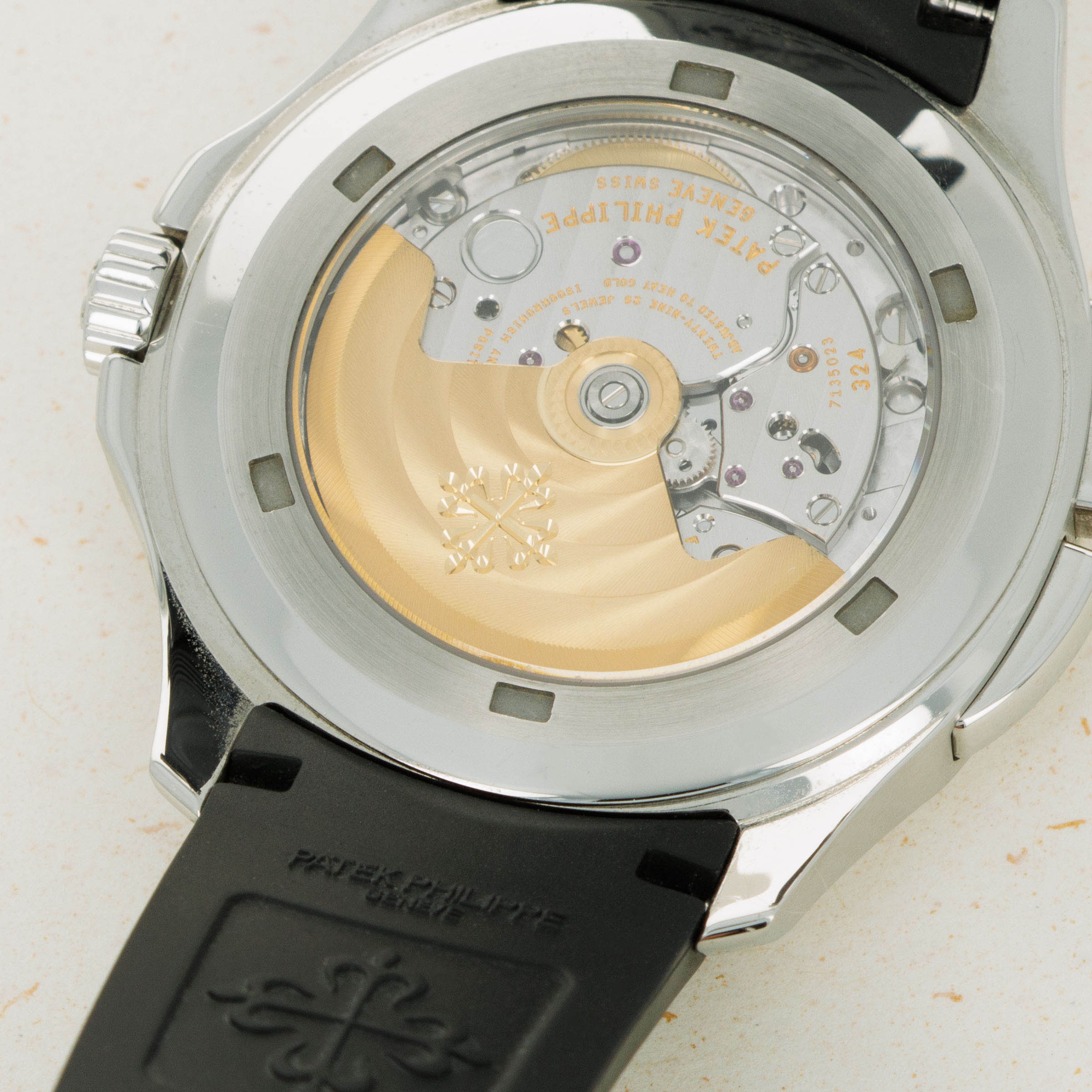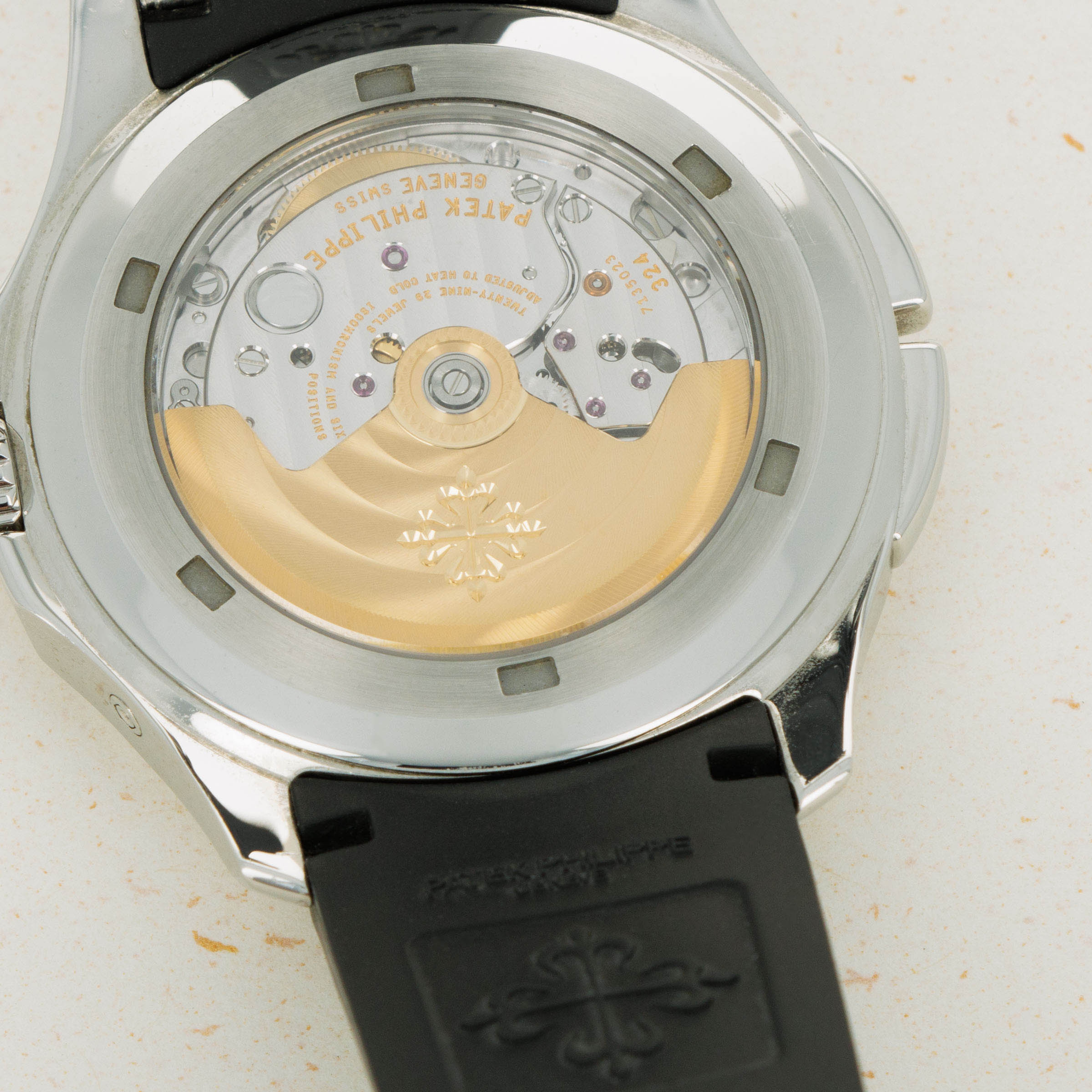 The ref. 5164A's sleek black dial features an engraved crosshatch pattern that flows onto the tropical rubber strap like the other Aquanaut variants, giving the ref. 5164A an entirely integrated aesthetic. Differentiating it from its sibling variants, the ref. 5164A's dial also features a second ghost dual-time hand, a pointer date subdial sandwiched by an AM/PM indicator.