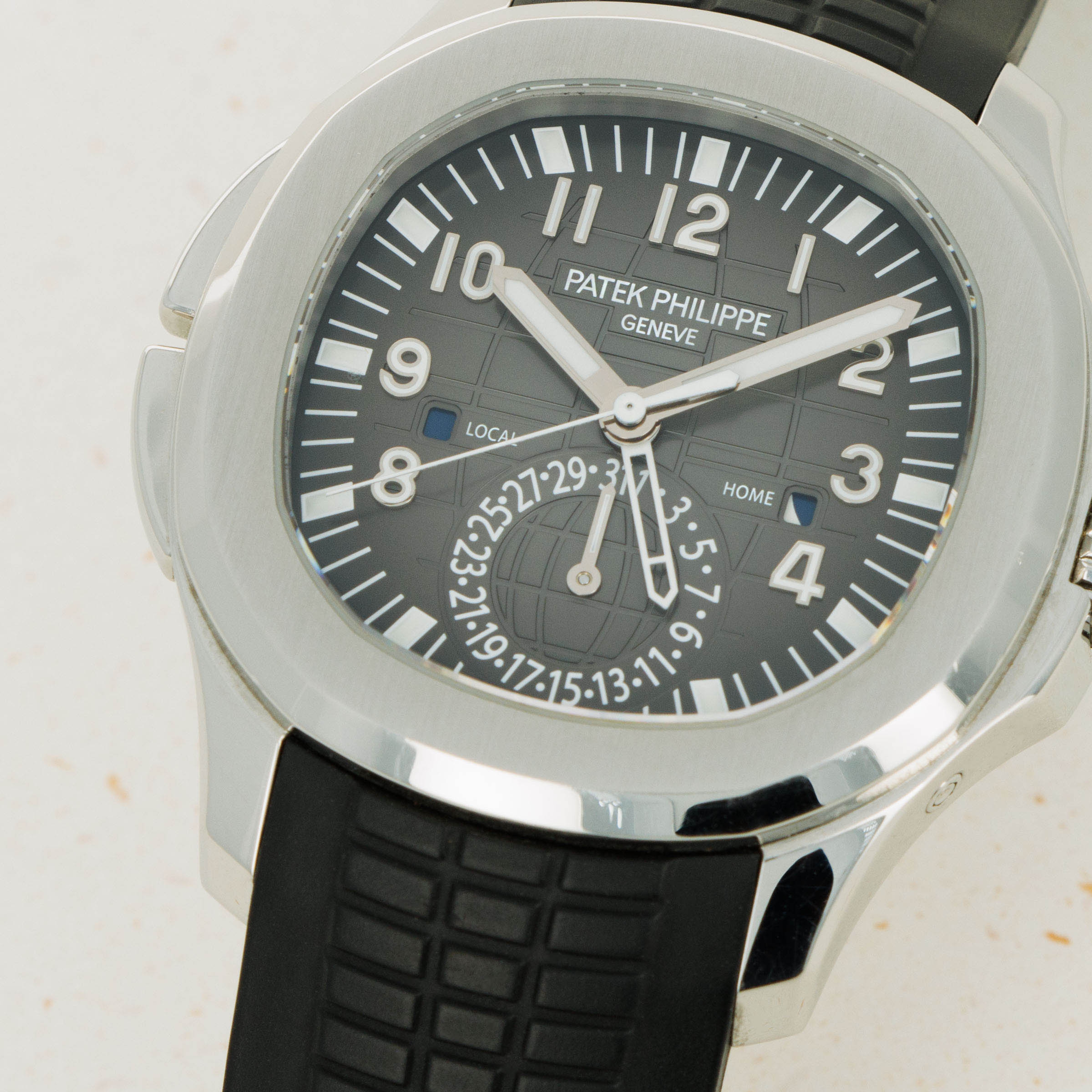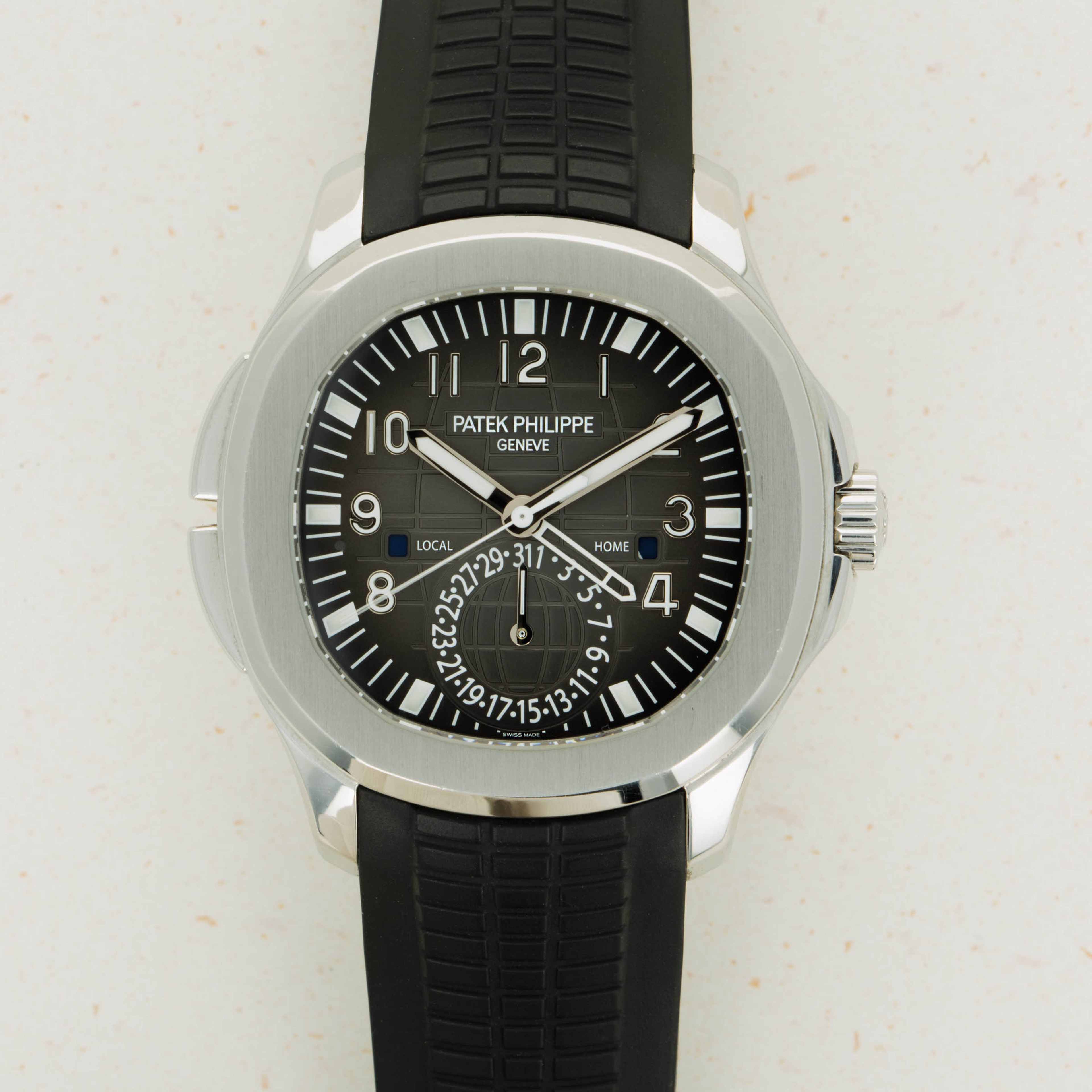 Debuting in 1997, the Patek Philippe Aquanaut was released under the same premise as the Nautilus when it was released in 1976 – a trendy watch for a younger newly-minted clientele. The first Patek to feature a rubber strap – something collectors saw as a cheap design option at the time, the Aquanaut was treated with a certain level of trepidation, which it has since overcome as one of the brand’s most popular models. With the ref. 5164A's integrated black rubber strap and black embossed dial, this Aquanaut variant is a smart and trendy option for the collector who wants their timepiece to fly under the radar while still packing a hefty punch of horological history and an iconic design that has since become one of Patek Philippe’s most emblematic offerings. Featuring a plethora of useful complications, the ref. 5164/1A is the travel time variant, and so sports a ghost dual-time hand that can be hidden beneath the primary hour hand when desired. Furthermore, it sports a pointer date subdial sandwiched between AM/PM indicators for the local and home time, as inscribed in white on the black dial.