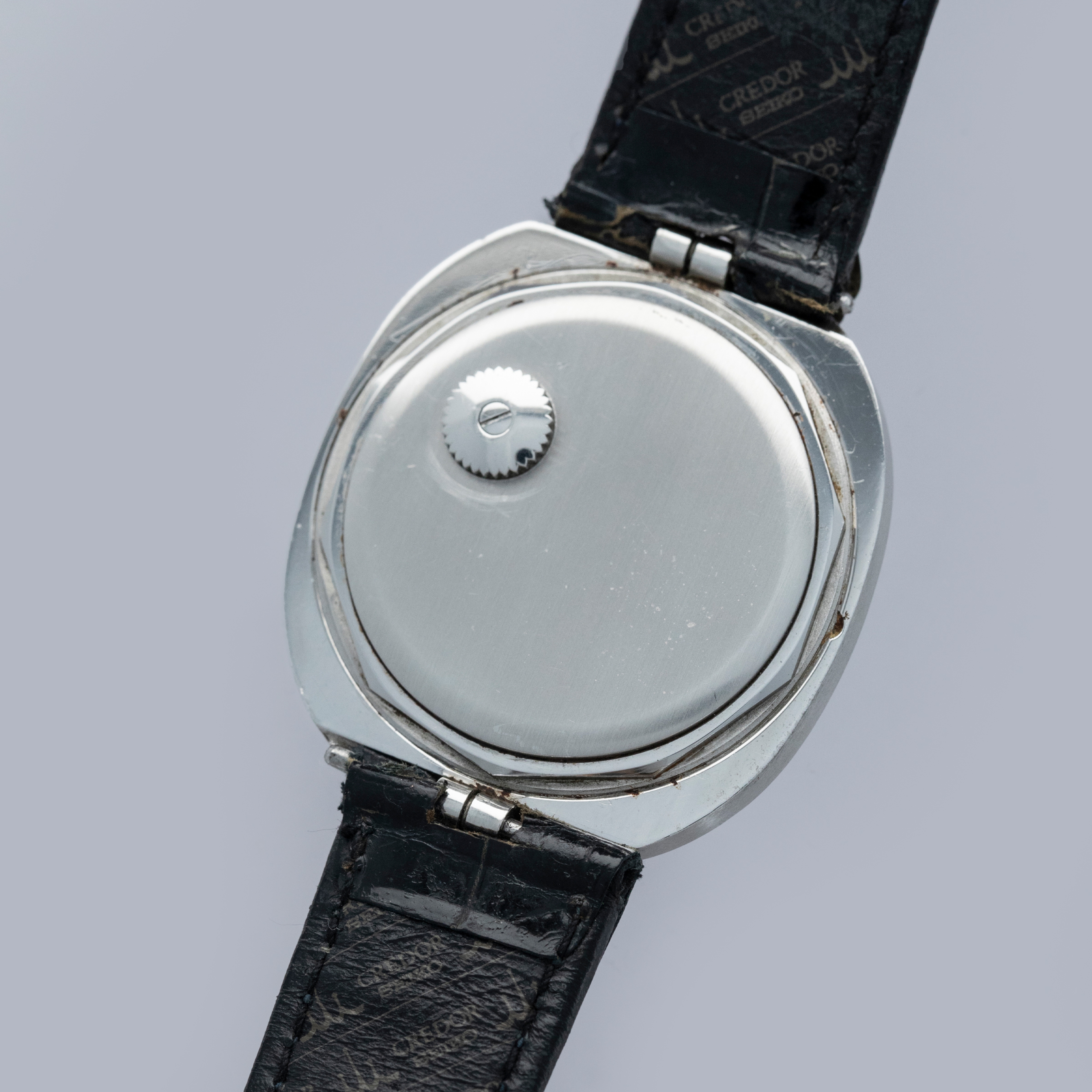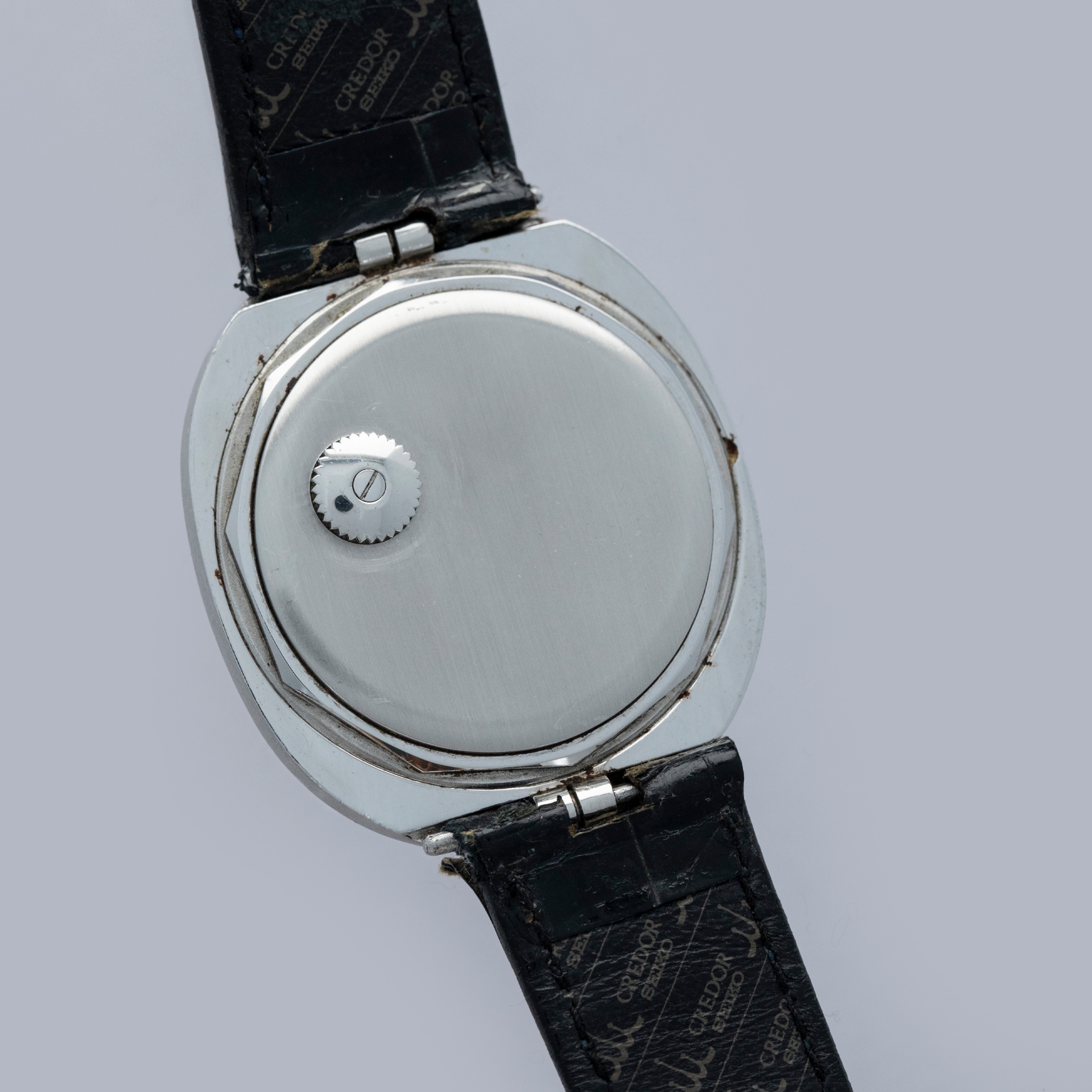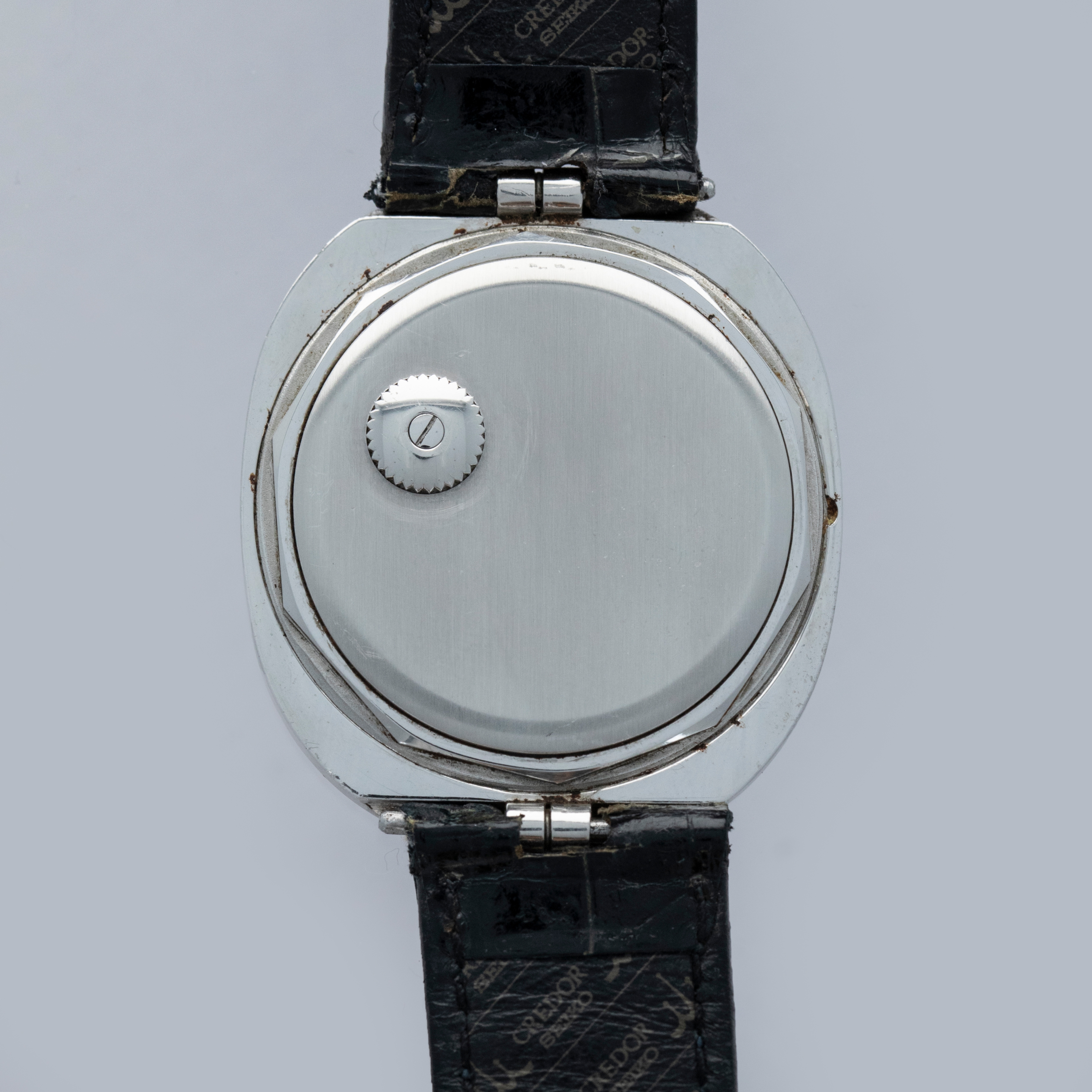 The 35.5 x 40.5mm stainless steel case is in excellent condition, with some signs of use on the case sides and light marks on the front and light corrosion around the case back. The decagonal case back is very clean and incorporates the winding crown for the automatic movement. The silver no-lume dial is in outstanding condition, featuring applied hour markers and matching no-lume hands. The watch comes on a poor condition Credor signed strap with a generic buckle. Please note that the watch ticks at time of cataloging, but timekeeping is poor and a service is recommended.