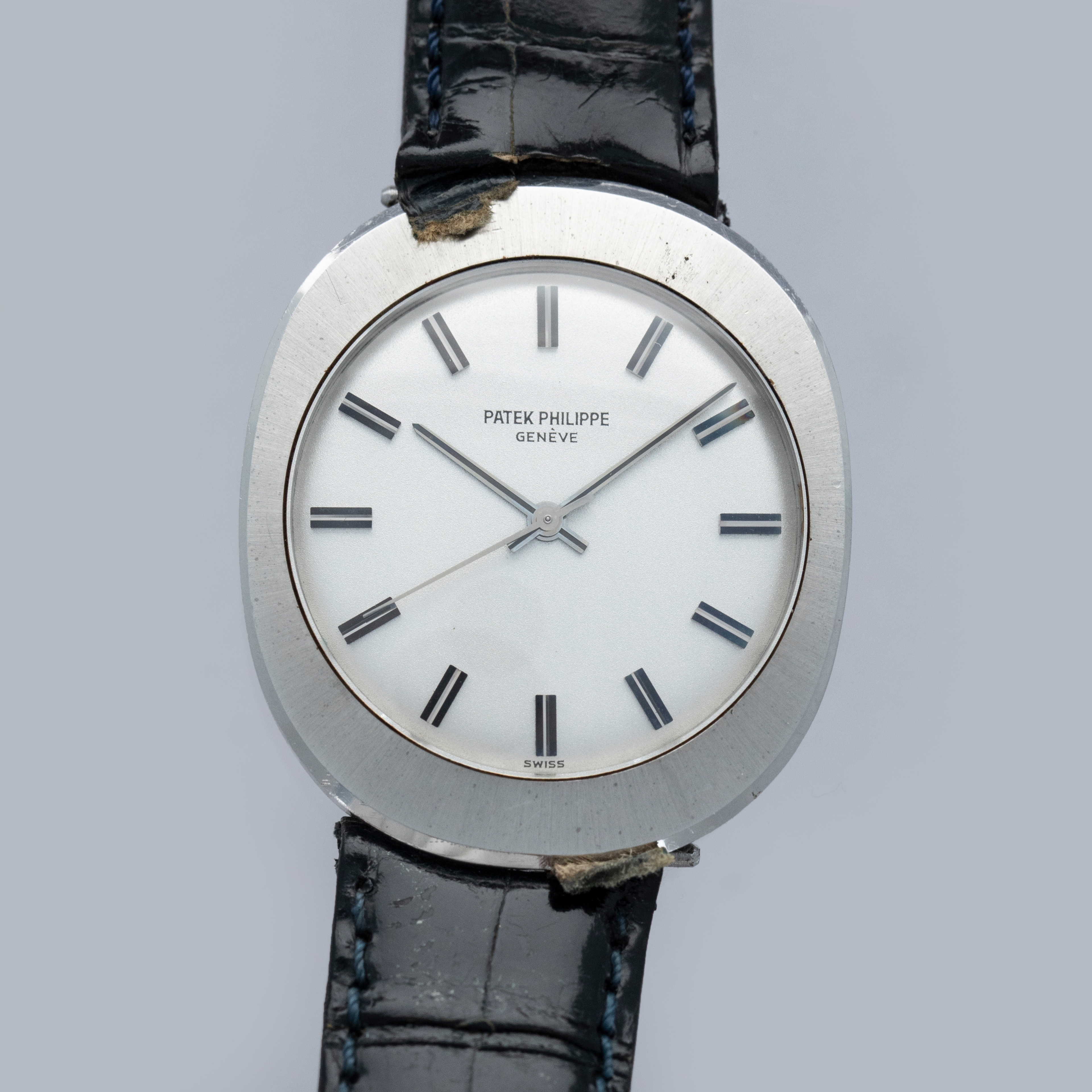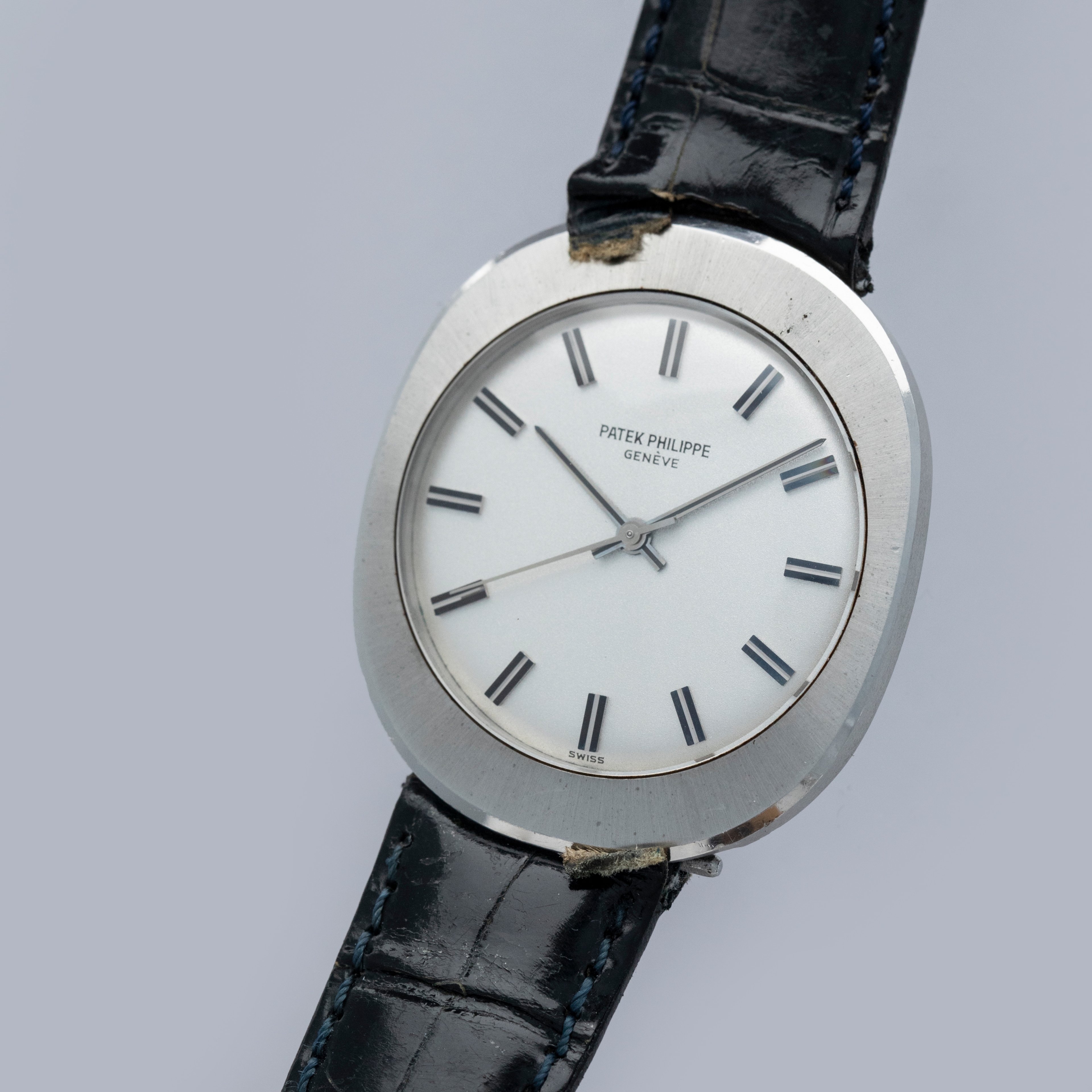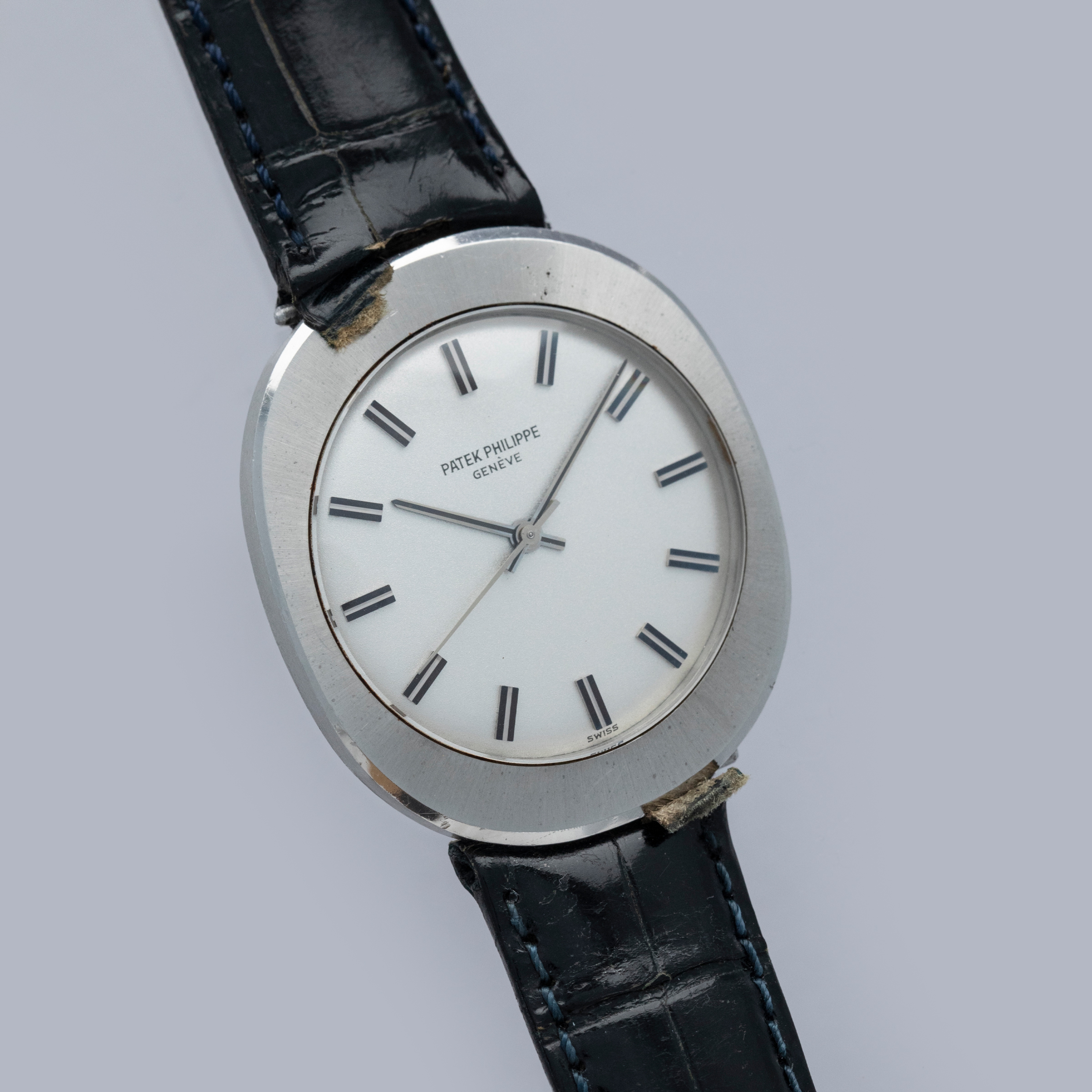 An incredibly unusual variant of the Patek Philippe Ellipse, the ref. 3580 is a 35mm oval-shaped stainless steel timepiece with brushed finishing throughout its construction, allowing for an impressive wrist presence thanks to its visual consistency. Fitted with a gorgeous understated silver dial, the ref. 3580 harkens back to Patek's desire to refrain from distracting the wearer from the incredible craftsmanship within their timepiece. Powered by the automatic cal. 350 movement, the ref. 3580 is indeed a Back-Wind watch, whereby its crown has been removed from the case's side and placed on the caseback. This move was inspired by the technology in battery-operated watches, as they never needed their crown for resetting since their batteries wouldn't run out – much like an automatic timepiece if it is continuously worn. A symbol of modernity, progress, and technical innovation, the ref. 3580 is a wonderful testament to Patek and their willingness to step out of their comfort zone and seek inspiration in some of the most unusual places – even if that place is battery-powered watches.