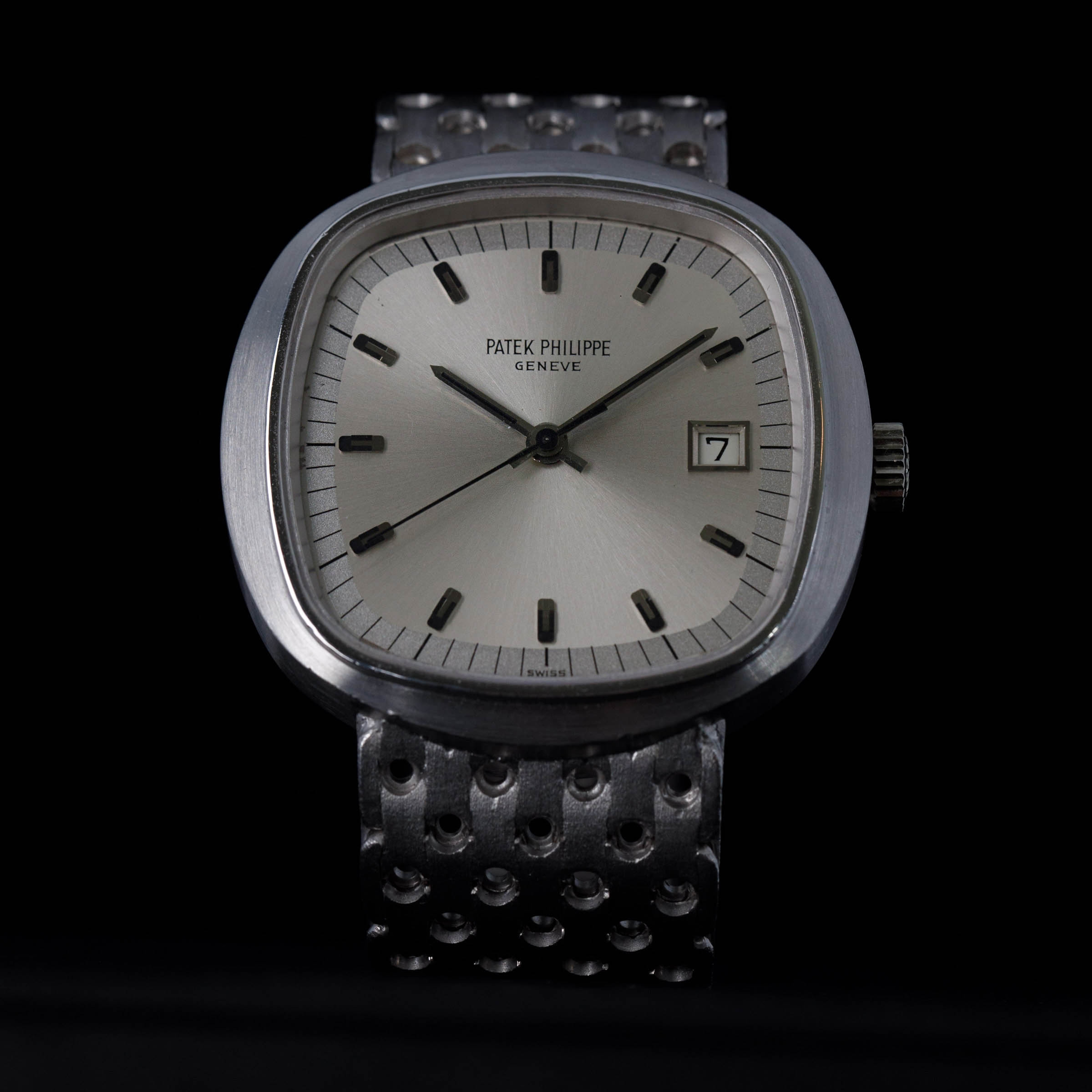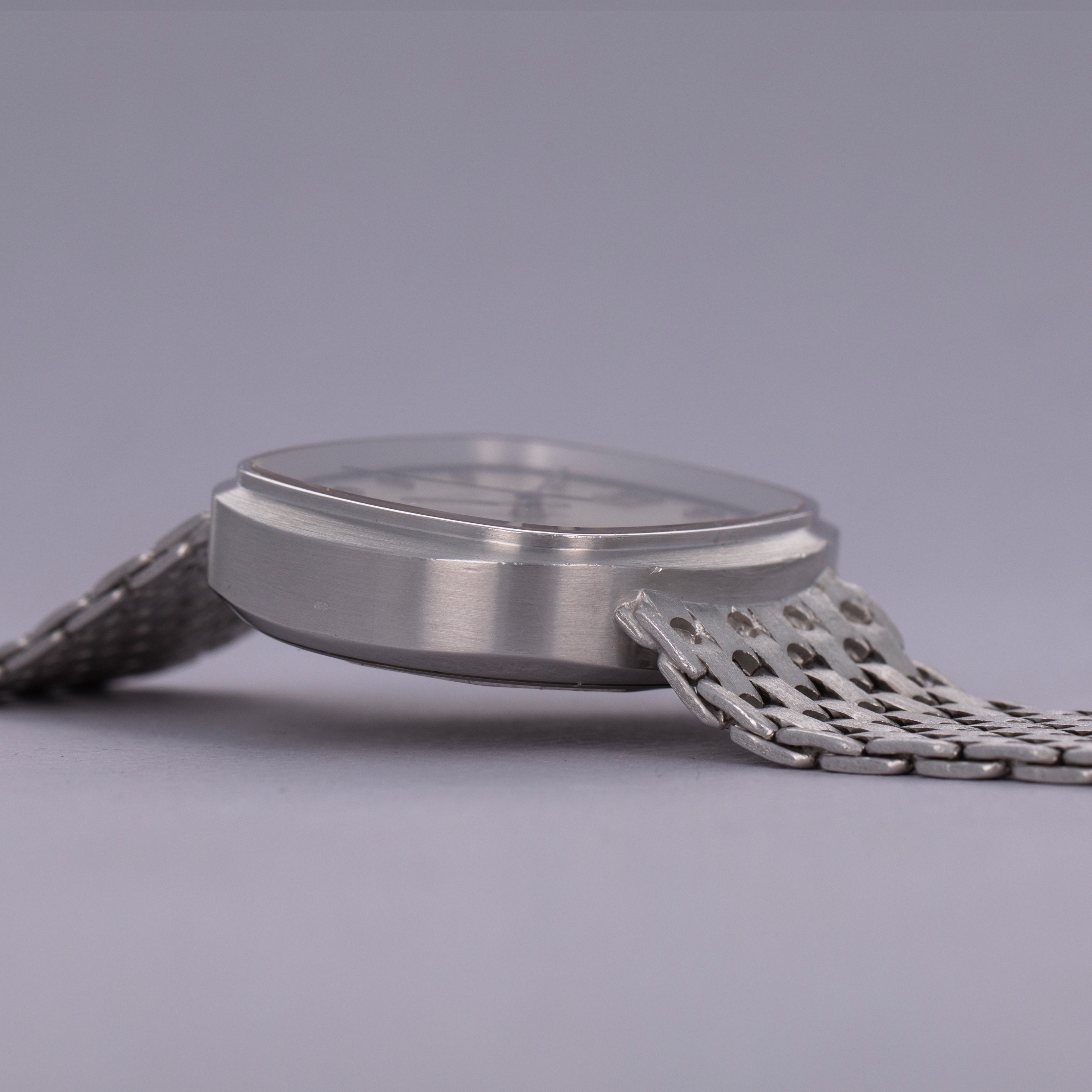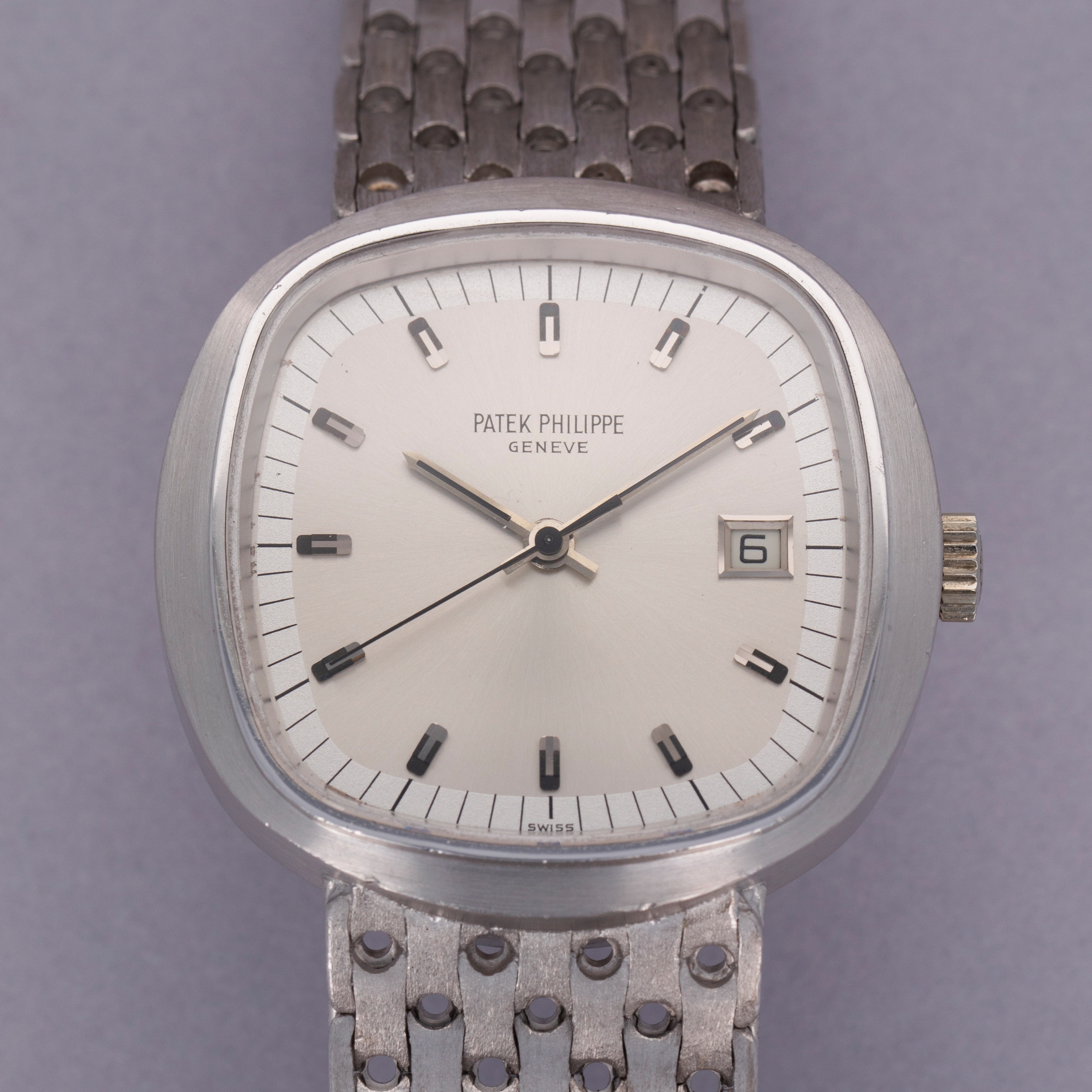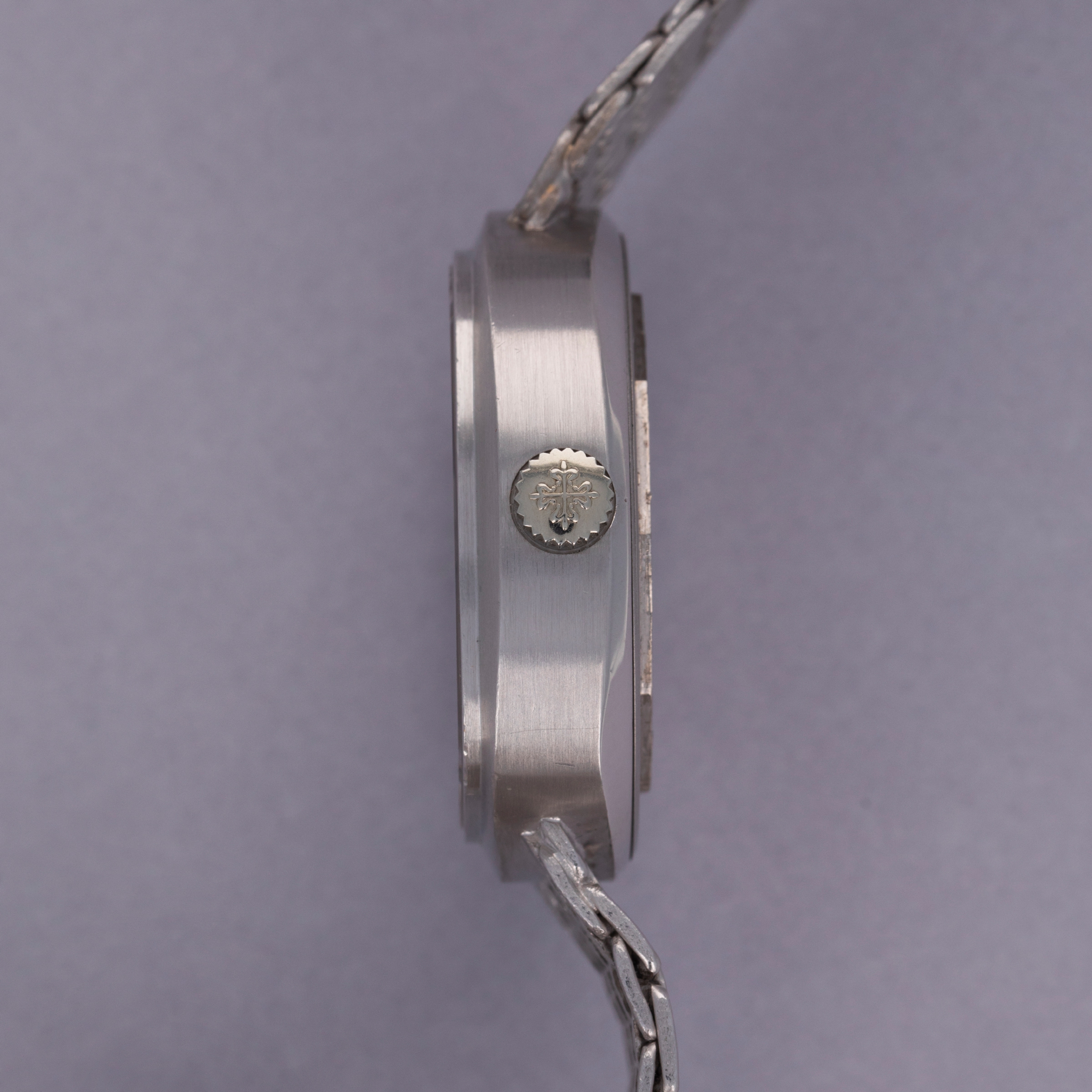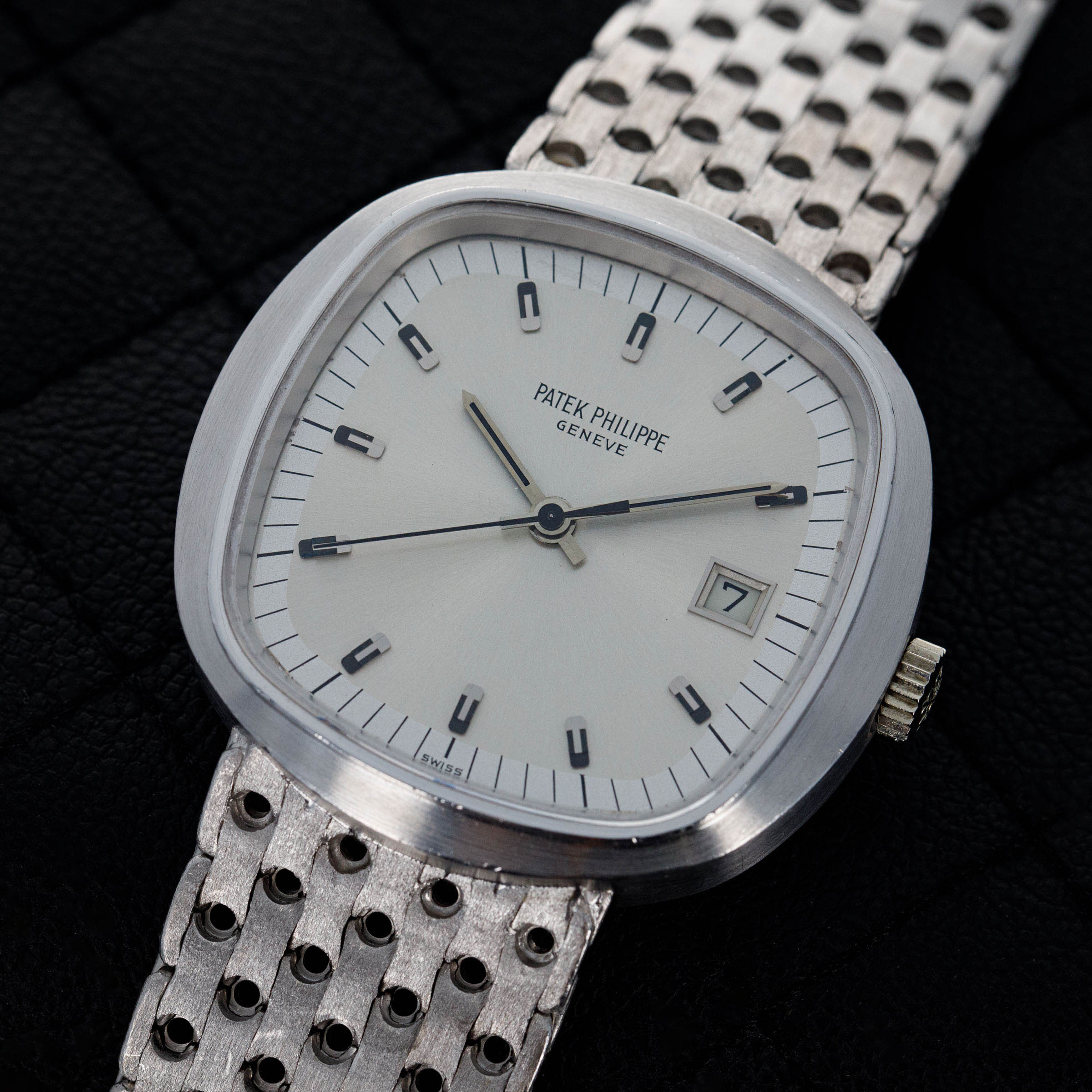 Launched in 1969 just as the Quartz Crisis was about to begin, the Patek Philippe ref. 3587 was Patek’s very first attempt to compete with Japanese watchmakers who had just launched the cheaper, trendier, and more accurate quartz movement to the market. Powered by the Beta 21 quartz movement, the culmination of 20 watchmaker’s collaborative efforts such as Patek, Piaget, Omega, and plenty of others over a period of 6 years of R&D, the ref. 3587 that we have here represents the most advanced horological technology of its day. Offered in a cushion-shaped 18kt white gold case made byAtelier Reunis (casemaker mark 28 as seen in the inside case back) that measures 42mm in diameter with a screw-down caseback, the ref. 3587 is a bona fide icon of 1960s and 1970s horological design, with its integrated ‘holed’ bracelet offering a glimpse into the direction that watchmaking would be catapulted towards. Boasting a stunning silver dial with a date aperture at 3 o’clock, the ref. 3587’s display is as beautiful as the rest of the watch as it caps off a monochromatic aesthetic that serves to contrast the relative complexity of its quartz movement.