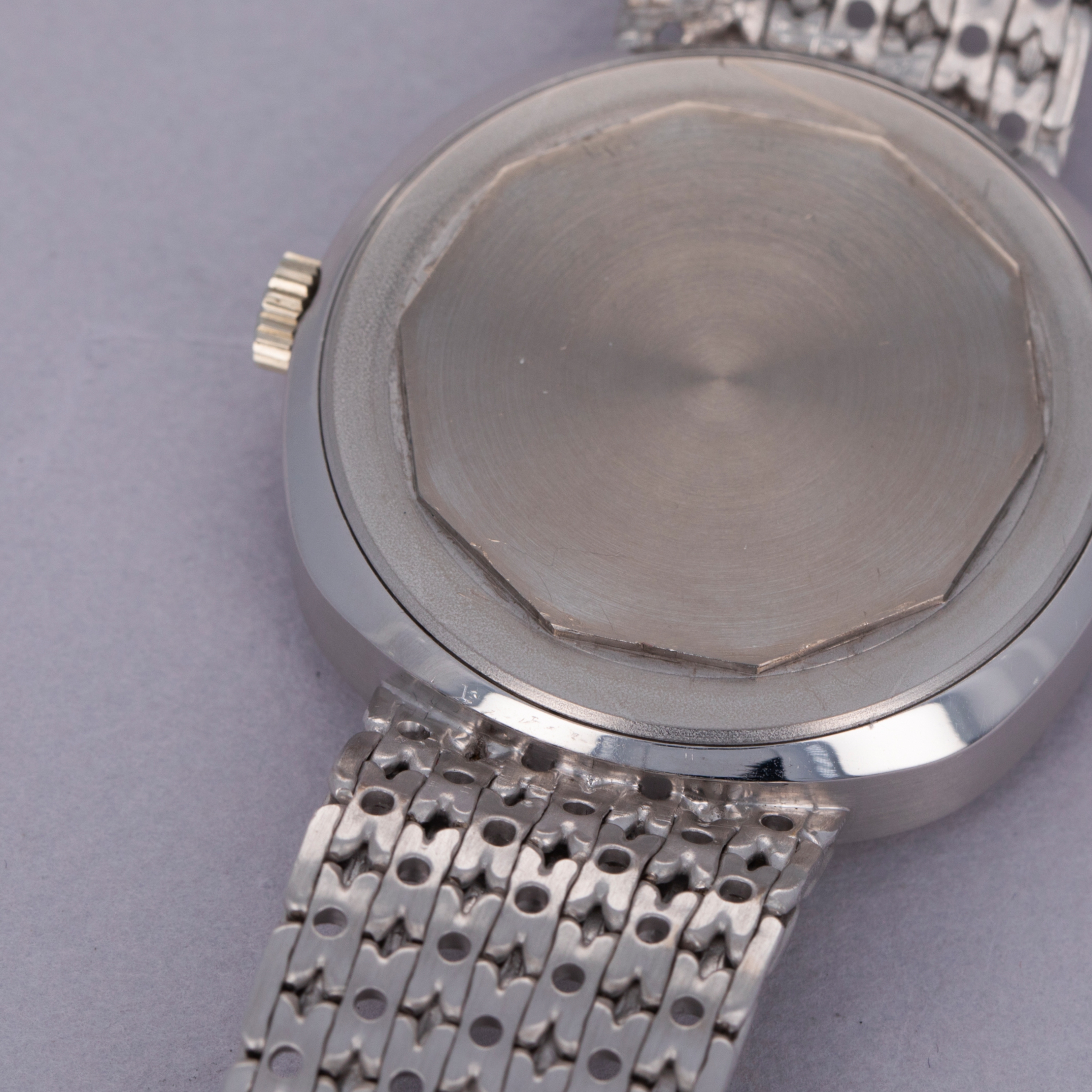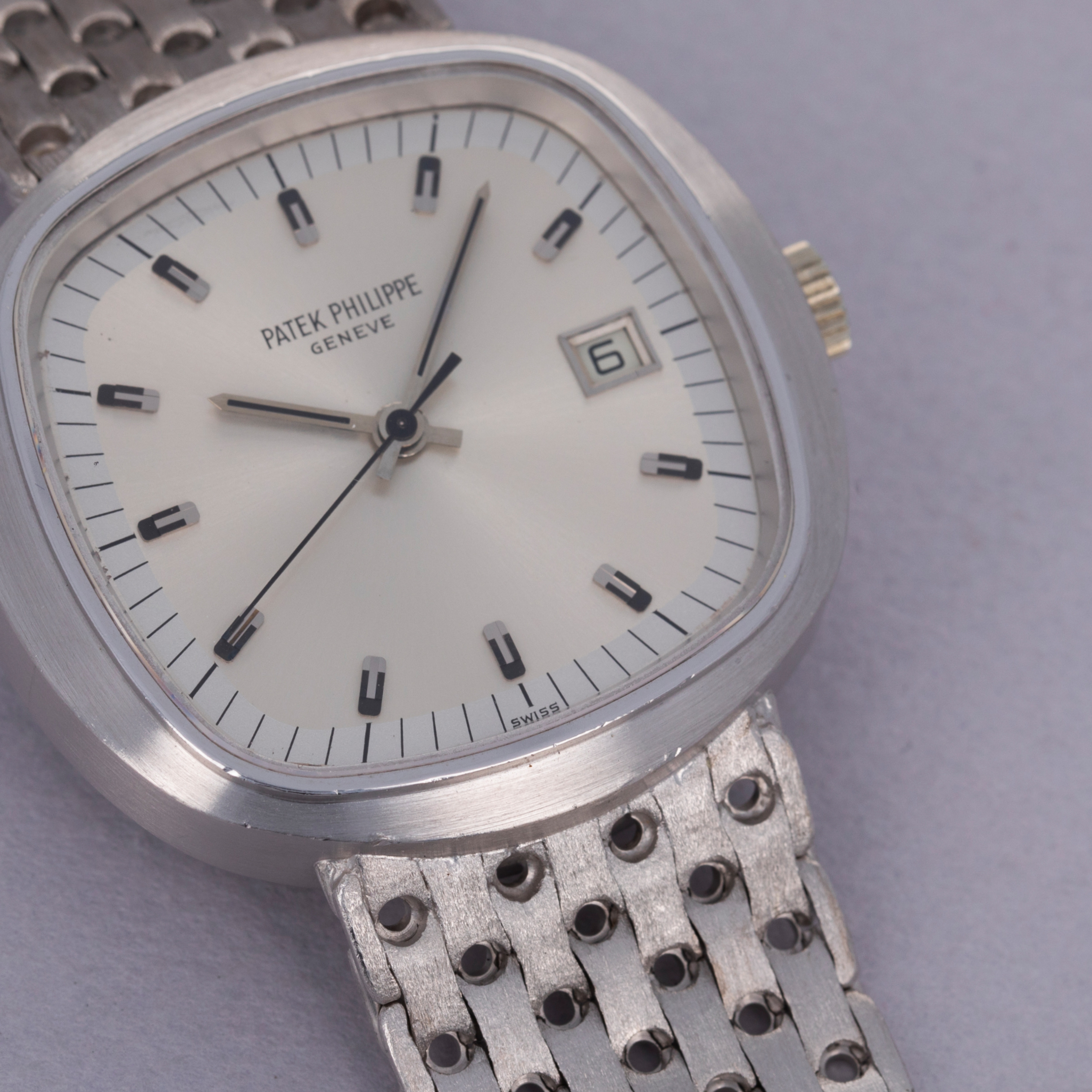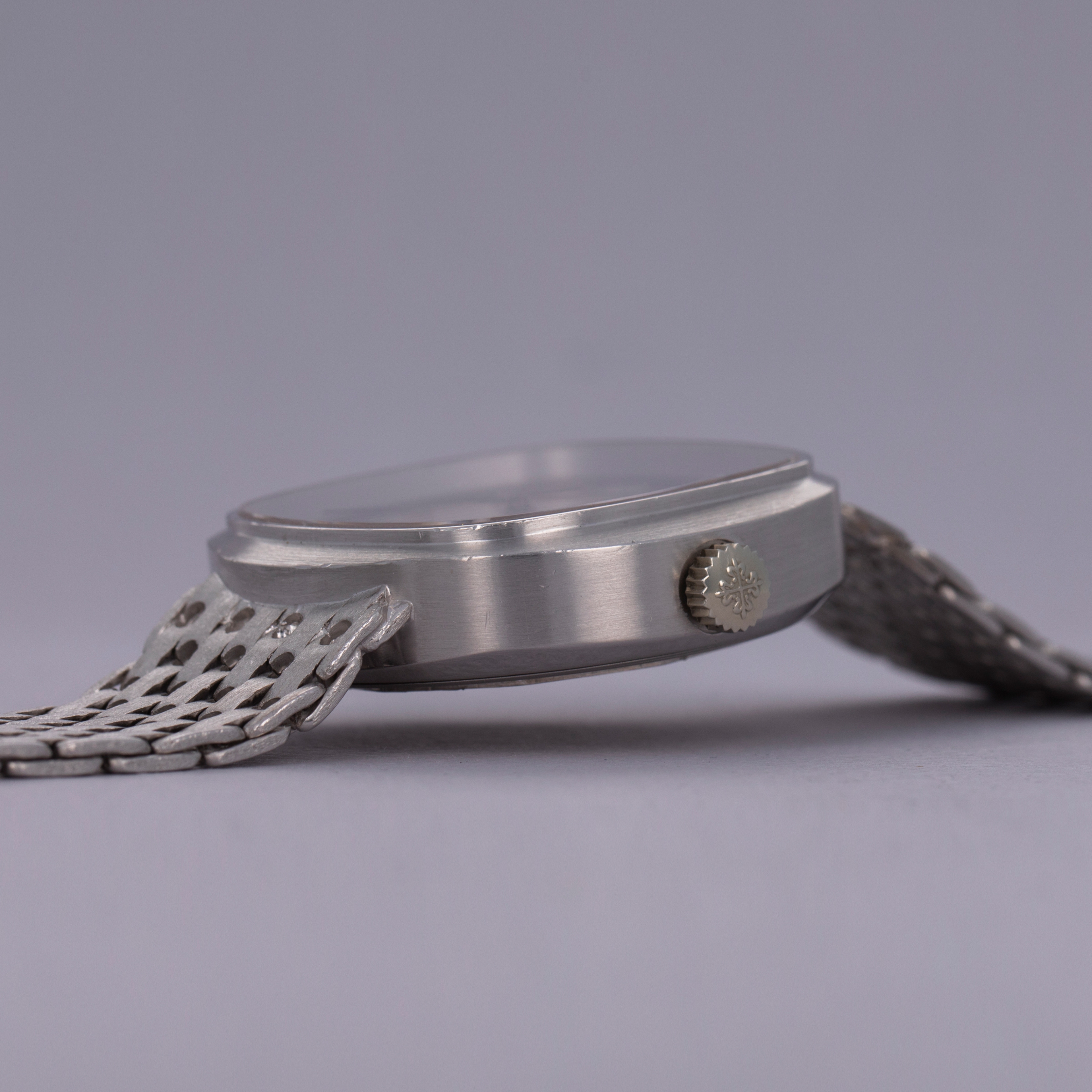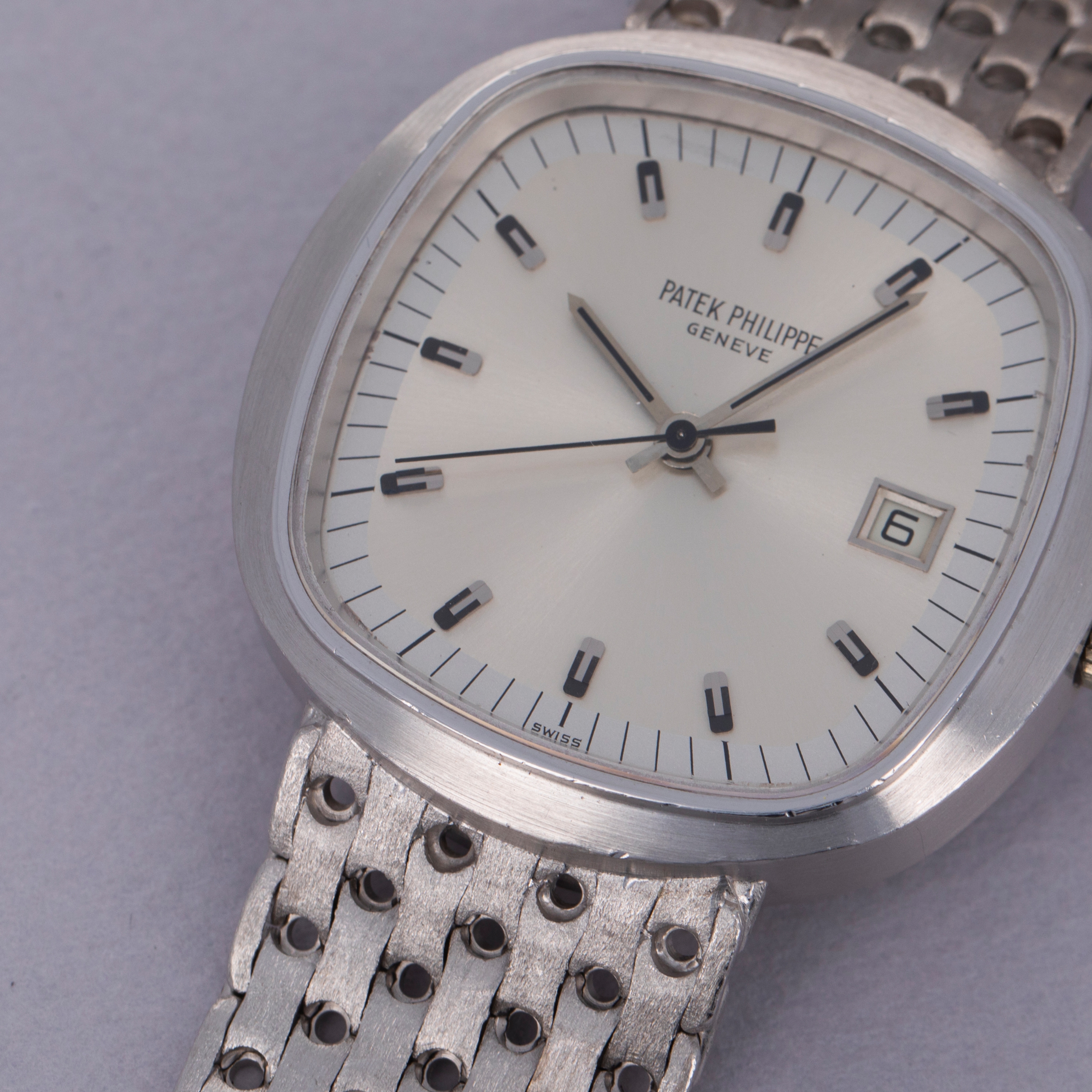 Launched in 1969 just as the Quartz Crisis was about to begin, the Patek Philippe ref. 3587 was Patek’s very first attempt to compete with Japanese watchmakers who had just launched the cheaper, trendier, and more accurate quartz movement to the market. Powered by the Beta 21 quartz movement, the culmination of 20 watchmaker’s collaborative efforts such as Patek, Piaget, Omega, and plenty of others over a period of 6 years of R&D, the ref. 3587 that we have here represents the most advanced horological technology of its day. Offered in a cushion-shaped 18kt white gold case made byAtelier Reunis (casemaker mark 28 as seen in the inside case back) that measures 42mm in diameter with a screw-down caseback, the ref. 3587 is a bona fide icon of 1960s and 1970s horological design, with its integrated ‘holed’ bracelet offering a glimpse into the direction that watchmaking would be catapulted towards. Boasting a stunning silver dial with a date aperture at 3 o’clock, the ref. 3587’s display is as beautiful as the rest of the watch as it caps off a monochromatic aesthetic that serves to contrast the relative complexity of its quartz movement.