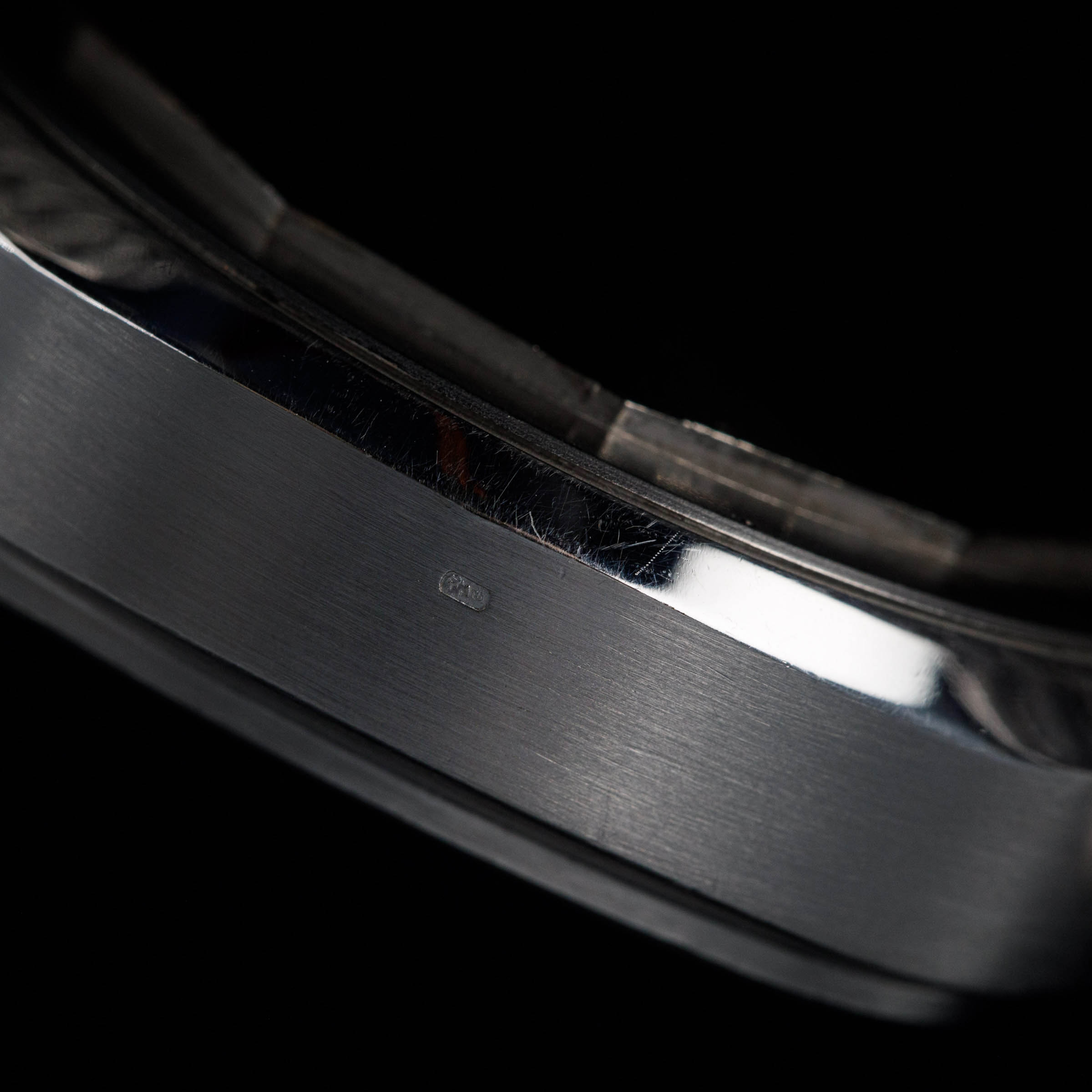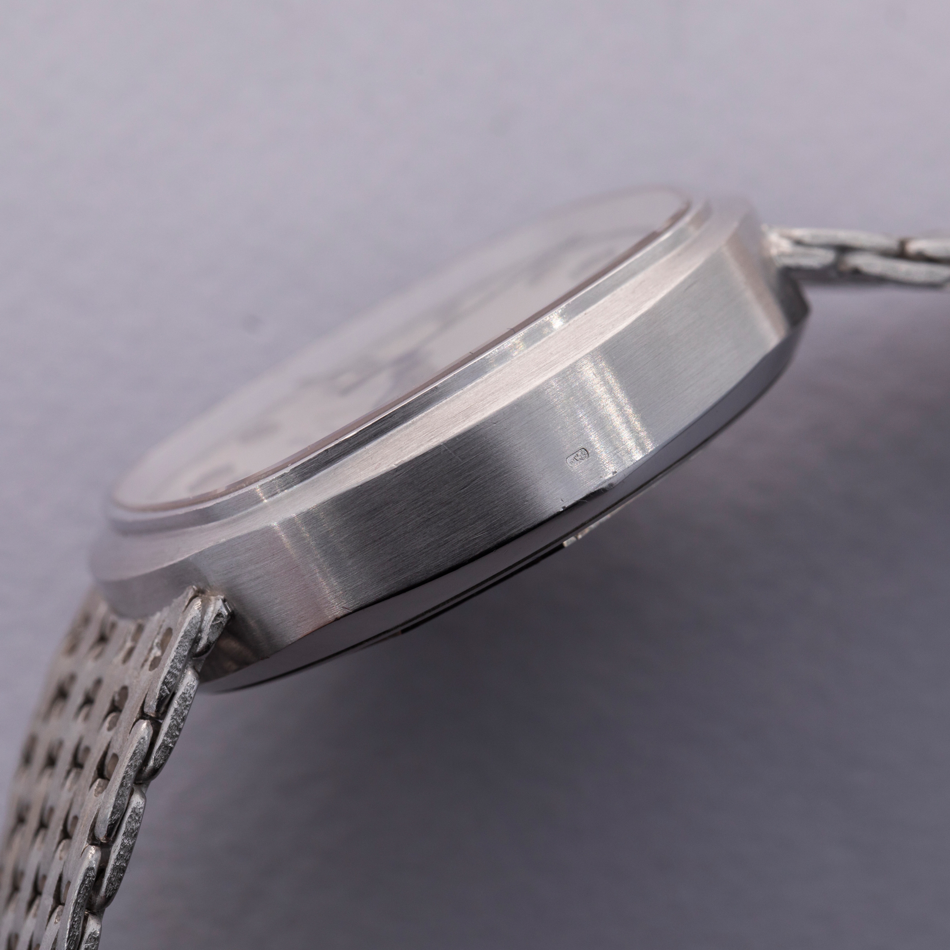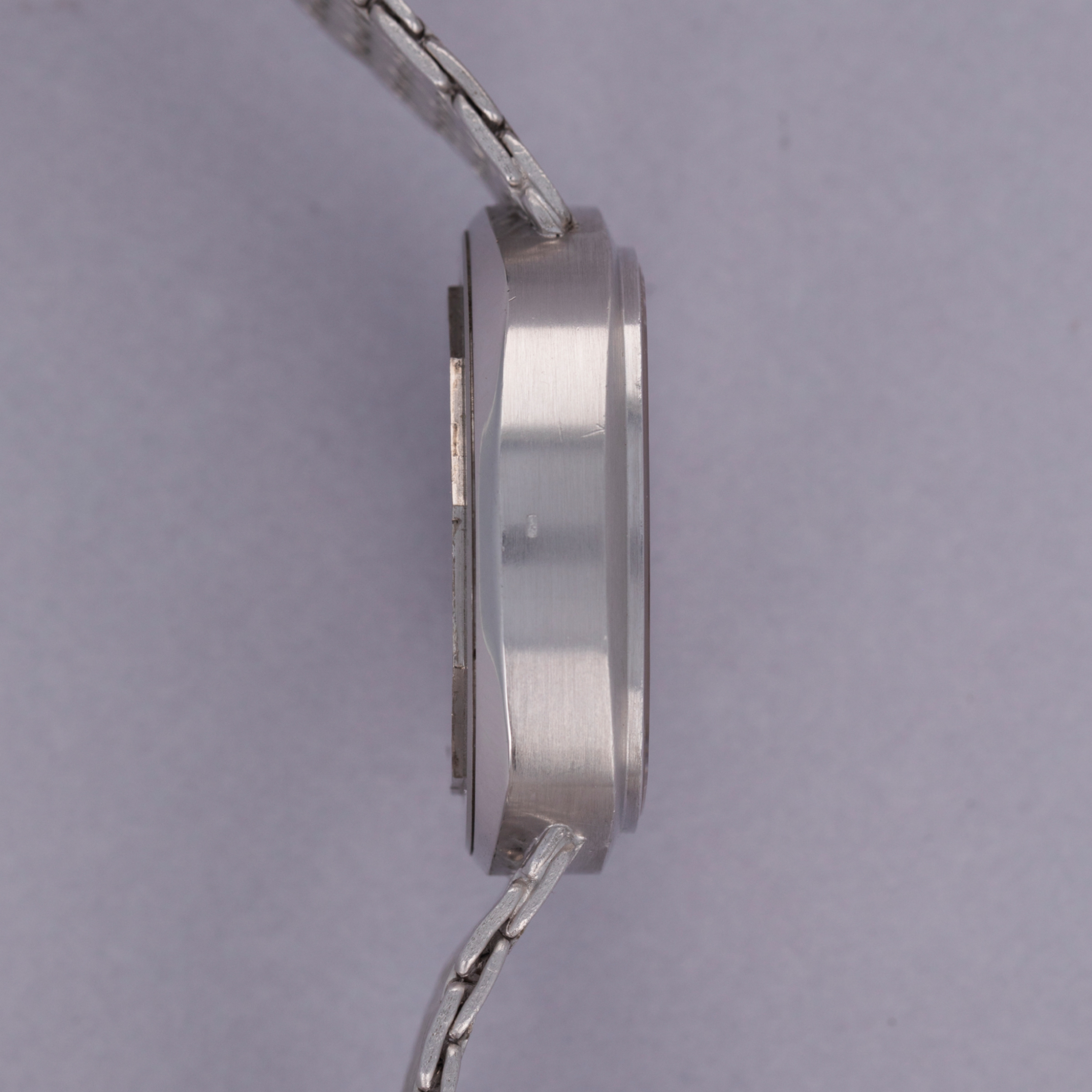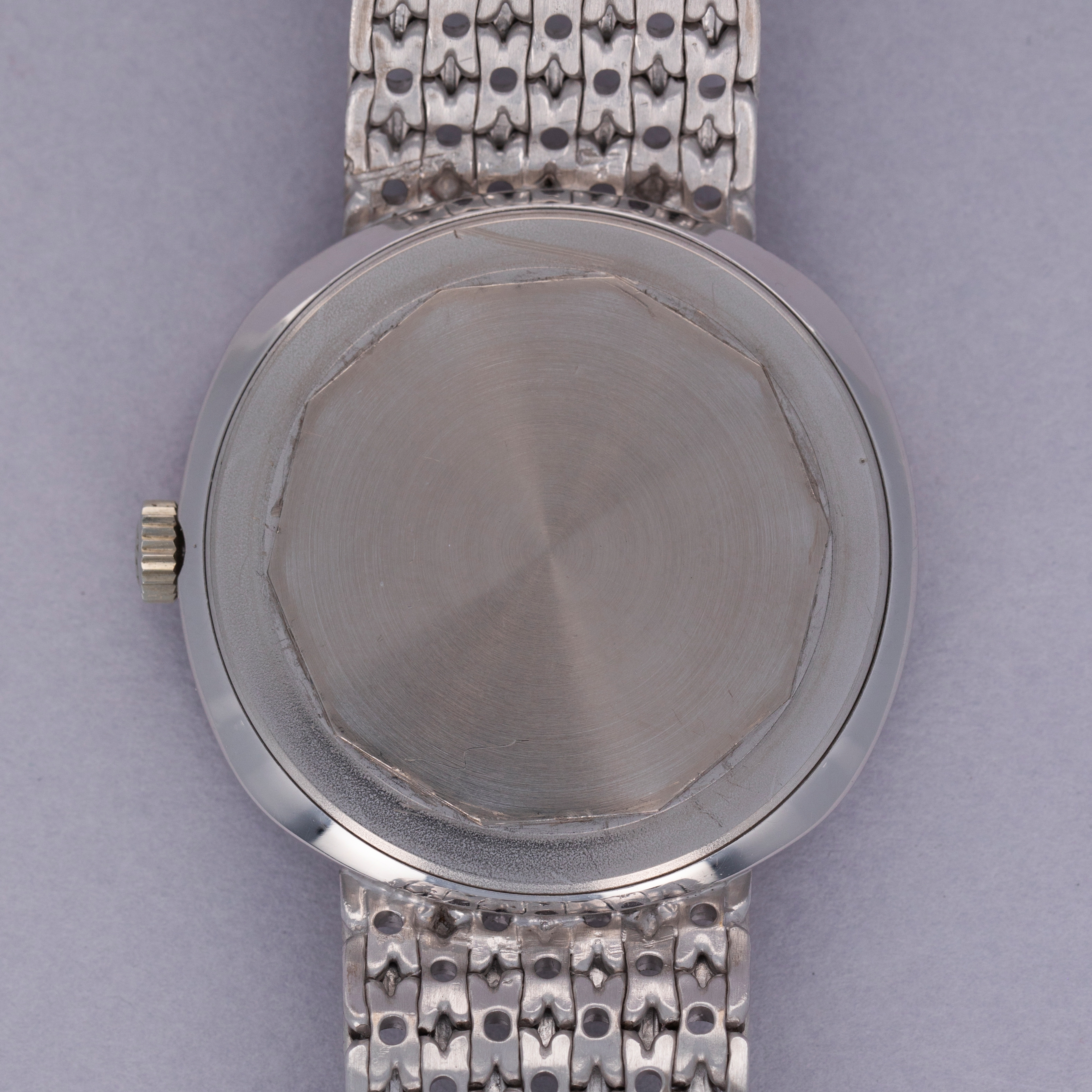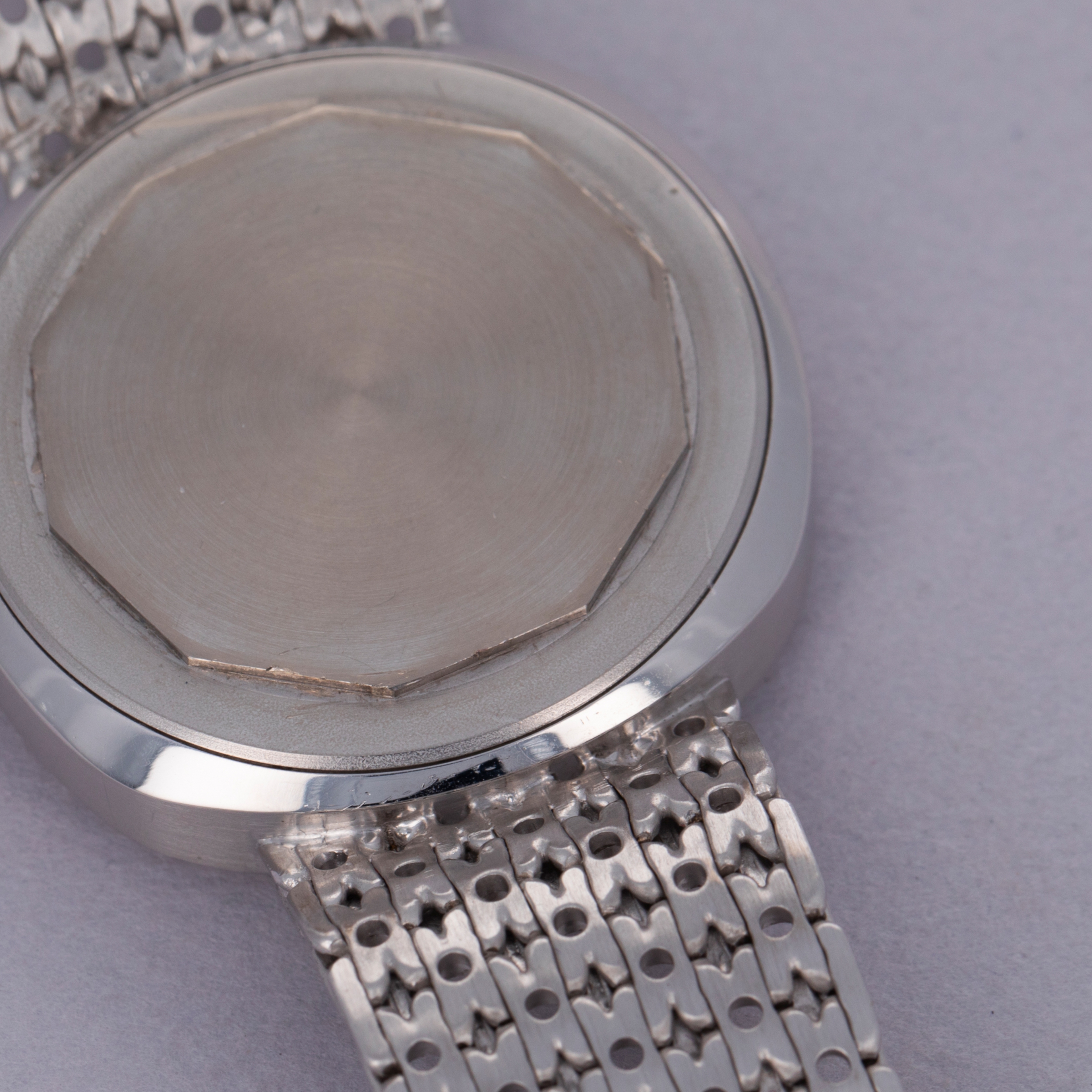 Launched in 1969 just as the Quartz Crisis was about to begin, the Patek Philippe ref. 3587 was Patek’s very first attempt to compete with Japanese watchmakers who had just launched the cheaper, trendier, and more accurate quartz movement to the market. Powered by the Beta 21 quartz movement, the culmination of 20 watchmaker’s collaborative efforts such as Patek, Piaget, Omega, and plenty of others over a period of 6 years of R&D, the ref. 3587 that we have here represents the most advanced horological technology of its day. Offered in a cushion-shaped 18kt white gold case made byAtelier Reunis (casemaker mark 28 as seen in the inside case back) that measures 42mm in diameter with a screw-down caseback, the ref. 3587 is a bona fide icon of 1960s and 1970s horological design, with its integrated ‘holed’ bracelet offering a glimpse into the direction that watchmaking would be catapulted towards. Boasting a stunning silver dial with a date aperture at 3 o’clock, the ref. 3587’s display is as beautiful as the rest of the watch as it caps off a monochromatic aesthetic that serves to contrast the relative complexity of its quartz movement.
