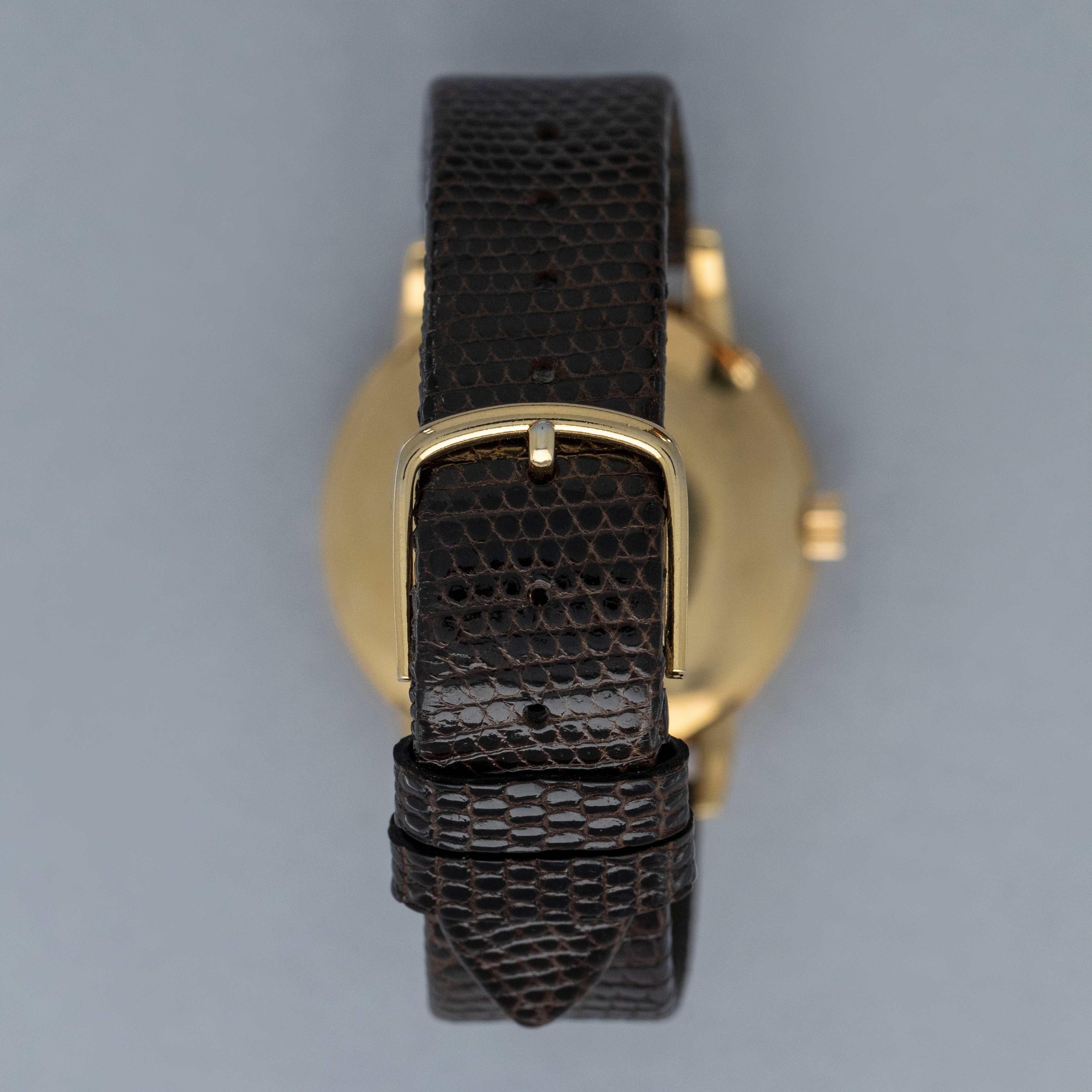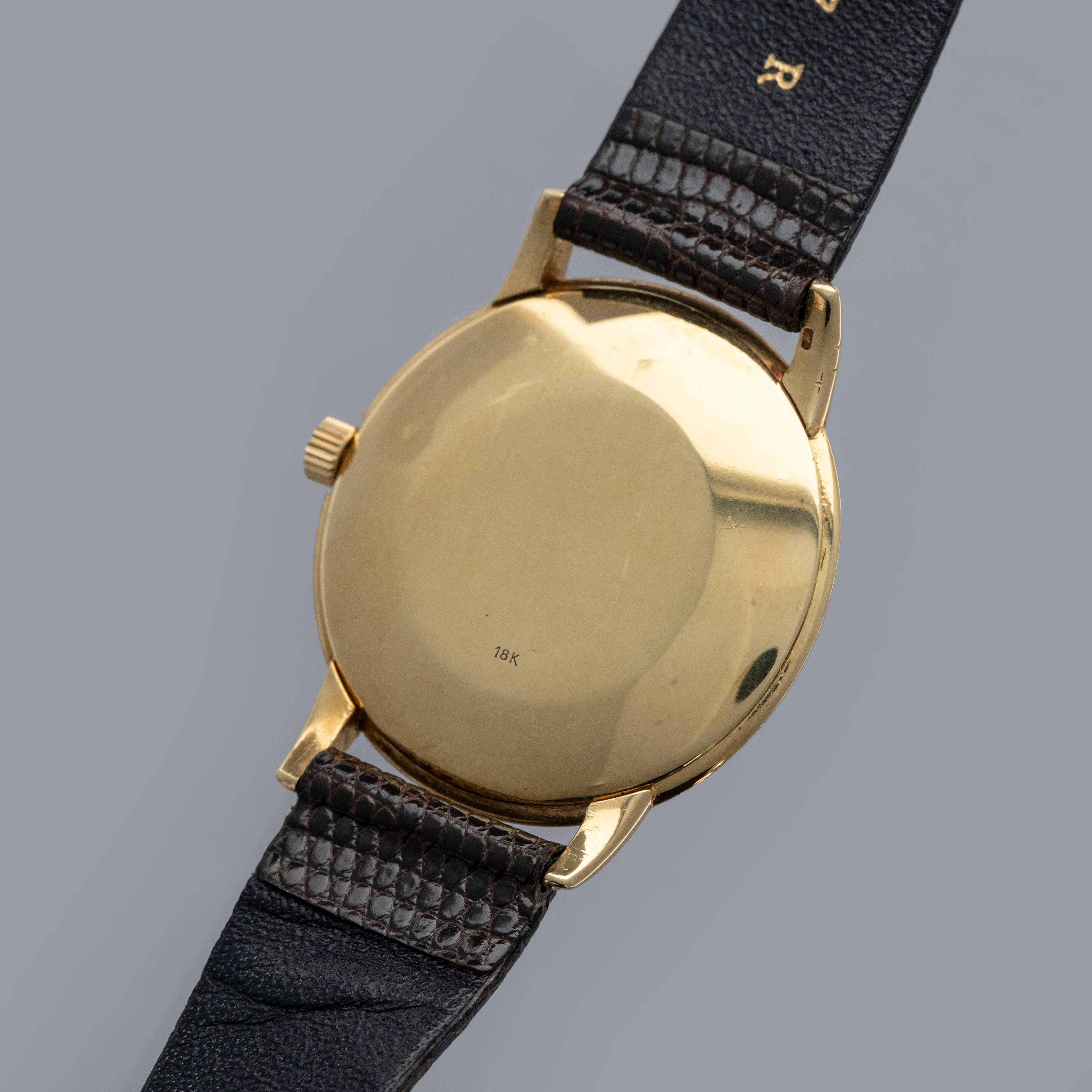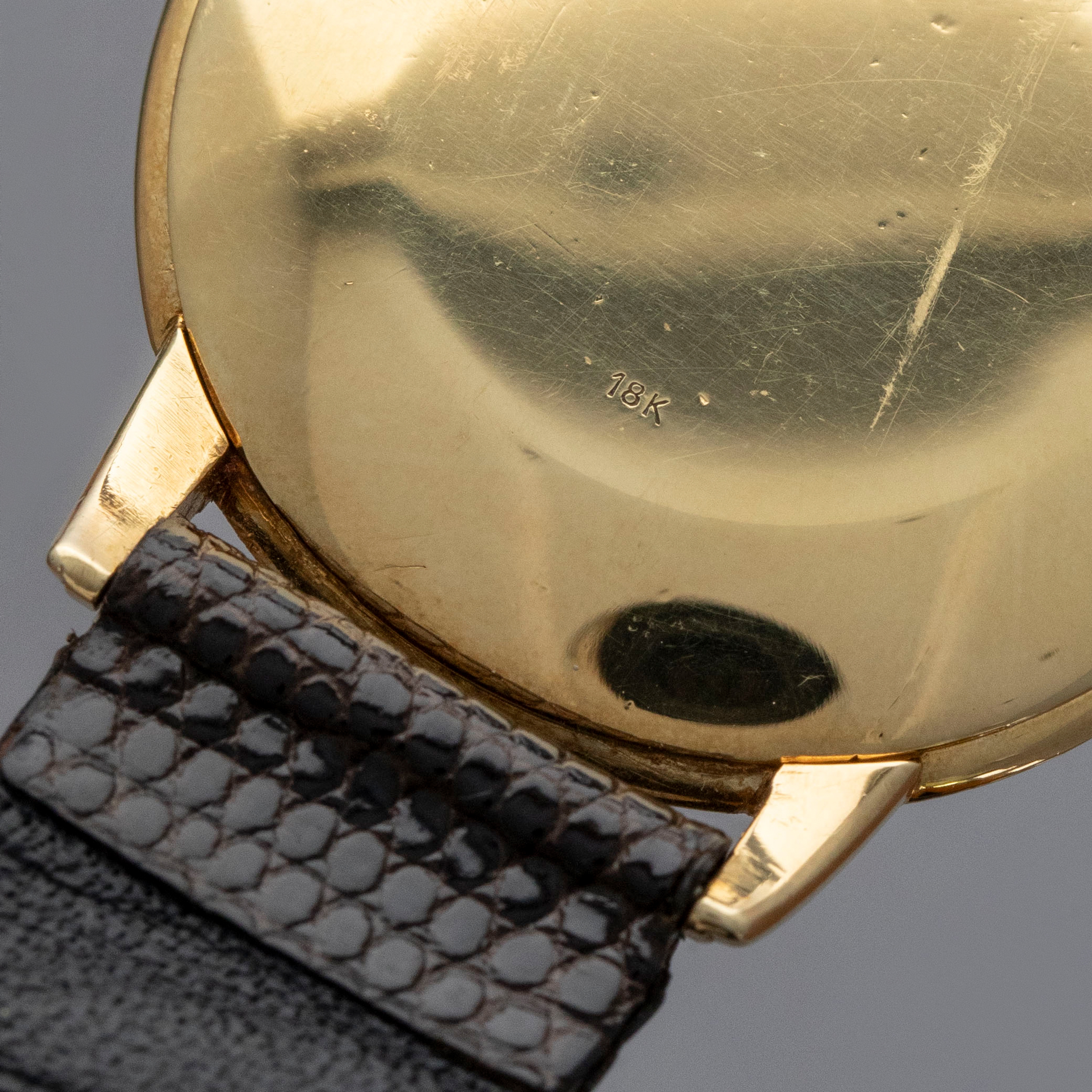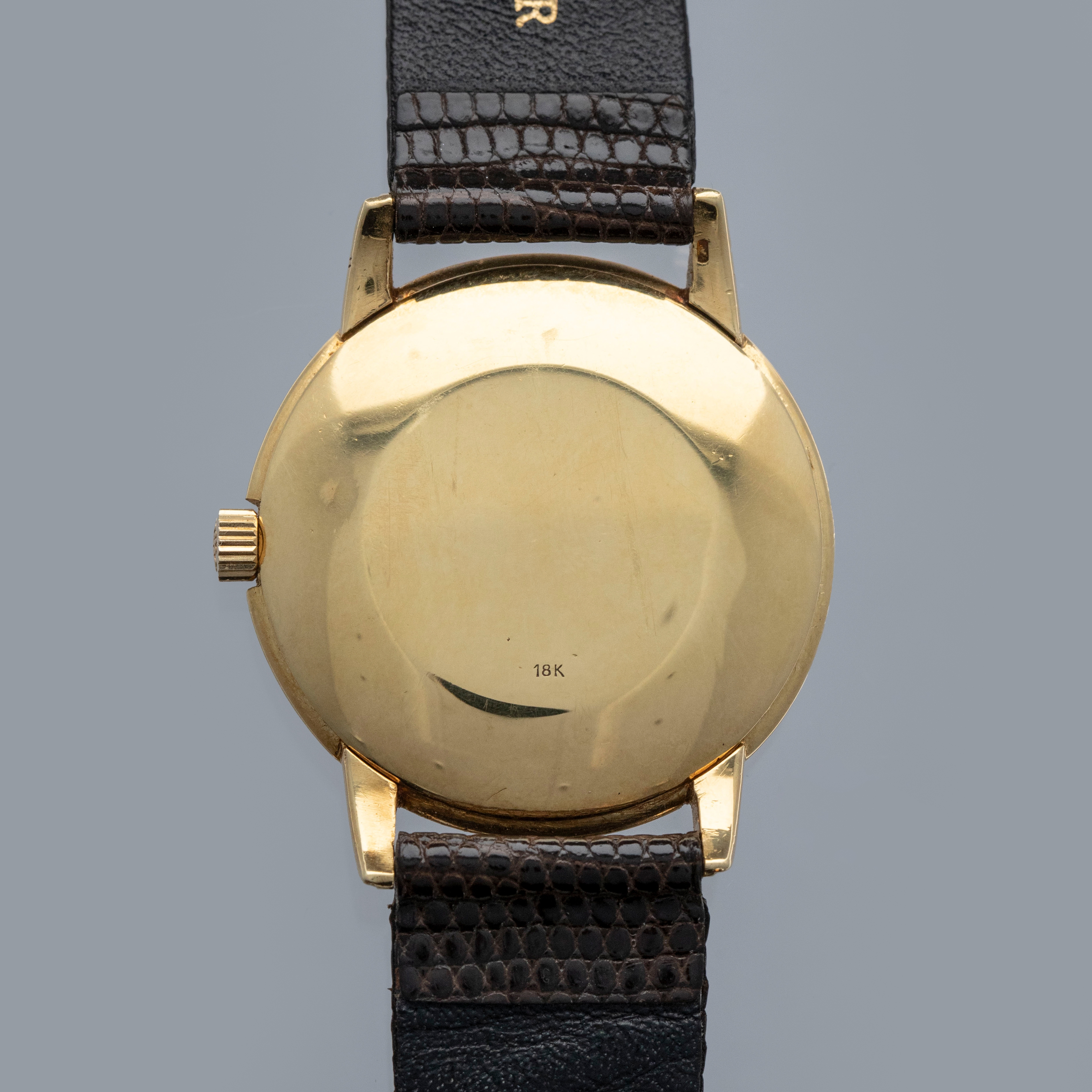Watch is in overall very good condition. The yellow gold case shows surface scratches, with a few small nicks to the bezel and a couple of dings to the sides of the upper lugs. The case back retains a well-defined 18K stamp along with surface scratches and small marks. The dial shows some small surface marks, including a scratch below the “G” of Genève, and it appears that the minute hand has been repaired at the pinion end. It is fitted with a brown lizard strap and a gold-plated buckle.