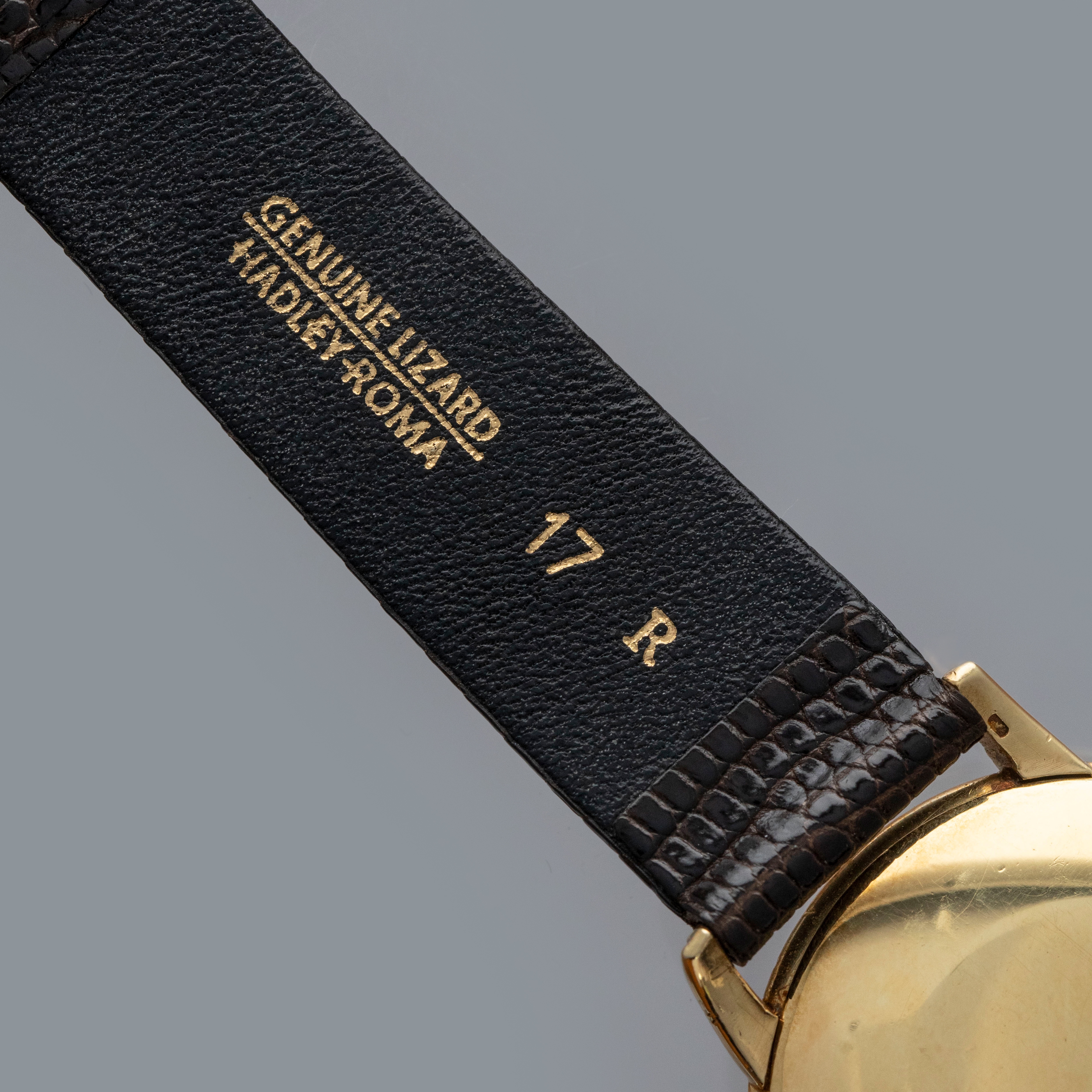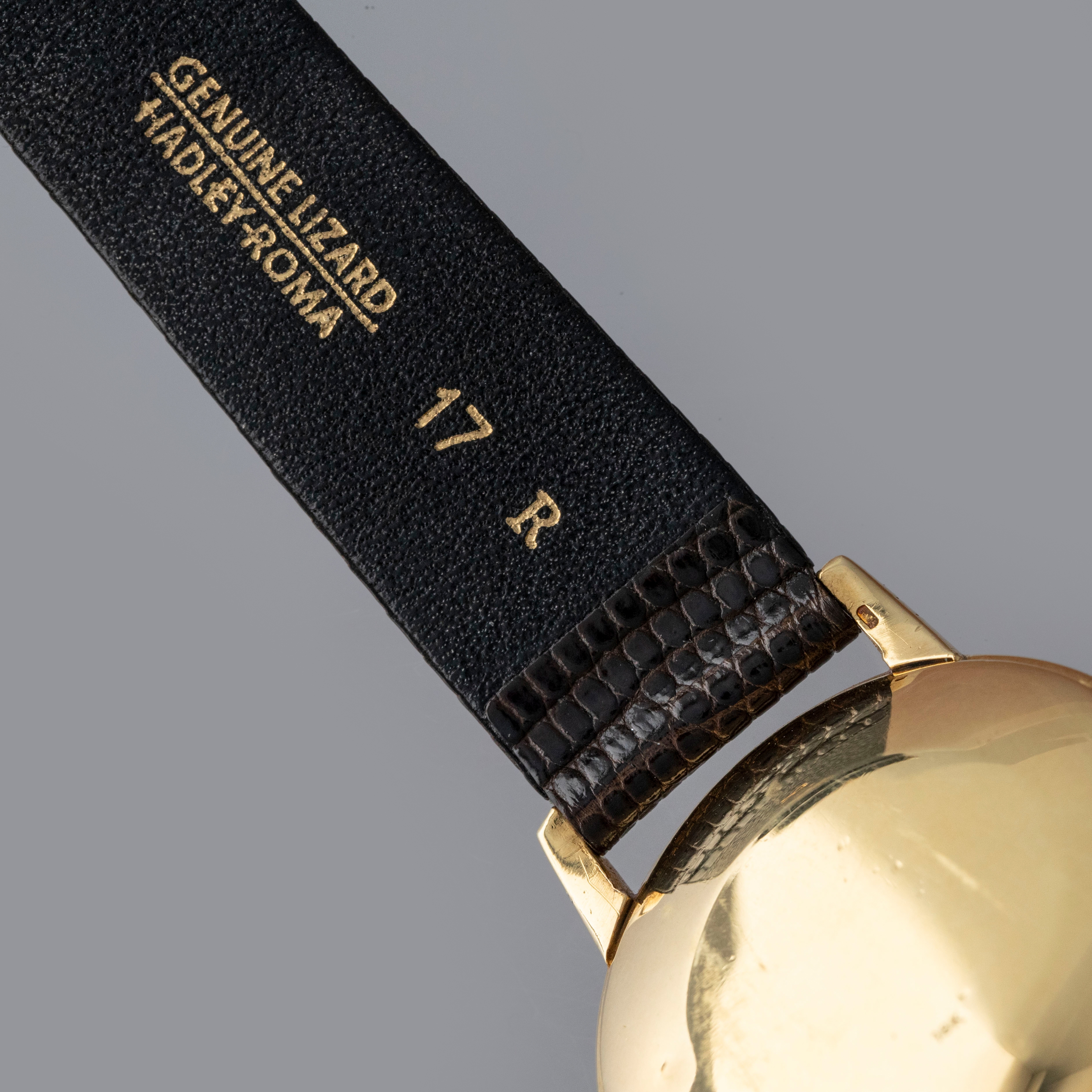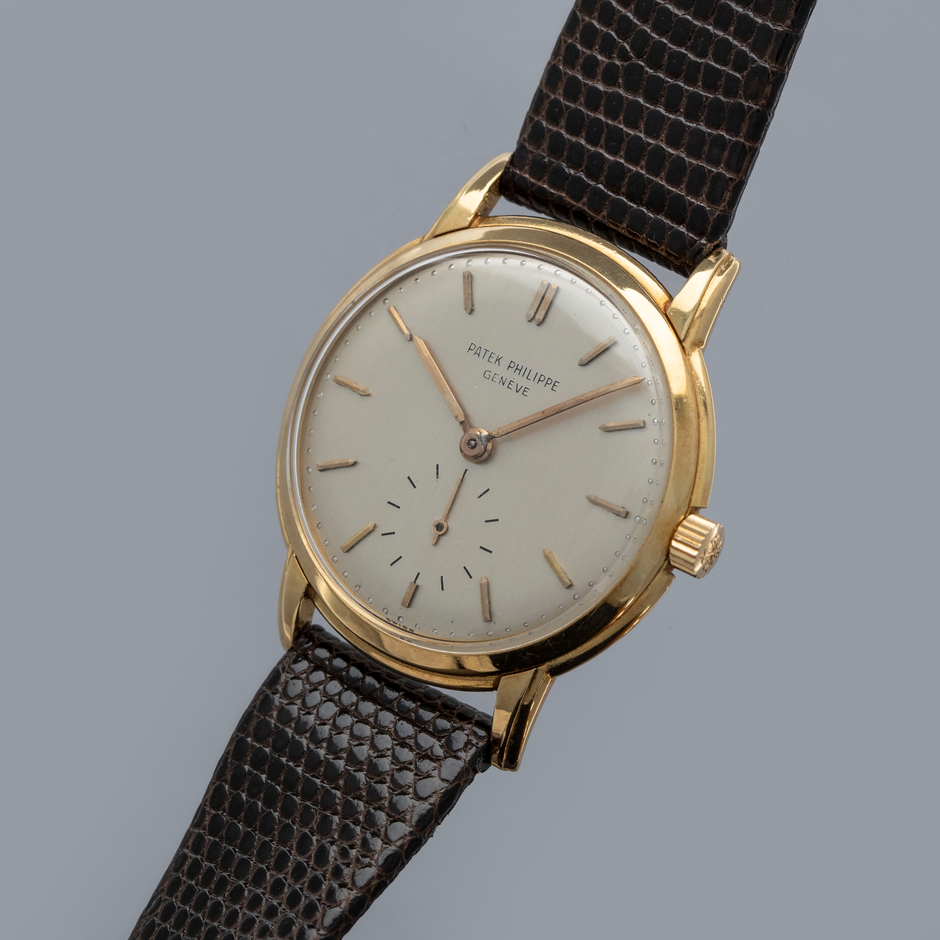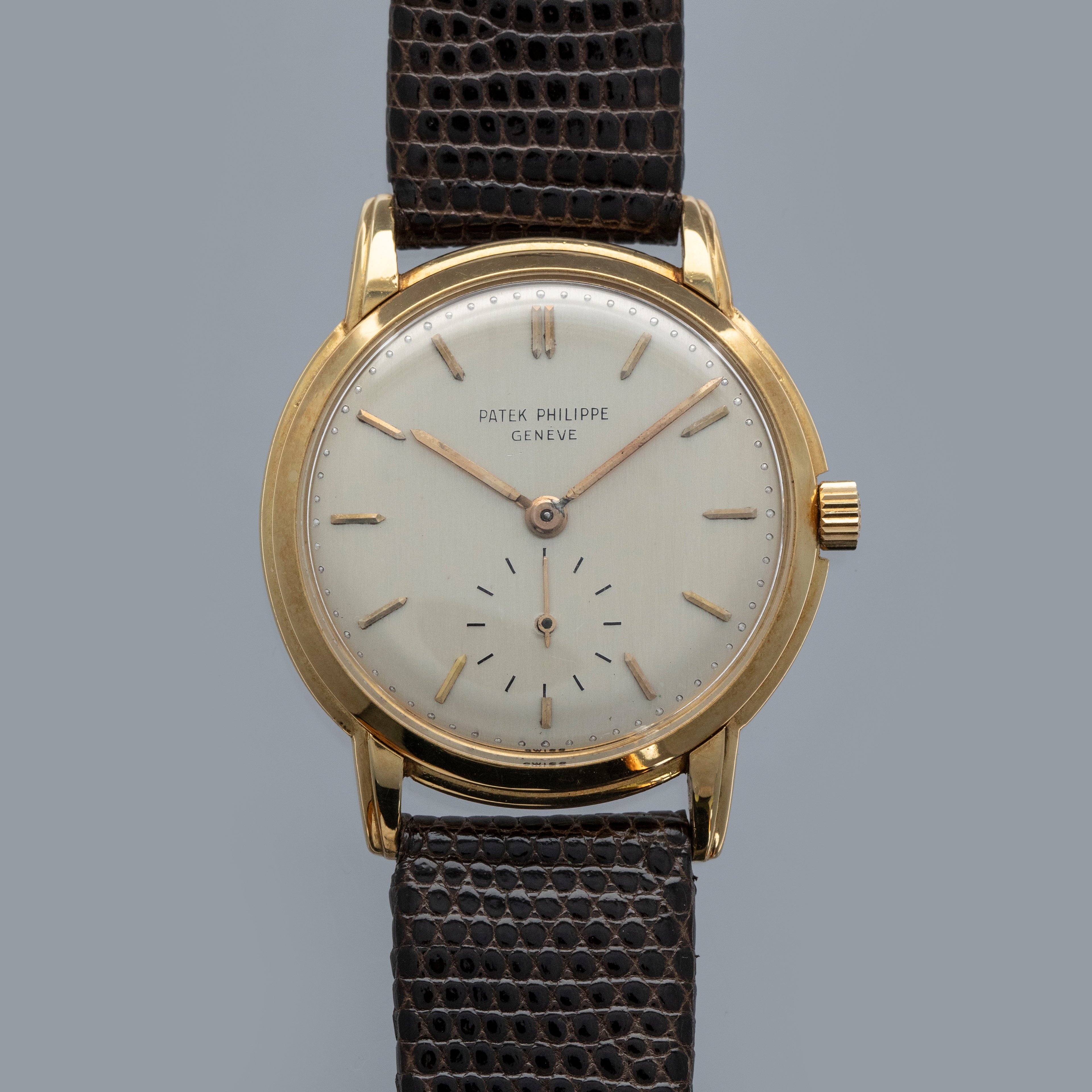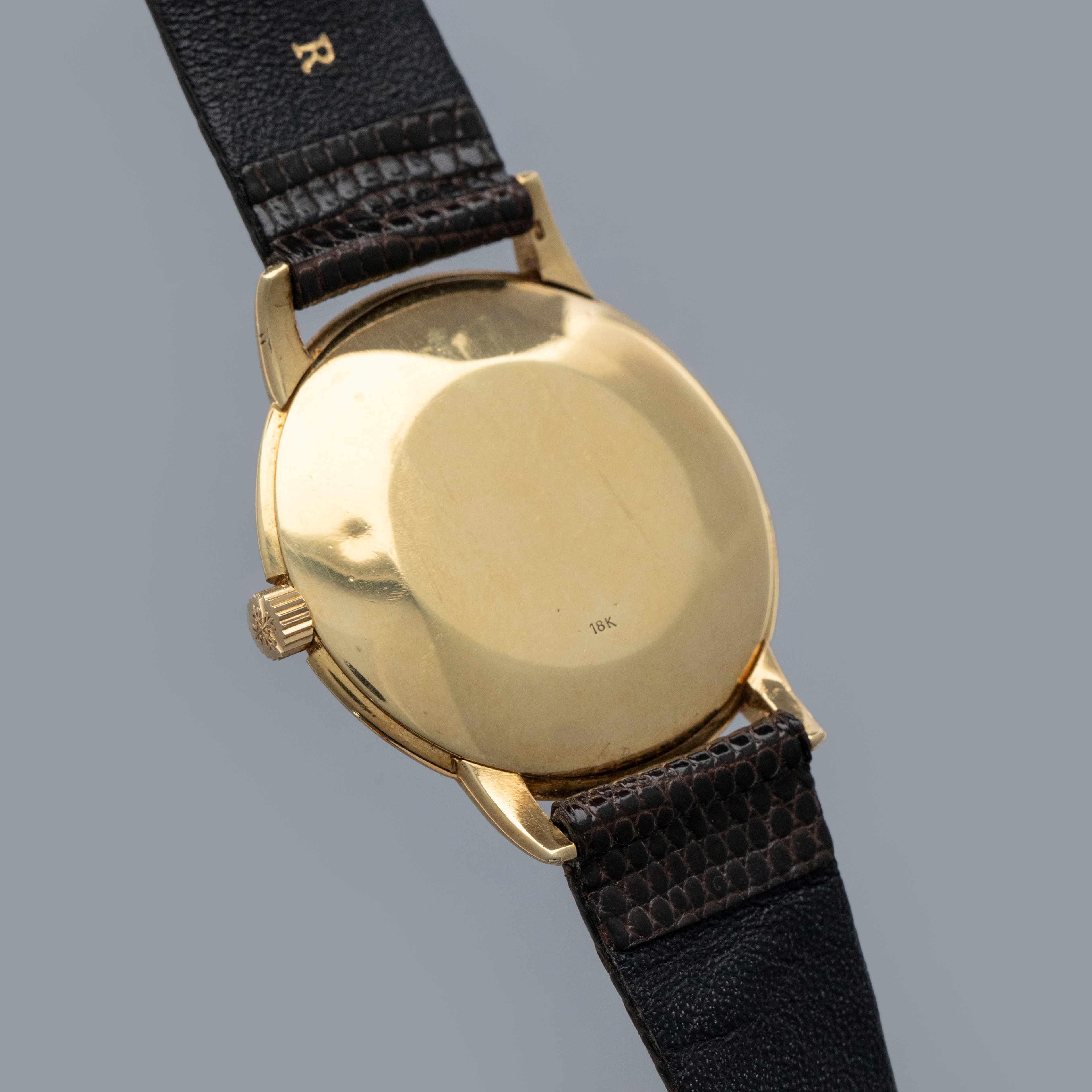 Watch is in overall very good condition. The yellow gold case shows surface scratches, with a few small nicks to the bezel and a couple of dings to the sides of the upper lugs. The case back retains a well-defined 18K stamp along with surface scratches and small marks. The dial shows some small surface marks, including a scratch below the “G” of Genève, and it appears that the minute hand has been repaired at the pinion end. It is fitted with a brown lizard strap and a gold-plated buckle.