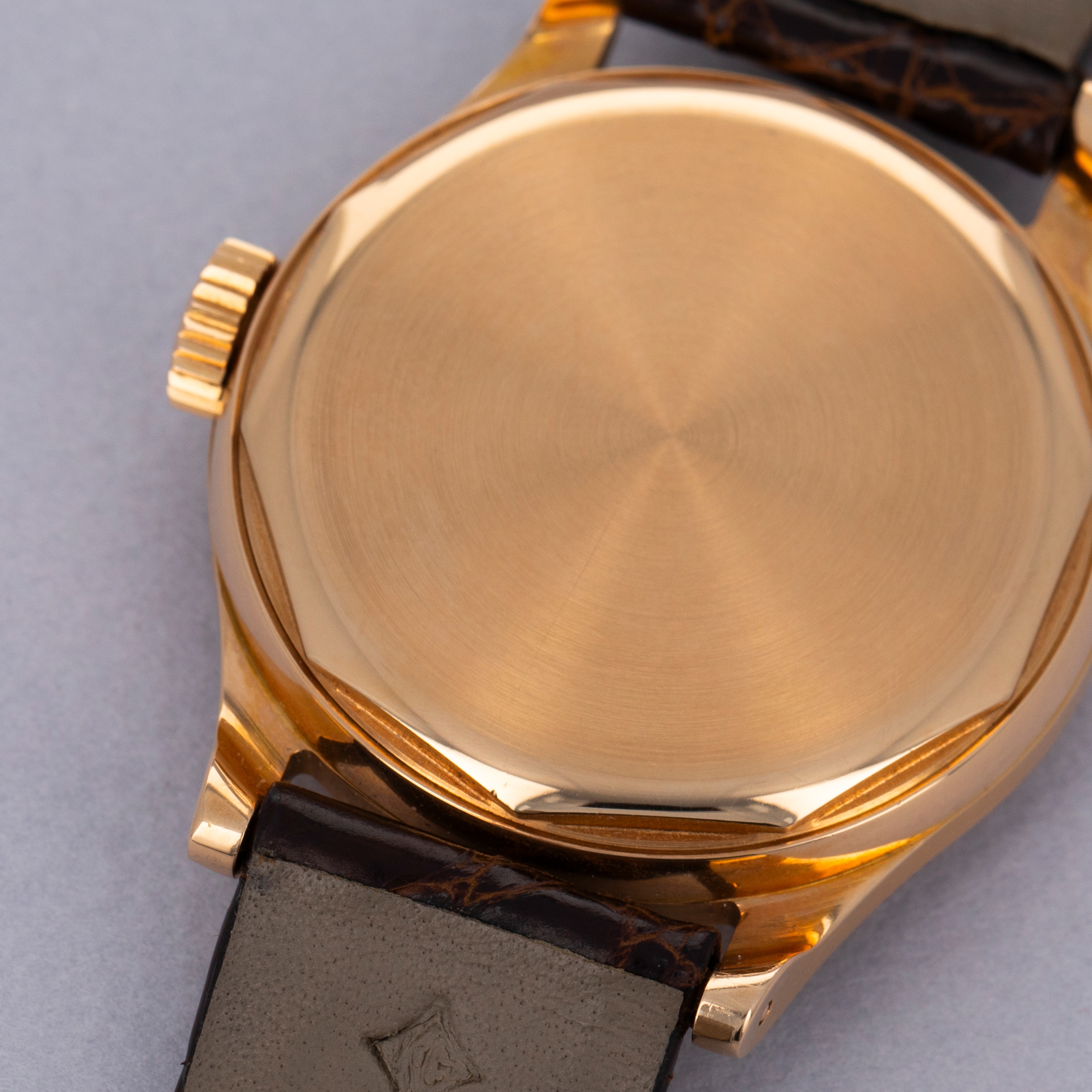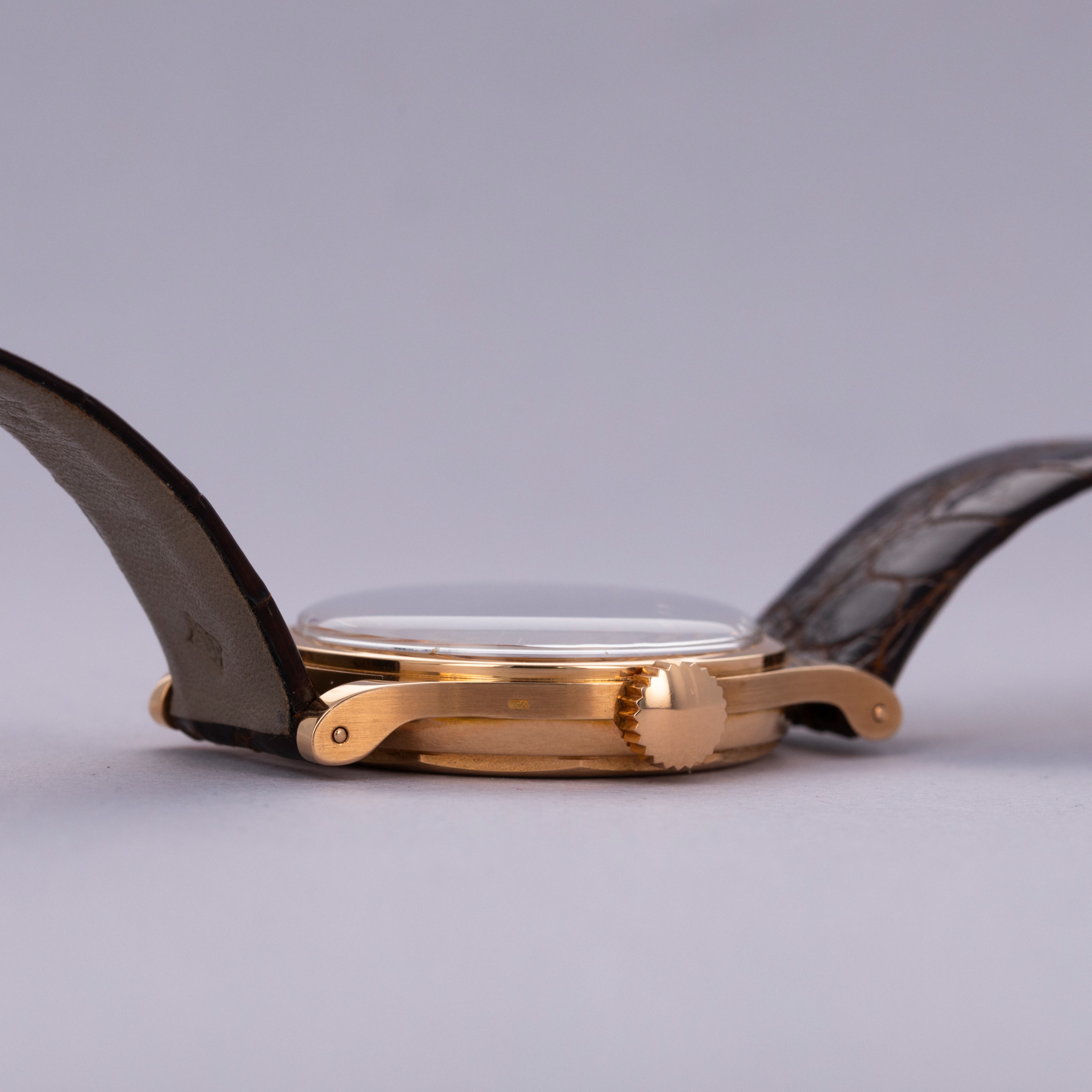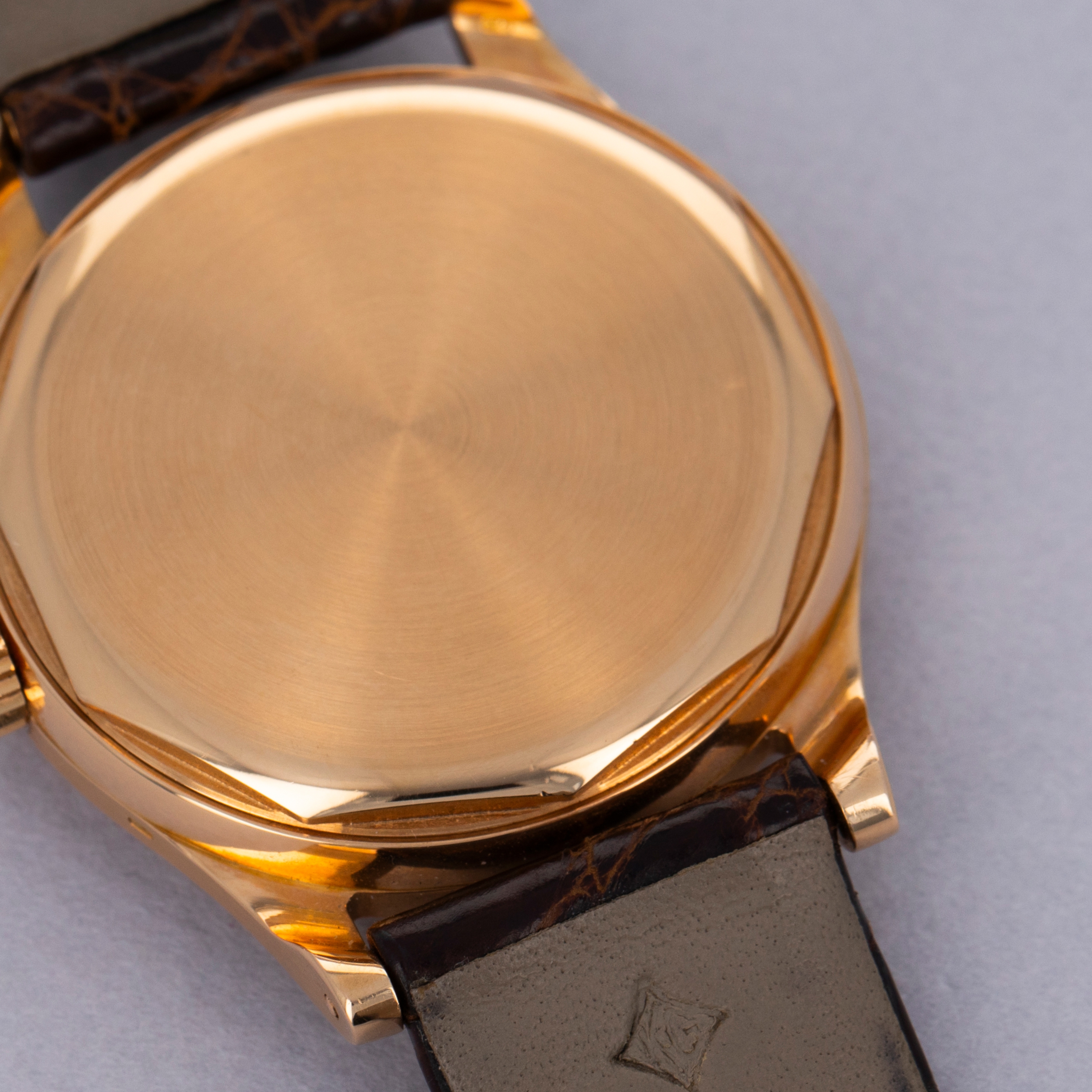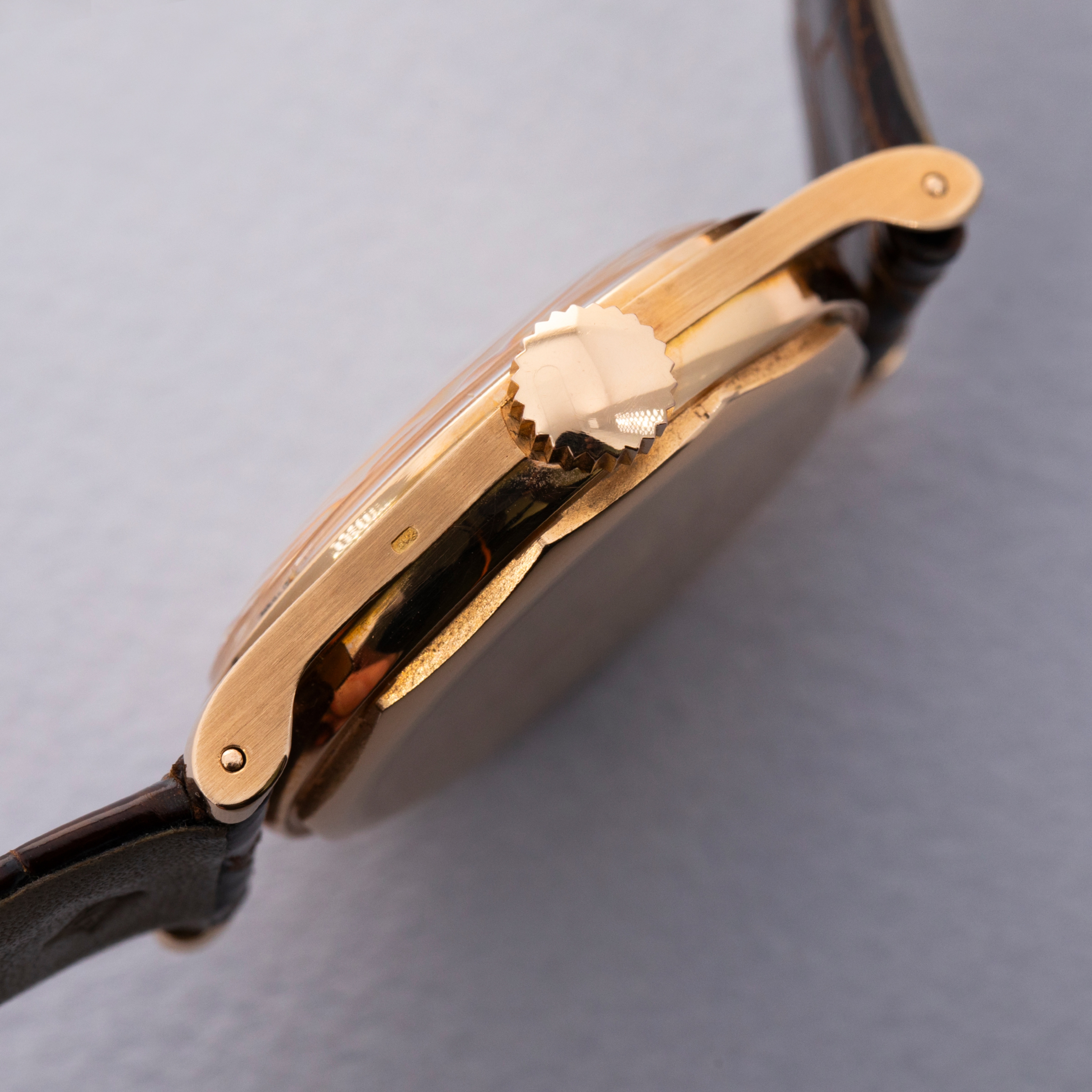 Offered in truly exceptional condition, this ref. 2508R's 35mm 18kt rose gold case features all of its sharp bevels and edges as it originally would have in 1955. Combining Patek's waterproof design with a large diameter for the Calatrava at the time, the ref. 2508 is a wonderfully modern-wearing watch, and in this condition it could have only left the Patek factory yesterday.