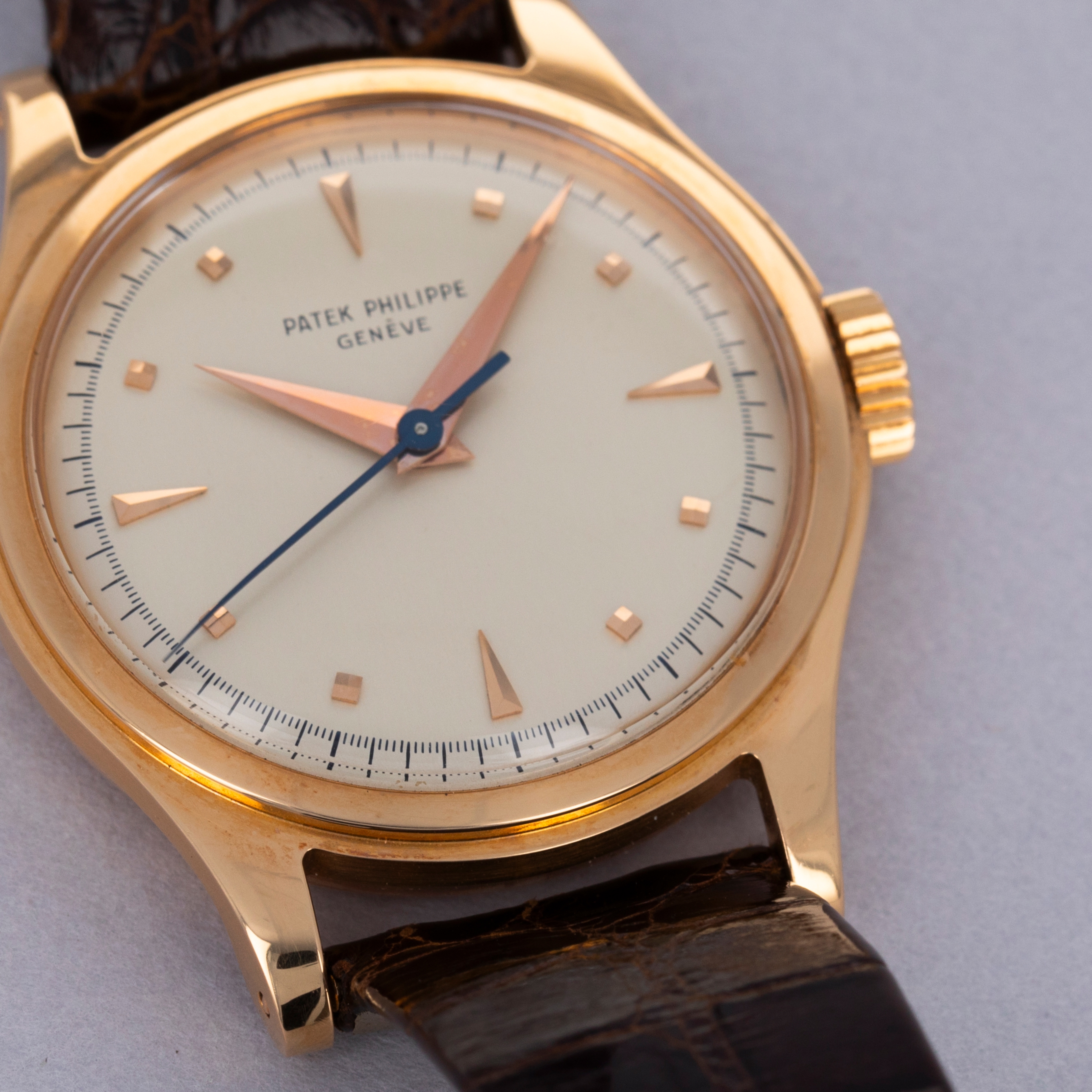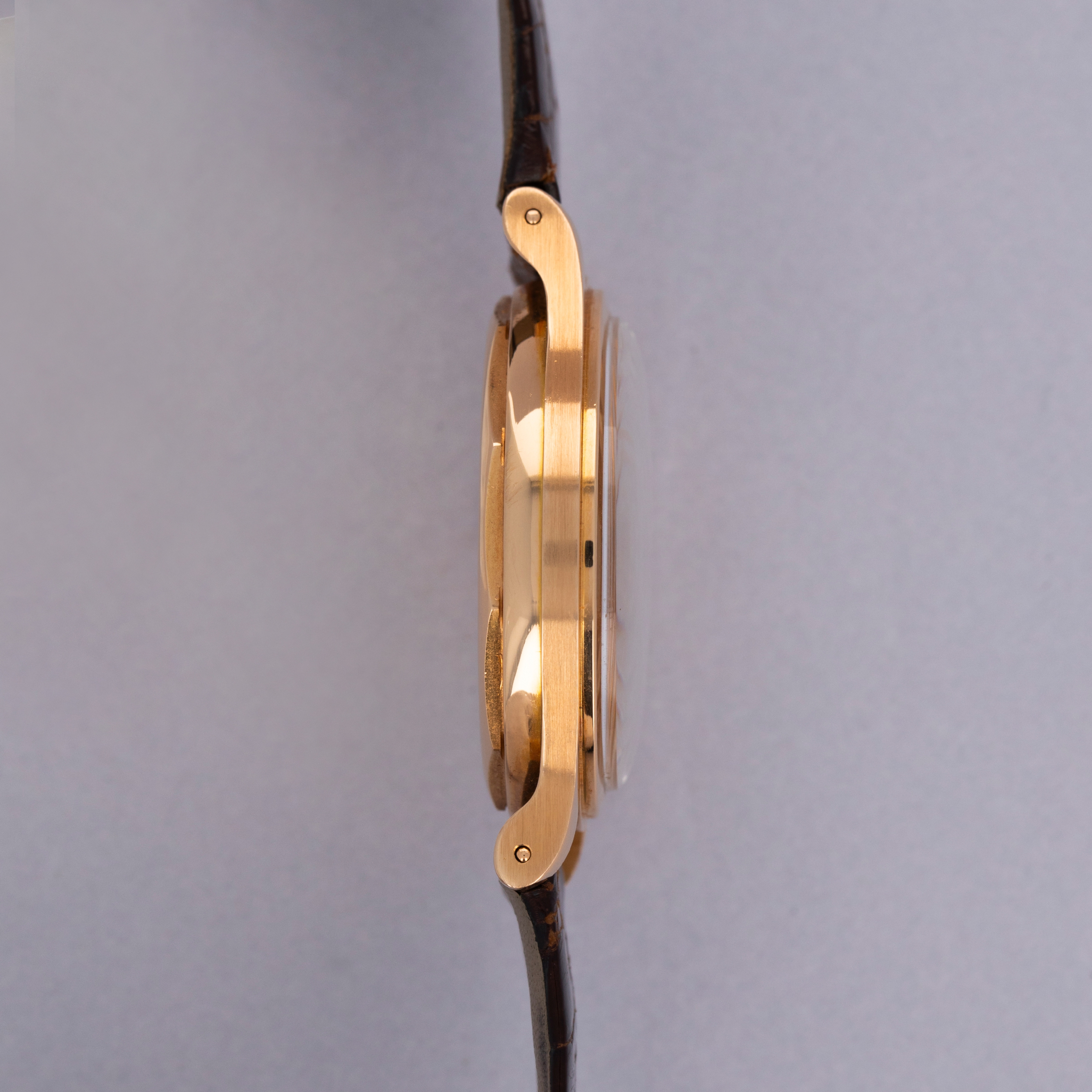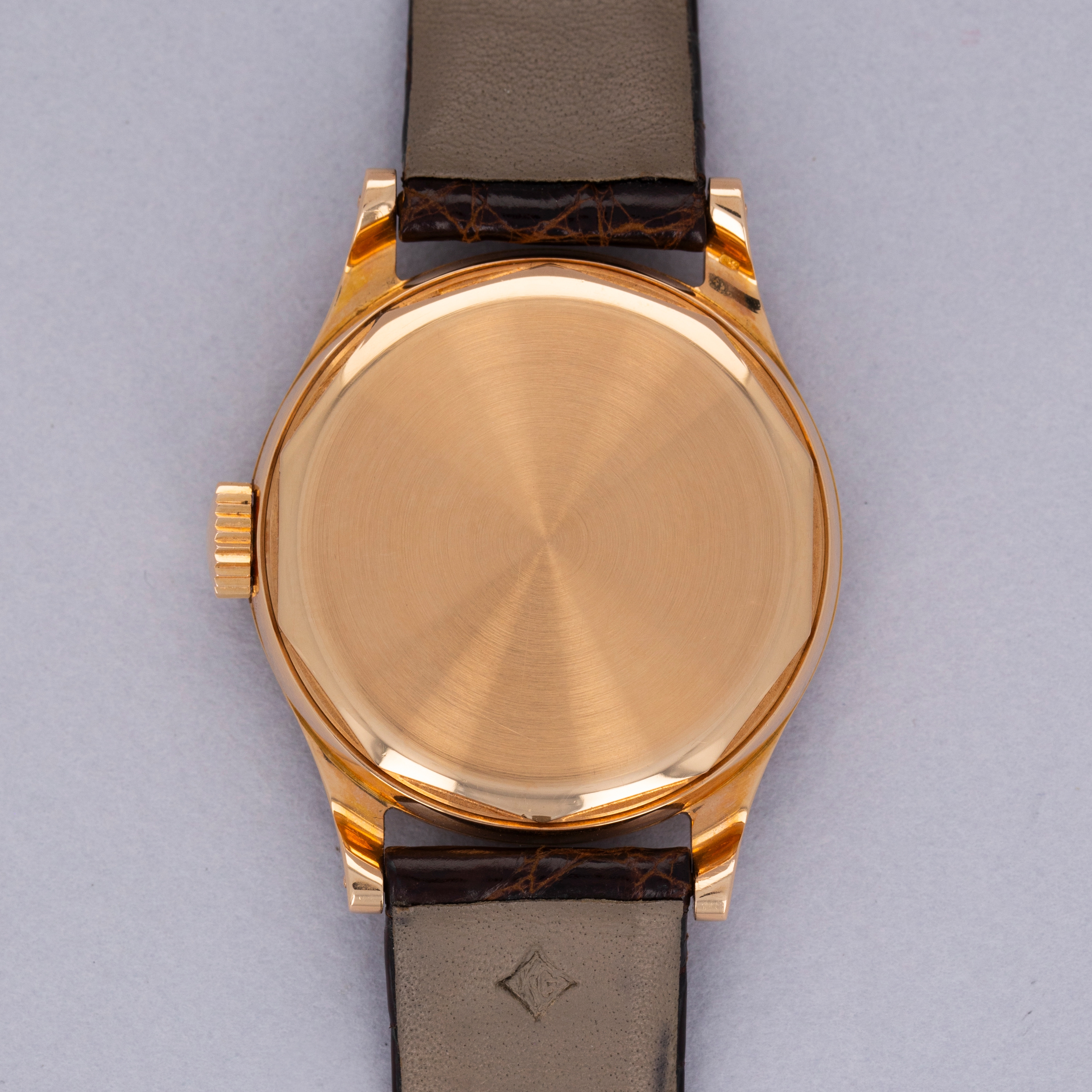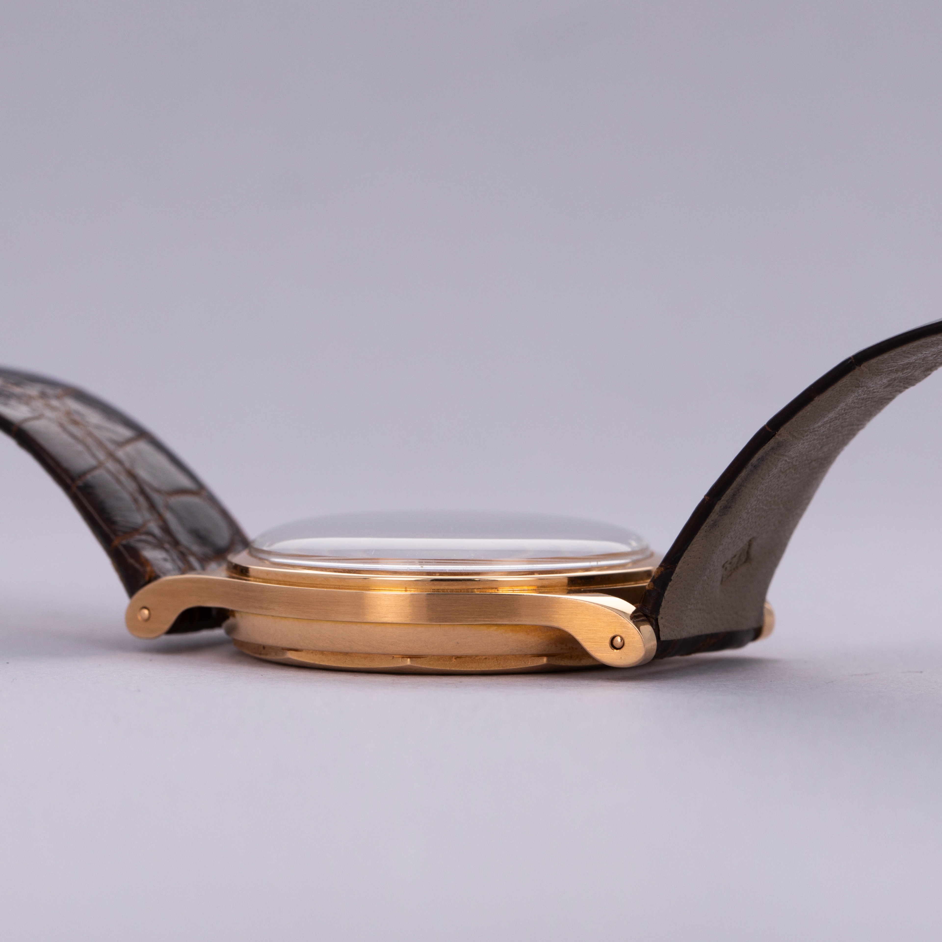 Offered in truly exceptional condition, this ref. 2508R's 35mm 18kt rose gold case features all of its sharp bevels and edges as it originally would have in 1955. Combining Patek's waterproof design with a large diameter for the Calatrava at the time, the ref. 2508 is a wonderfully modern-wearing watch, and in this condition it could have only left the Patek factory yesterday.