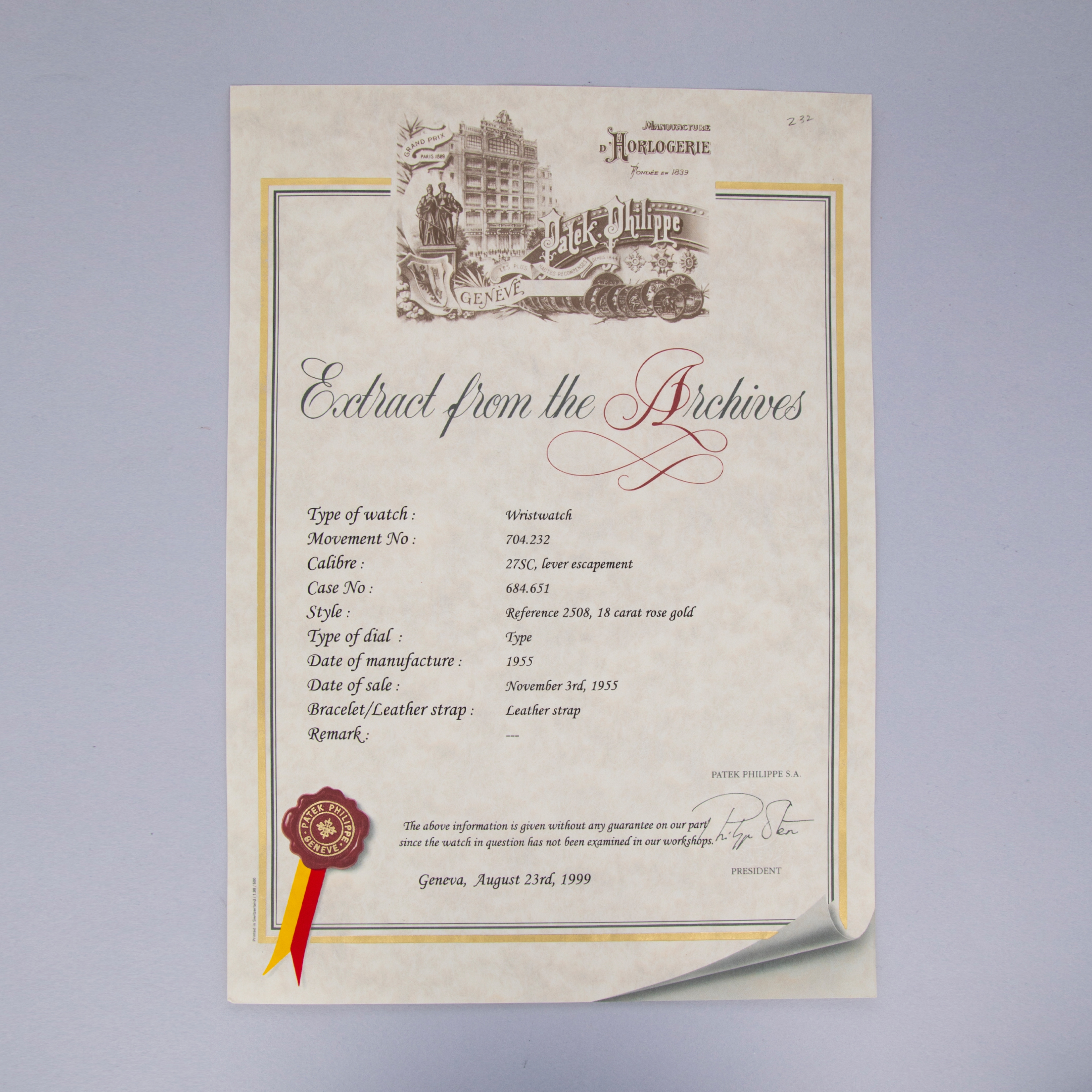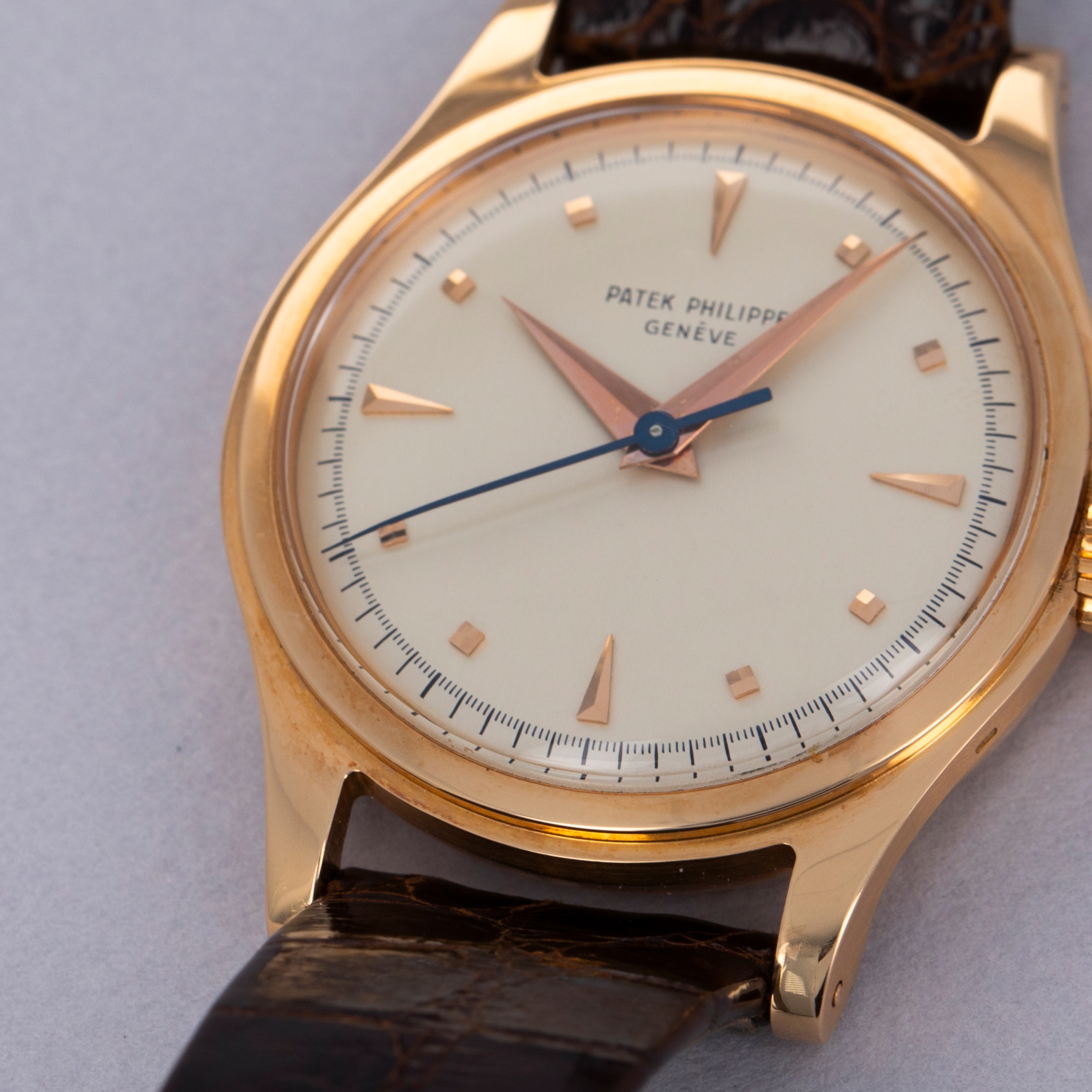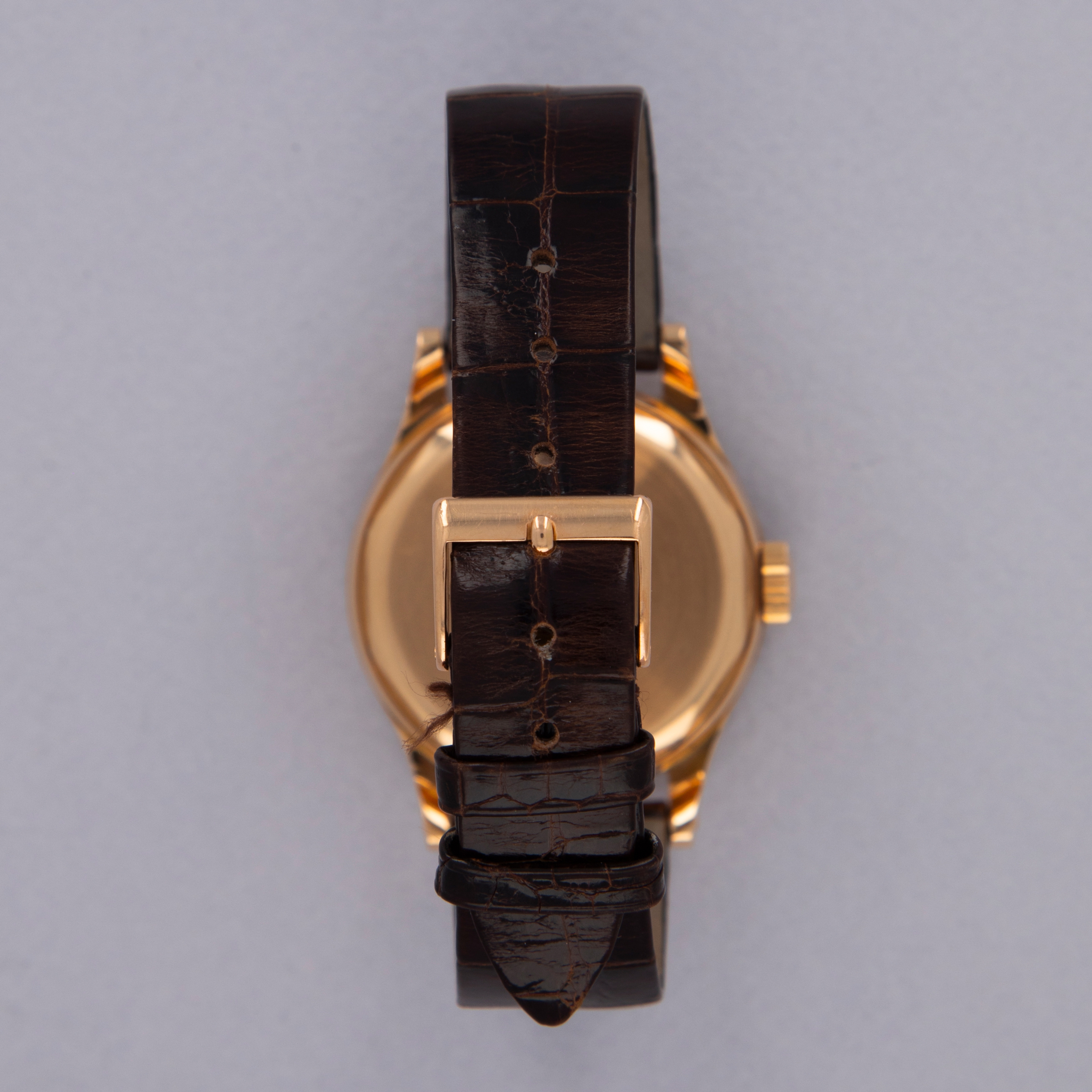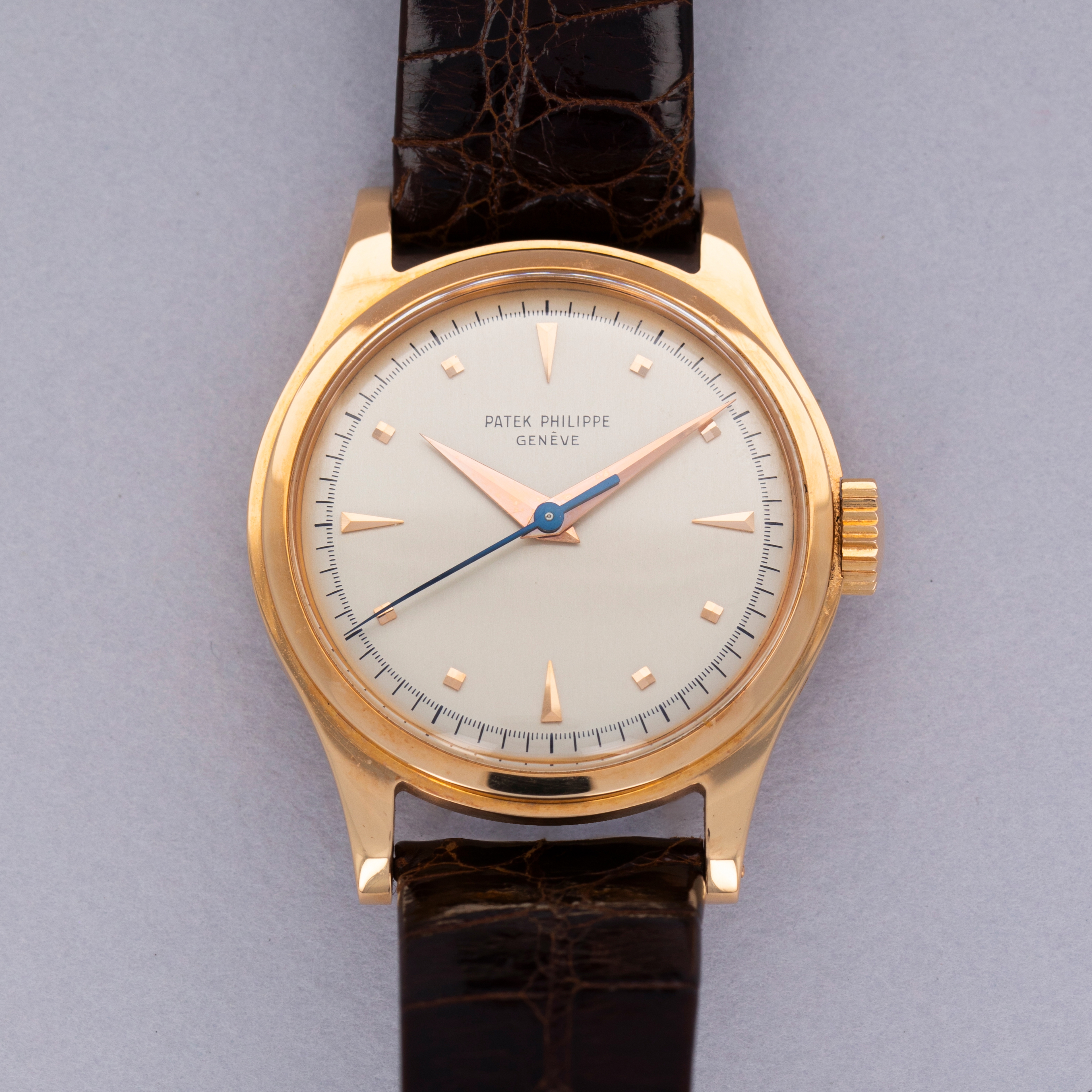 Offered in truly exceptional condition, this ref. 2508R's 35mm 18kt rose gold case features all of its sharp bevels and edges as it originally would have in 1955. Combining Patek's waterproof design with a large diameter for the Calatrava at the time, the ref. 2508 is a wonderfully modern-wearing watch, and in this condition it could have only left the Patek factory yesterday.