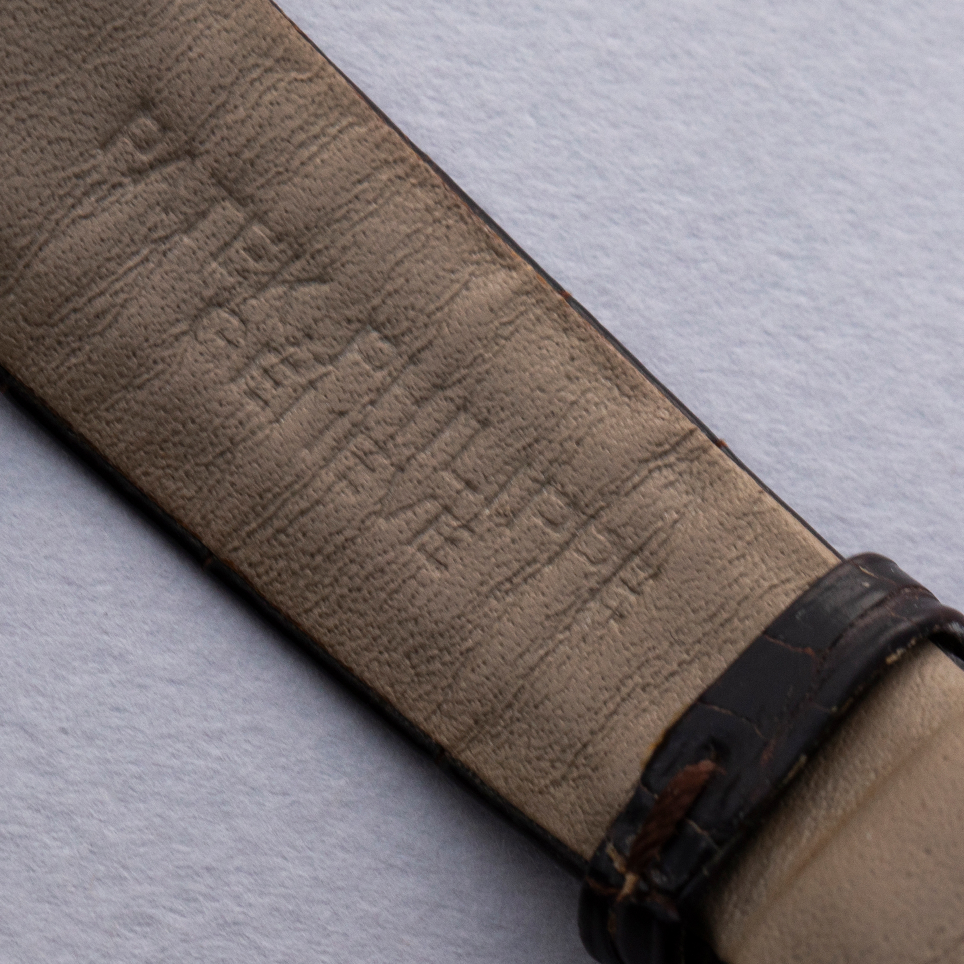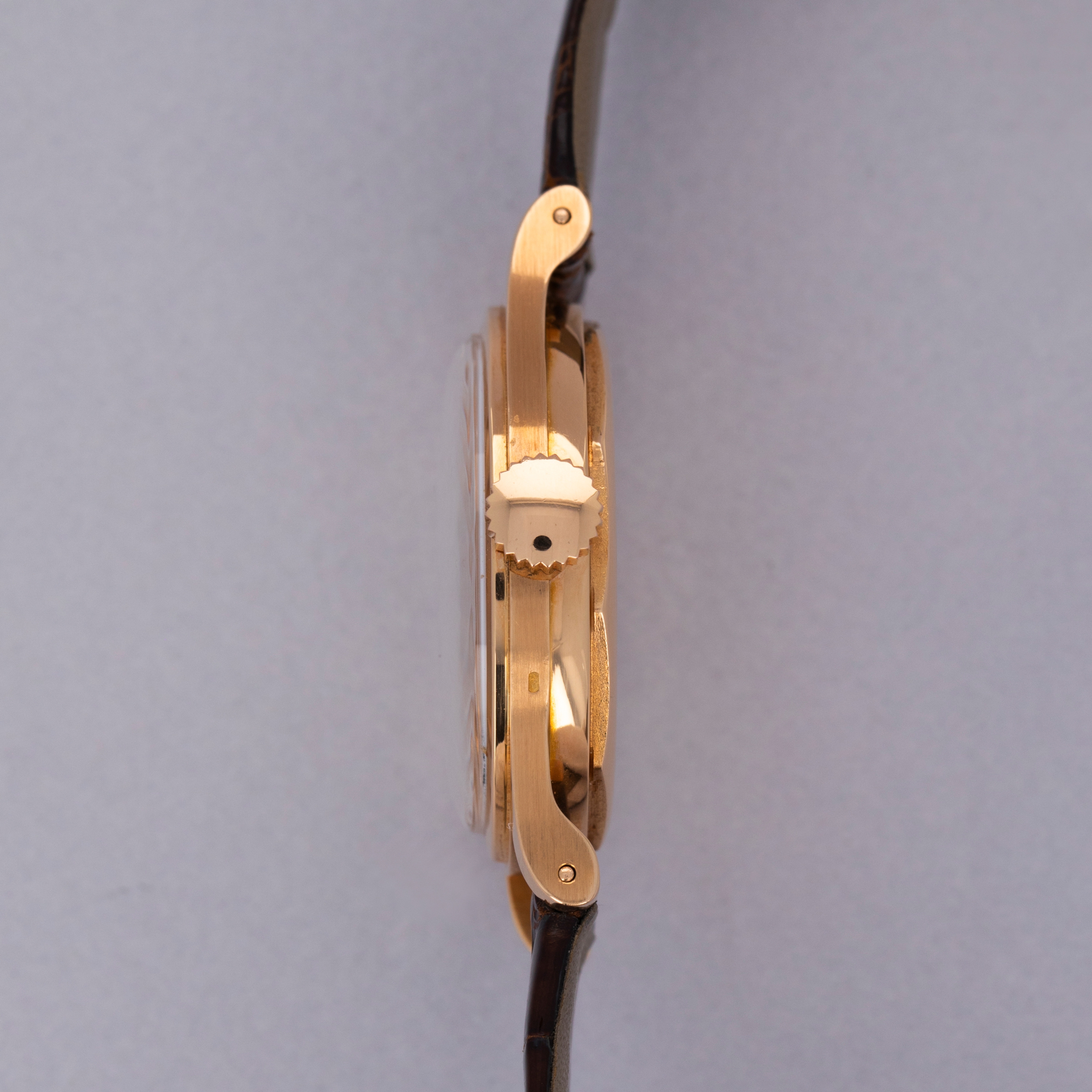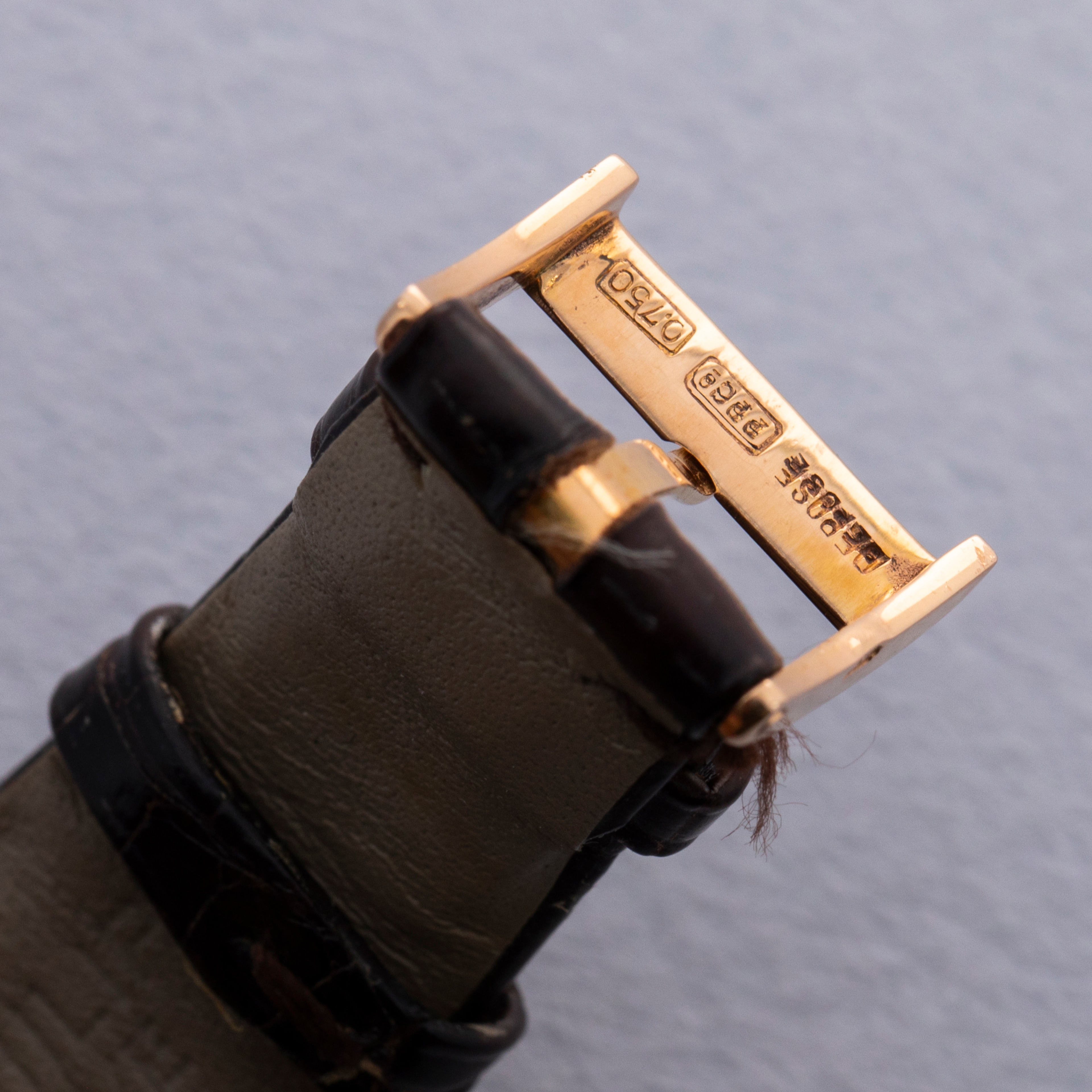Watch is in mint condition. It shows very little signs of surface wear, with sharp edges all around. Hallmarks are crisp and well defined. The original indelible dial shows a well defined raised signature, and very little wear or signs of aging. Watch comes with a period Patek tang buckle in 18kt gold. The watch is accompanied by an Extract of the Archives.