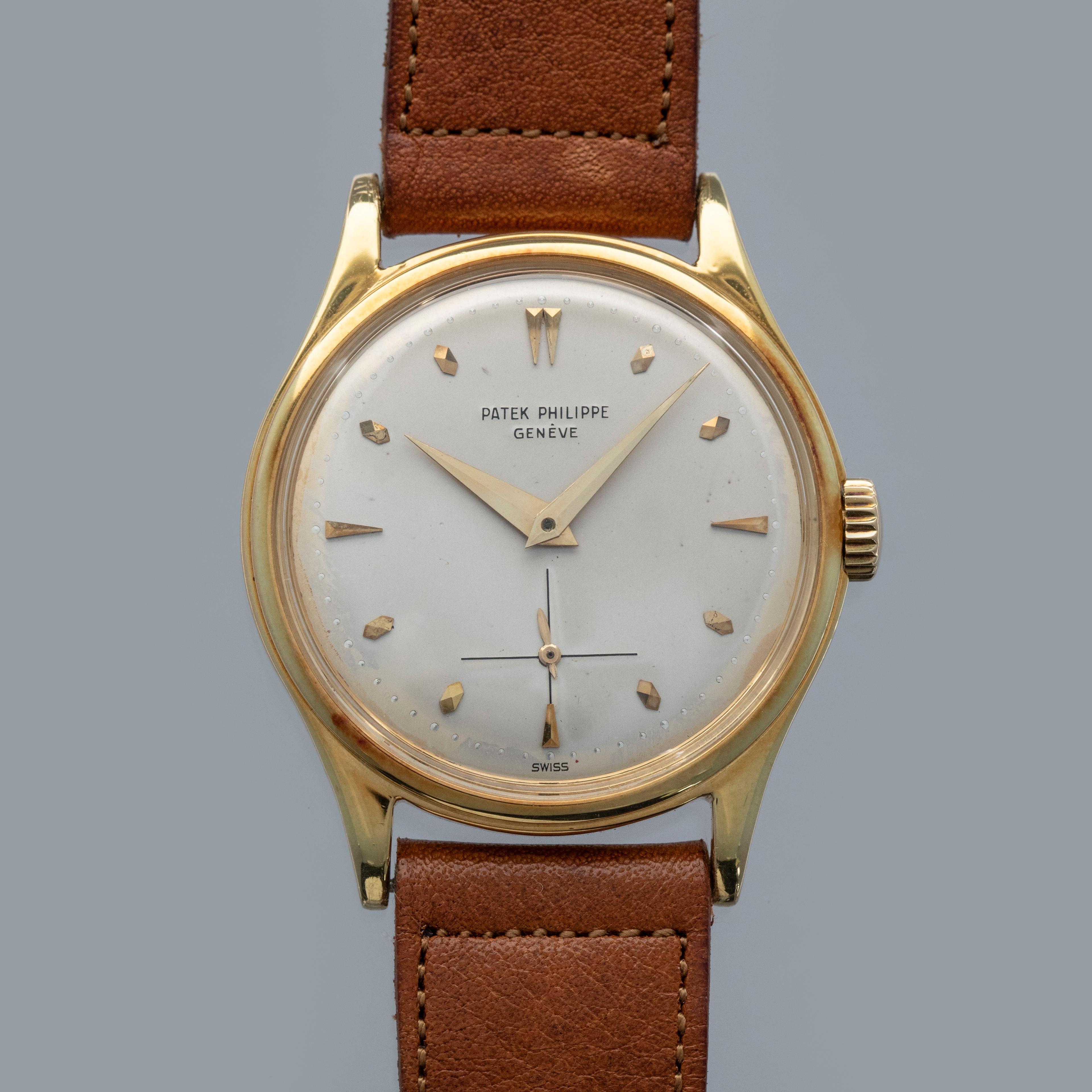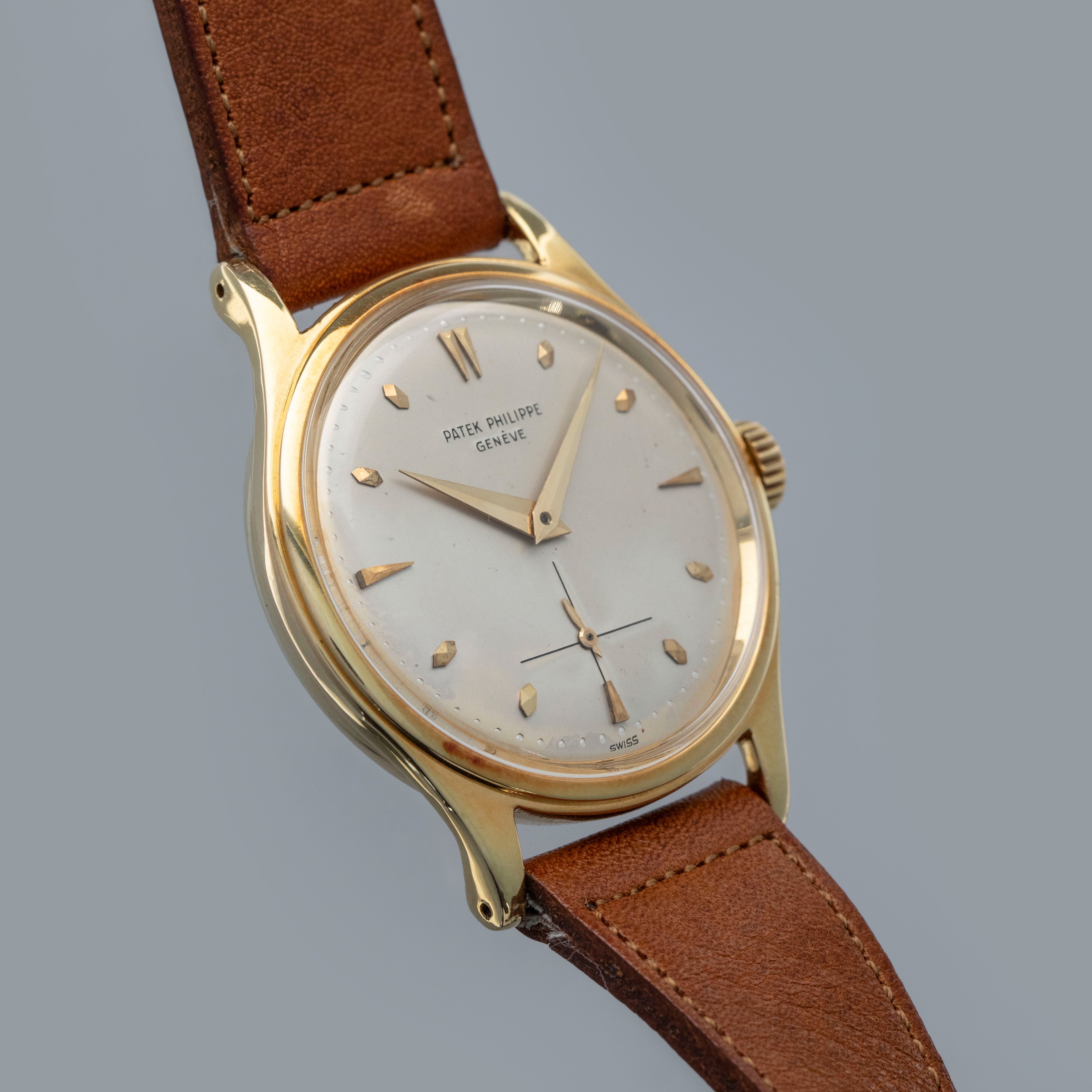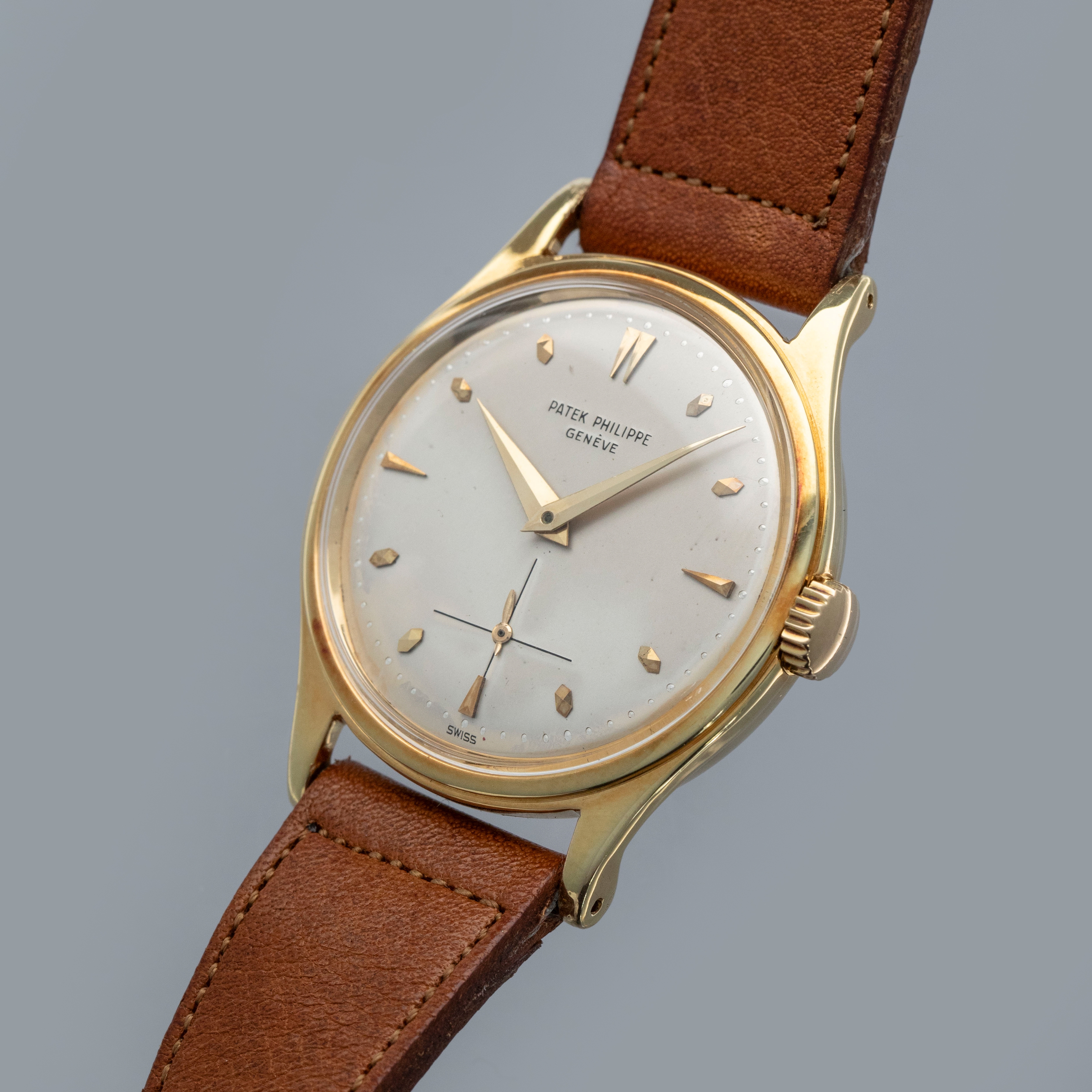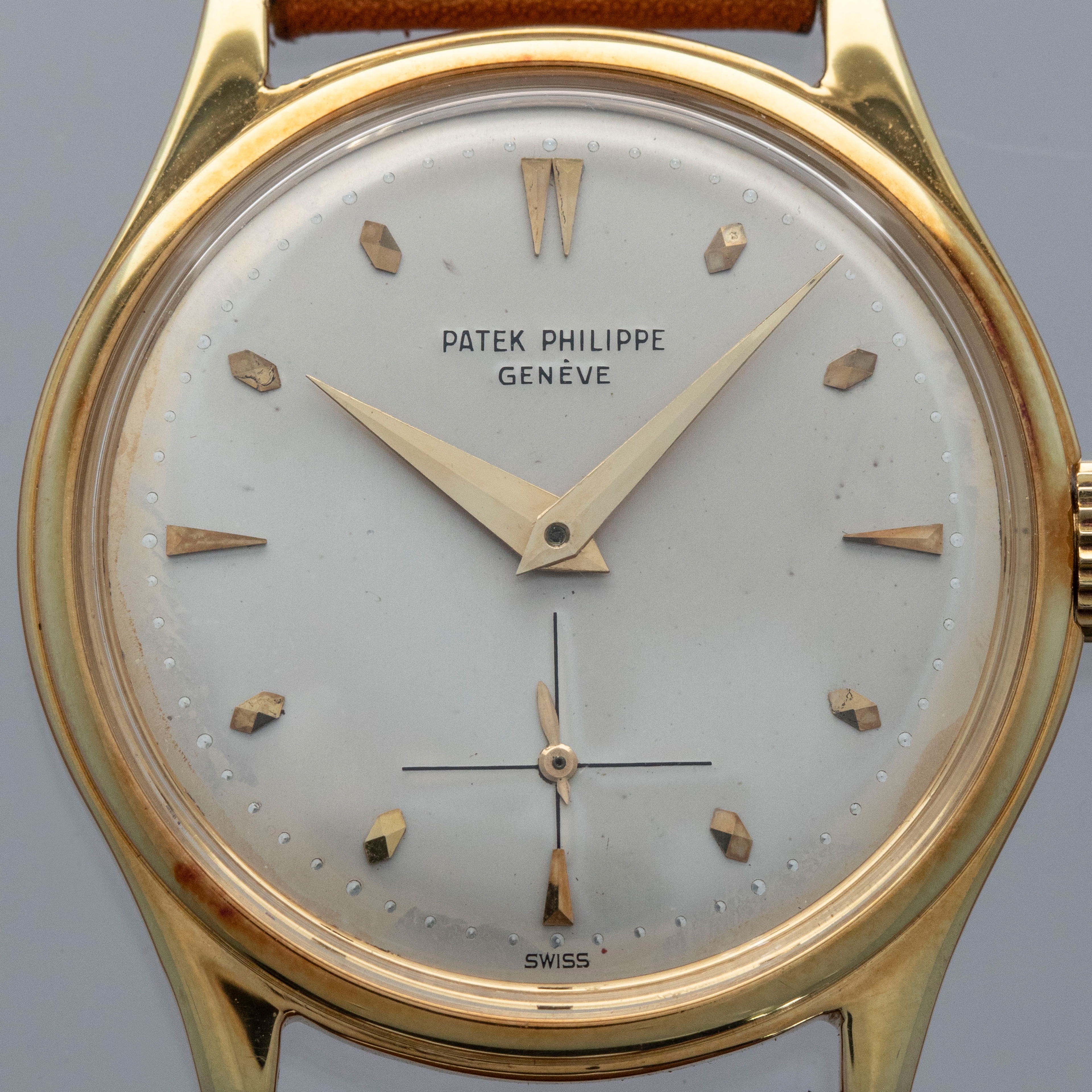 Watch is in overall very good condition. The yellow gold case shows softened edges in places, with several scratches and small nicks. The decagonal case back has light surface marks and a crisp 18K stamp. The dial has some light surface marks and patches of degradation around the outer edge, while the yellow gold dauphine hands remain very clean. The signature on the indelible dial is strong and raised. The dial is unsual and features the large crosshair subdial, but there is an applied index set at the 6 o'clock. It is factory set and we have been unable to find another example like it. Watch is fitted with a brown leather strap and a generic gold-plated buckle. Comes with a Patek Philippe Extract from the Archives and document holder.