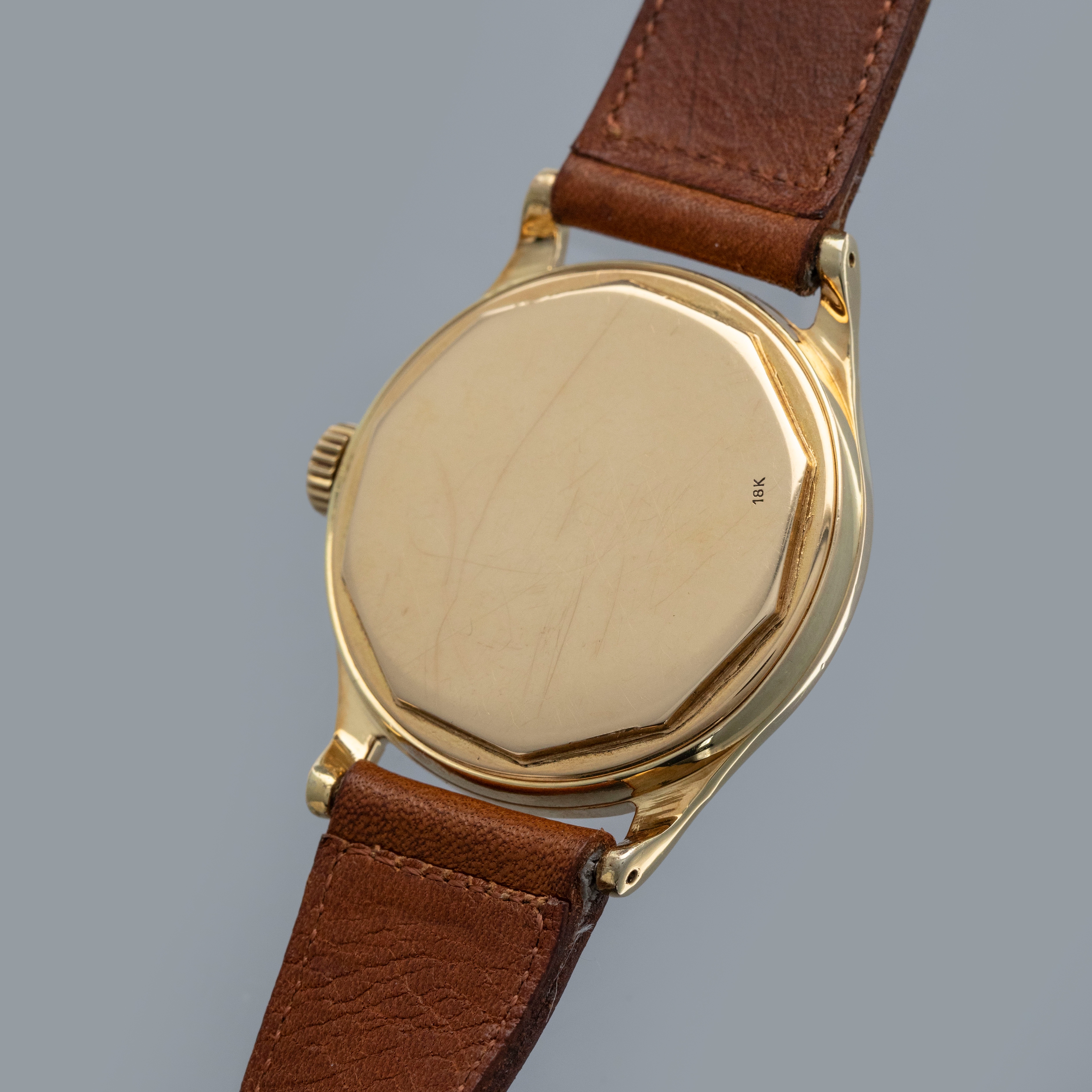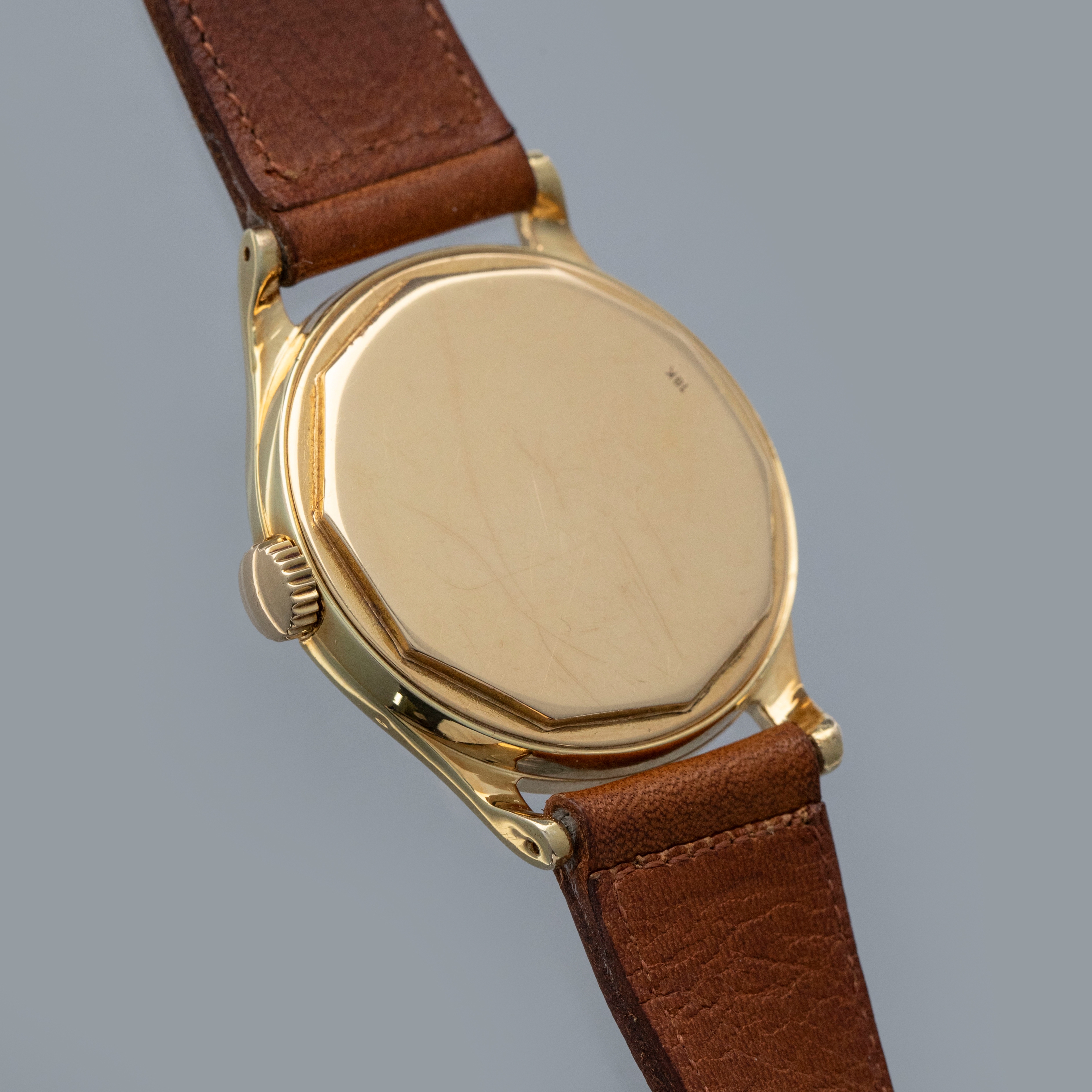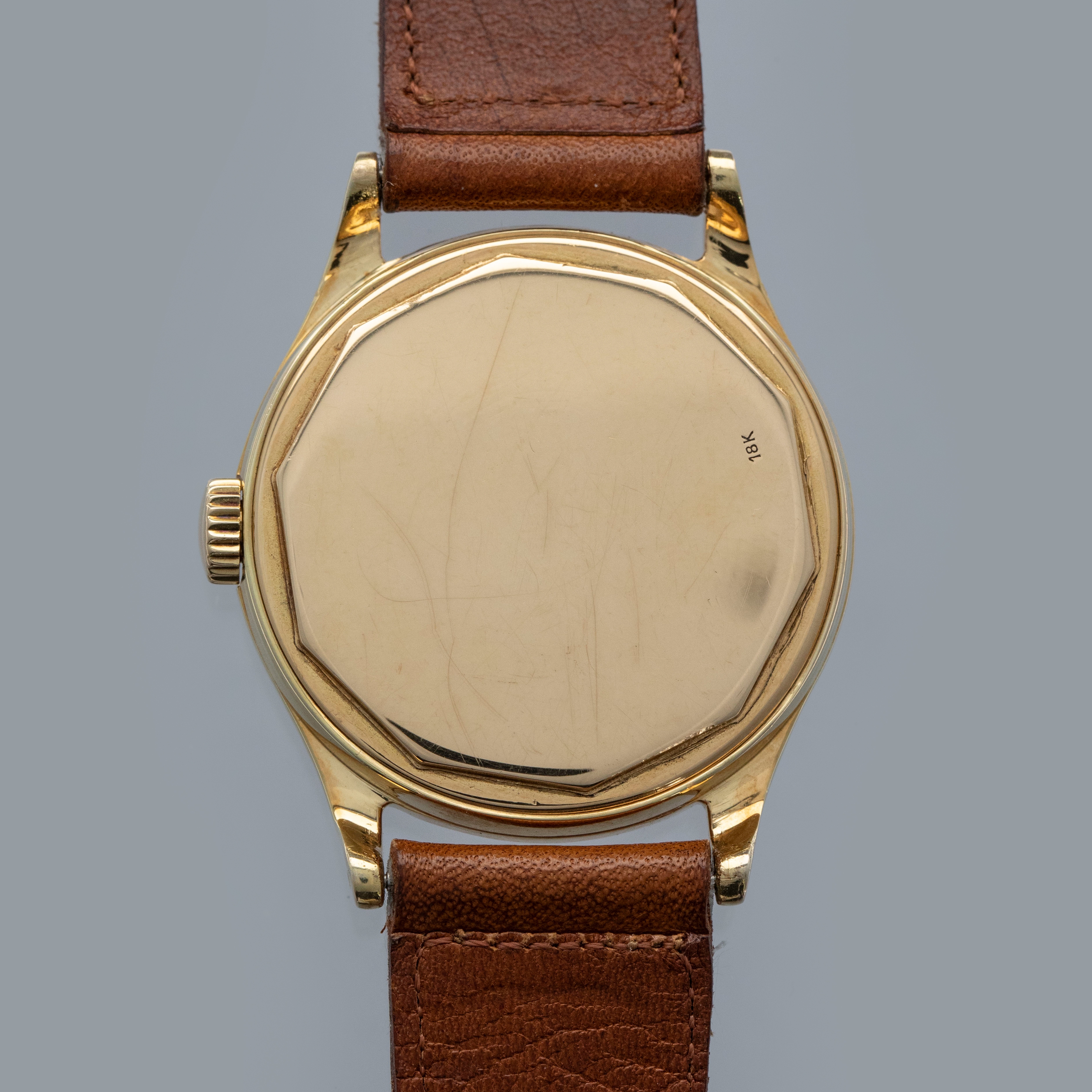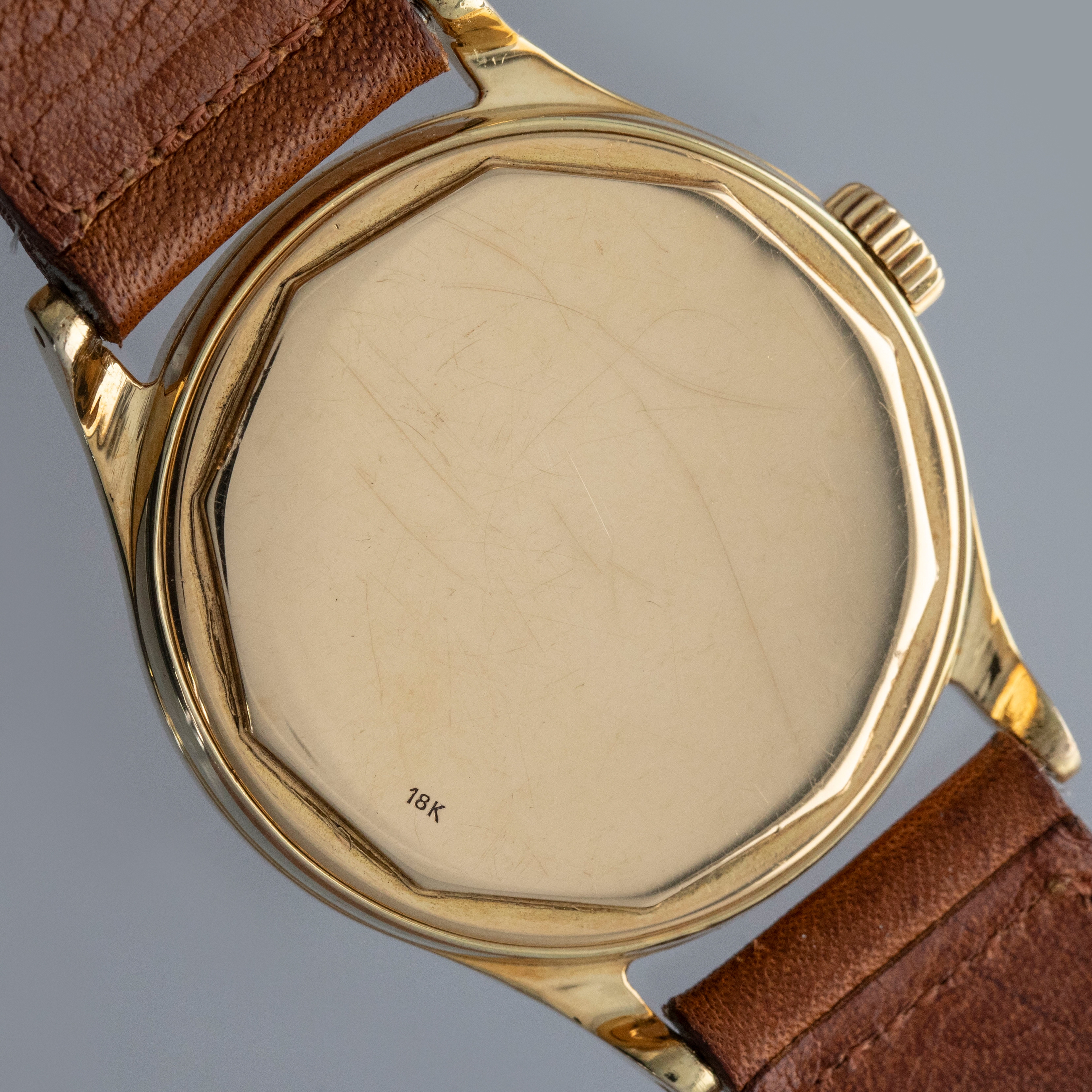 Watch is in overall very good condition. The yellow gold case shows softened edges in places, with several scratches and small nicks. The decagonal case back has light surface marks and a crisp 18K stamp. The dial has some light surface marks and patches of degradation around the outer edge, while the yellow gold dauphine hands remain very clean. The signature on the indelible dial is strong and raised. The dial is unsual and features the large crosshair subdial, but there is an applied index set at the 6 o'clock. It is factory set and we have been unable to find another example like it. Watch is fitted with a brown leather strap and a generic gold-plated buckle. Comes with a Patek Philippe Extract from the Archives and document holder.
