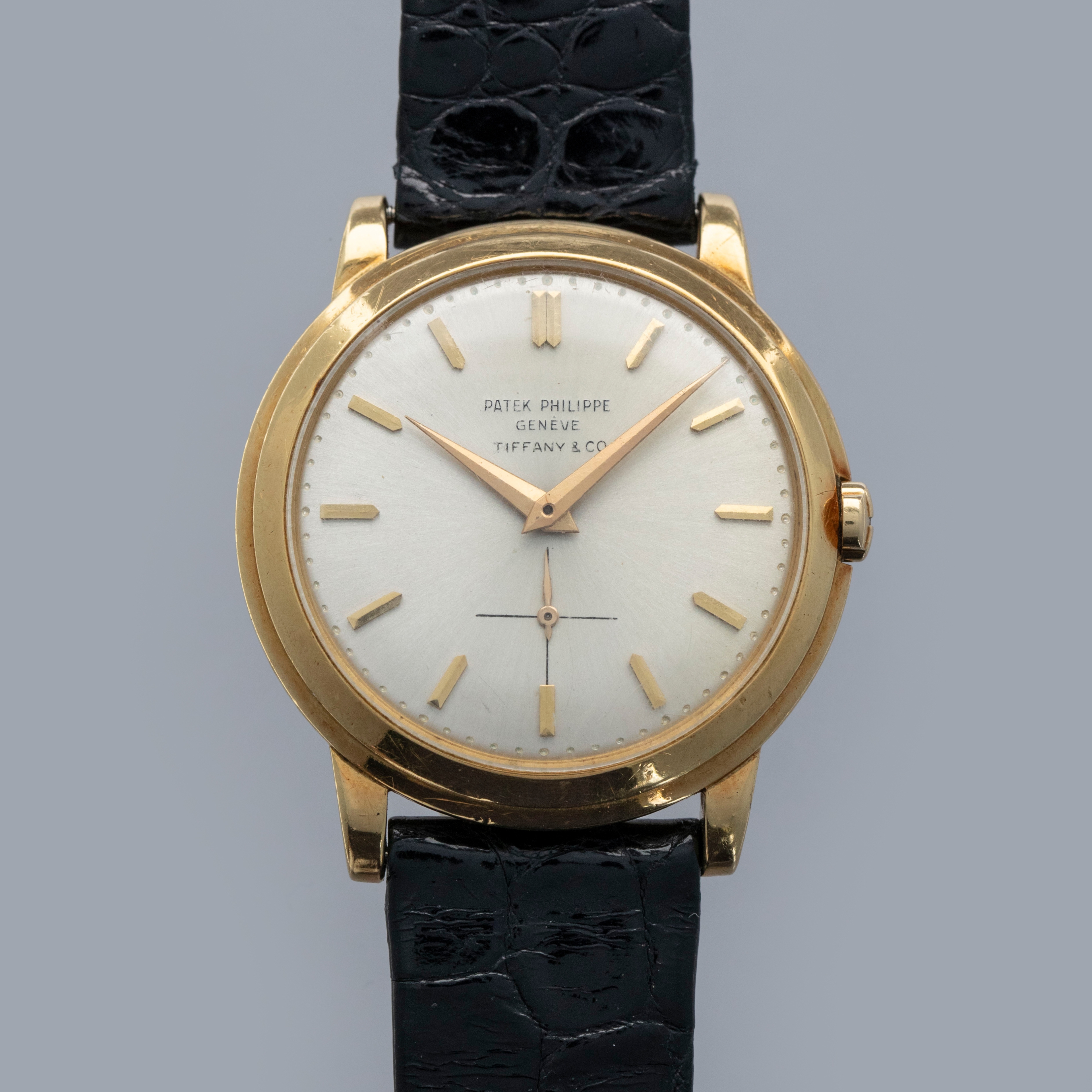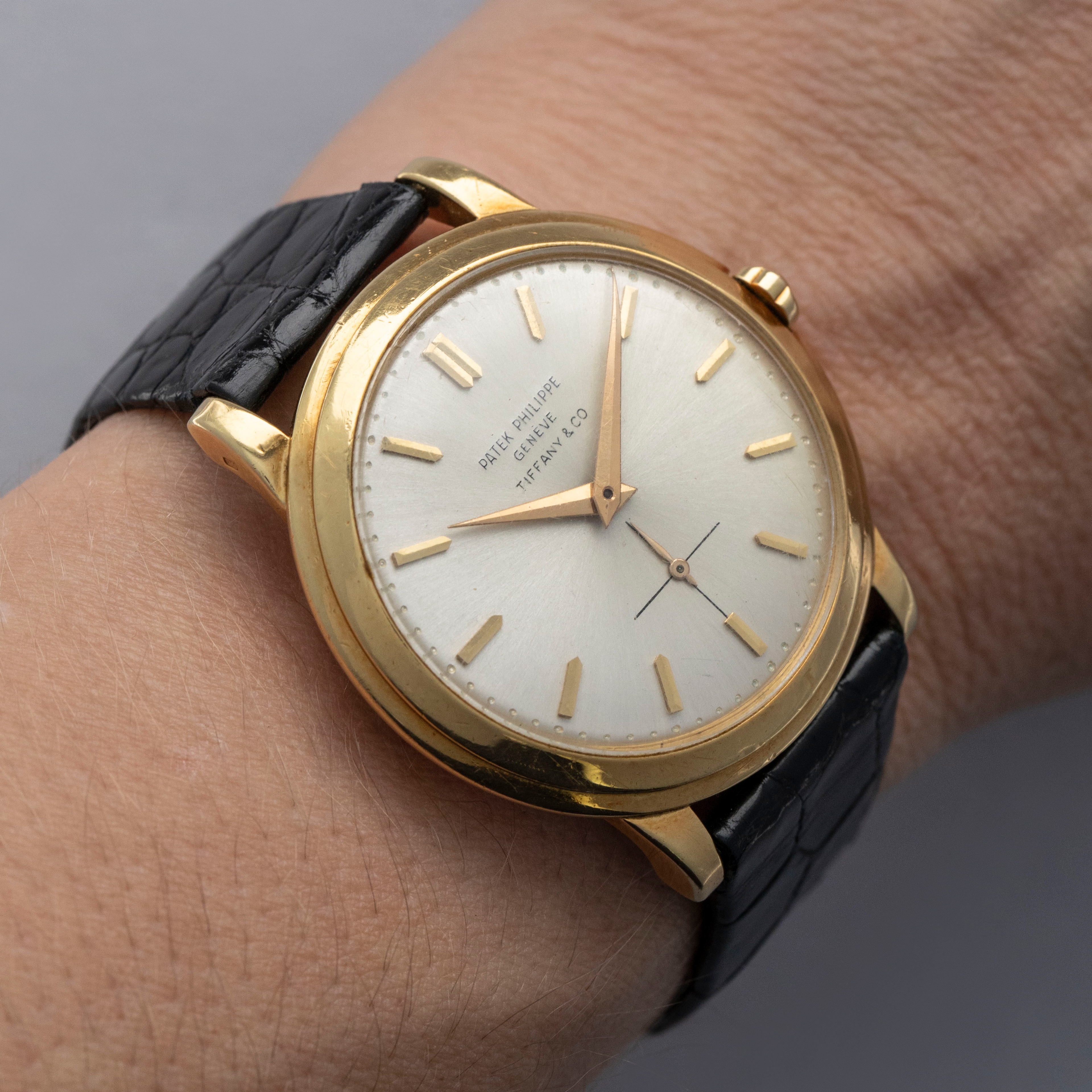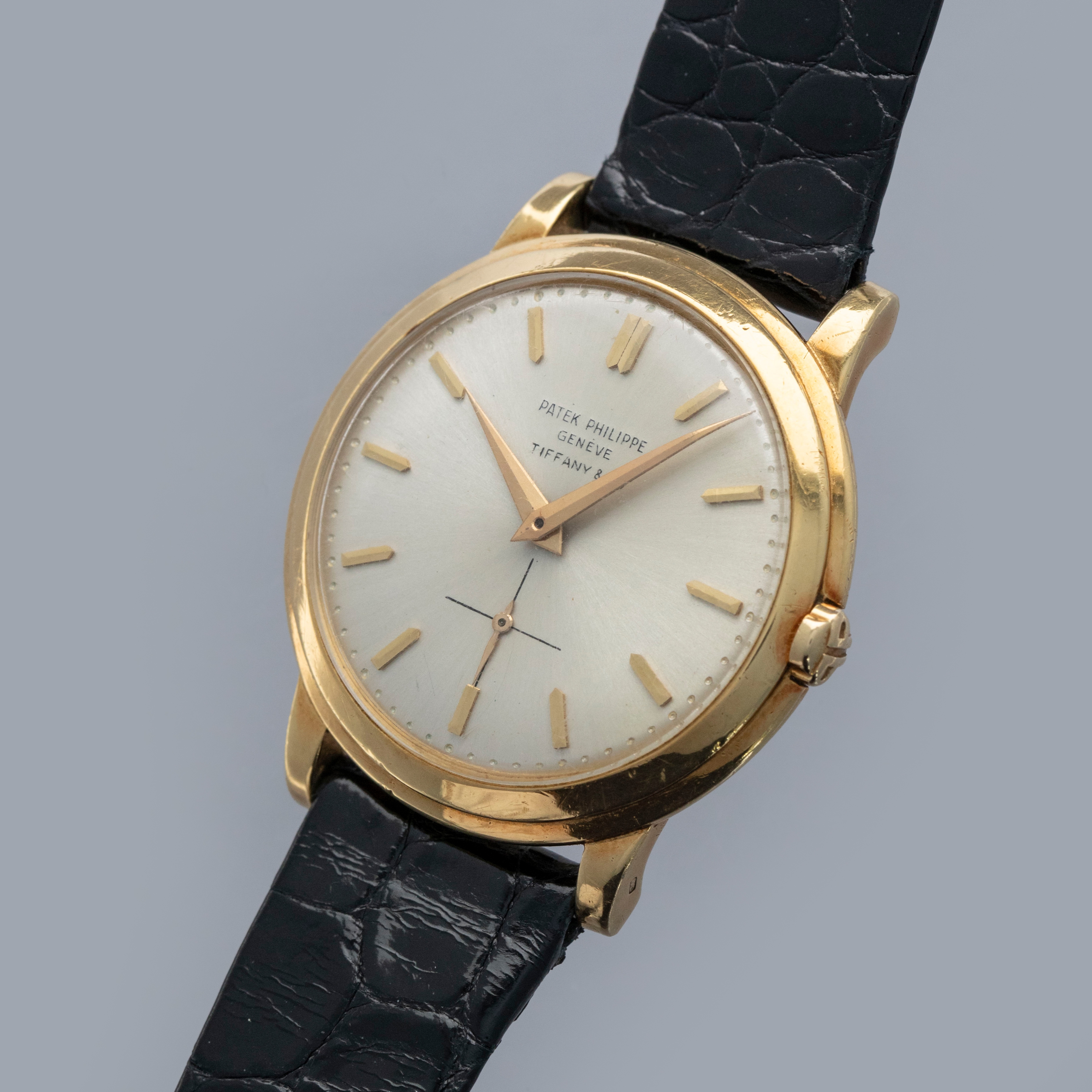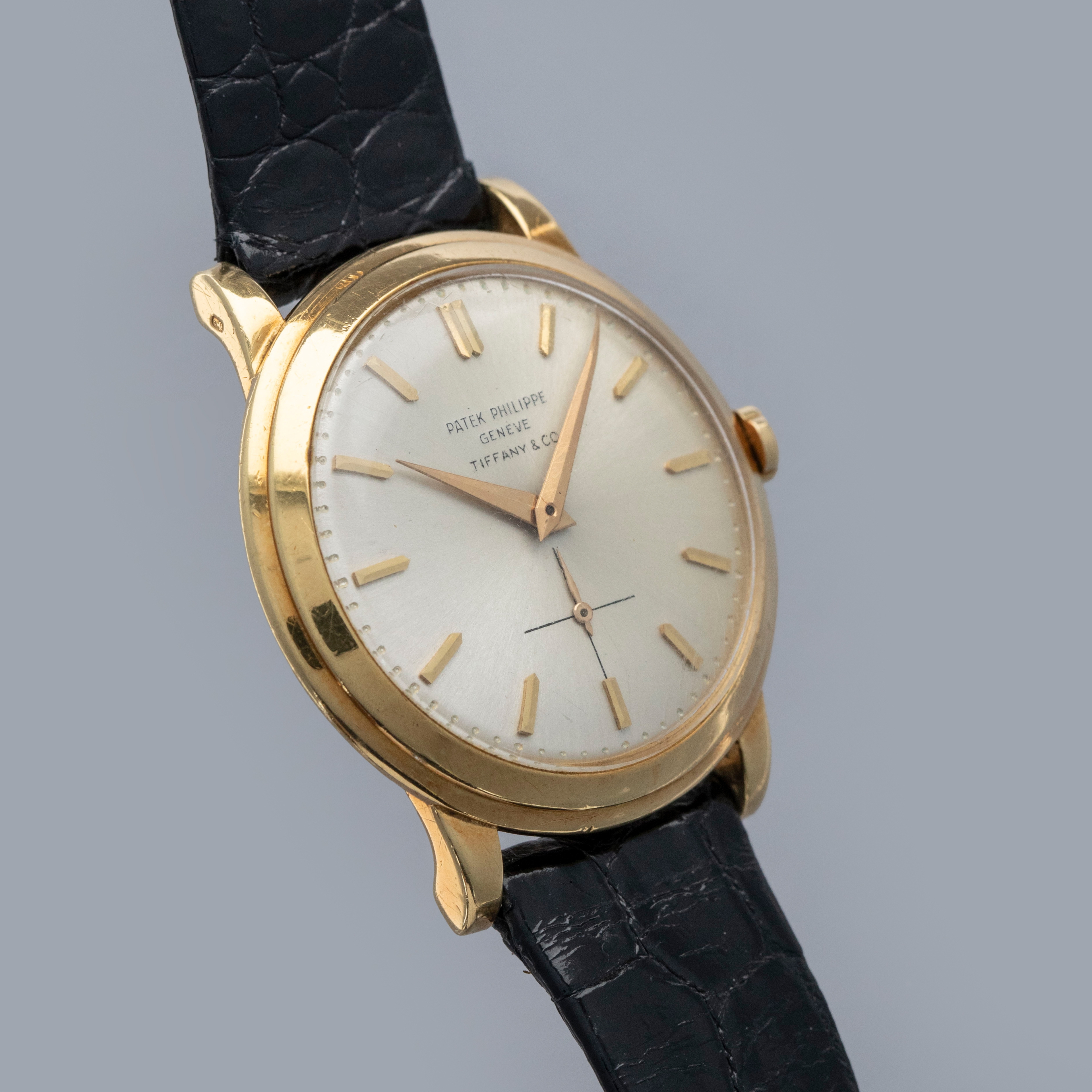 Watch is in overall excellent condition. The yellow gold case shows surface scratches and small nicks as expected of a watch of this vintage. The case back has one more noticeable scratch along with light surface scratches. The rear of the lower right lug bears a retailer stock number, while two hallmarks remain legible on the case sides. The dial shows minor surface marks and retains a strong signature and Tiffany & Co stamp. The crystal has a number of scratches. It is fitted with a black Patek alligator strap and yellow gold buckle, both in excellent condition. Please note that the watch ticks at time of cataloging, but timekeeping is poor and a service is recommended.