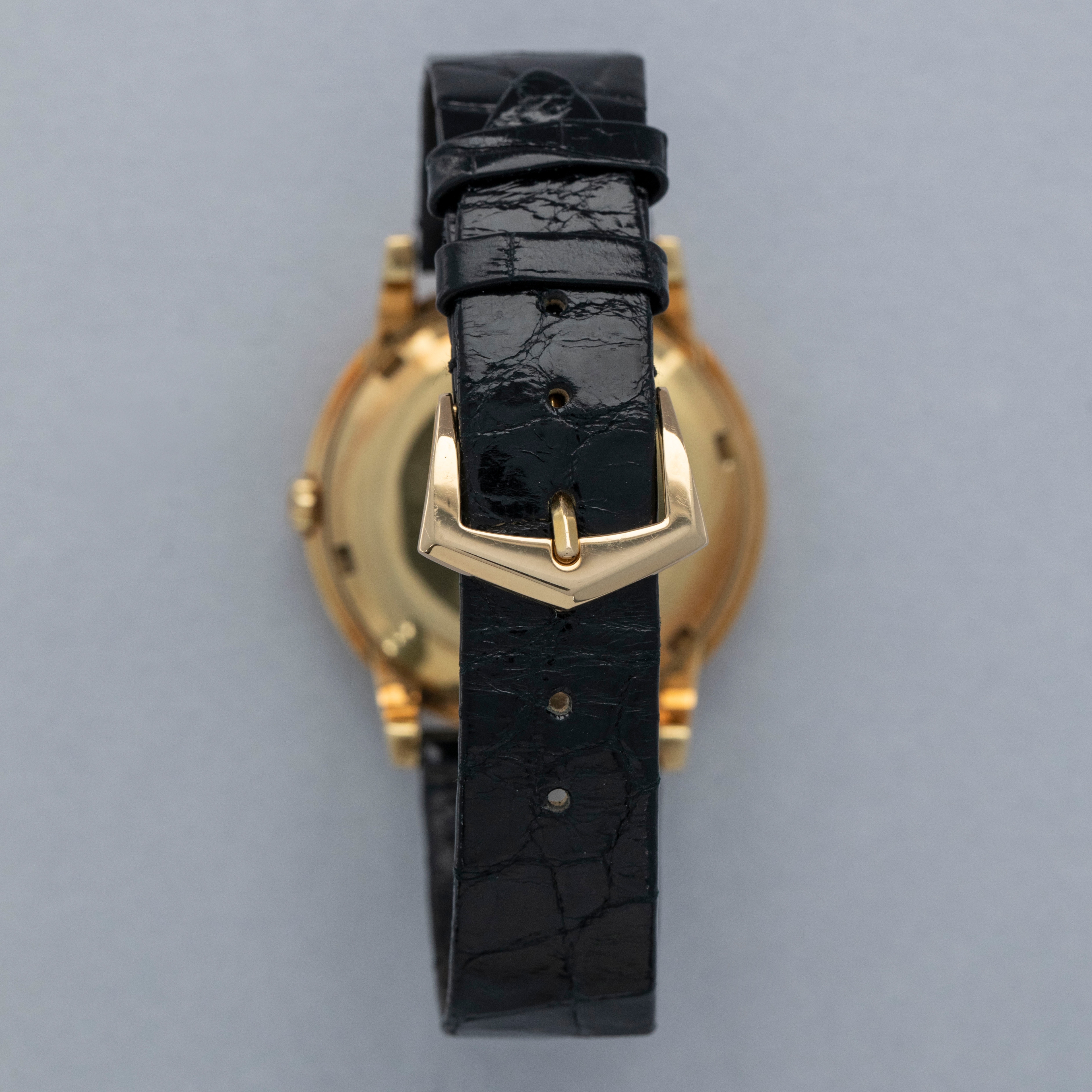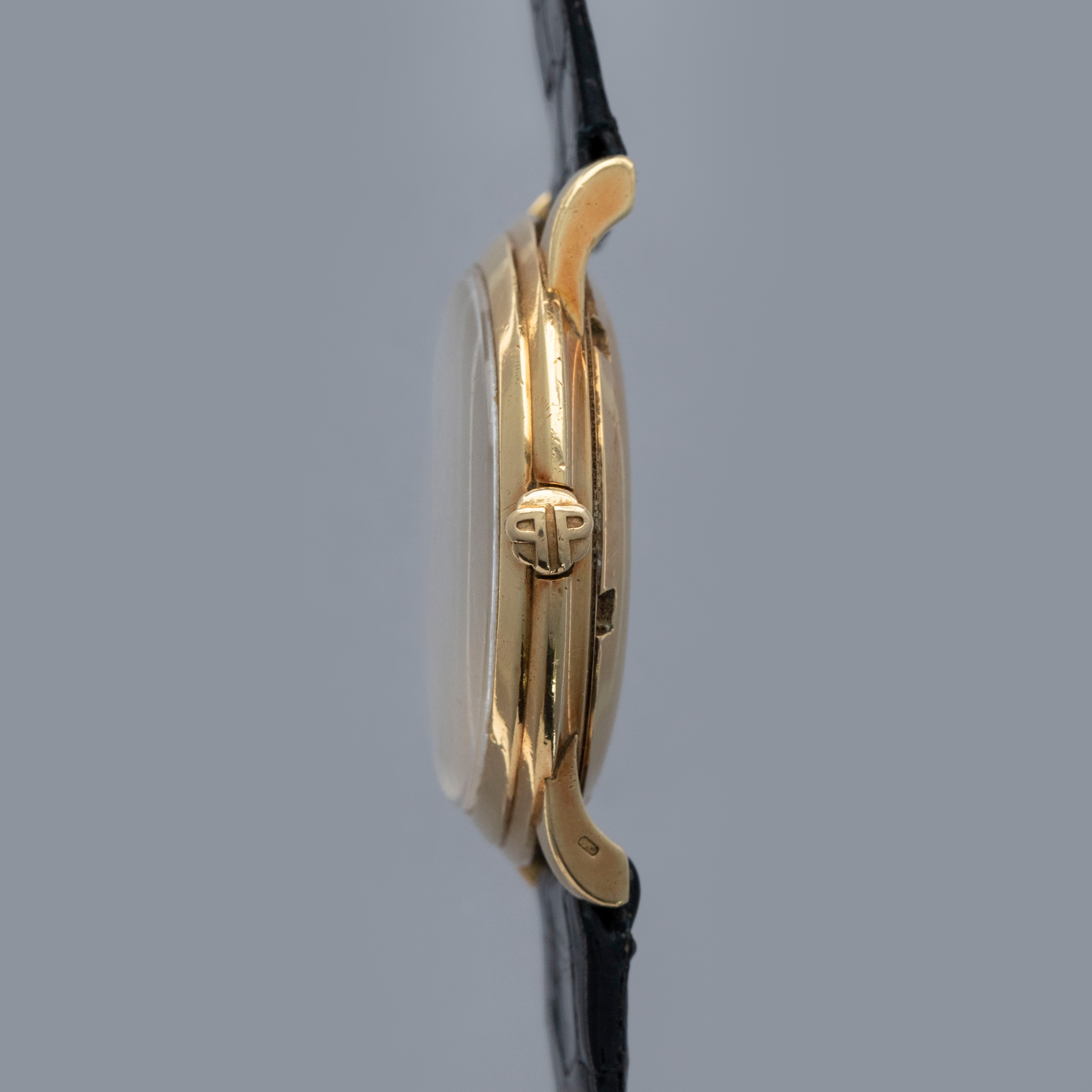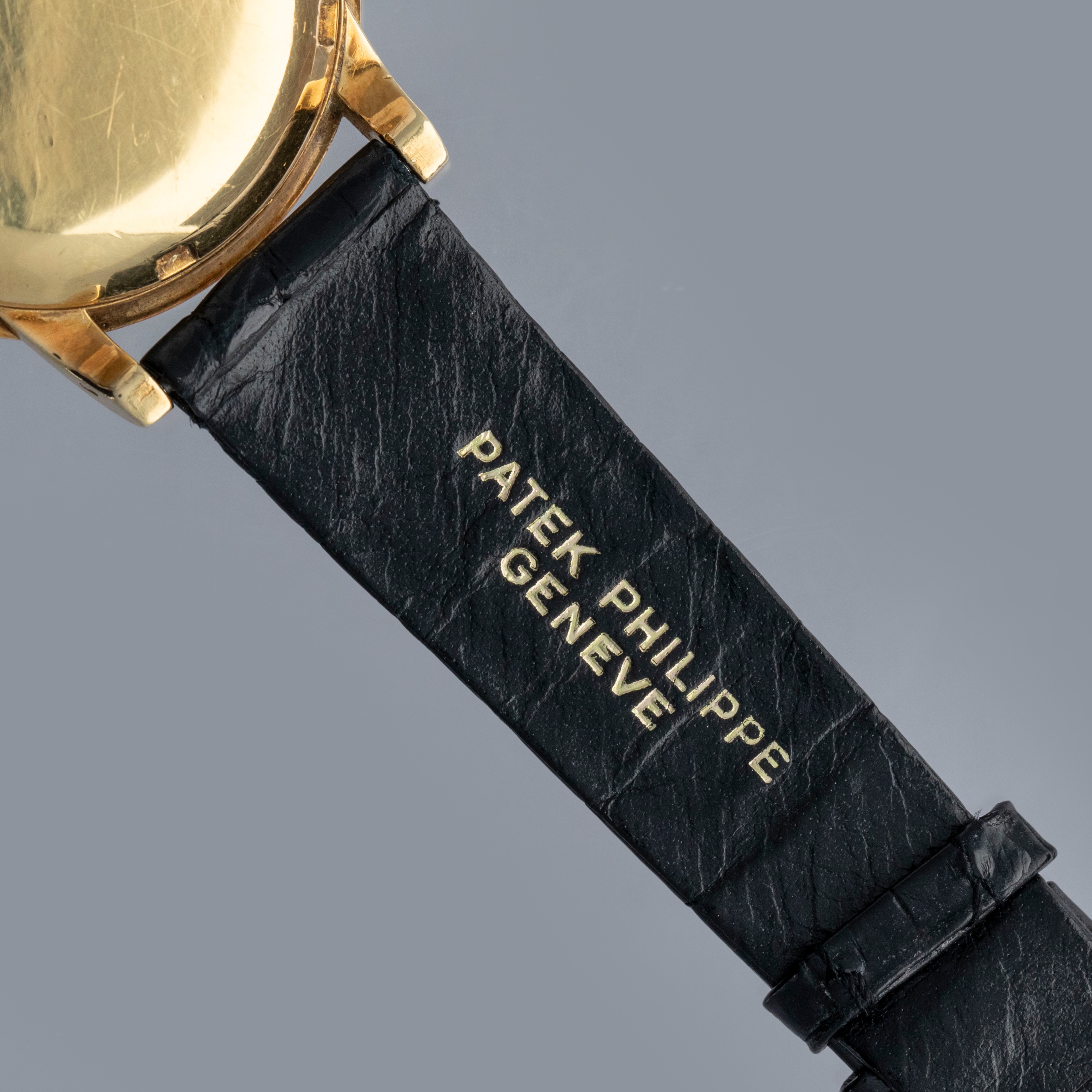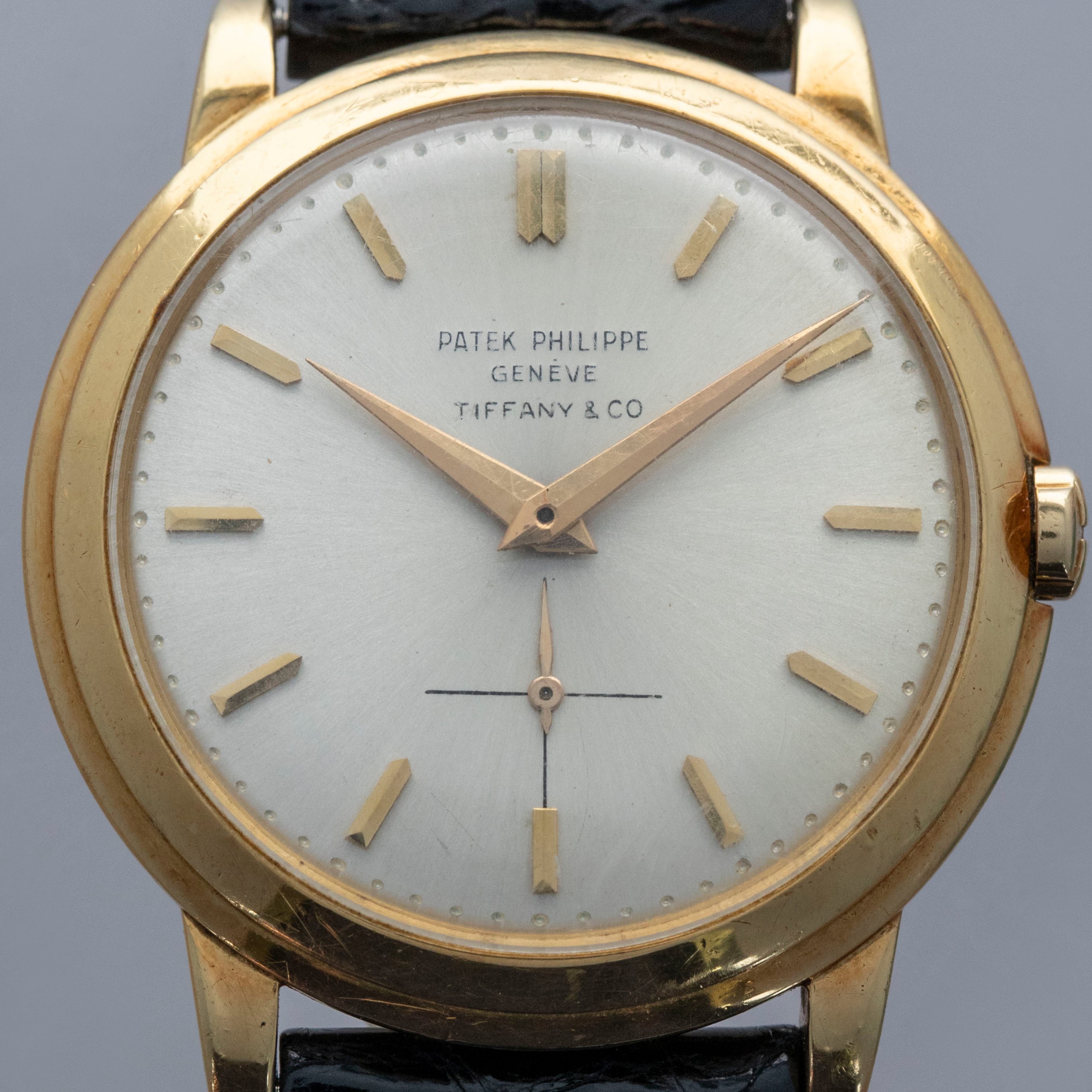 Watch is in overall excellent condition. The yellow gold case shows surface scratches and small nicks as expected of a watch of this vintage. The case back has one more noticeable scratch along with light surface scratches. The rear of the lower right lug bears a retailer stock number, while two hallmarks remain legible on the case sides. The dial shows minor surface marks and retains a strong signature and Tiffany & Co stamp. The crystal has a number of scratches. It is fitted with a black Patek alligator strap and yellow gold buckle, both in excellent condition. Please note that the watch ticks at time of cataloging, but timekeeping is poor and a service is recommended.