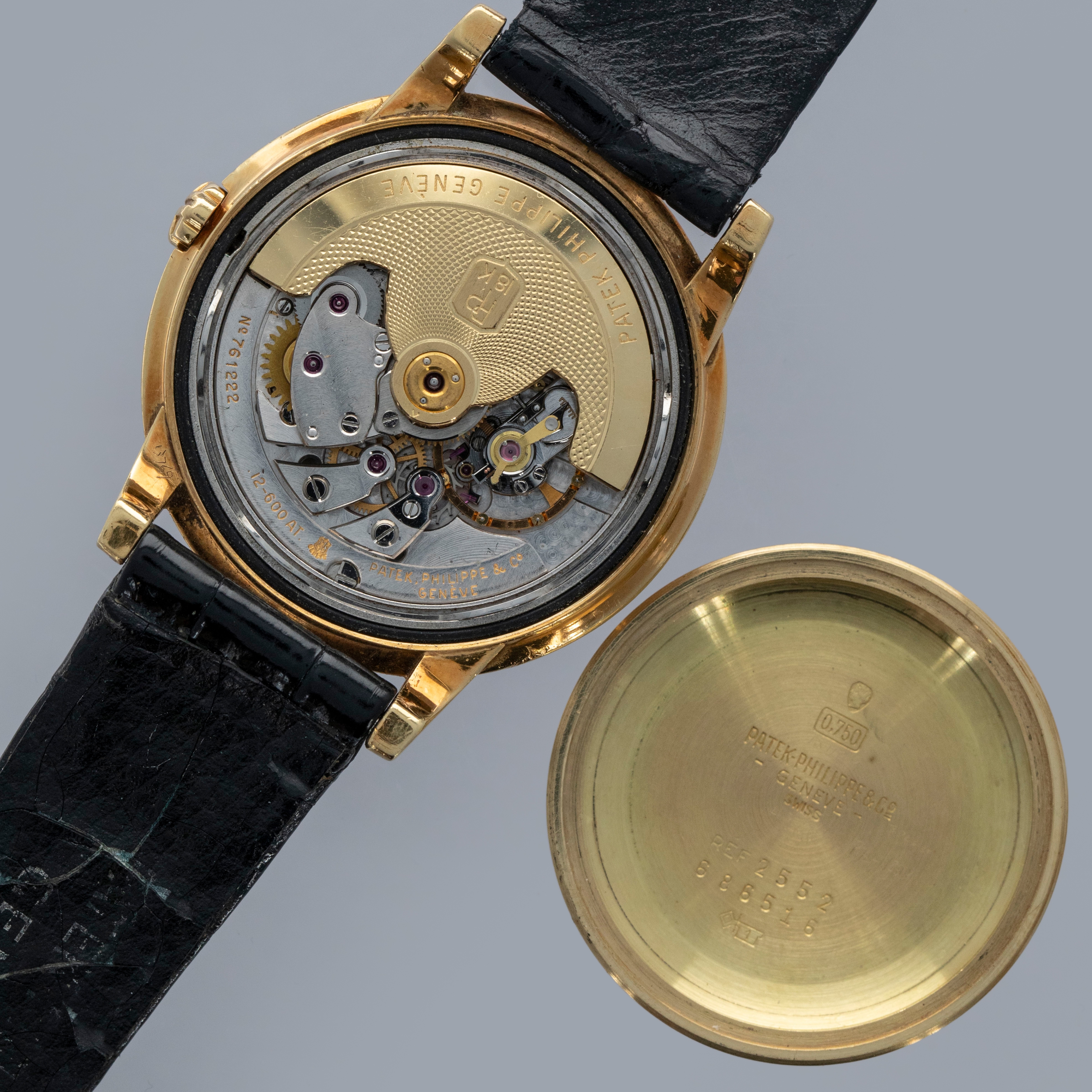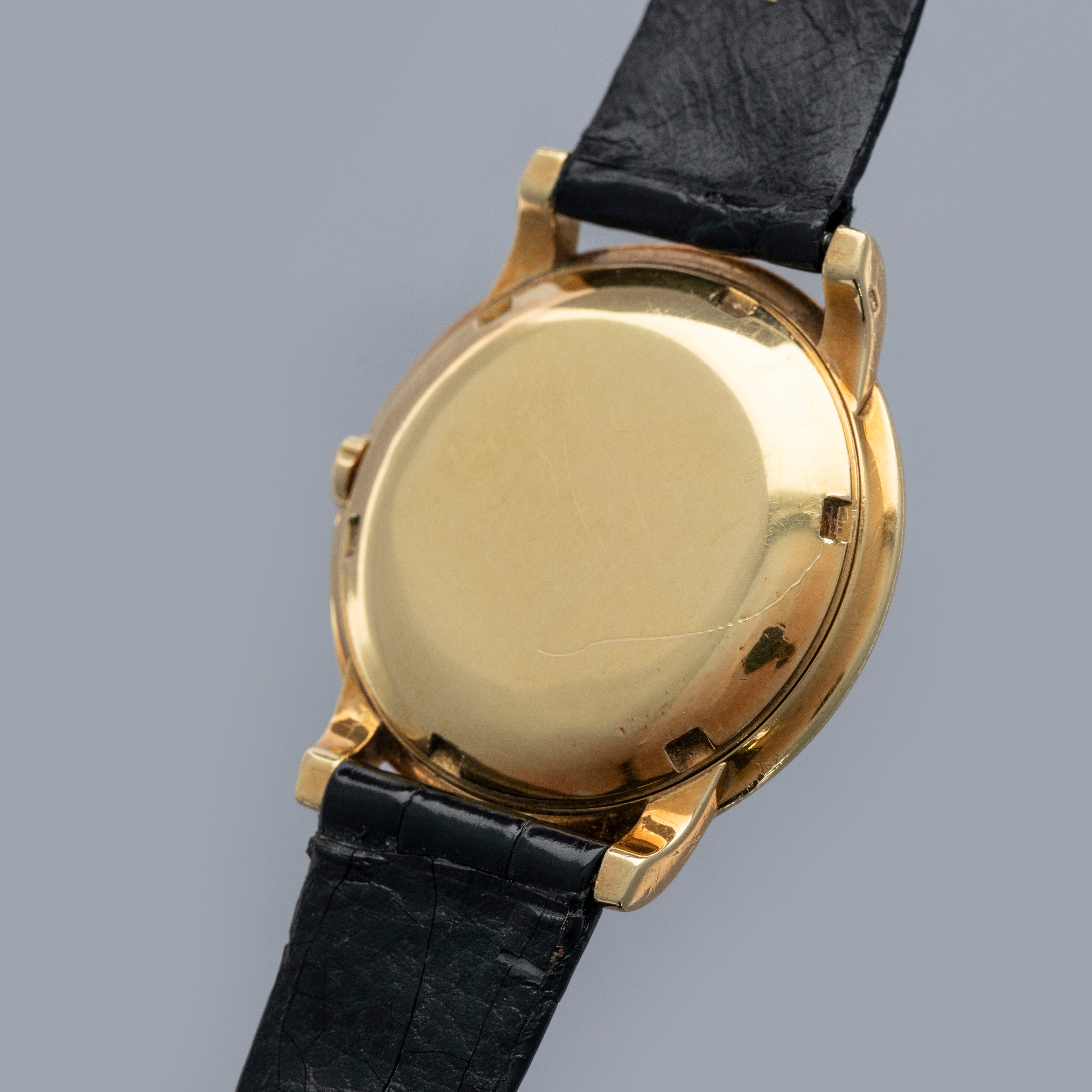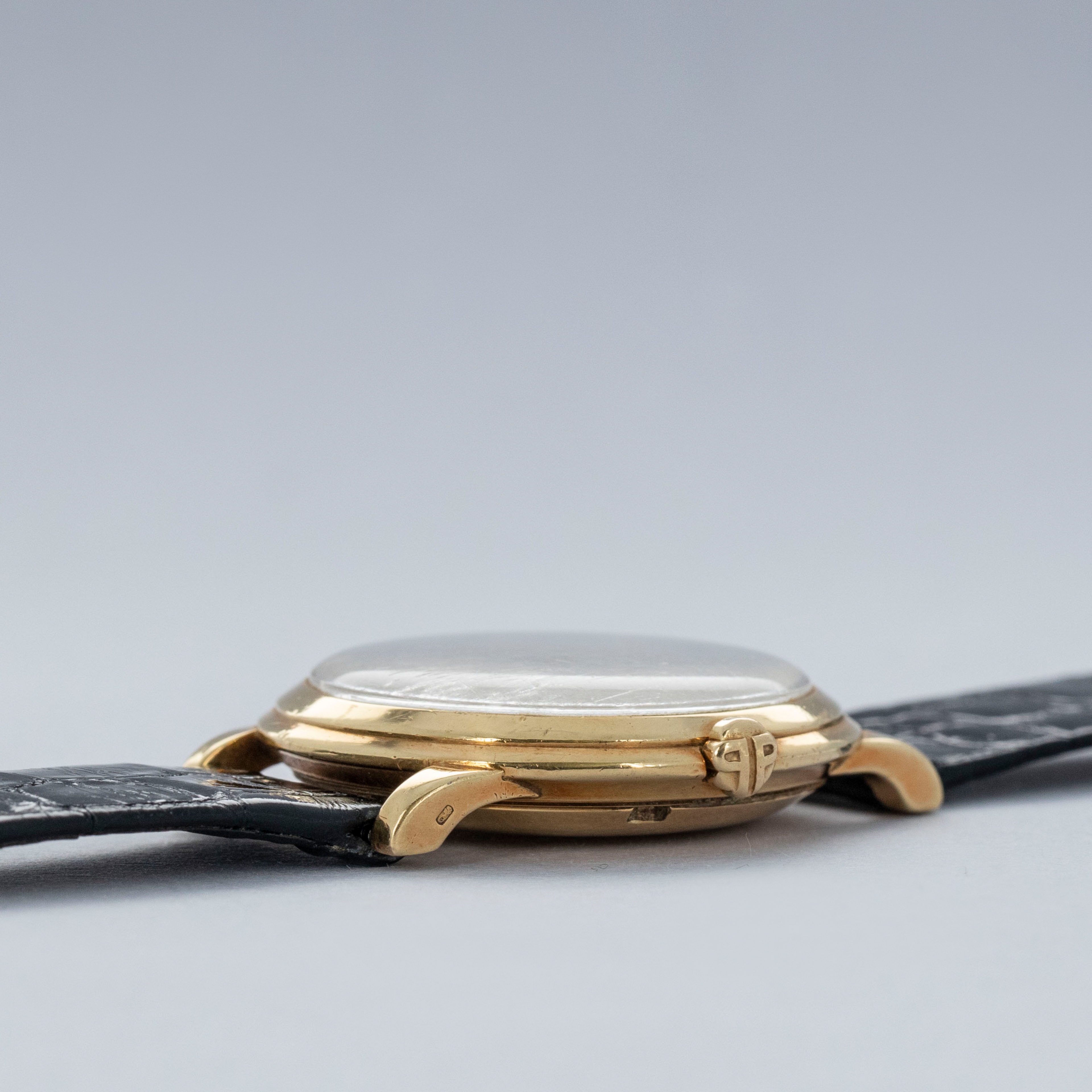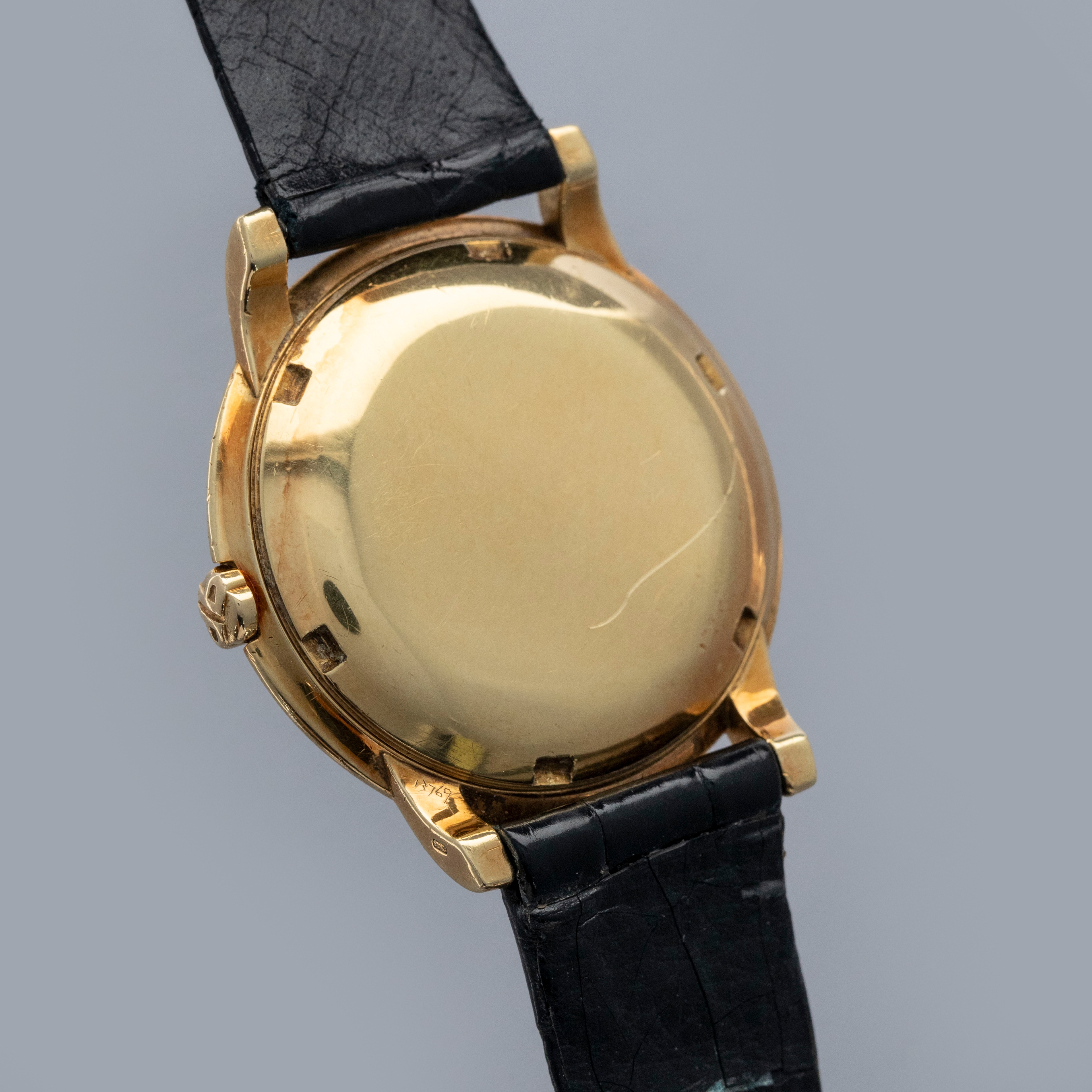 Watch is in overall excellent condition. The yellow gold case shows surface scratches and small nicks as expected of a watch of this vintage. The case back has one more noticeable scratch along with light surface scratches. The rear of the lower right lug bears a retailer stock number, while two hallmarks remain legible on the case sides. The dial shows minor surface marks and retains a strong signature and Tiffany & Co stamp. The crystal has a number of scratches. It is fitted with a black Patek alligator strap and yellow gold buckle, both in excellent condition. Please note that the watch ticks at time of cataloging, but timekeeping is poor and a service is recommended.