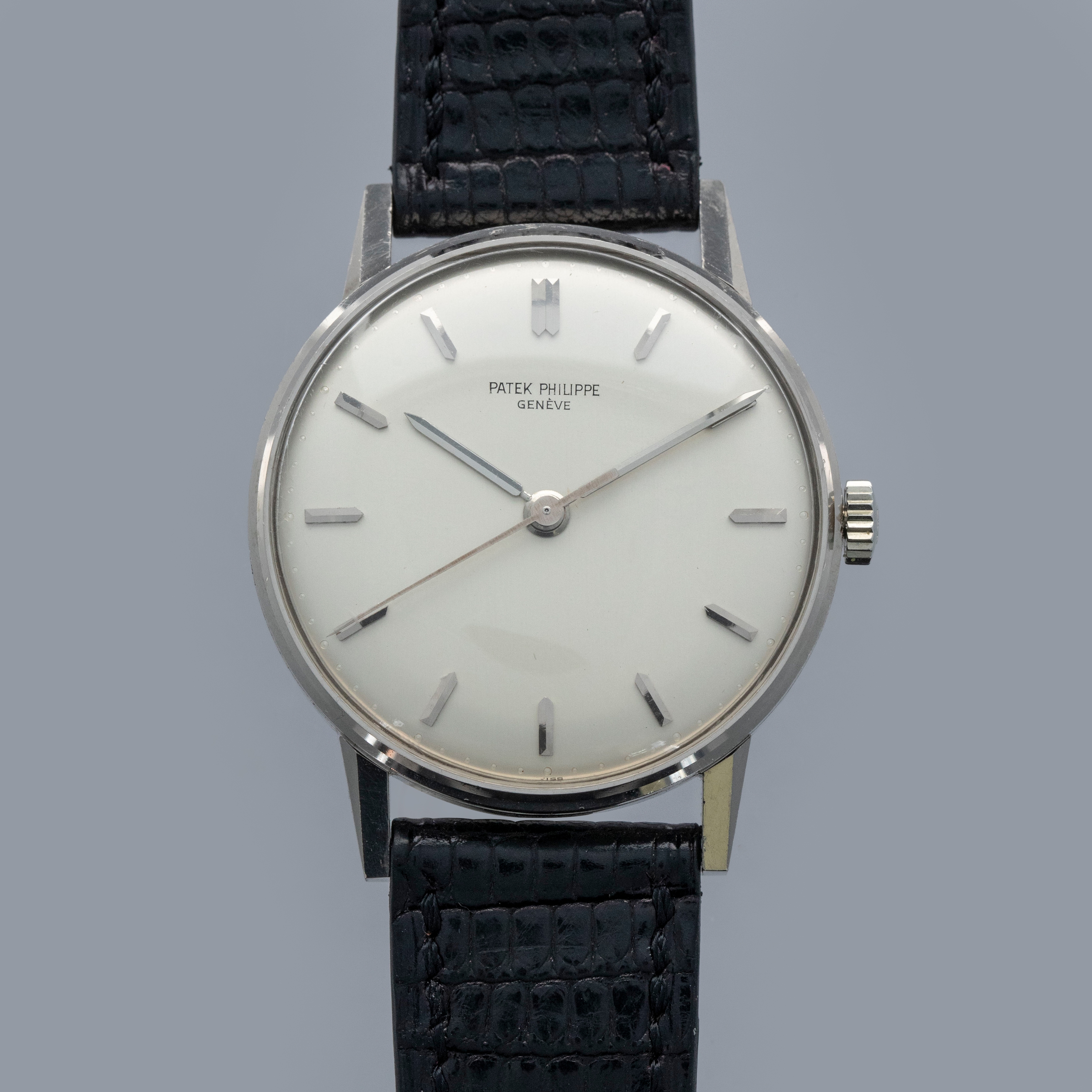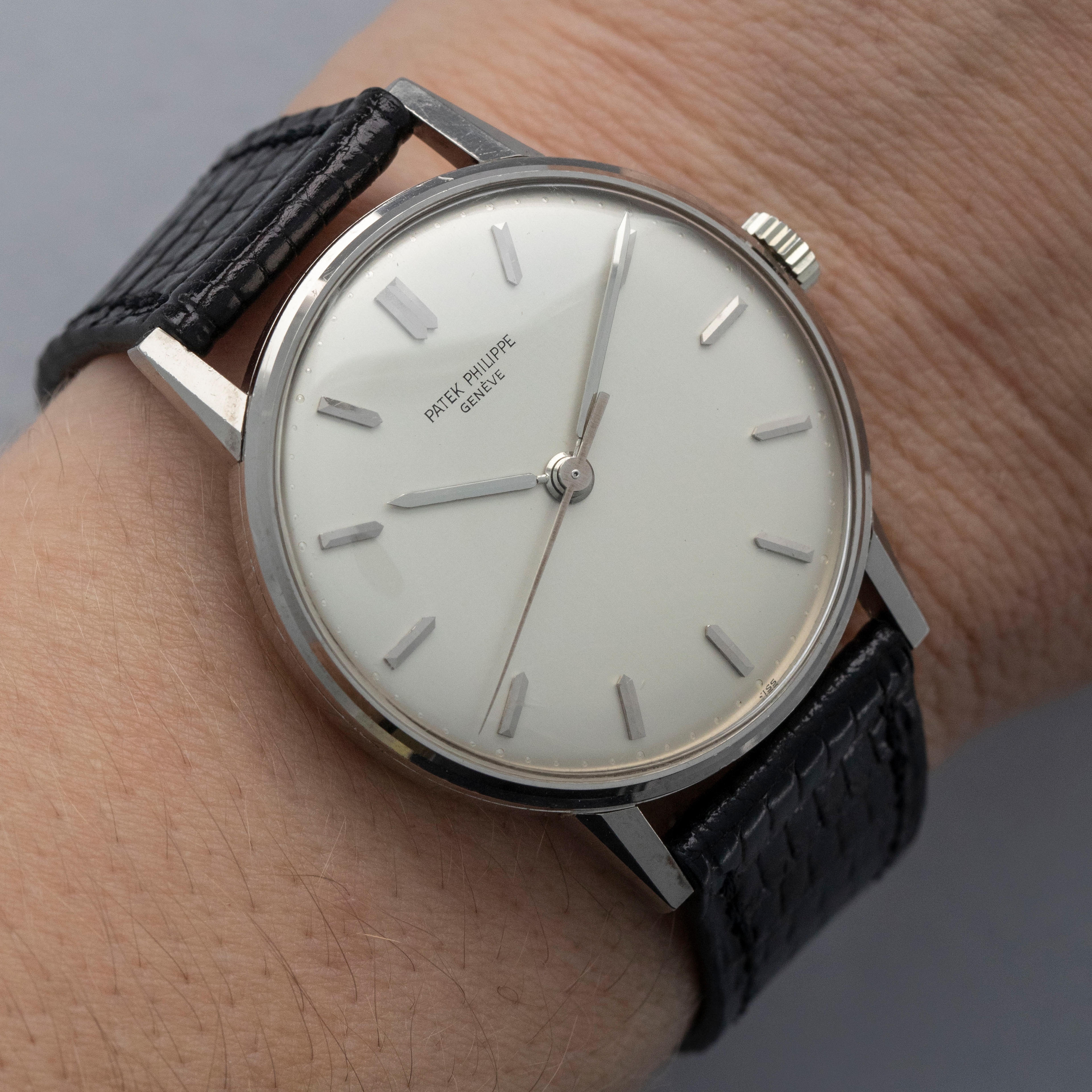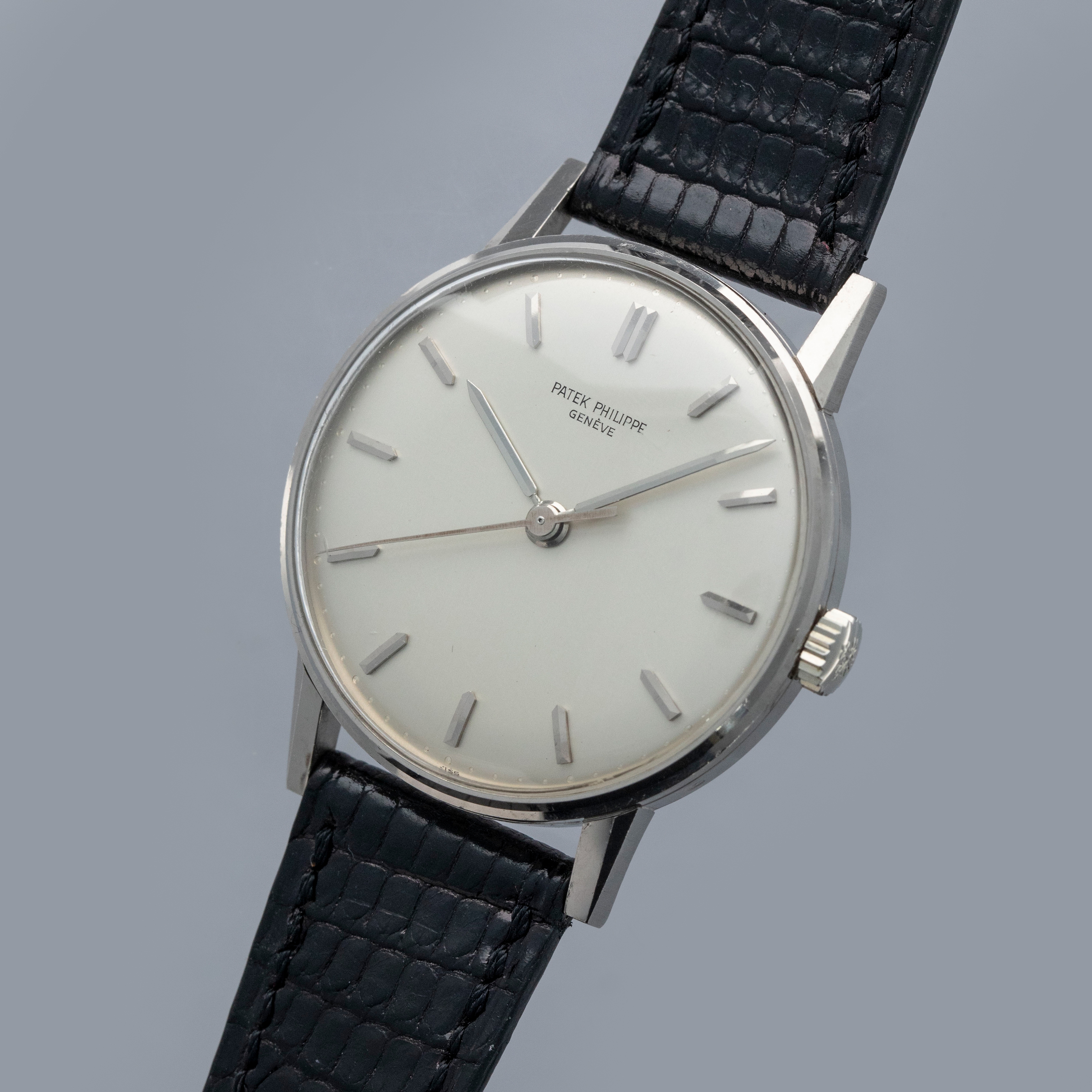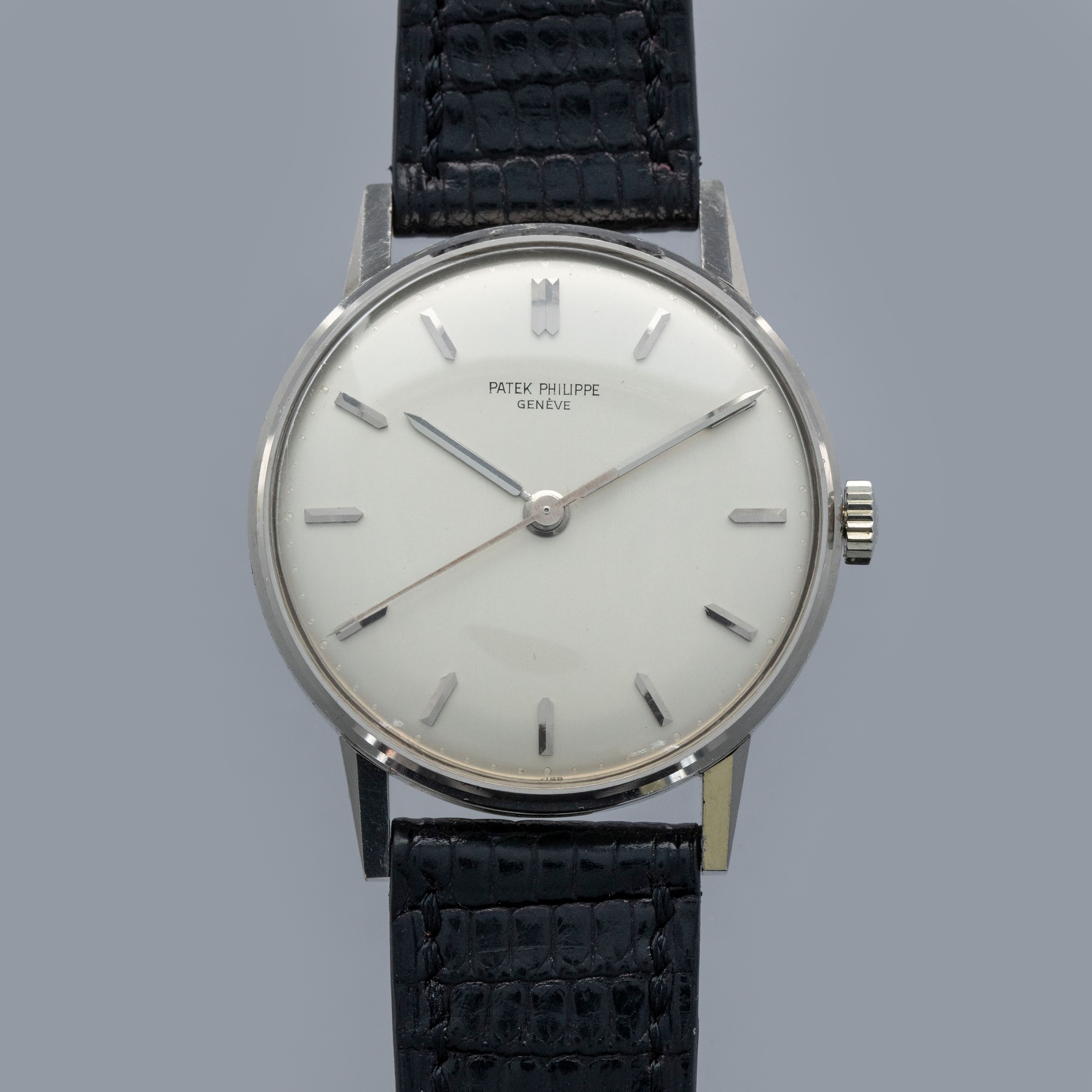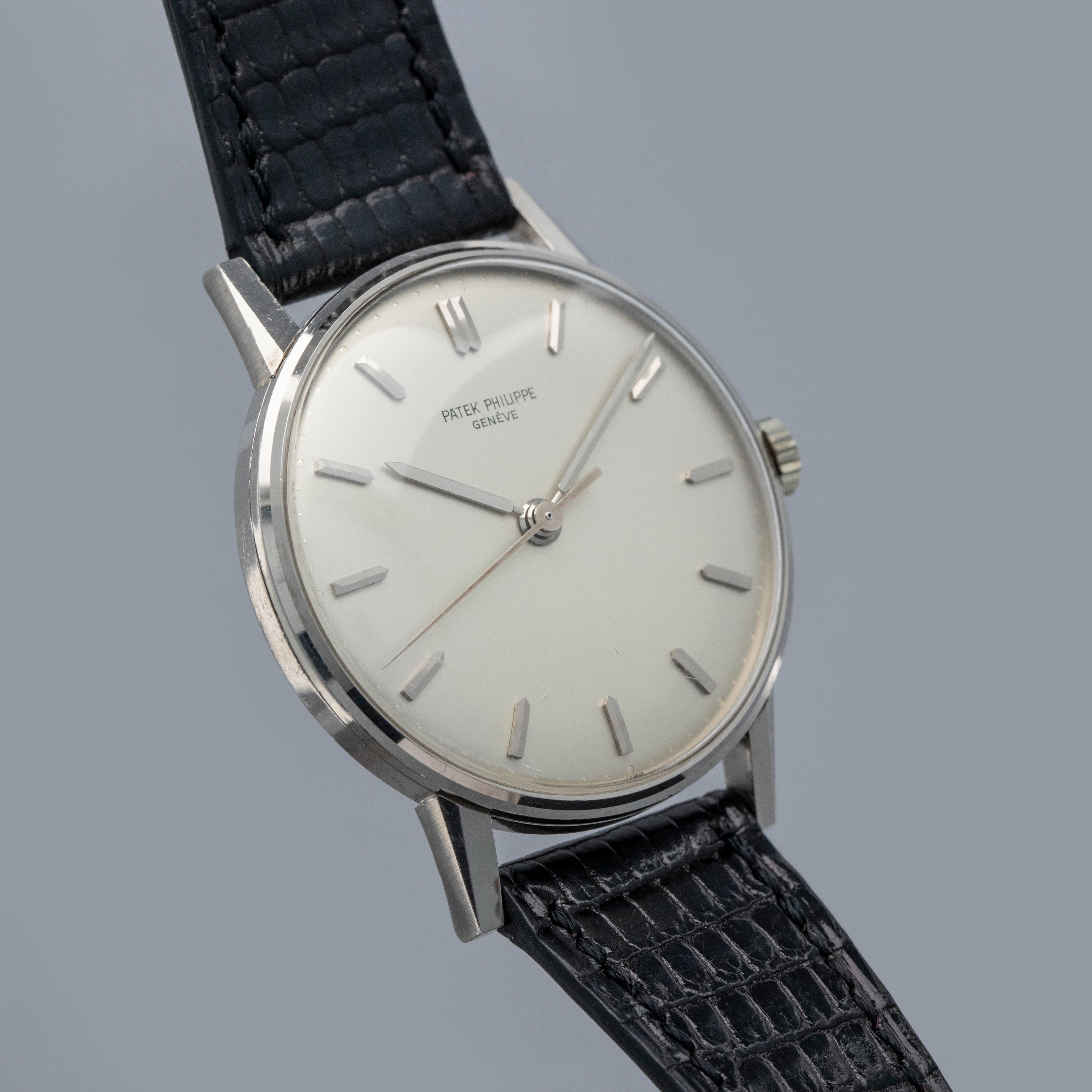 Easily situated amongst the most iconic dress watches ever, the Patek Philippe Calatrava embodies the very essence of what a classically-styled timepiece should look like. Defining the entire market niche in 1932 when it debuted, the Calatrava has become the foundation of Patek Philippe’s elegant offerings, with the collection growing to include a multitude of references of various designs across a variety of dials, materials, complications and more. Offered here we have the Calatrava ref. 3411 which was launched in 1959 and produced for about a decade during some of the Calatrava collection's most formative years within the modern watchmaking era as the Calatrava earned its reputation as Patek Philippe’s premier dress watch. Boasting Patek's esteemed design language, the ref. 3411 features a 34.5mm 18kt white gold case with plenty of polished surfaces, a concave bezel, sharp angular lugs and a gorgeous silver dial that houses thin sword-shaped hands and applied sword-shaped indices for a minimalist aesthetic. An exercise in minimalism, as per the Calatrava’s Bauhaus-inspired design language, the Calatrava’s clean aesthetic has been the bedrock of its offering for decades, on which the ref. 3411 builds upon.