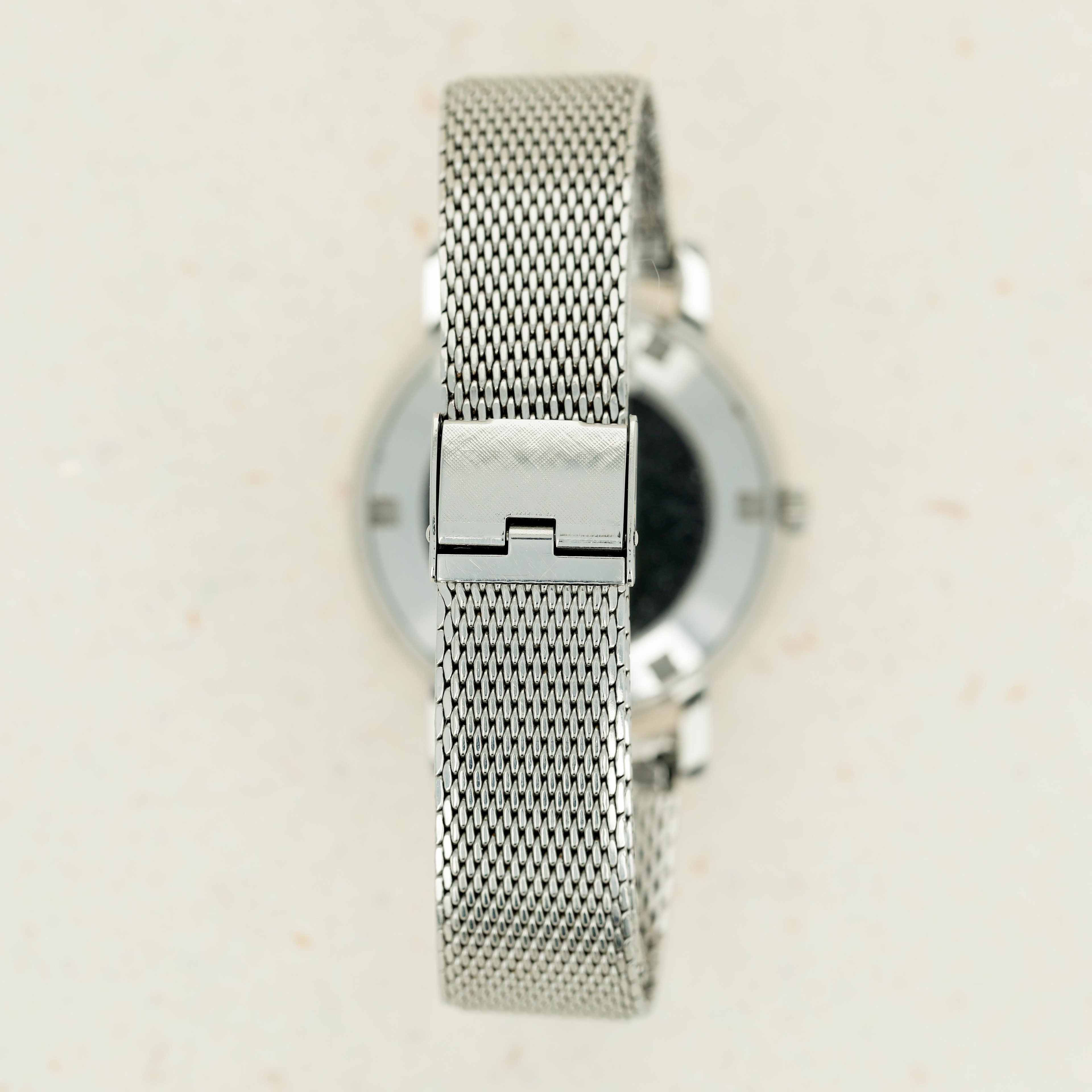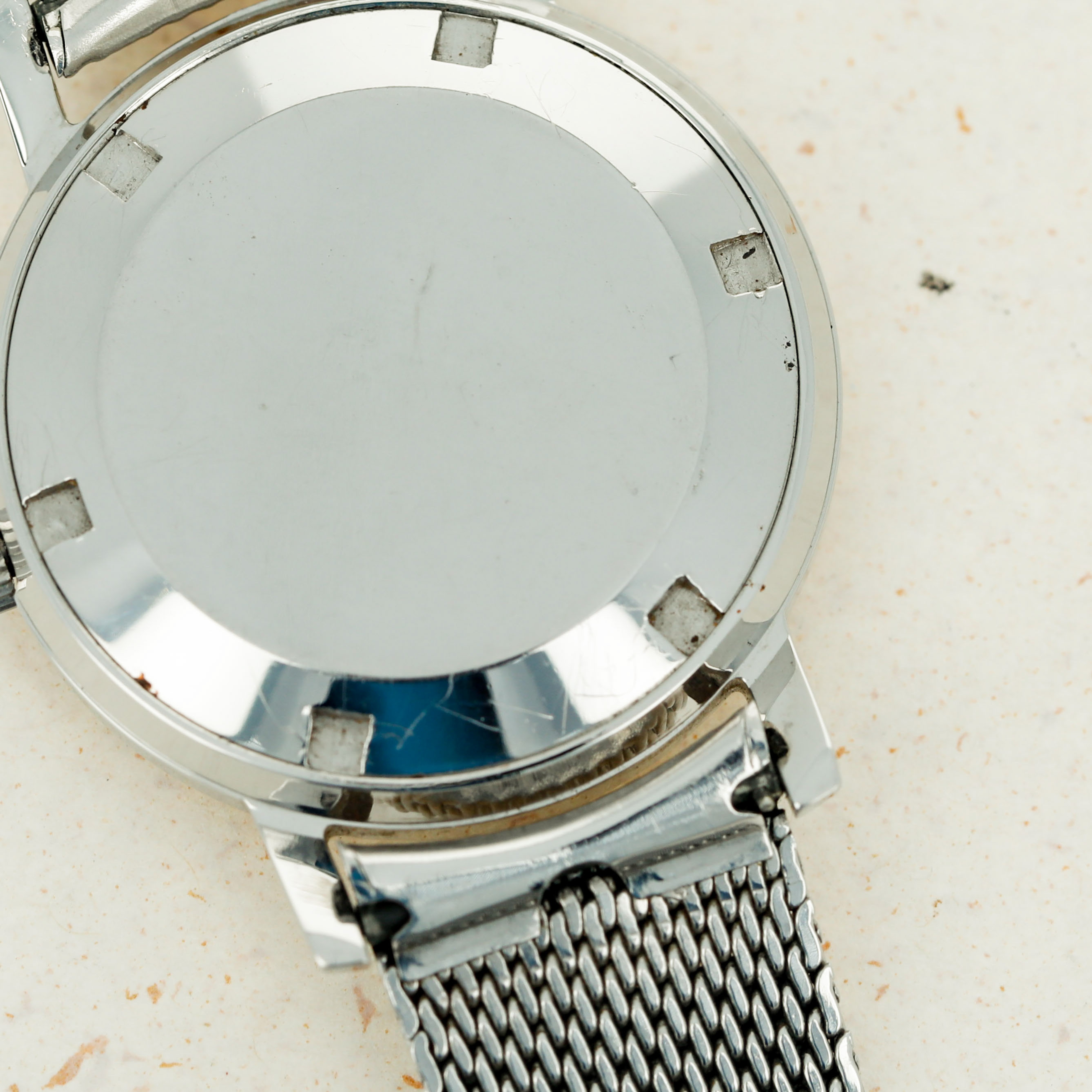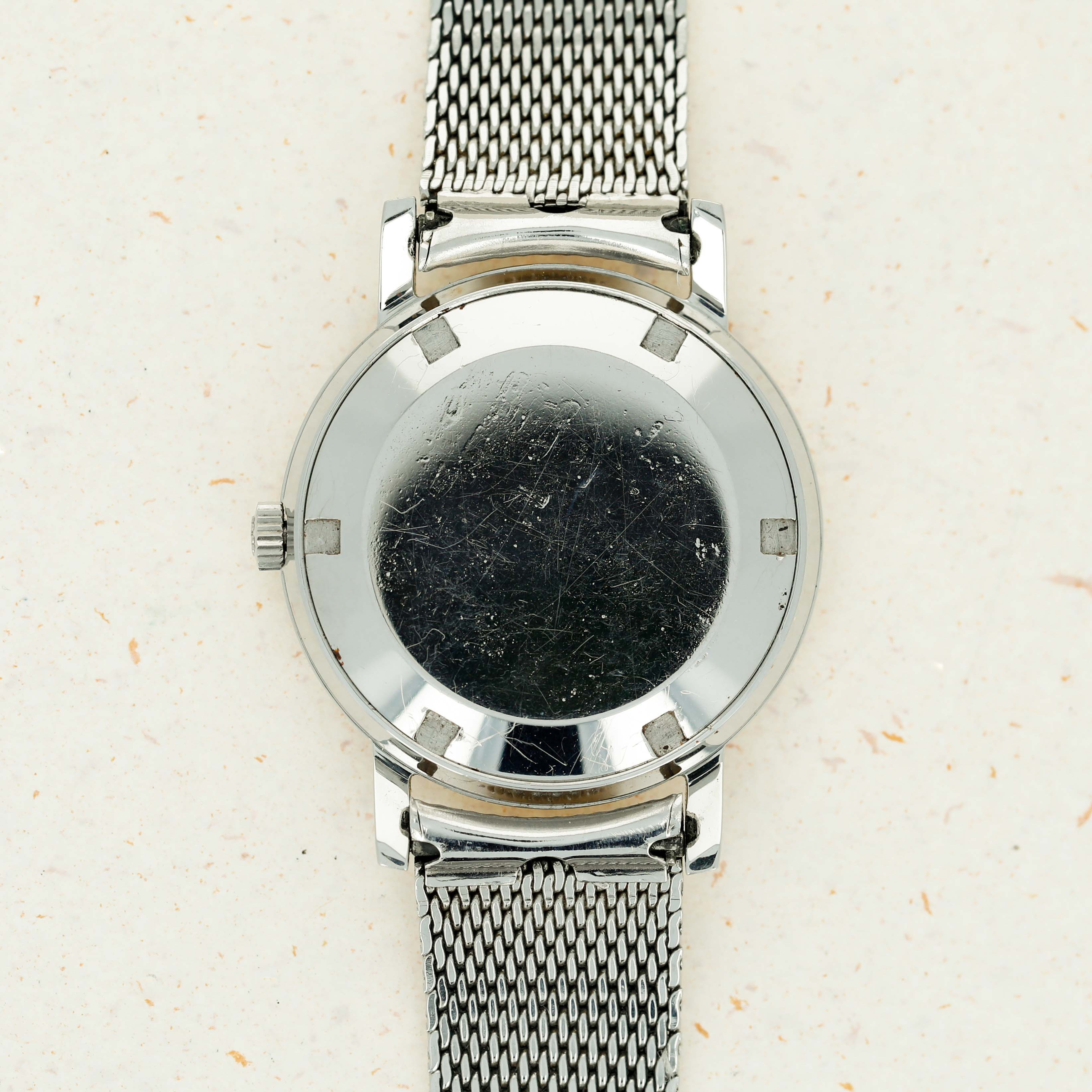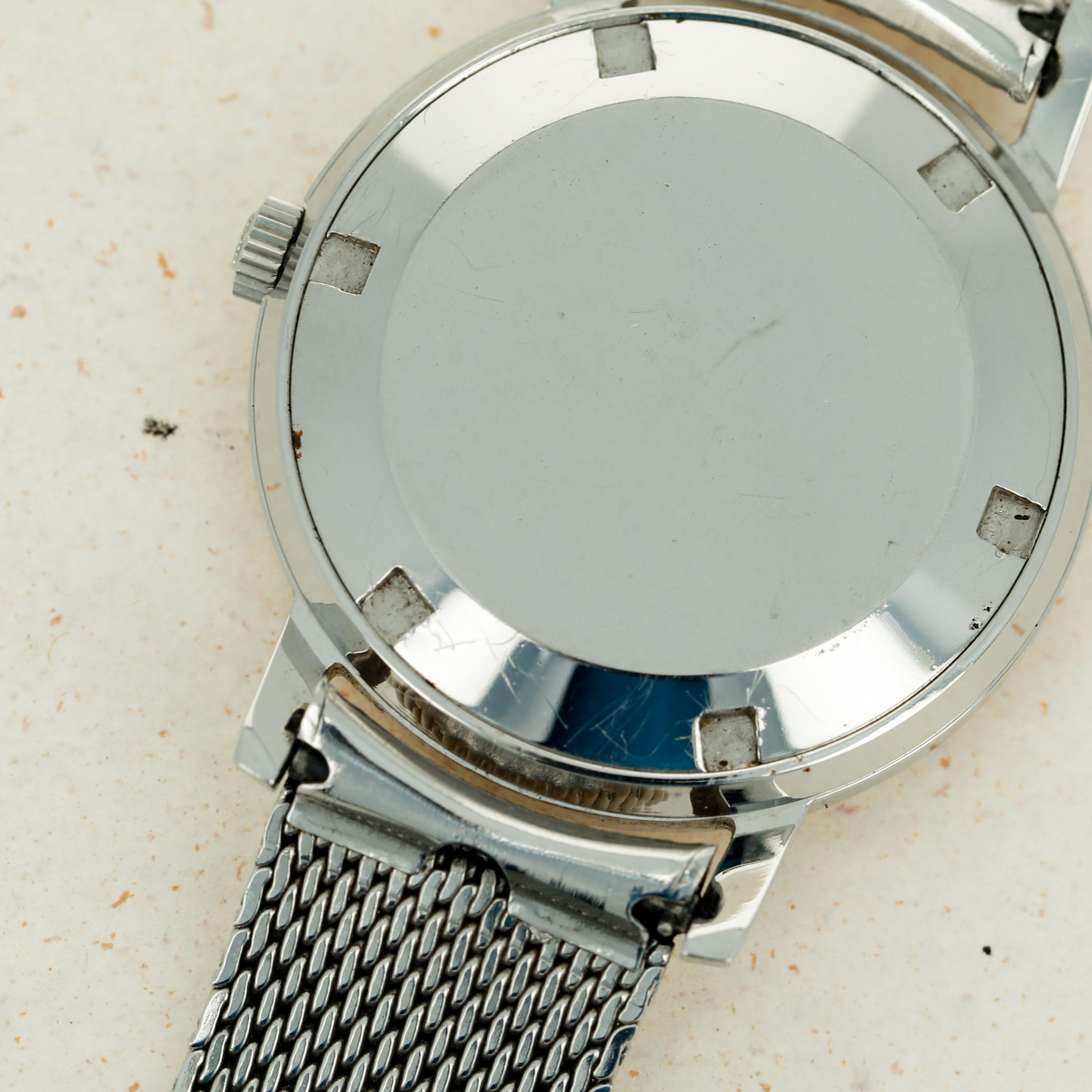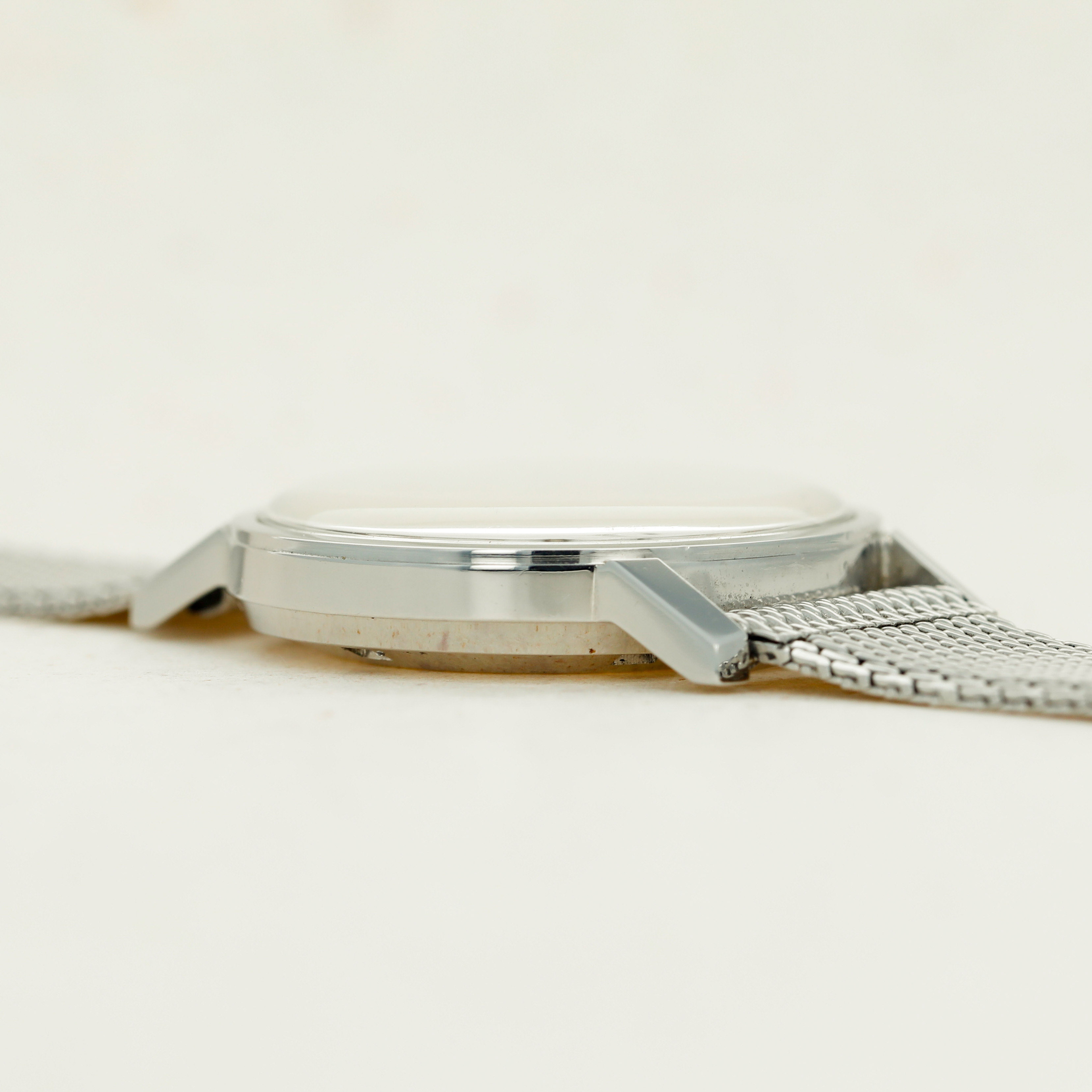 Watch is in excellent overall condition. Case has minor wear visible along the surface. Caseback has some scratches visible along the curved edge and around the recessed key areas. There is very minor oxidation visible in some areas along the caseback edge. The original dial in excellent overall condition, with some very minor marks visible and with some oxidation on the applied hour indexes. The watch comes on an aftermarket steel bracelet.