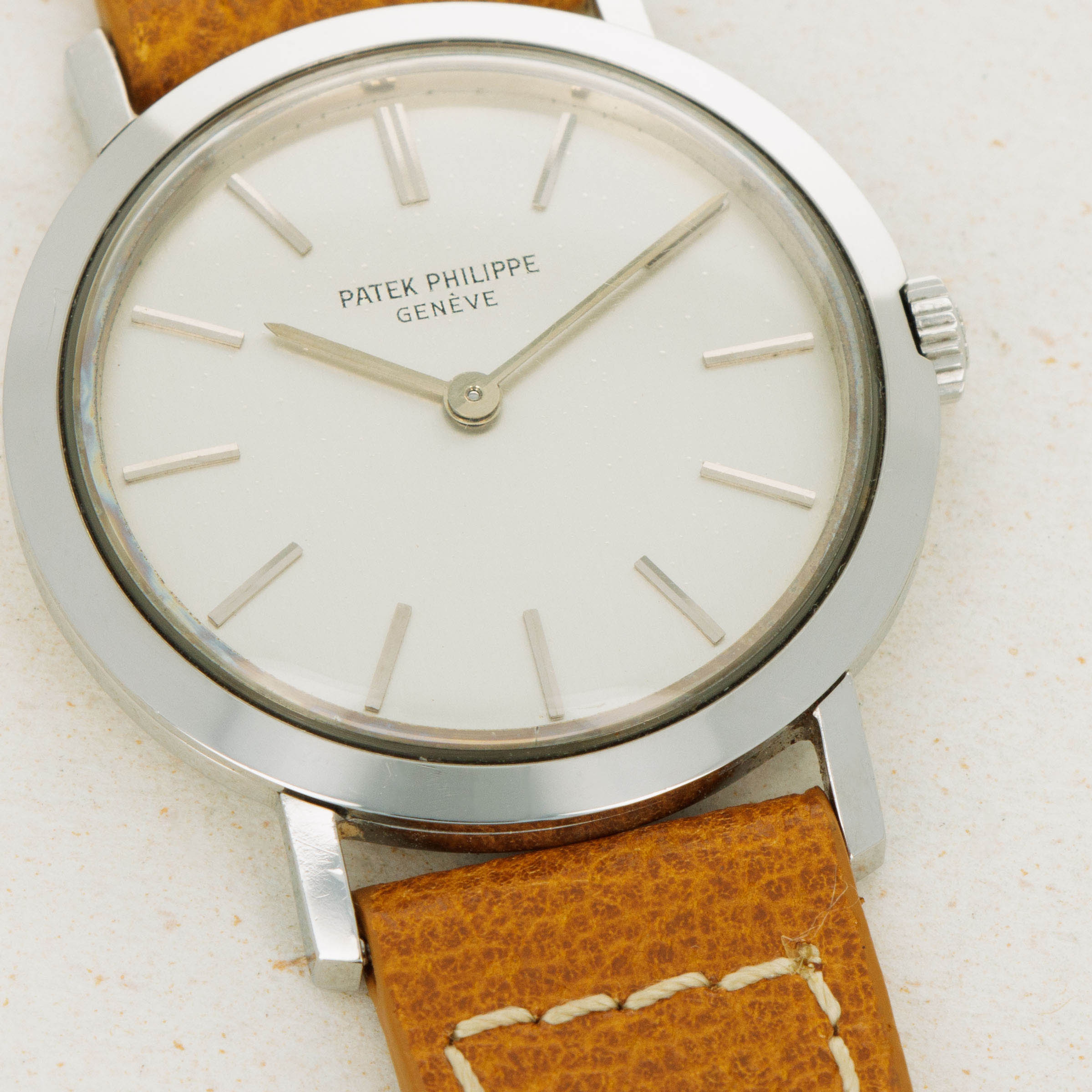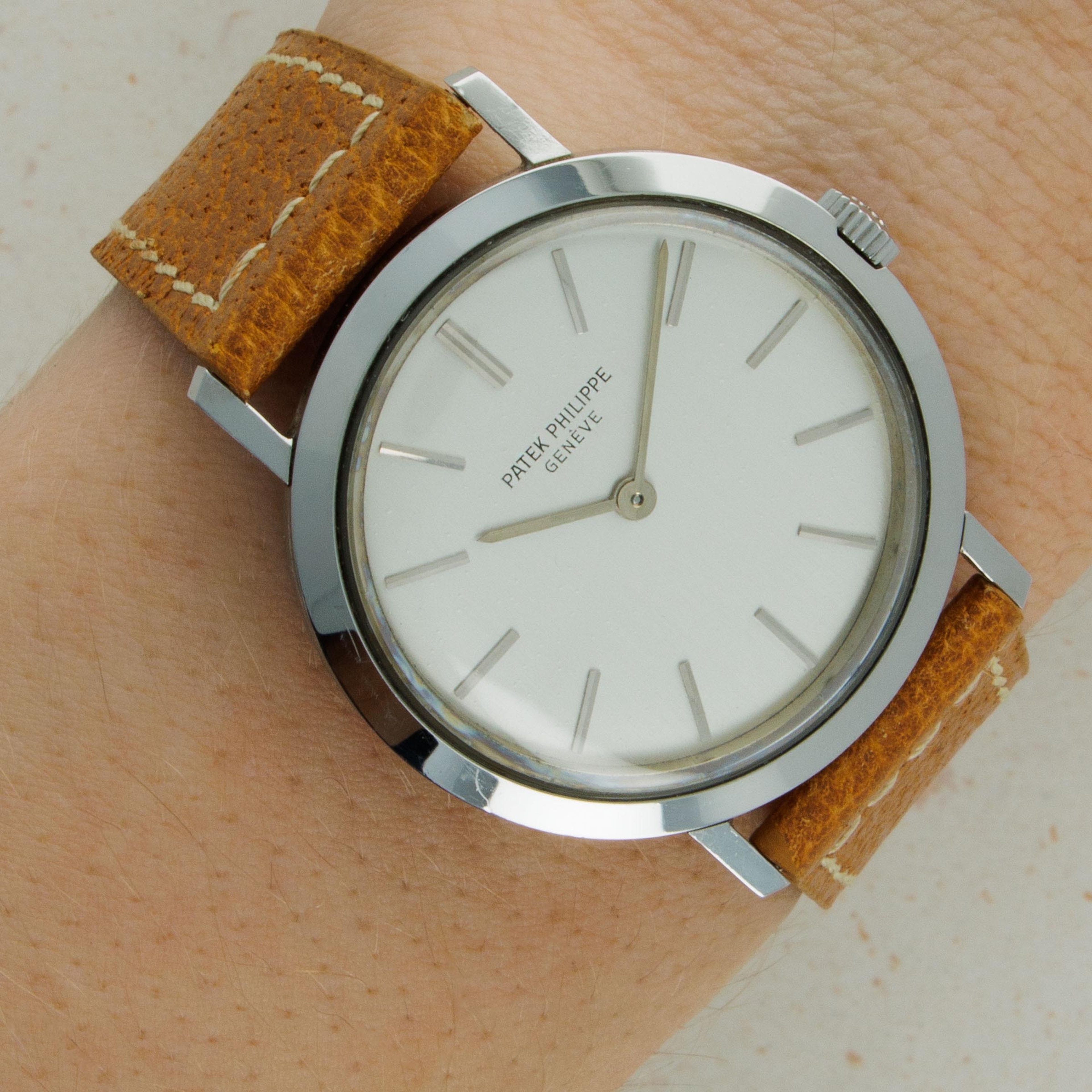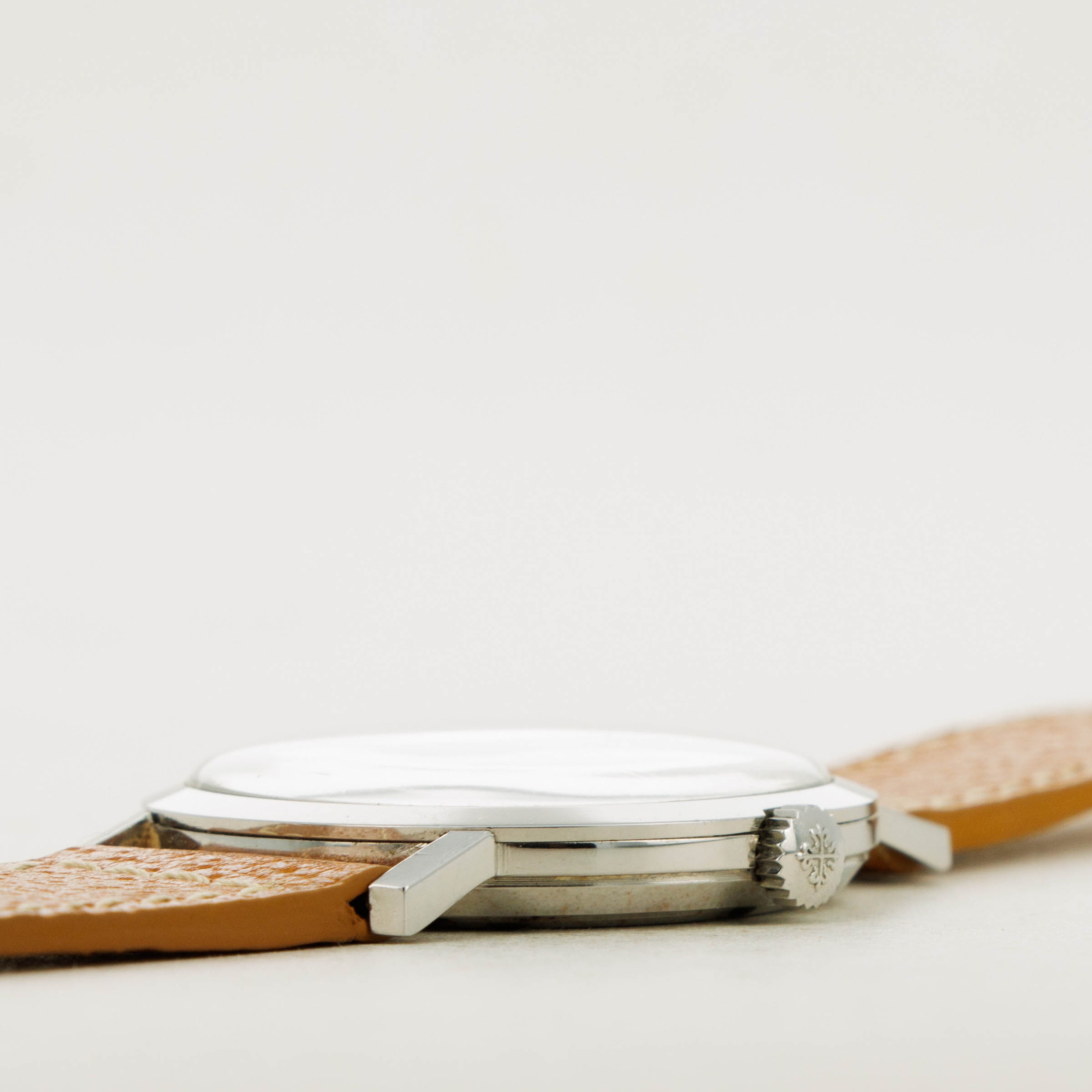Famed for their luxurious take on horology and all of its facets, Patek Philippe seldom constructs their cases from metals that are not precious, like gold or platinum. As such, stainless steel examples of Patek Philippe’s timepieces are inherently rare, sought-after, and unusual. Offered here, we have one of those very timepieces, the Calatrava ref. 3509 made from stainless steel. Contrasting the Calatrava’s elegant dress watch persona, the ref. 3509 has become legendary due to its position as one of the very few stainless steel vintage Patek Philippe references. Combined with its stainless steel construction, the ref. 3509 is also sought-after due to screw-down caseback, which was an impressive departure from Patek’s more common snap-on casebacks. Featuring a manual-wind movement and a simple silver dial with applied indices and sword-shaped hands, the ref. 3509 seems right at home in today’s horological landscape, with its beautiful classically styled dial serving as a reminder of the time from which it has come.