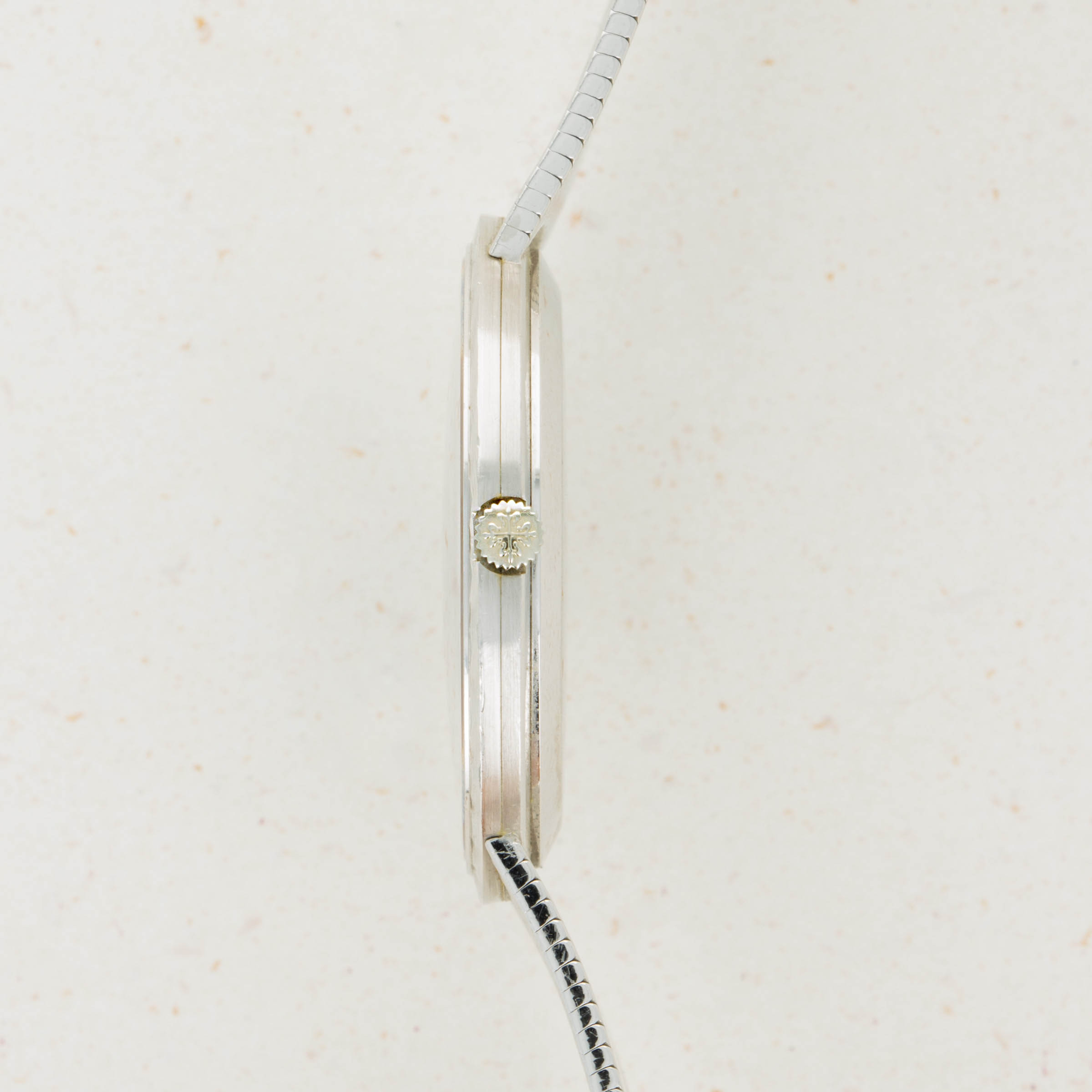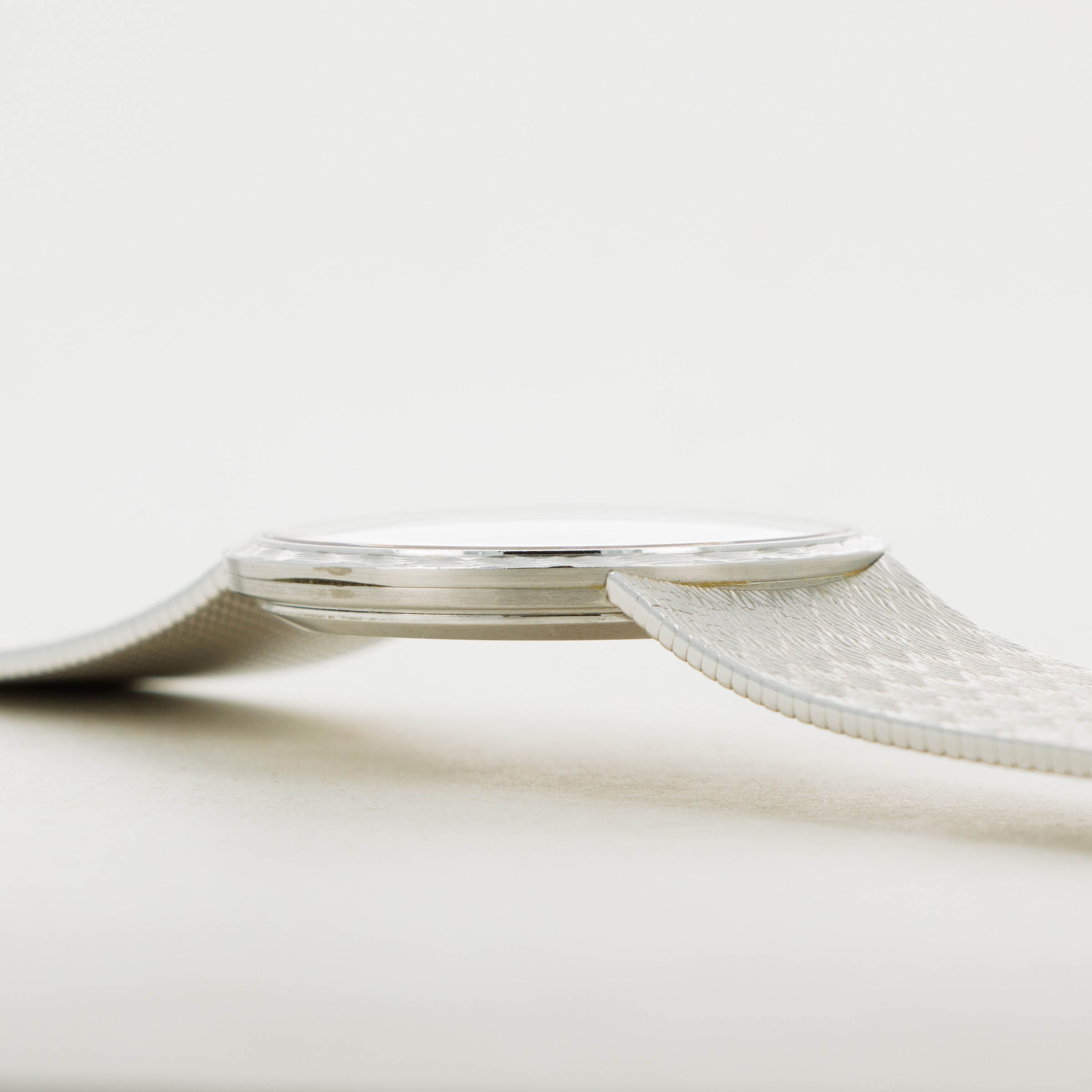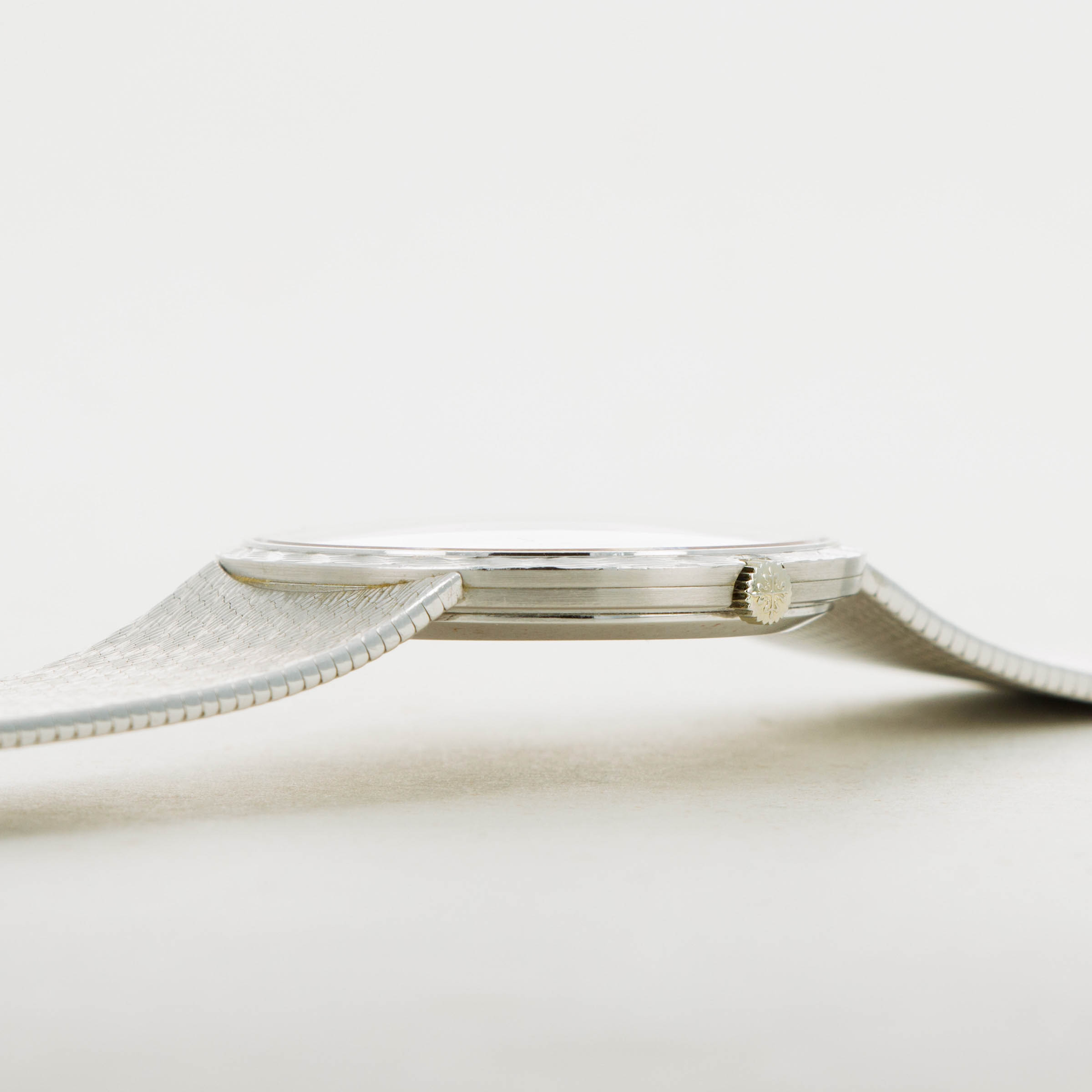 Perhaps the most iconic dress watch collection ever, the Patek Philippe Calatrava embodies the very essence of what a classically-styled timepiece should look like. Creating the entire dress watch niche in 1932 when it was released, the Calatrava has become a mainstay within Patek Philippe’s offerings, but it has also been expanded over the years to include variants that don’t quite fit the description of a typical and traditional dress watch as one might imagine; with a yellow gold round case, a simple dial and leather strap. Indeed, the ref. 3588 that we have here is a departure from that aesthetic that instead features an 18kt white gold case with intricate engravings along its bezel, a rich blue dial that is appropriately free from any pieces of detail that don’t serve a distinct purpose and an integrated 18kt white gold bracelet that boasts an intricately woven construction and marks a significant move away from the leather straps that came to define the Calatrava collection. A unique watch within a collection that has been famously ubiquitous, the ref. 3588 that we have here is a quiet reminder that even Patek during the 1960s and 1970s were happy to experiment with design and break away from traditional norms – perhaps a direct foreshadowing of the Nautilus collection that was then later launched in 1976.