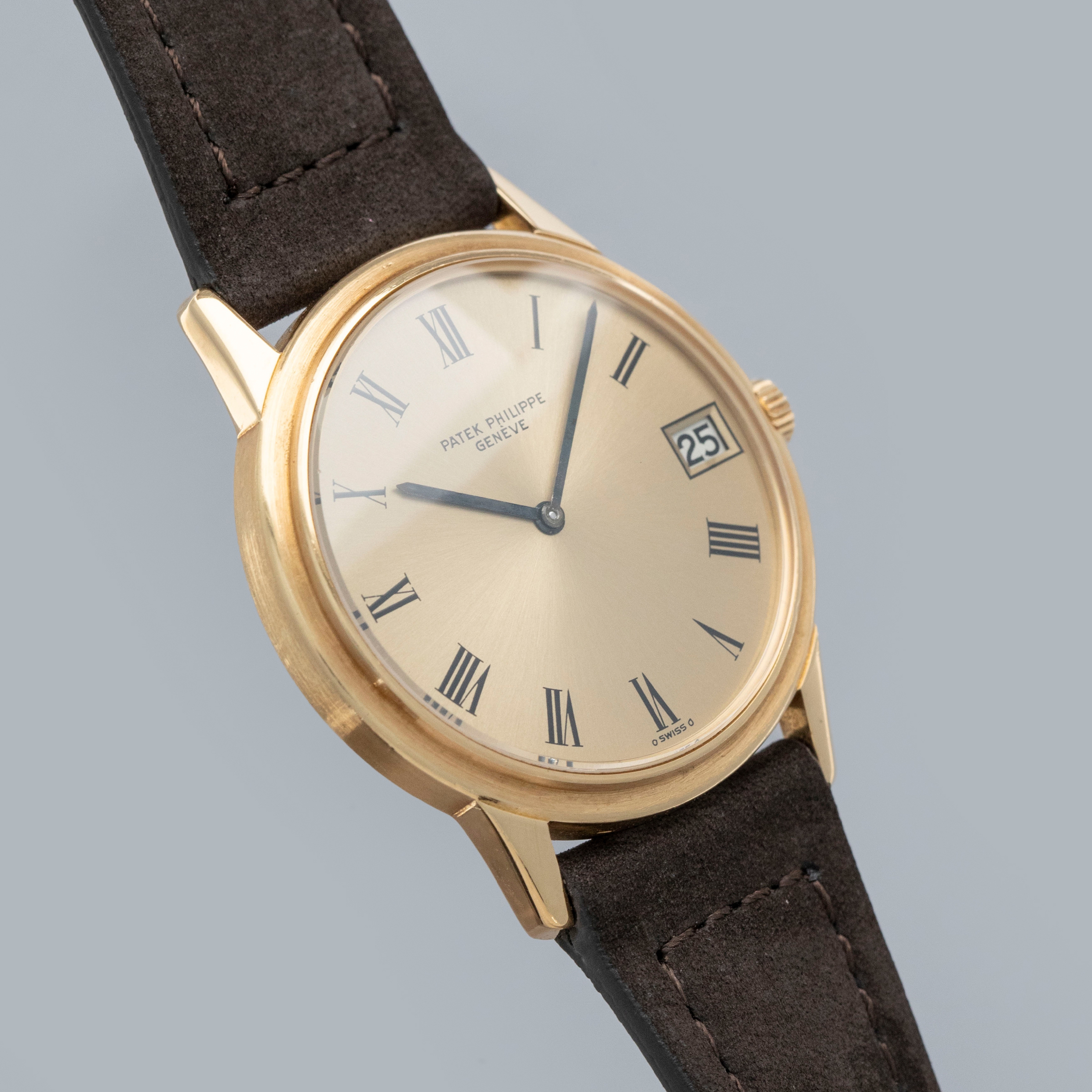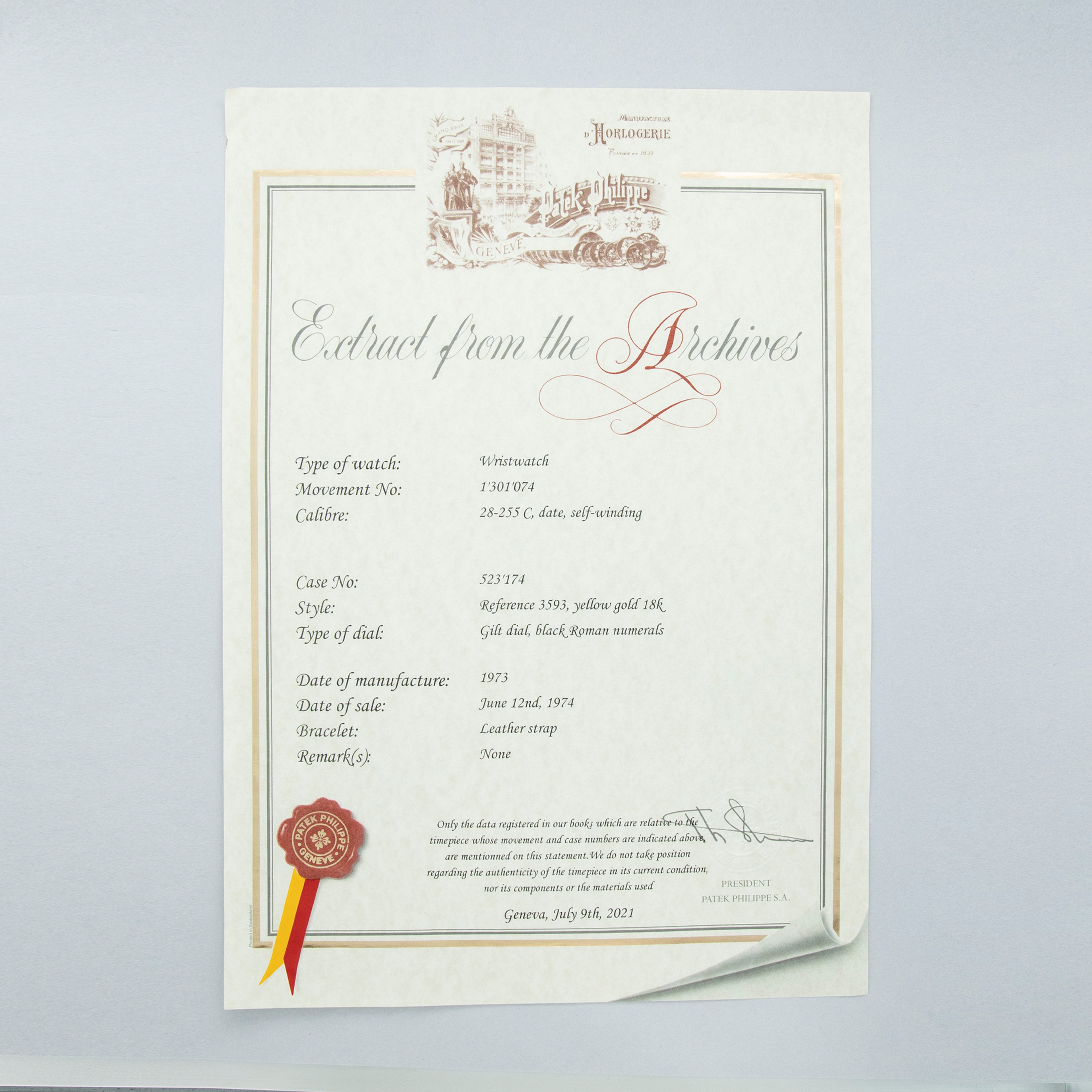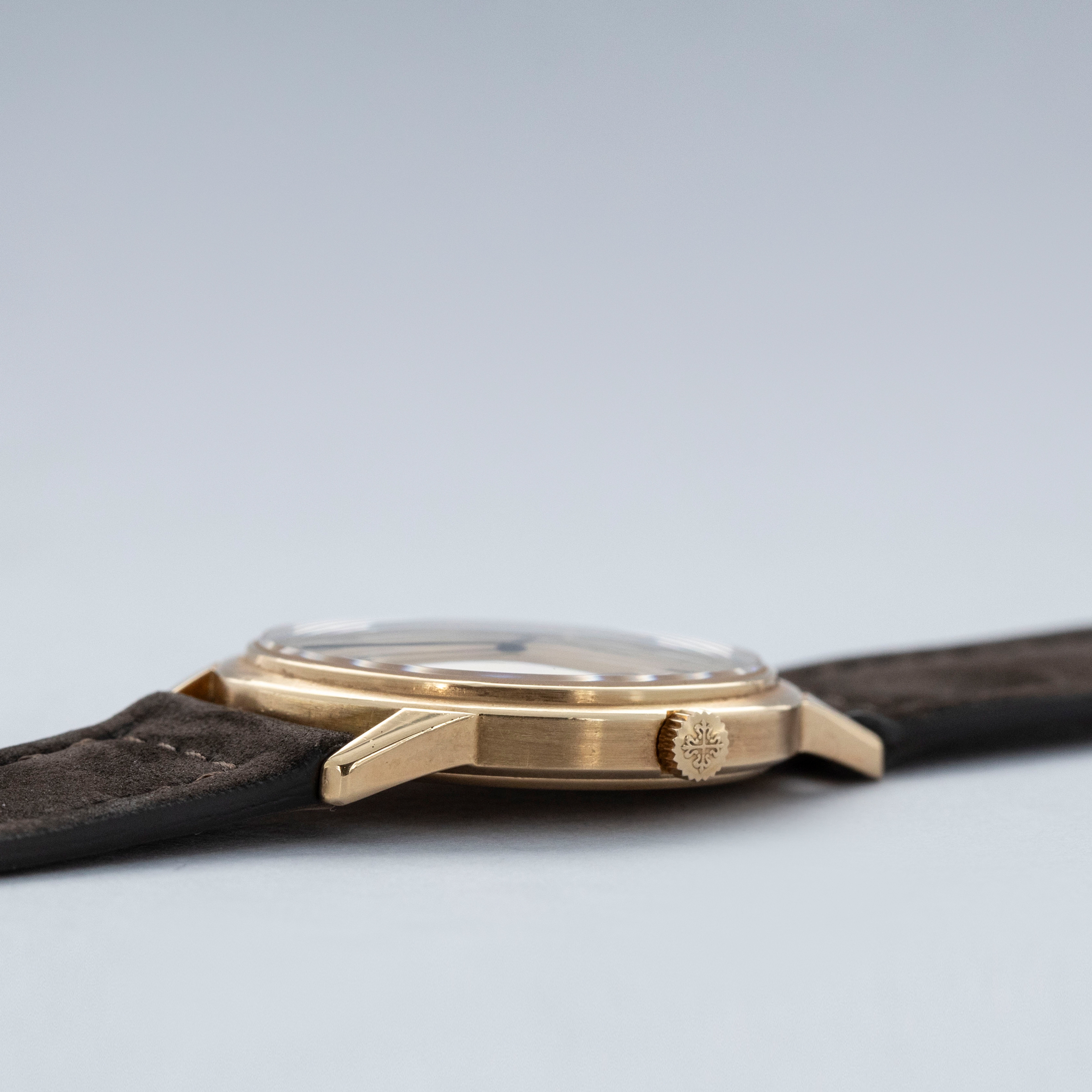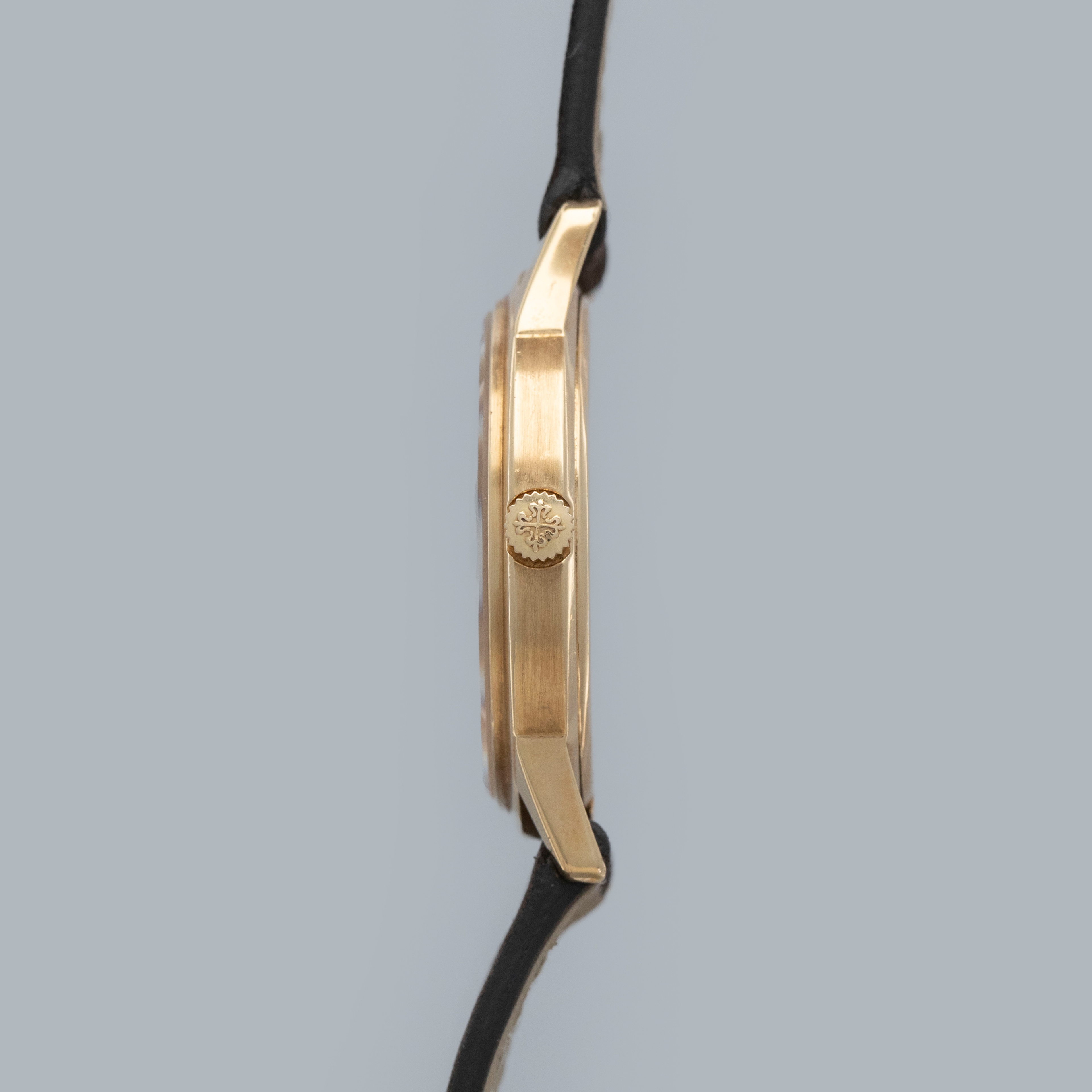 The watch is in overall excellent condition. The yellow gold case shows light scratches and a couple of tiny nicks, as expected for a watch of this vintage. The Patek Philippe logo winding crown remains very well defined. The dial and hands are near-mint. It comes fitted with a new Collectibility leather strap and a yellow gold Patek Philippe pin buckle, which is in excellent condition. The watch comes with a Patek Philippe Archive Extract.