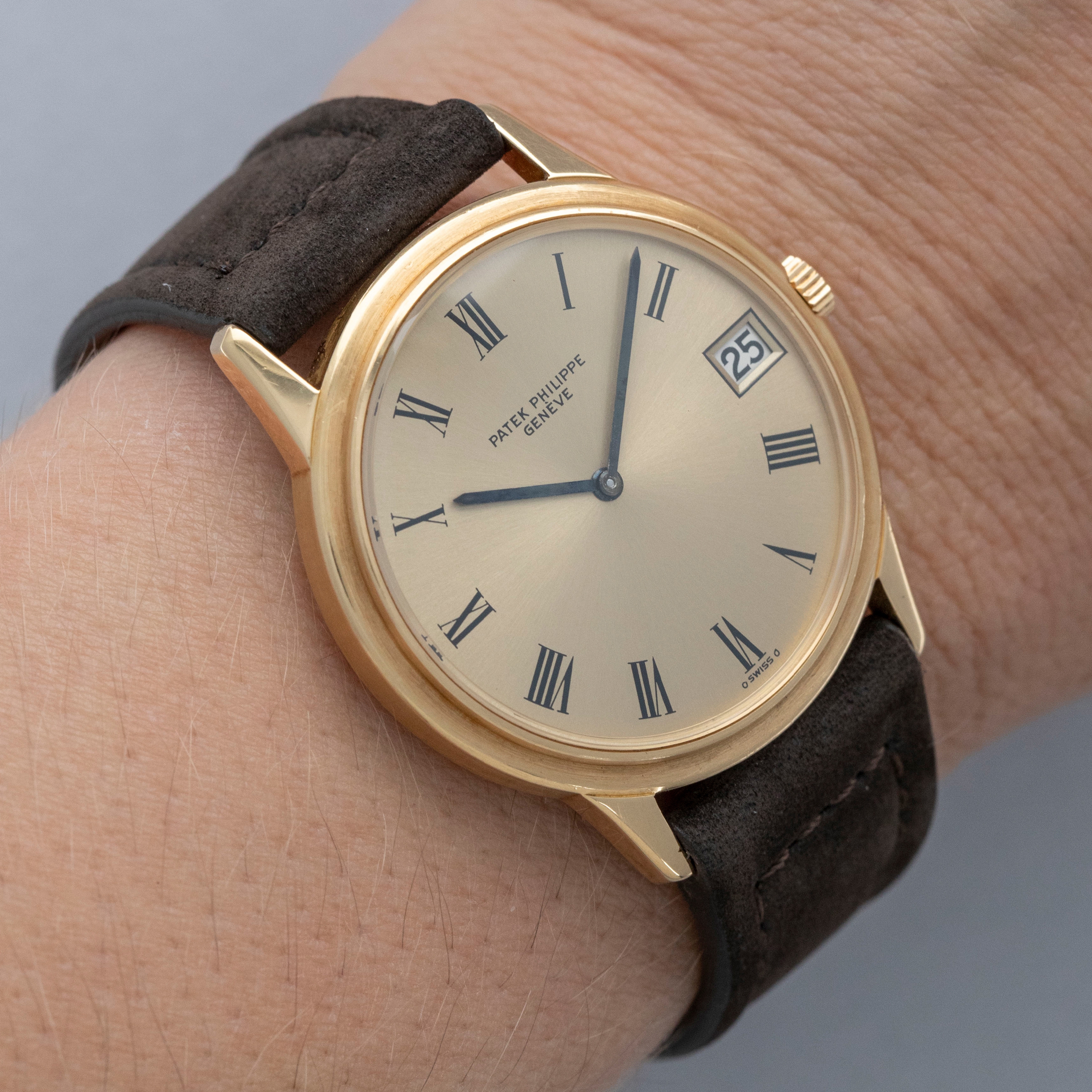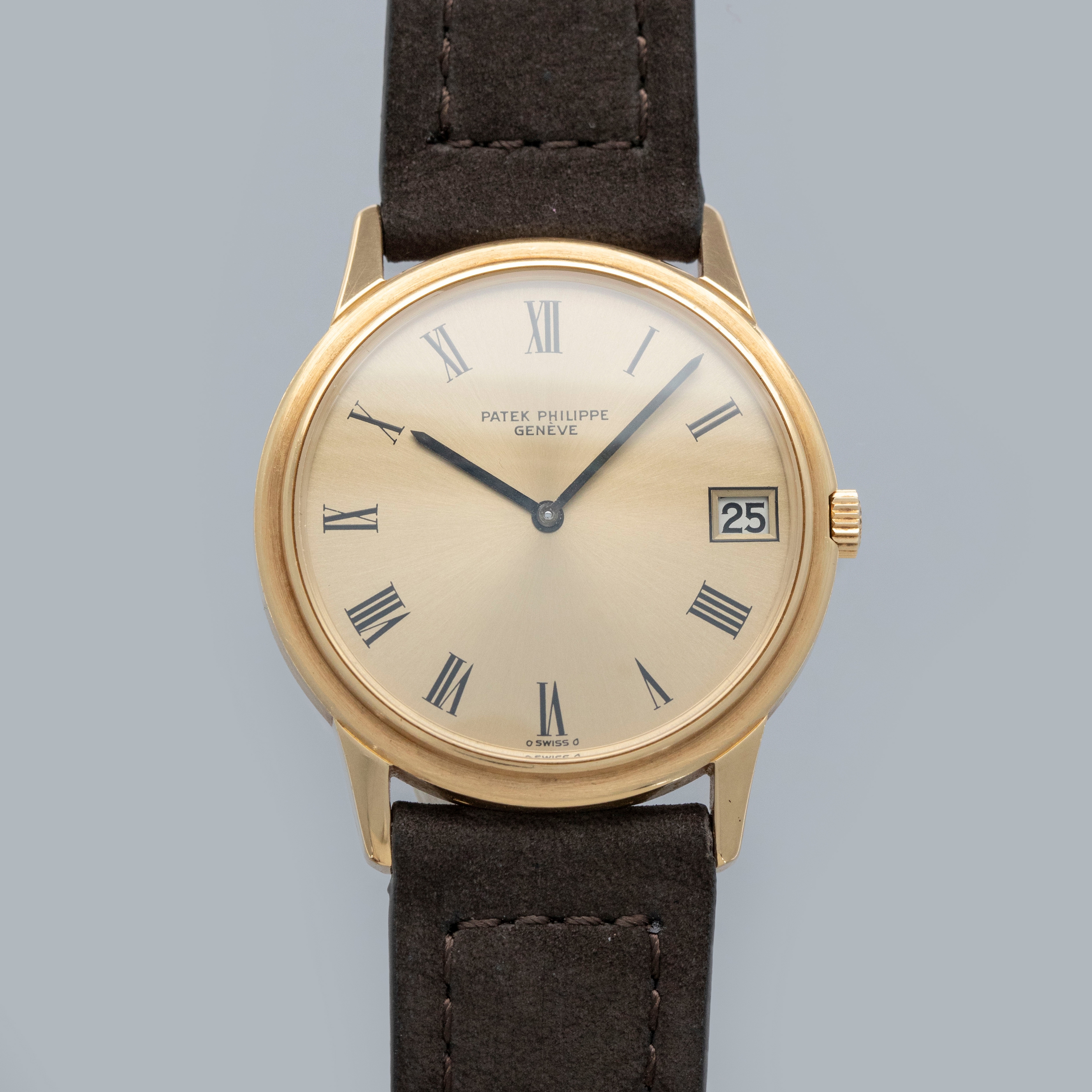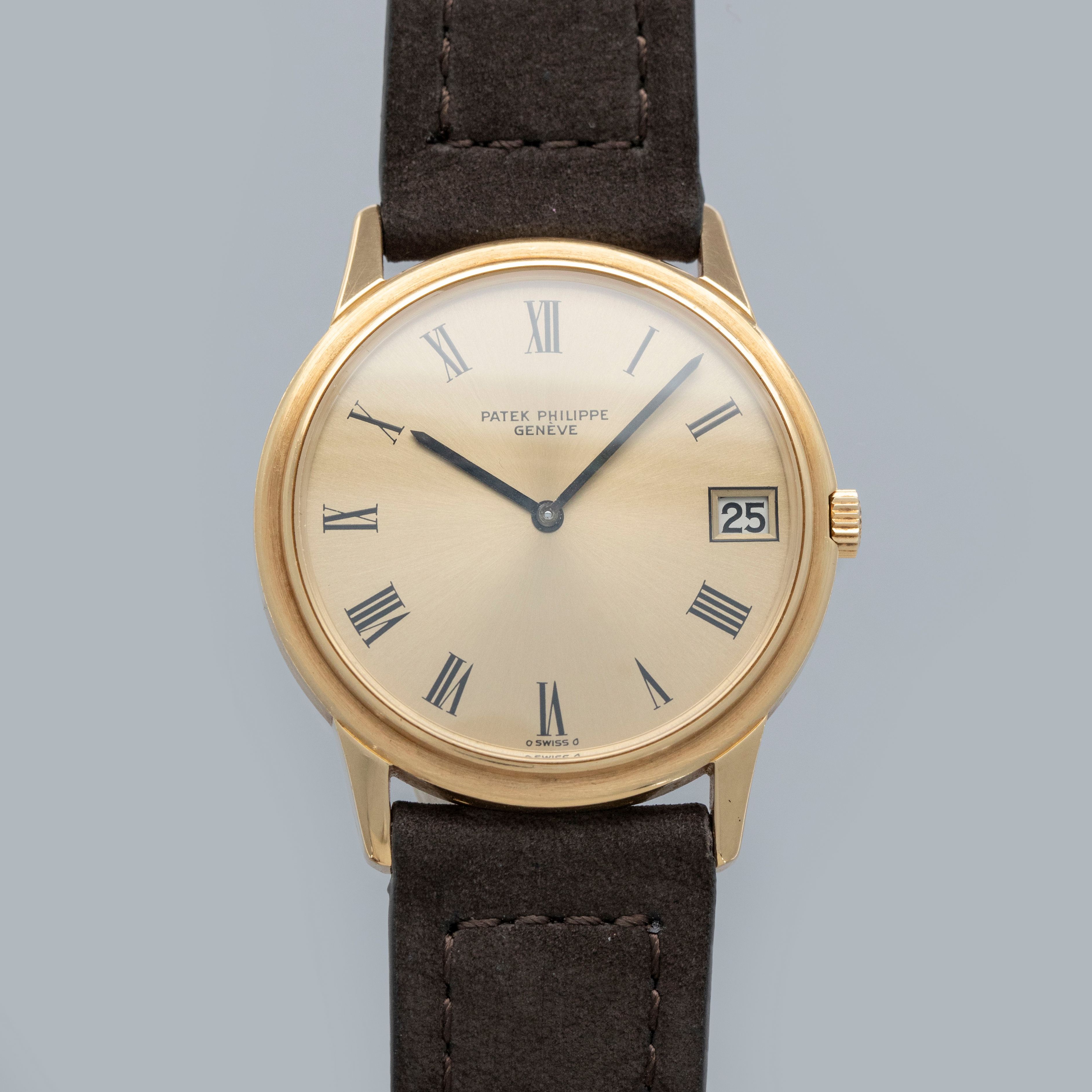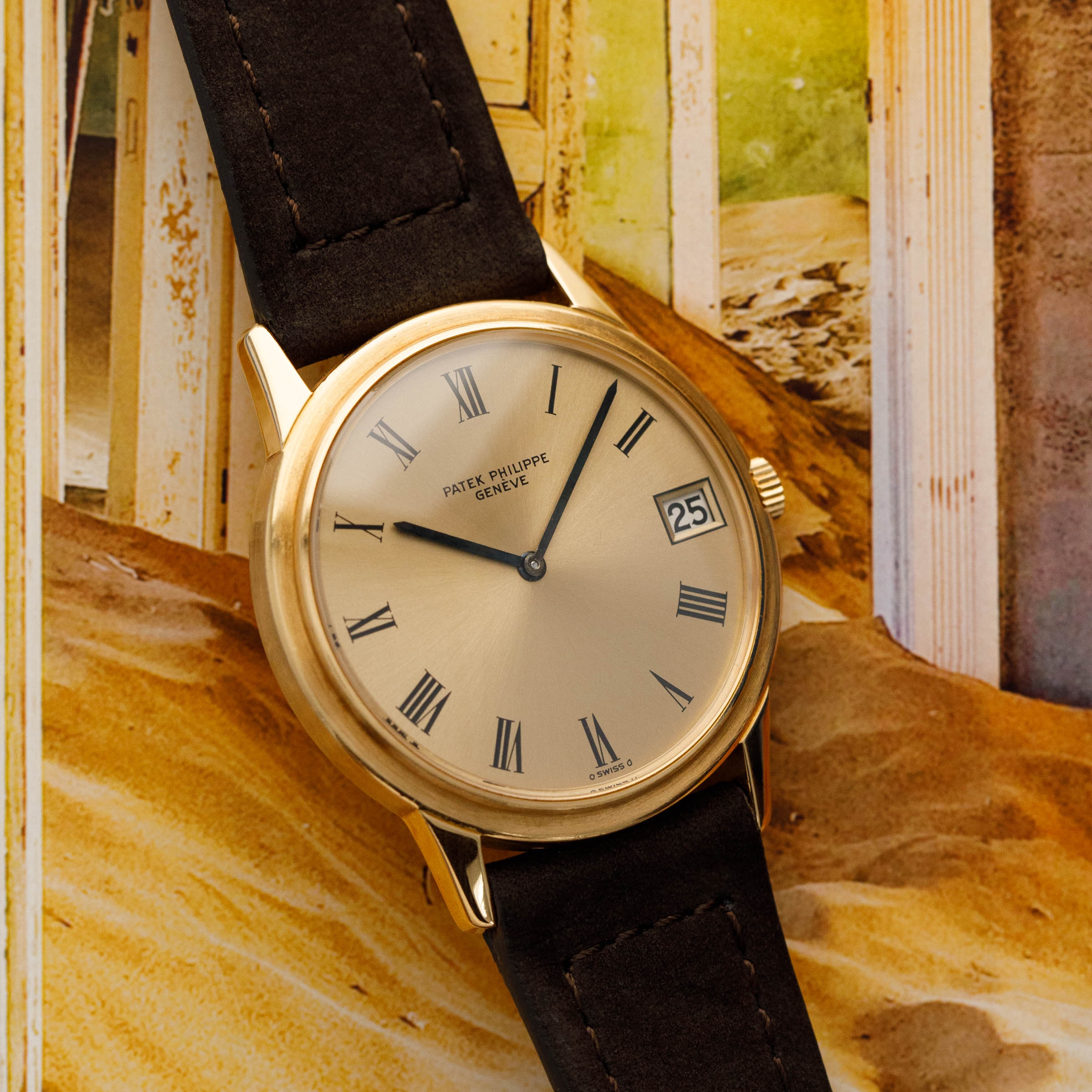 Released in 1932 and named after the cross that the Calatrava Knights paraded around Spain and Portugal during the 12th and 13th centuries, the Patek Philippe Calatrava was released as a simple timepiece with broad appeal that would help secure Patek Philippe's finances following Jean and Charles Henri Stern's investment in the brand in the same year. Designed with a strict Bauhaus-inspired aesthetic in mind, the Calatrava used, and continues to use, simplicity as its means of establishing intrigue around the craftsmanship required to construct such a stunning timepiece. Without a complicated movement or a busy design, collectors gravitate towards the Calatrava's clean aesthetic and practicality, and the ref. 3593J that we have here embodies that same design language perfectly. Launched in 19370and produced for 5 years until 1974, the ref. 3593 was quietly luxurious timepiece for its time at 33mm diameter. Made of 18kt yellw gold and boasting a champagne Roman numeral dial, this example is still practical for a modern collector as it merges the Calatrava's original design brief in its purest form with a diameter that contemporary collectors can still enjoy in a classical dress watch.