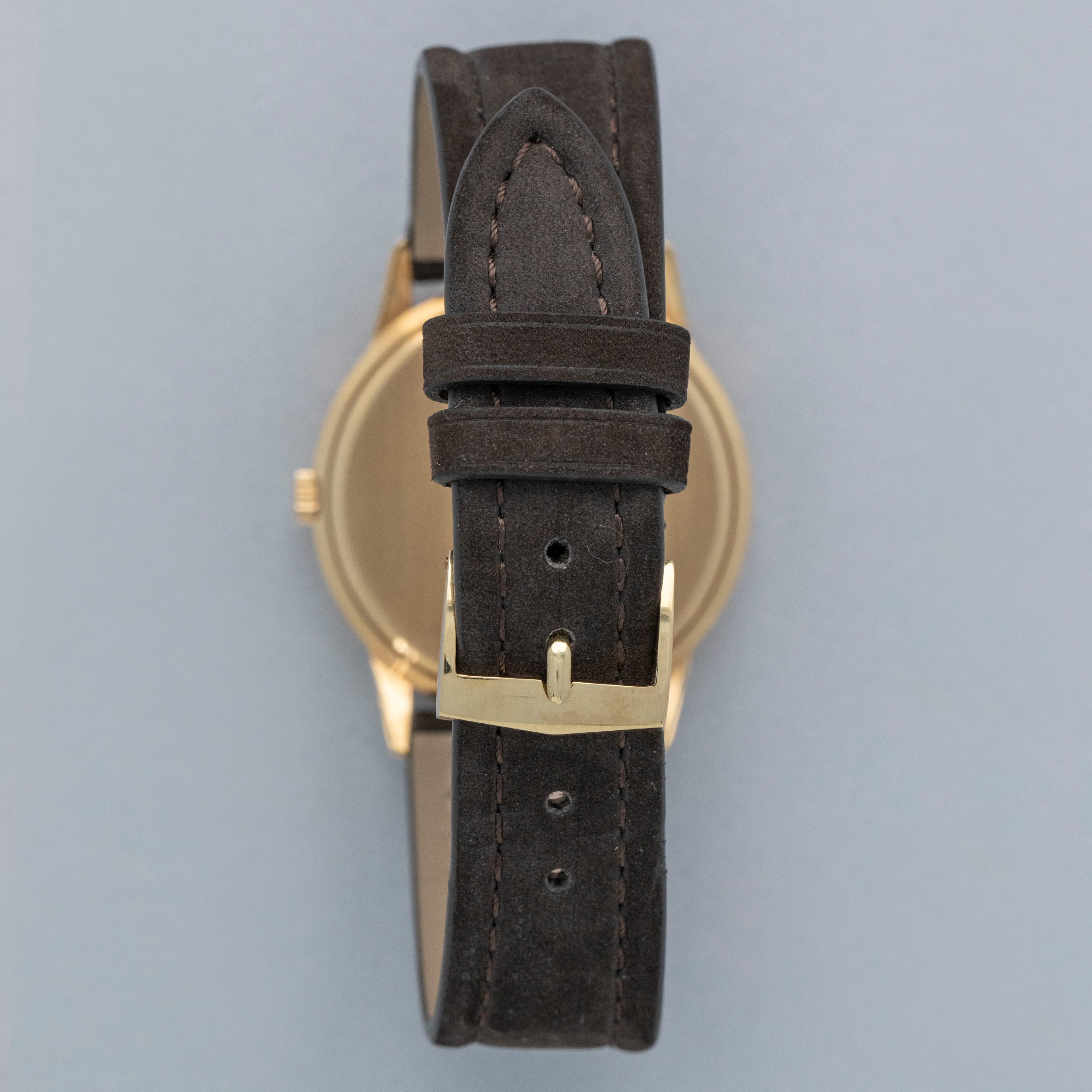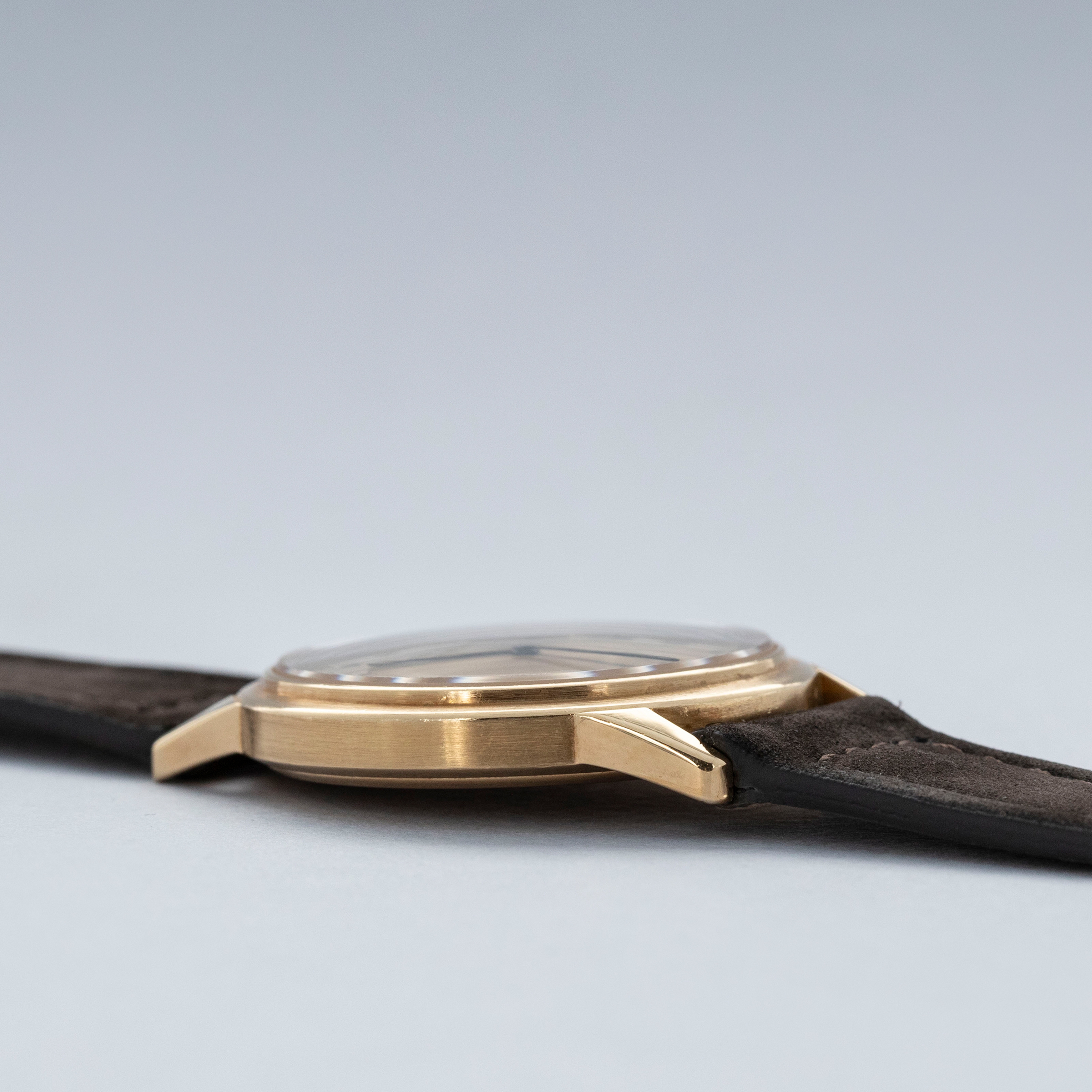 Love the 1970s vibe here. The 3593J’s gilt dial and slim yellow gold case are quietly luxurious. A time-only watch with a lot of character — only 33 mm but makes a big statement.