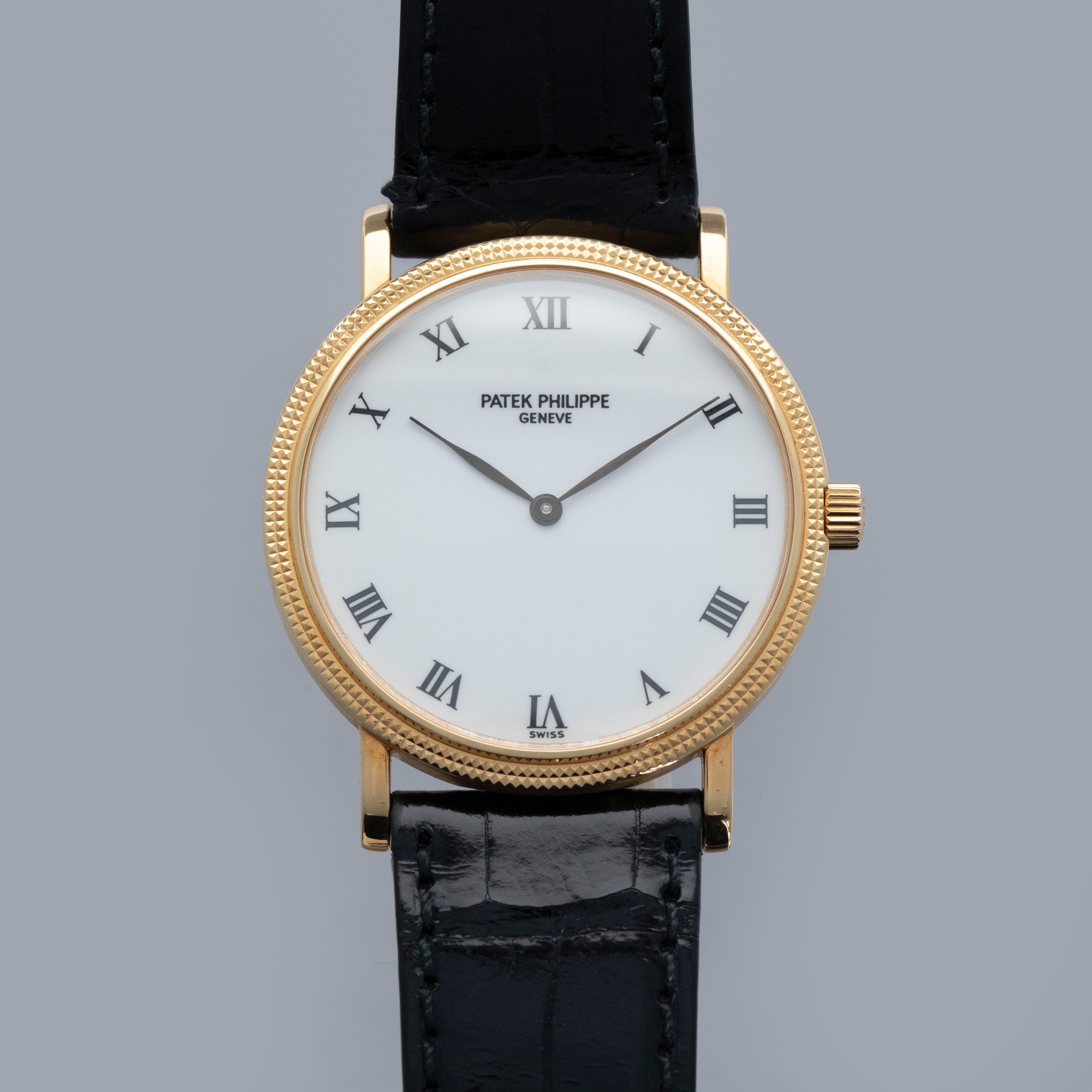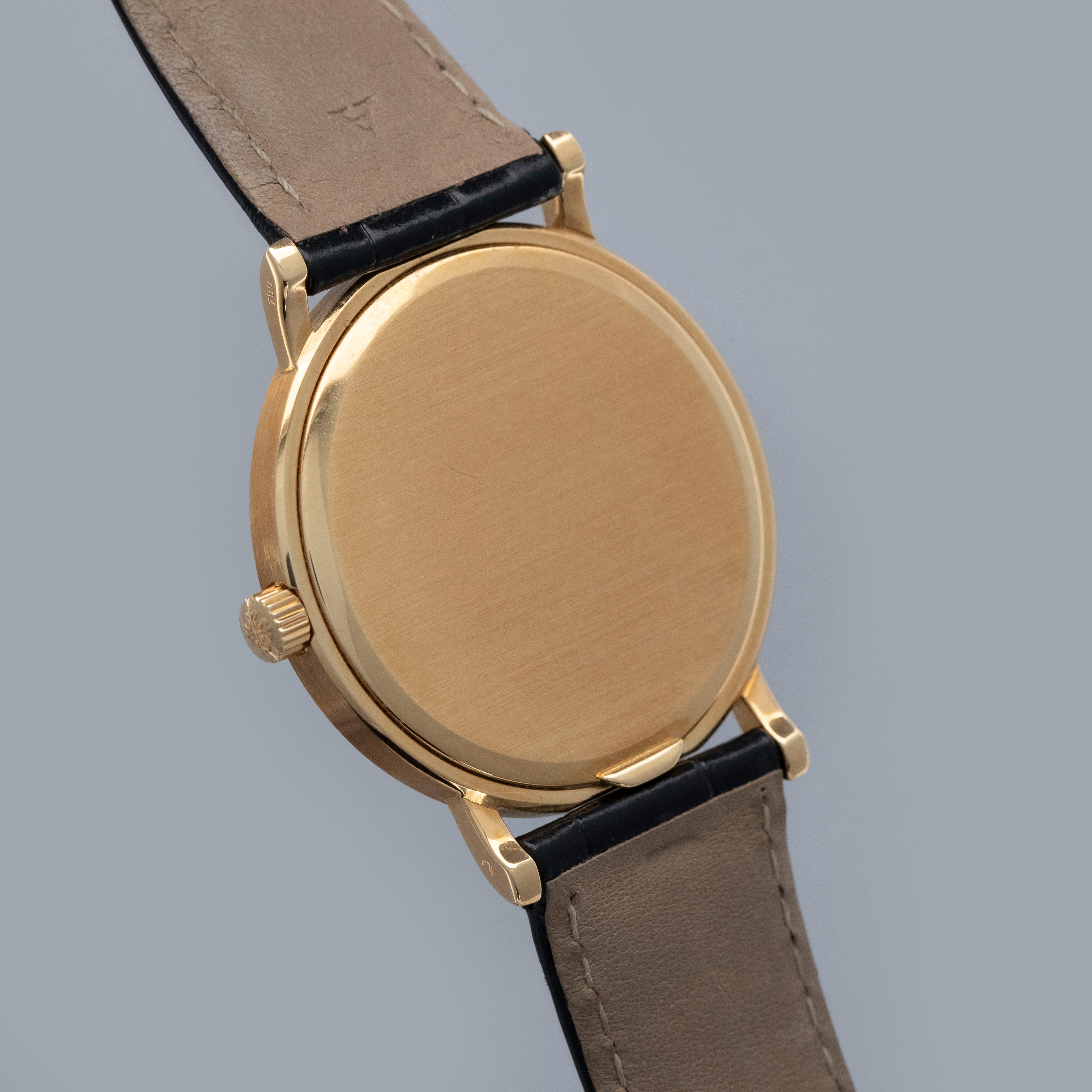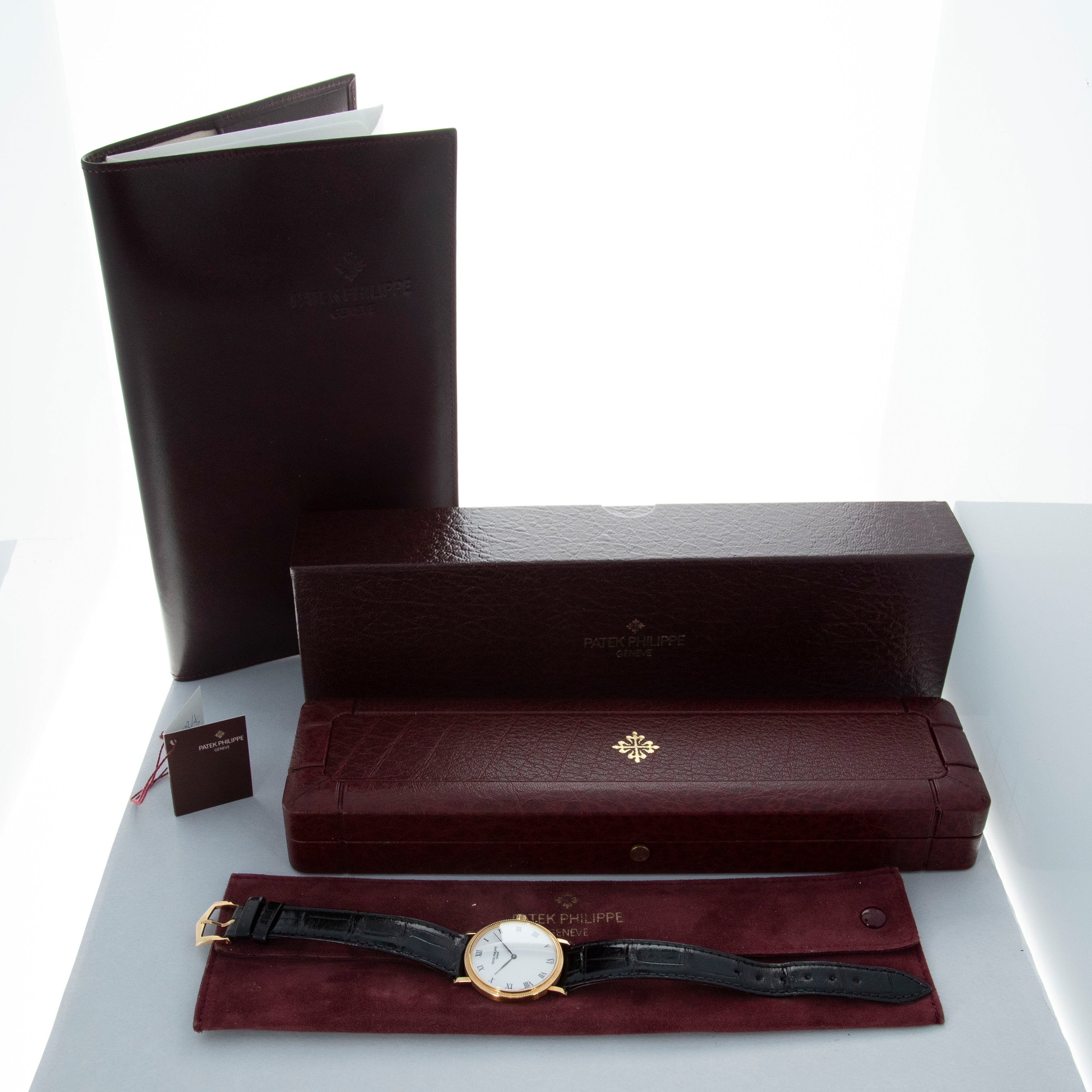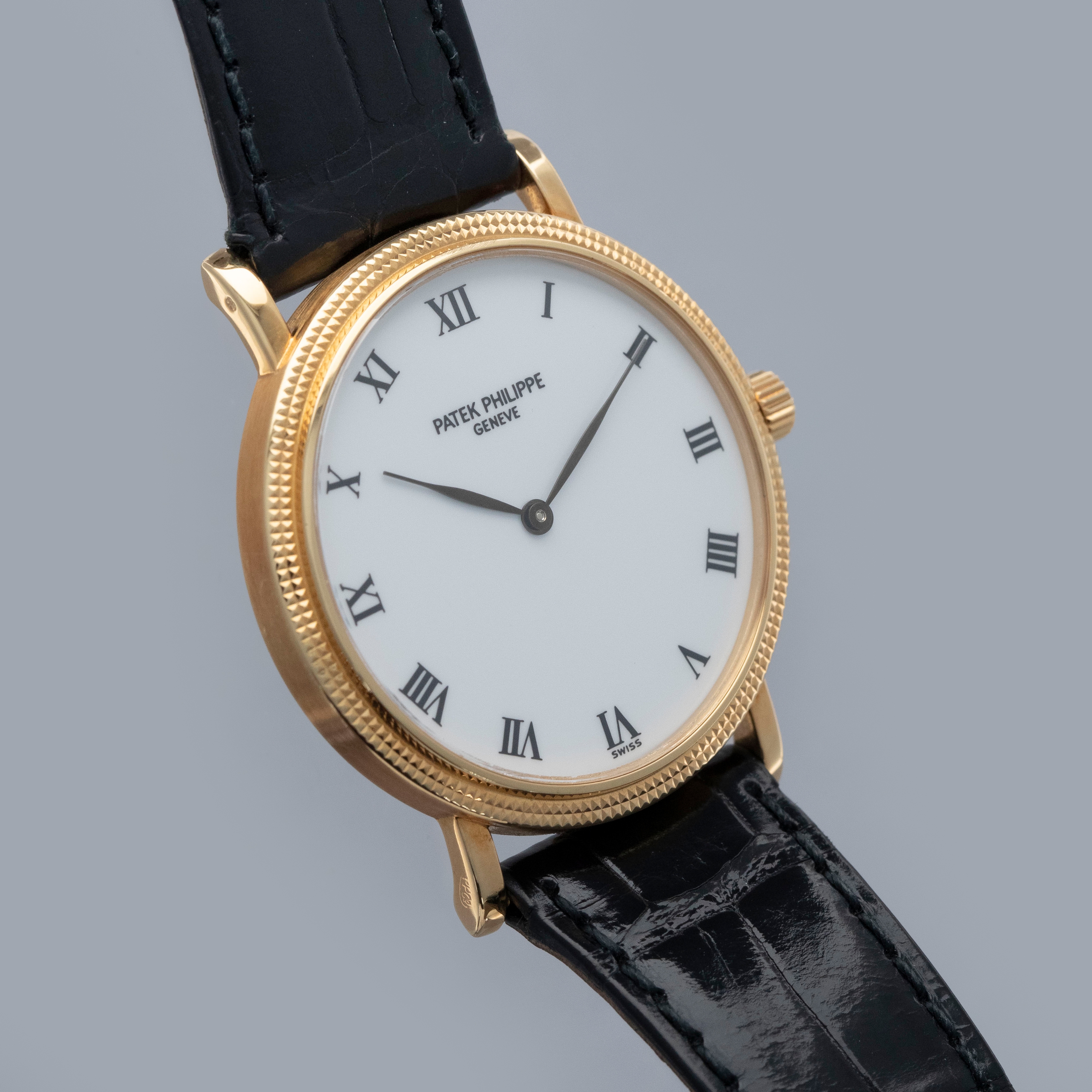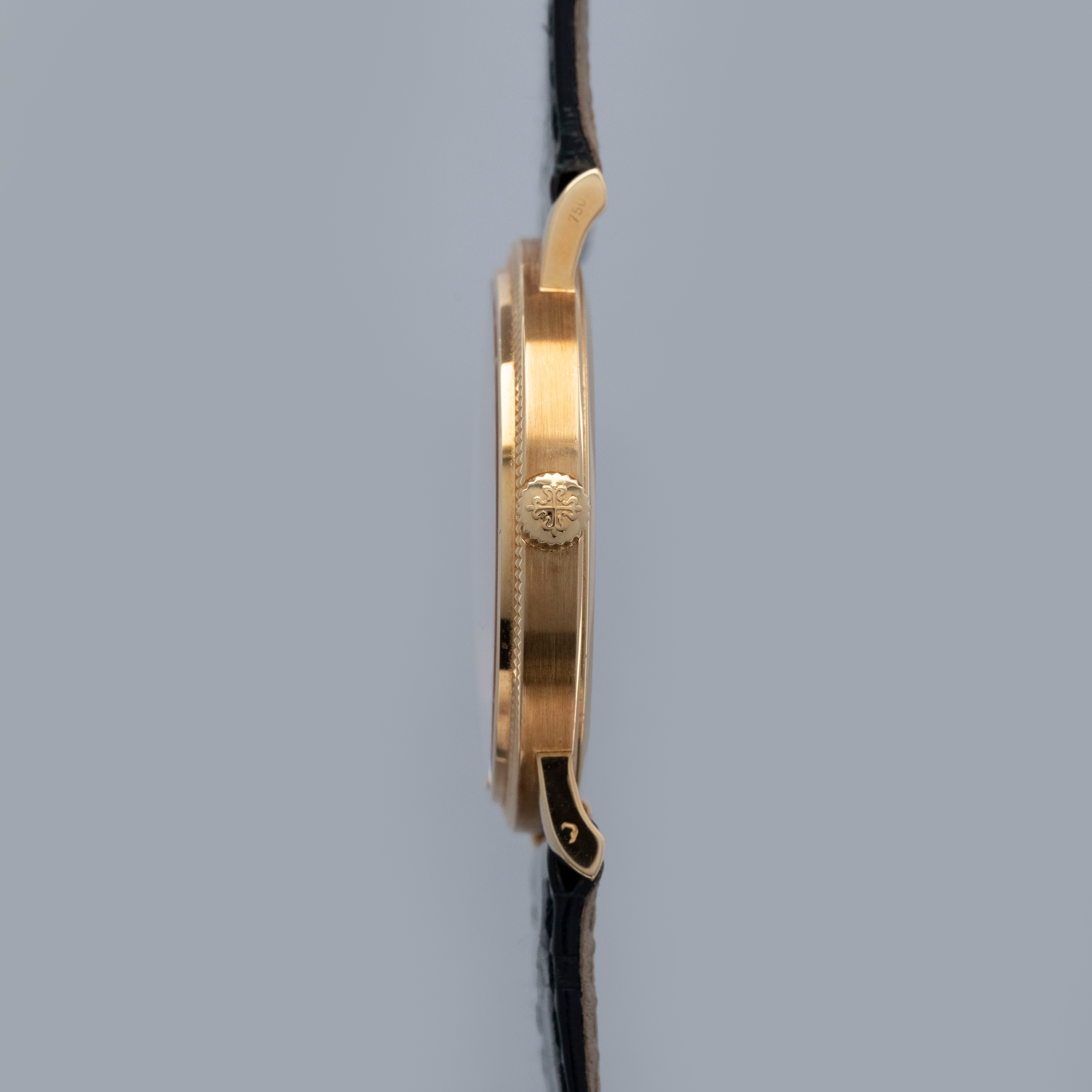 The watch is in overall excellent condition. The yellow gold case has some light marks and scuffs, with gentle wear visible on the clous de Paris bezel. The hallmarks and stamps on the case sides show some wear but remain legible. The dial and hands are near mint. The watch is fitted with a black Patek Philippe alligator strap and yellow gold pin buckle, both in excellent condition. Comes with original inner and outer boxes, Certificate of Origin, and Owner’s Register paperwork, as well as service paperwork and pouch from a full service in 2006.