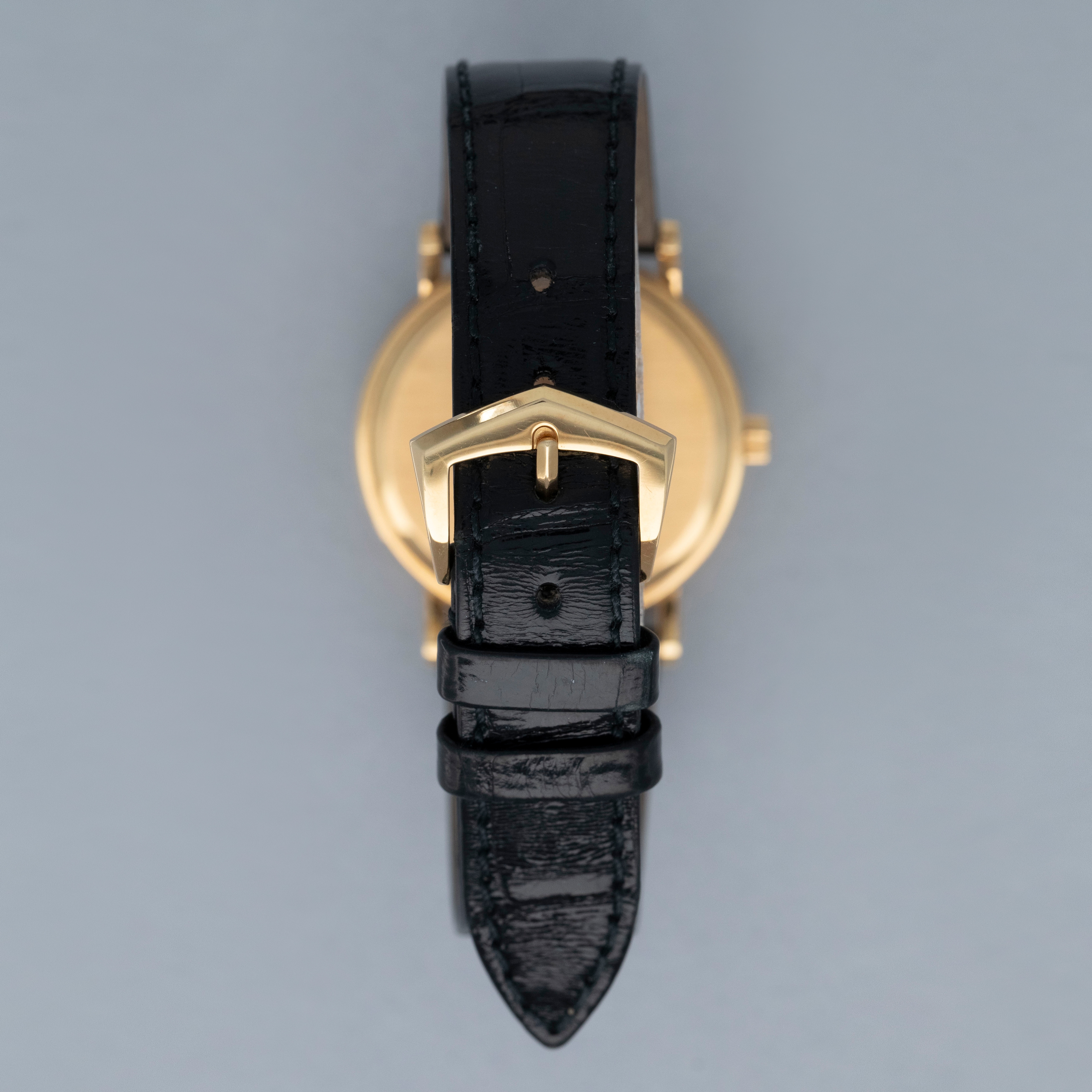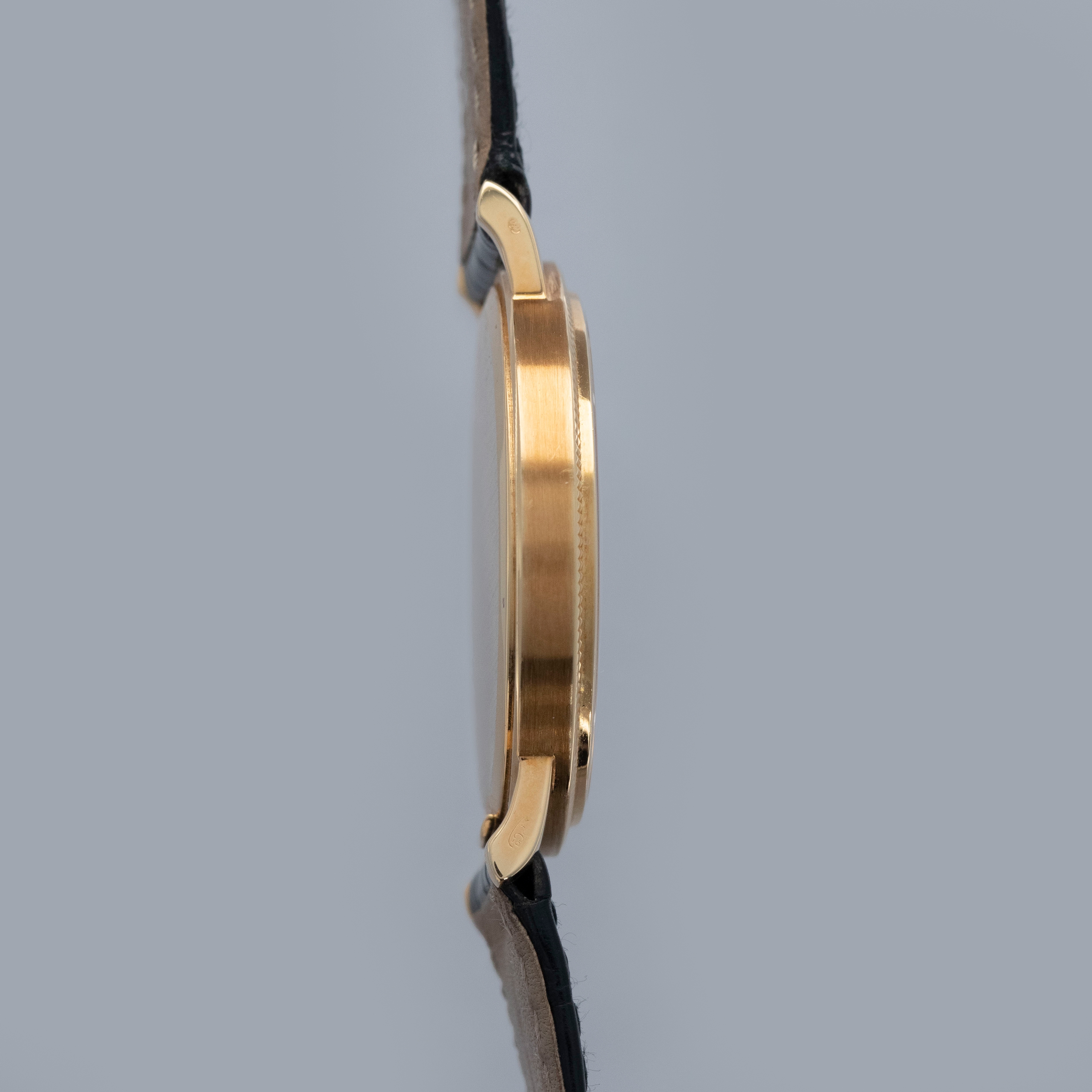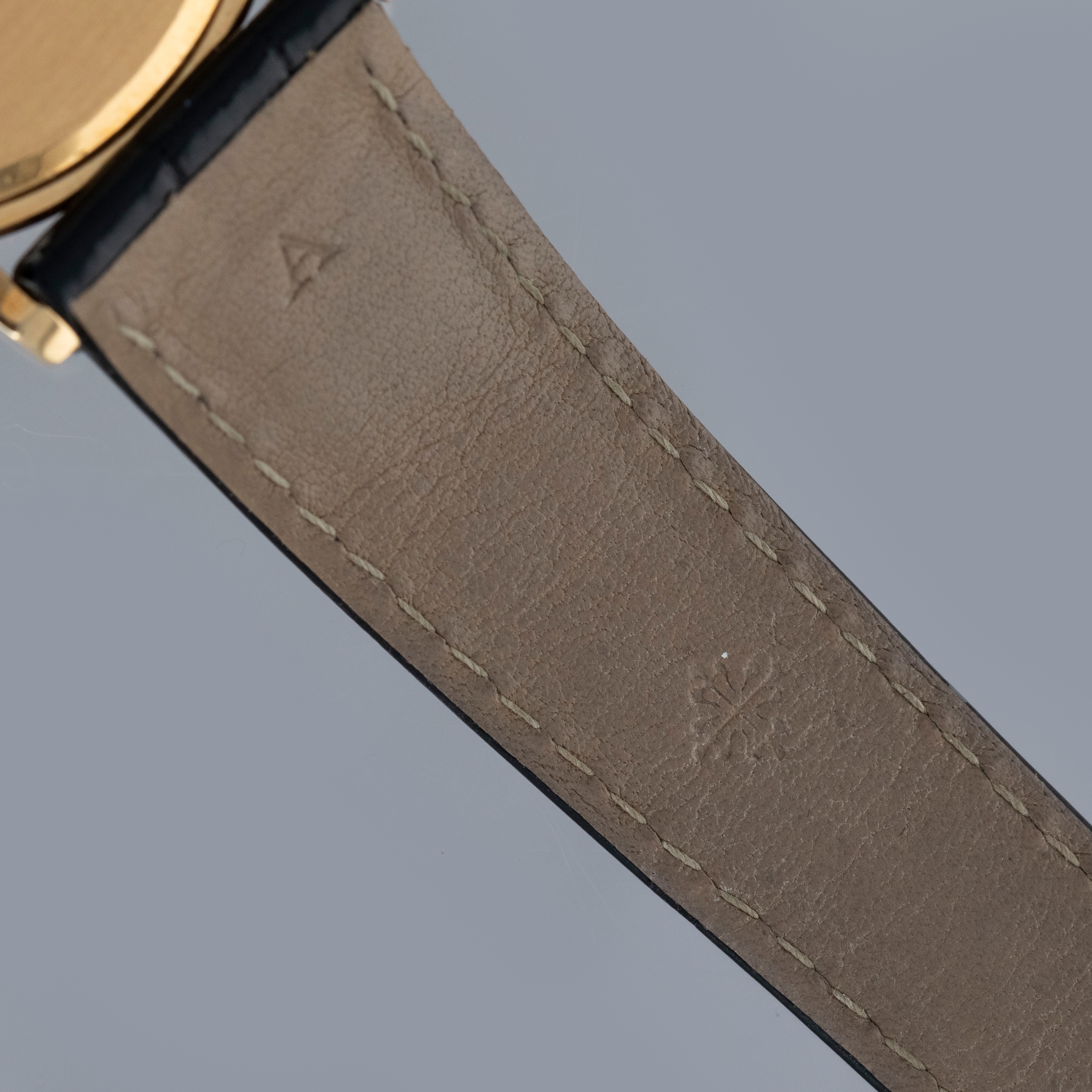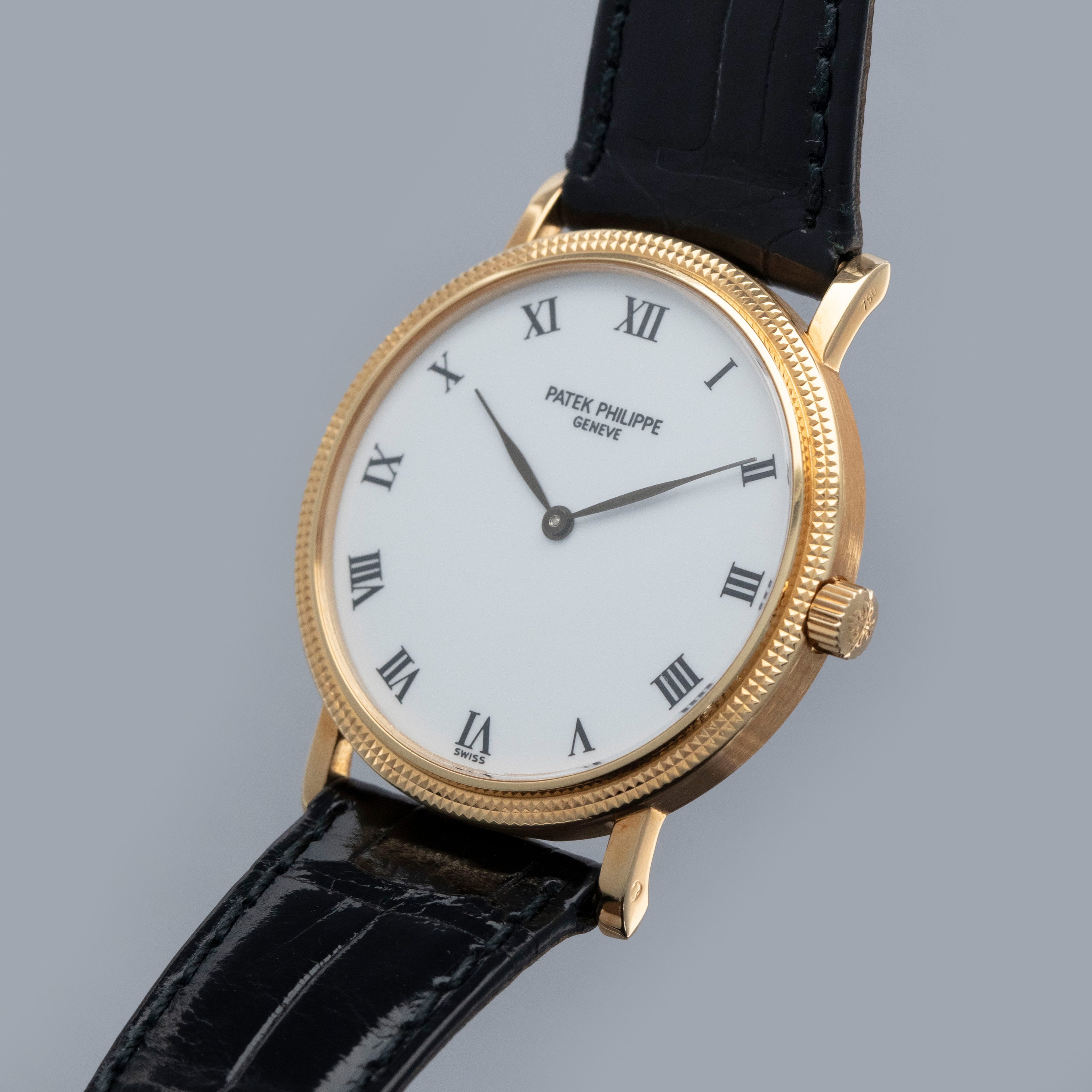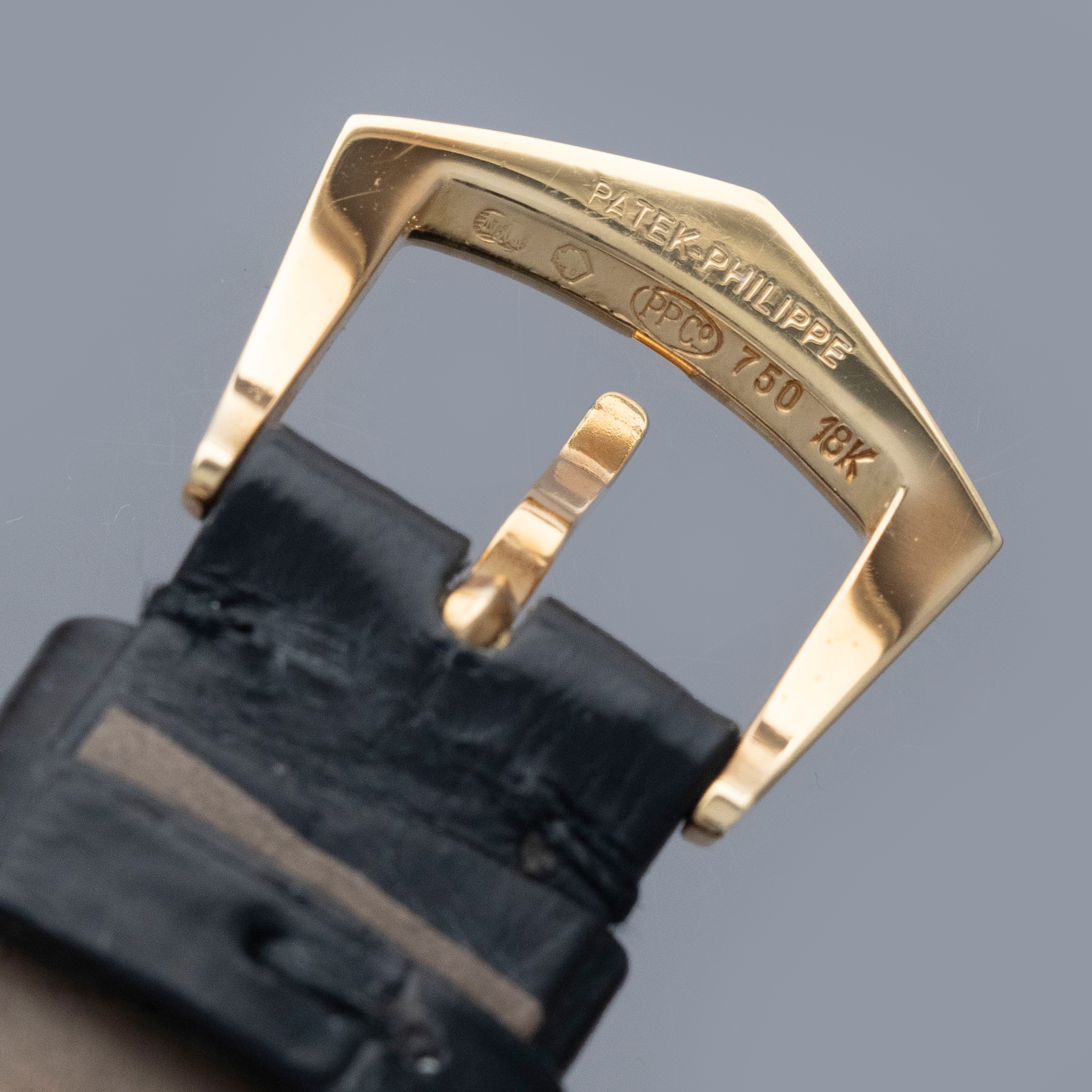 The watch is in overall excellent condition. The yellow gold case has some light marks and scuffs, with gentle wear visible on the clous de Paris bezel. The hallmarks and stamps on the case sides show some wear but remain legible. The dial and hands are near mint. The watch is fitted with a black Patek Philippe alligator strap and yellow gold pin buckle, both in excellent condition. Comes with original inner and outer boxes, Certificate of Origin, and Owner’s Register paperwork, as well as service paperwork and pouch from a full service in 2006.