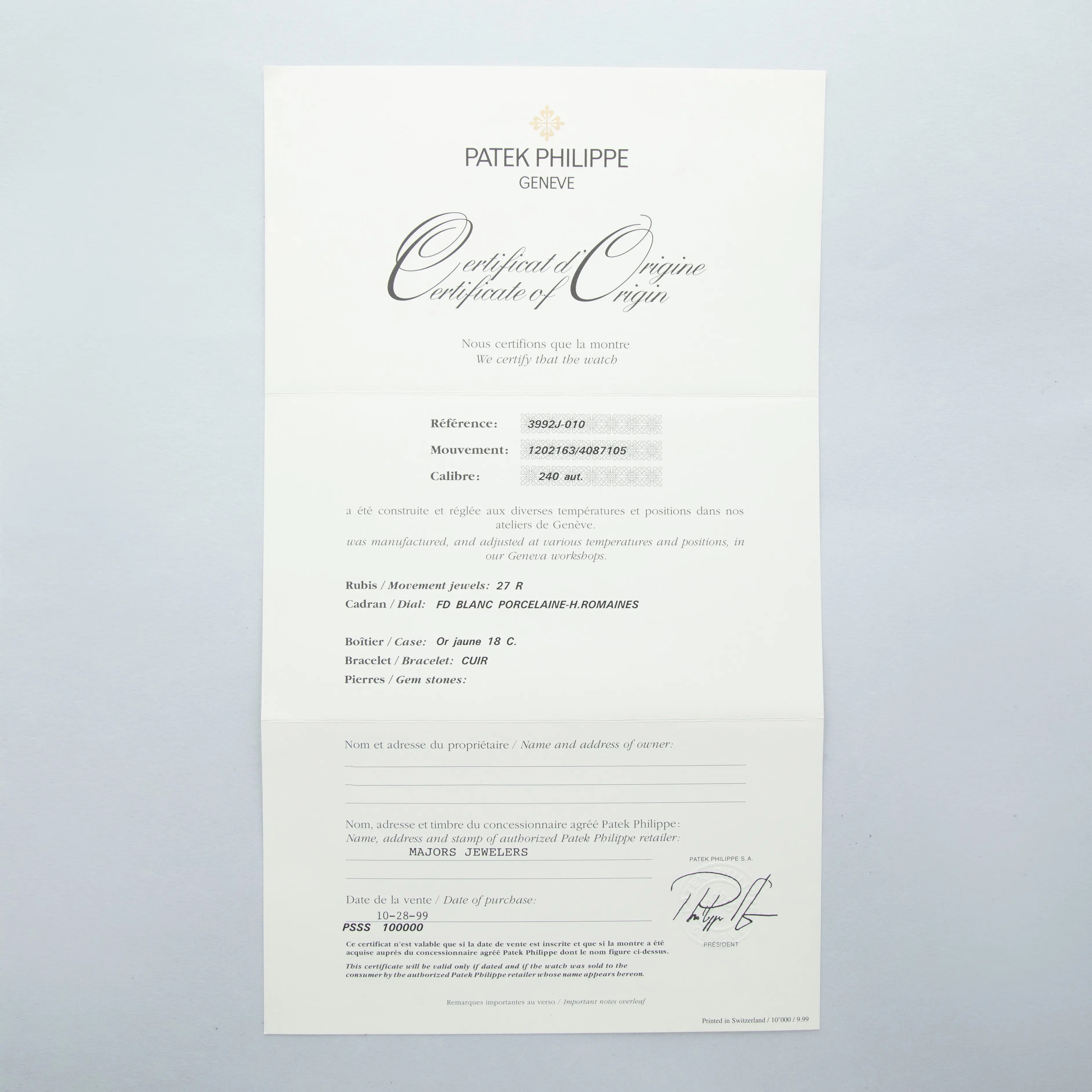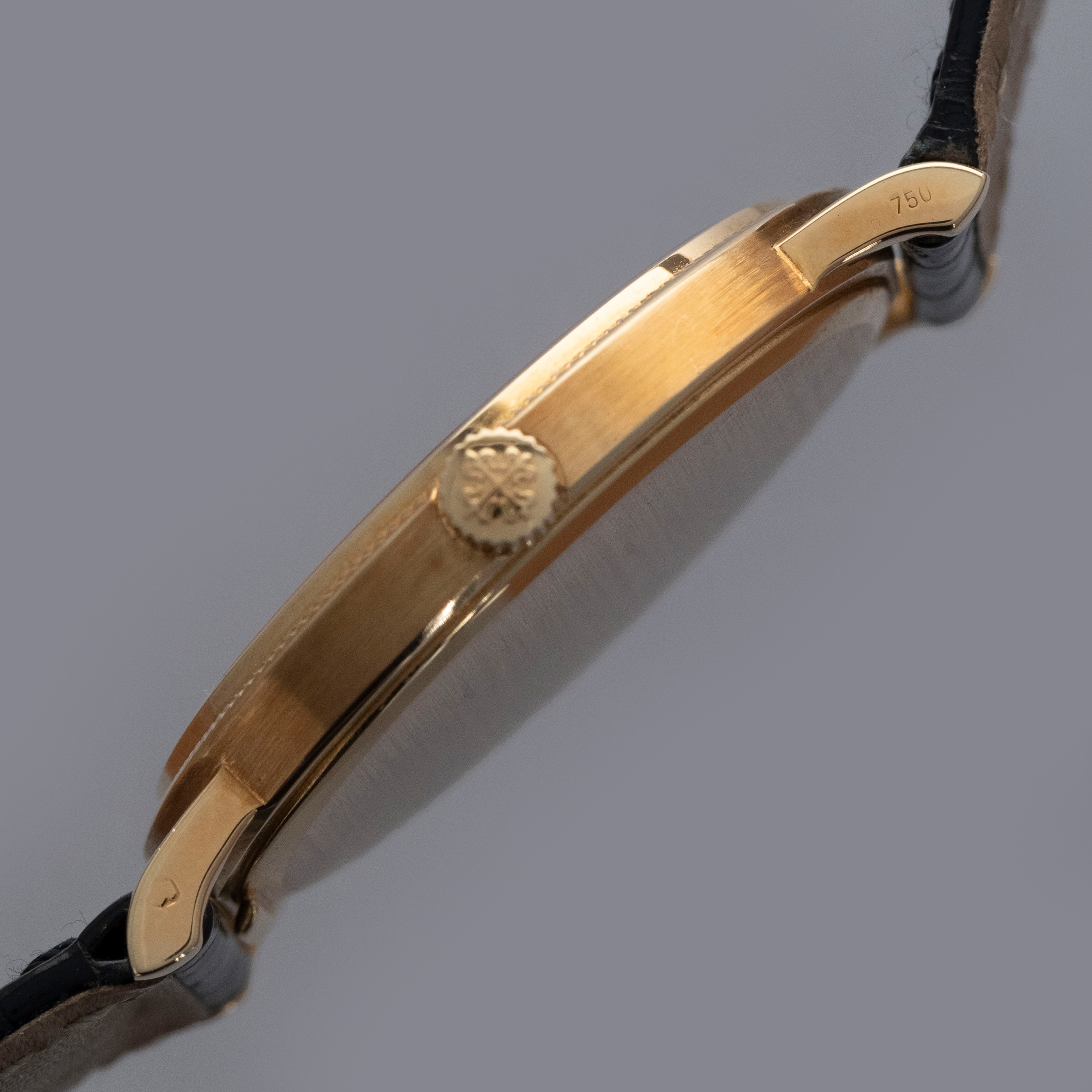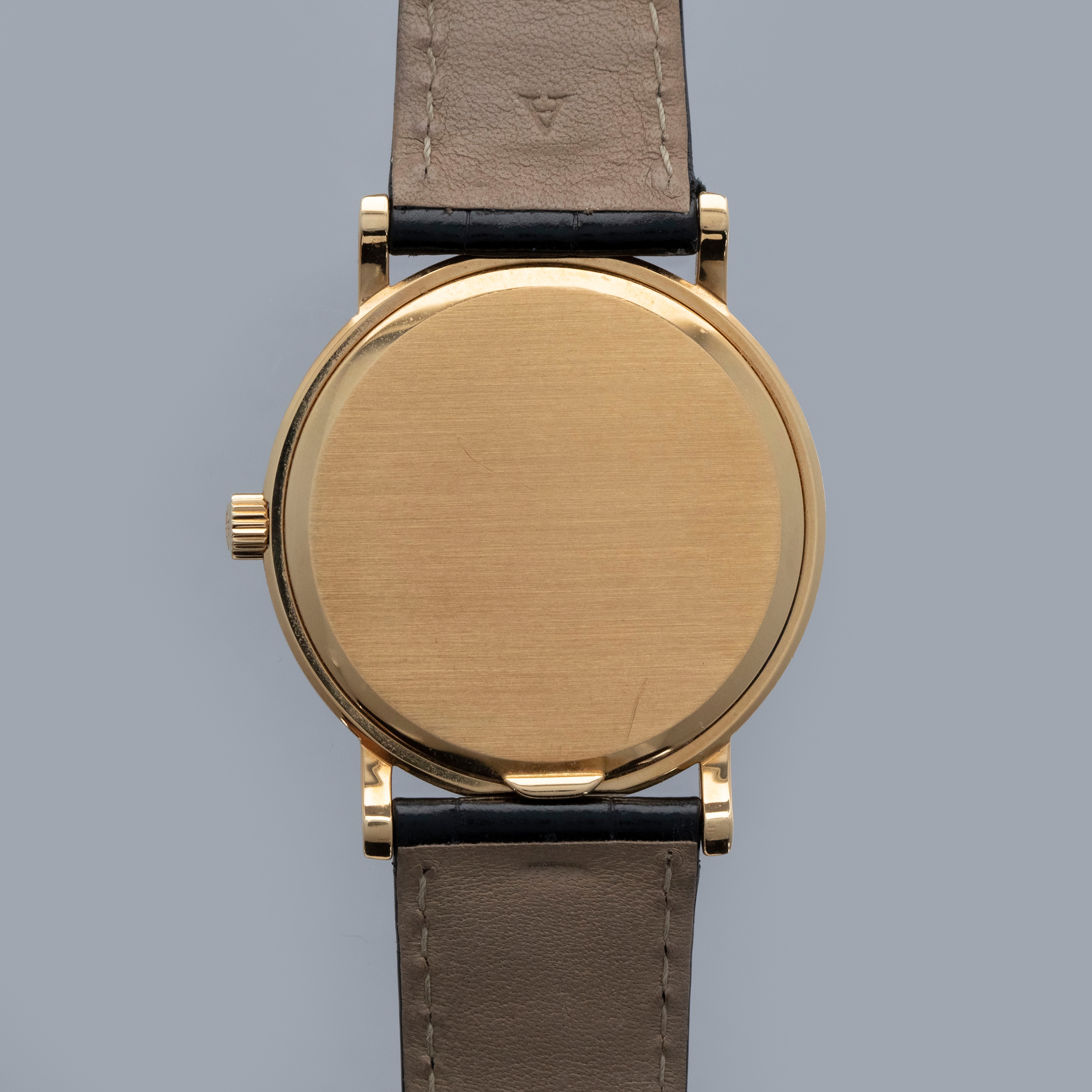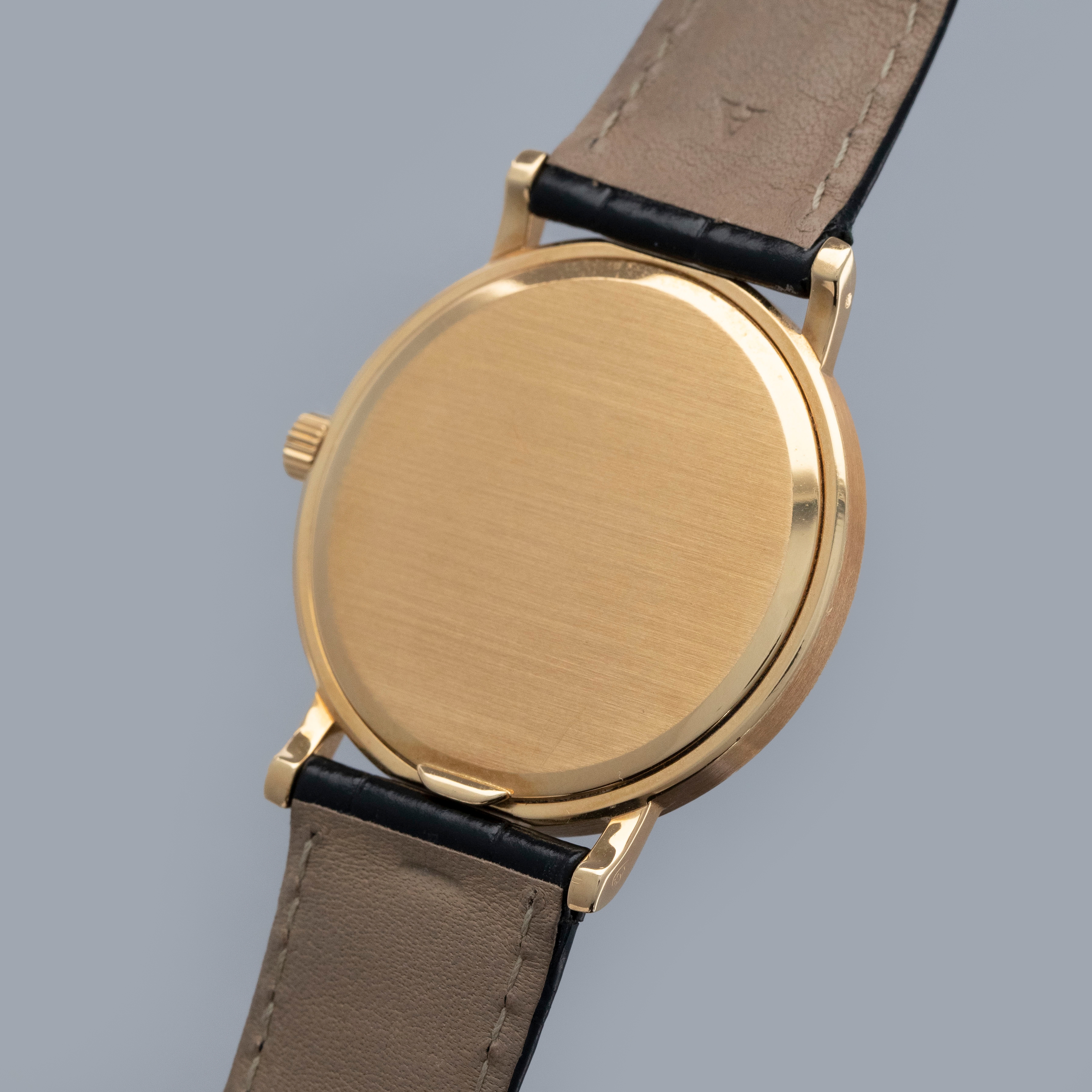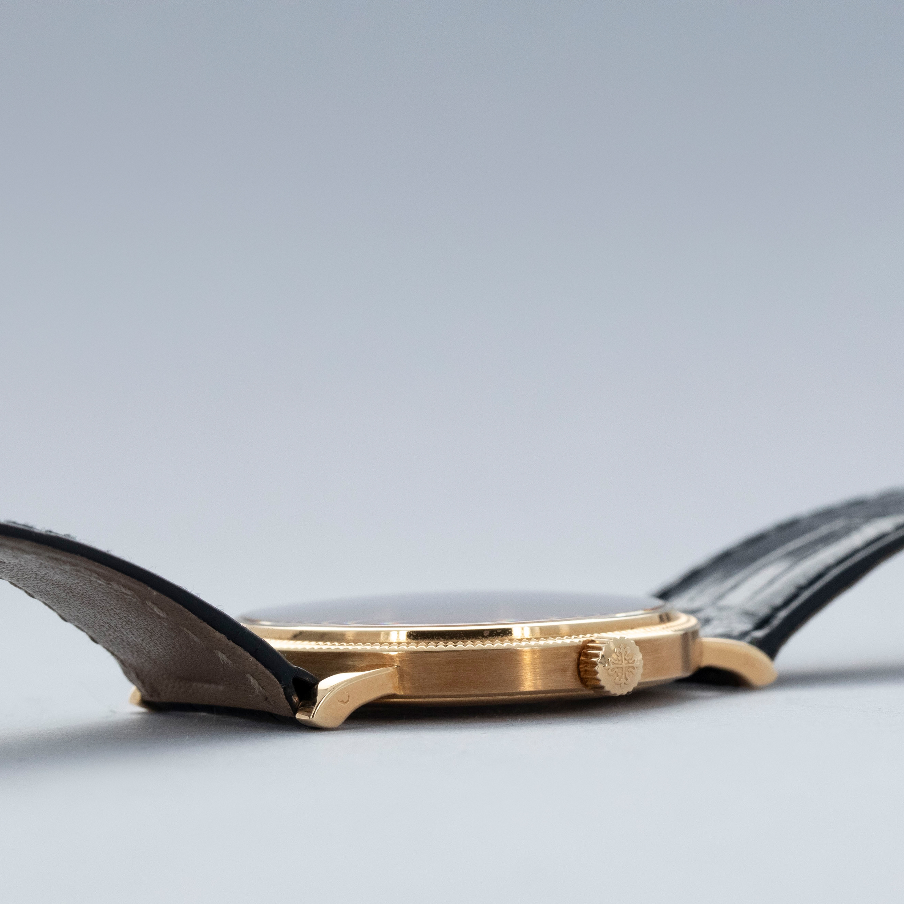 The watch is in overall excellent condition. The yellow gold case has some light marks and scuffs, with gentle wear visible on the clous de Paris bezel. The hallmarks and stamps on the case sides show some wear but remain legible. The dial and hands are near mint. The watch is fitted with a black Patek Philippe alligator strap and yellow gold pin buckle, both in excellent condition. Comes with original inner and outer boxes, Certificate of Origin, and Owner’s Register paperwork, as well as service paperwork and pouch from a full service in 2006.