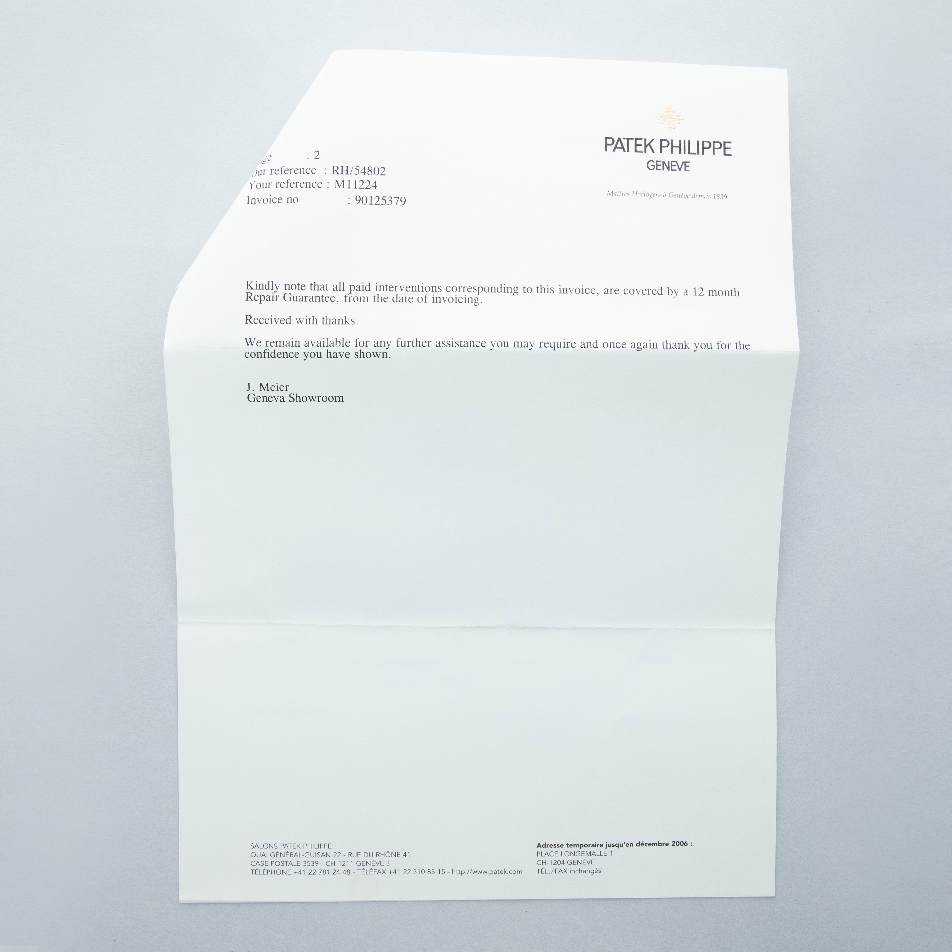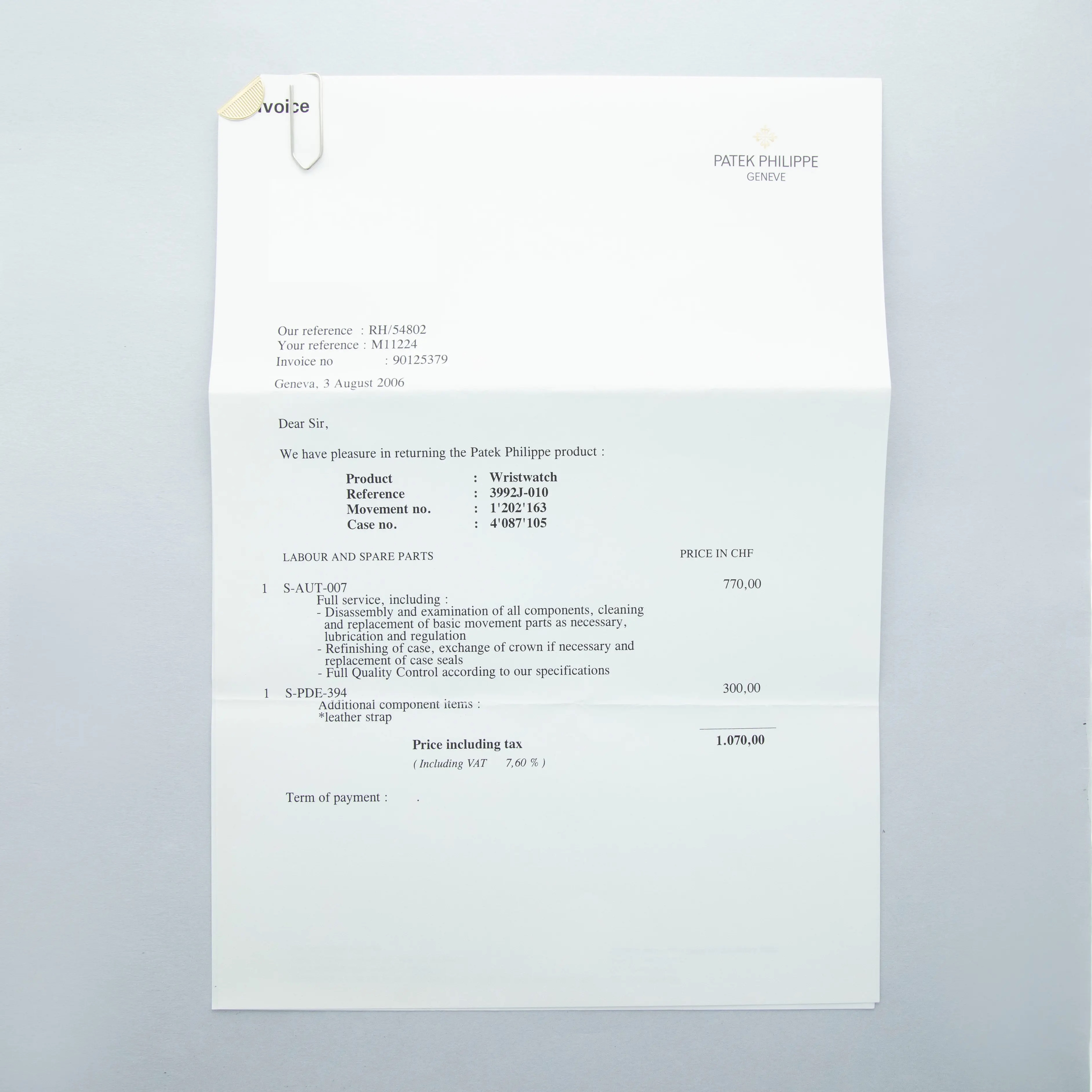 Watch, box, papers and 2006-dated Patek Philippe service invoice
