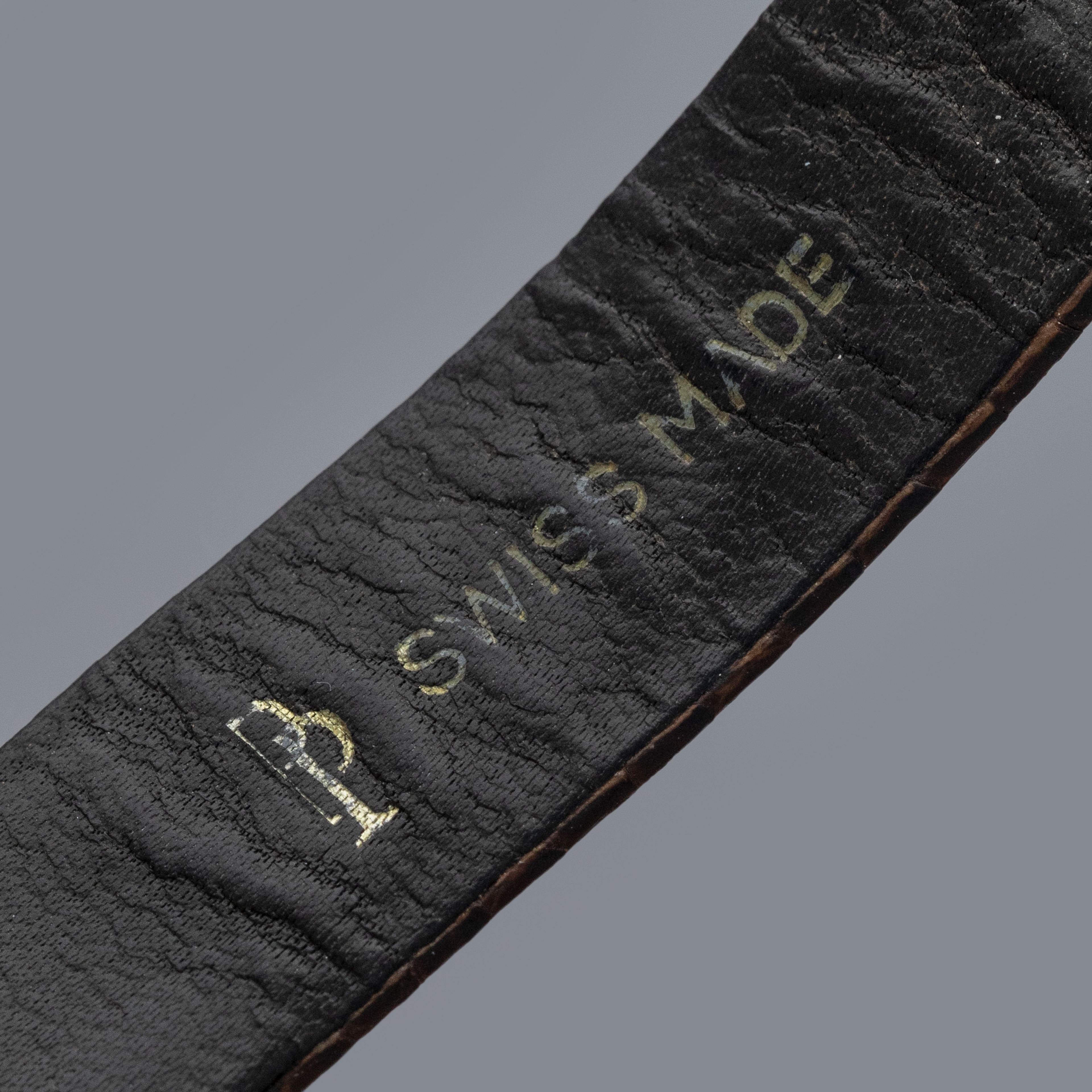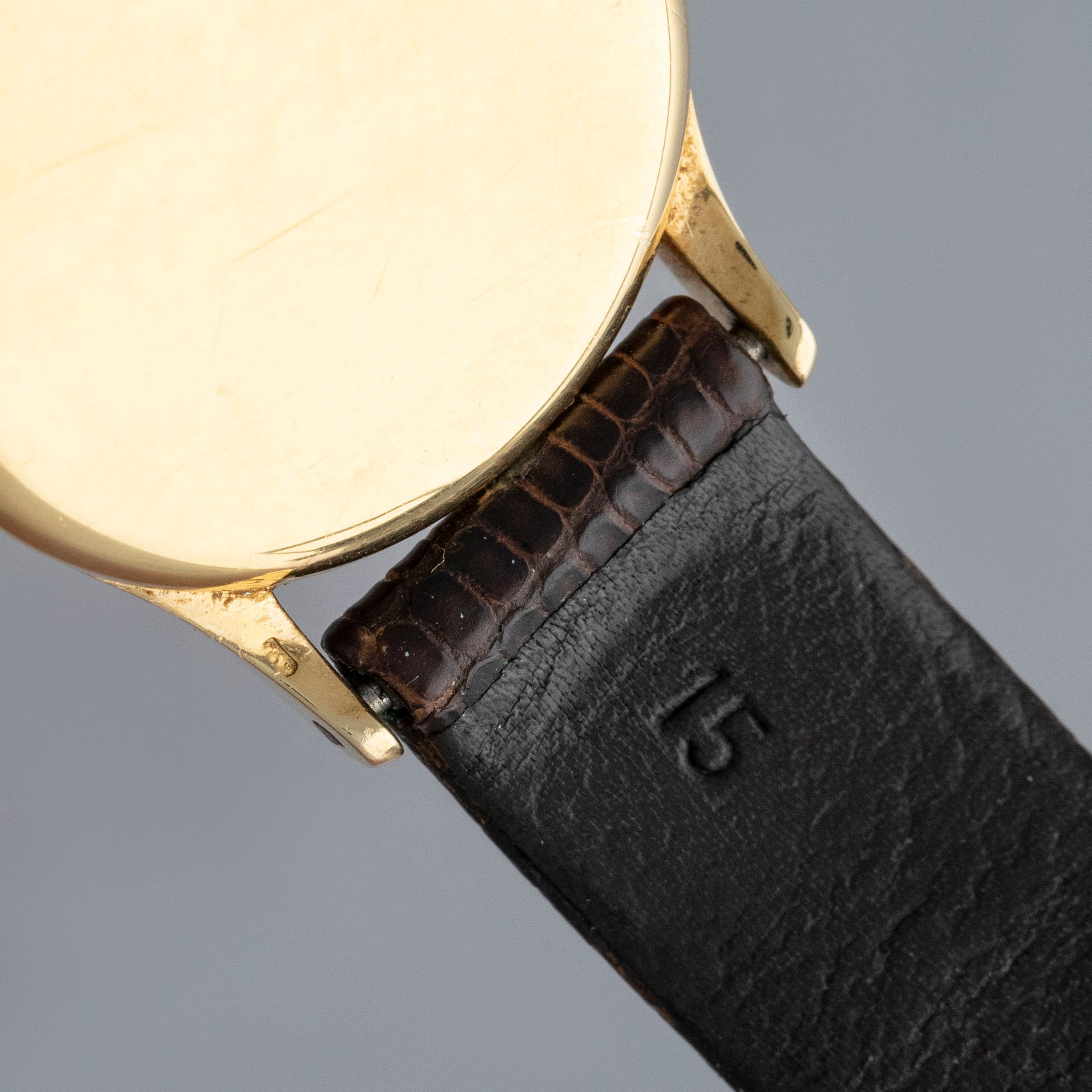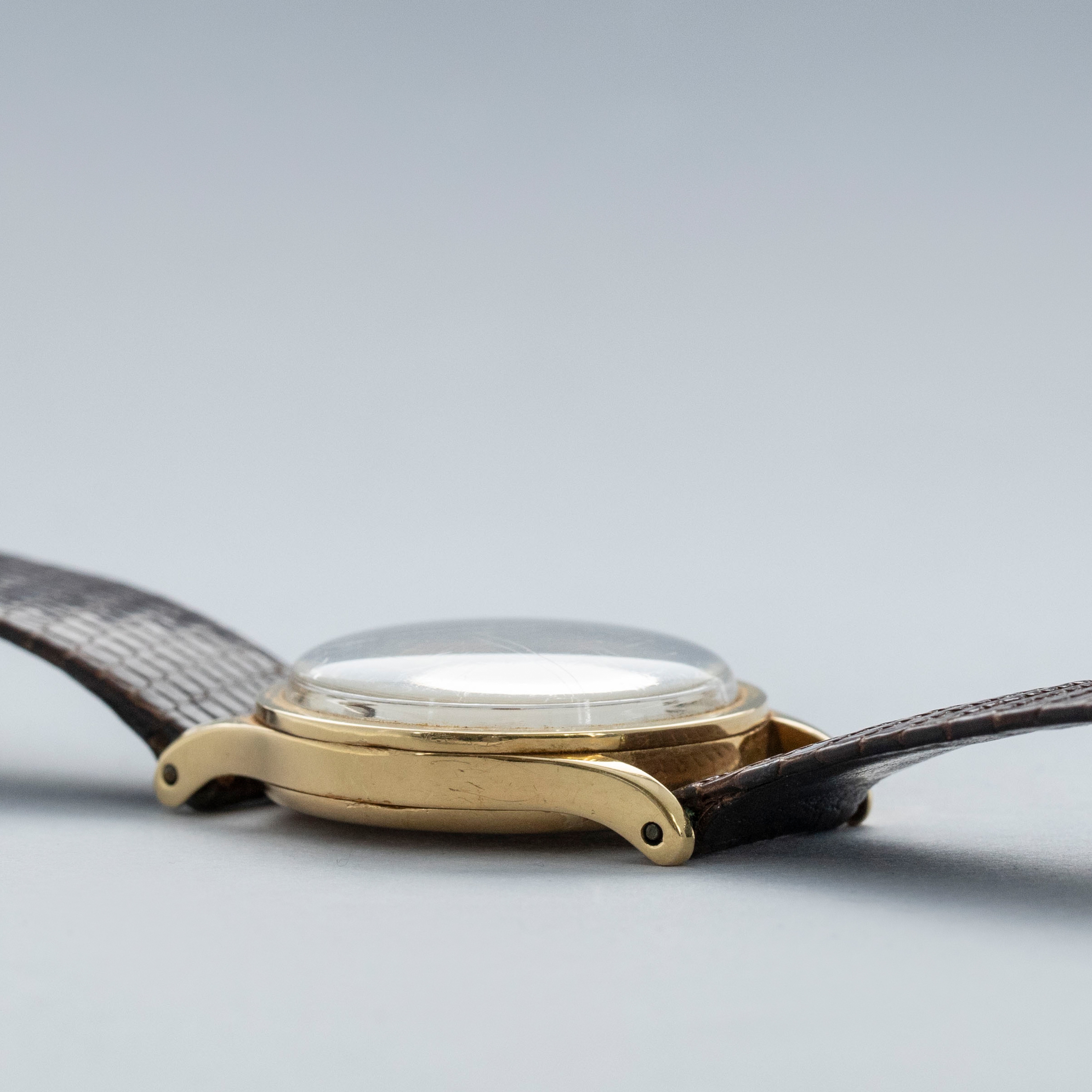 The watch is in overall very good condition. The yellow gold case shows scratches and marks, as well as soft edges as expected of a watch of this vintage. The case back has some scratches, and there is a partially legible hallmark on the back of the upper left lug. The original indelible dial has some light surface marks, with very clean applied Breguet numerals. The hands are clean. It is fitted with a brown lizard strap and a gold-plated pin buckle in good condition.
