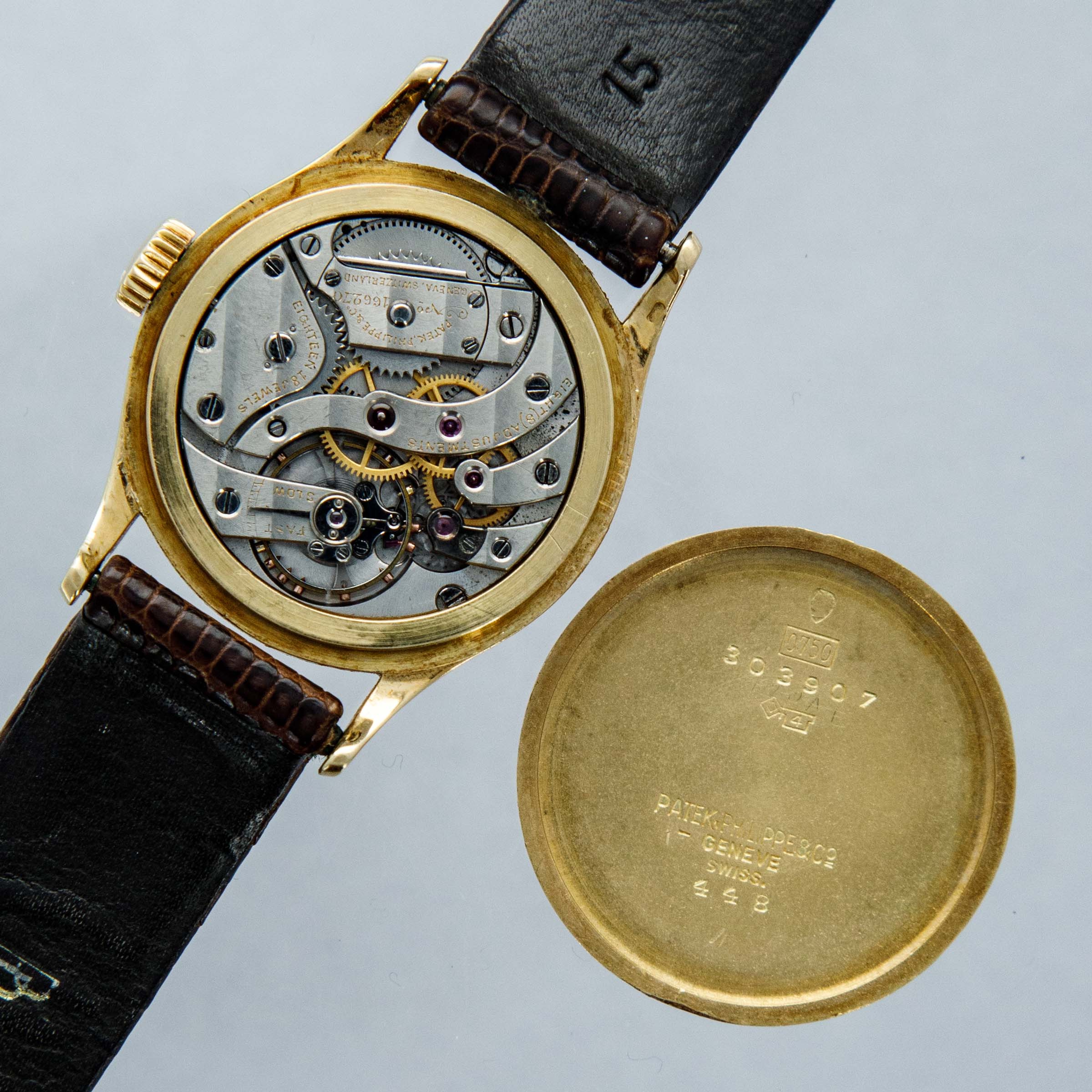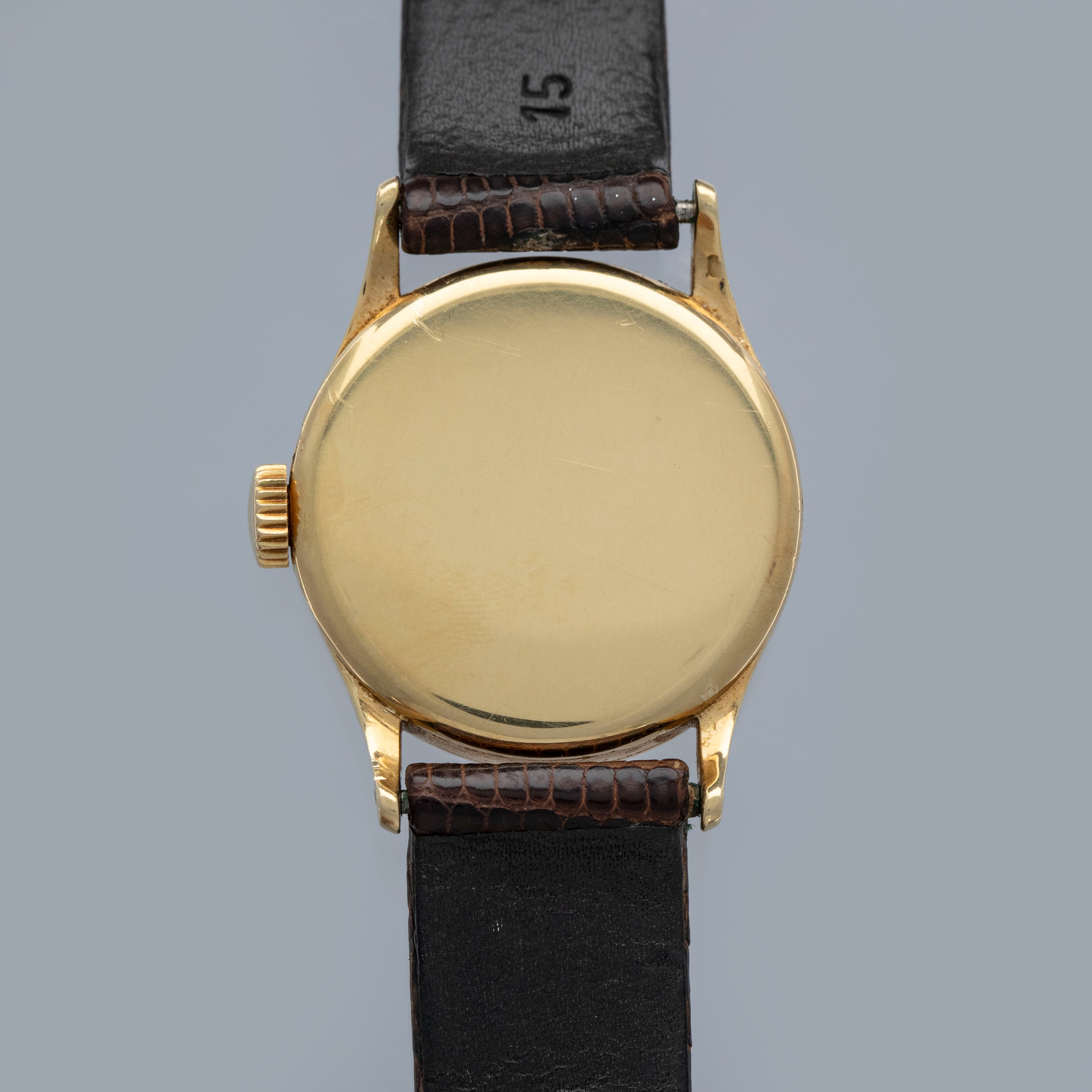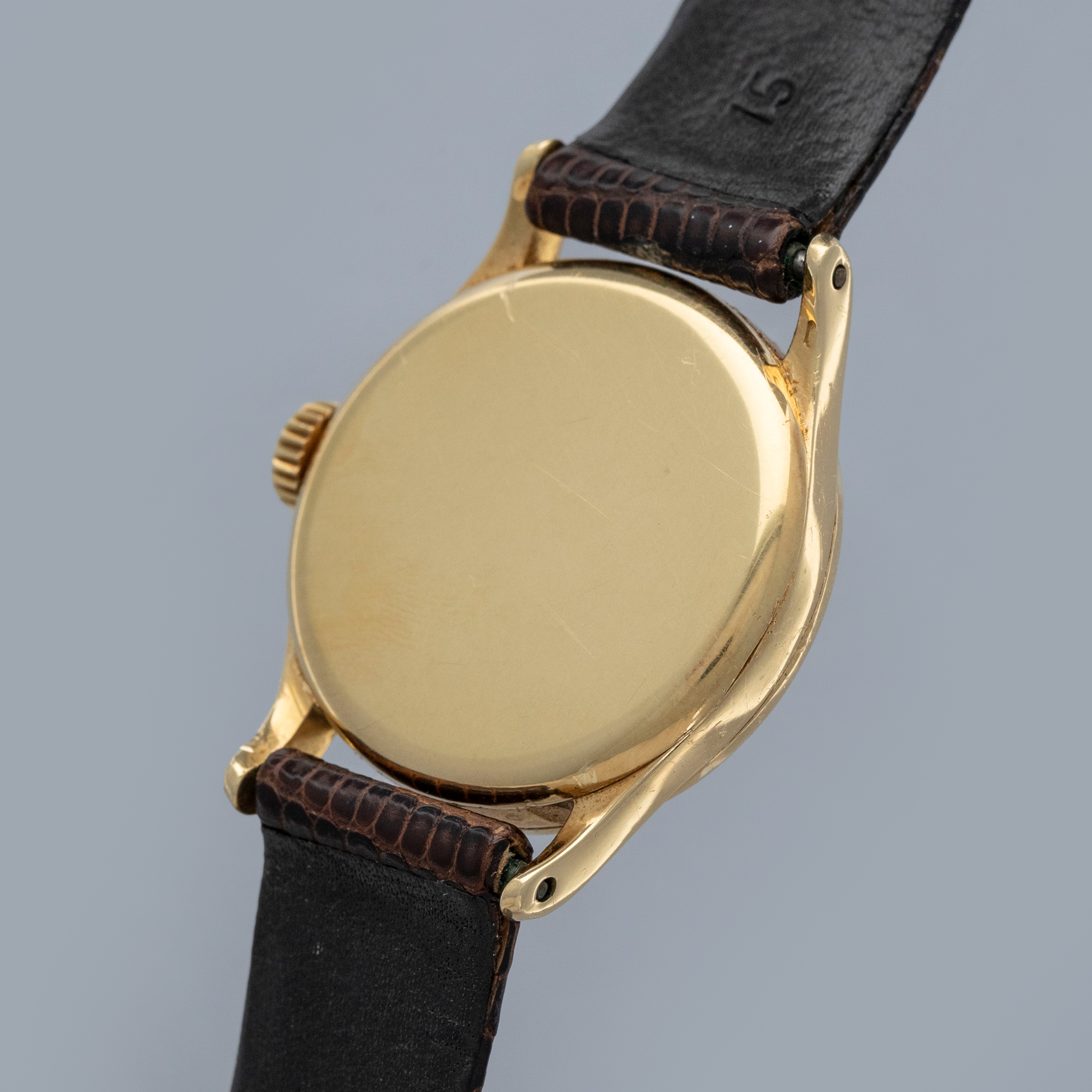 The watch is in overall very good condition. The yellow gold case shows scratches and marks, as well as soft edges as expected of a watch of this vintage. The case back has some scratches, and there is a partially legible hallmark on the back of the upper left lug. The original indelible dial has some light surface marks, with very clean applied Breguet numerals. The hands are clean. It is fitted with a brown lizard strap and a gold-plated pin buckle in good condition.