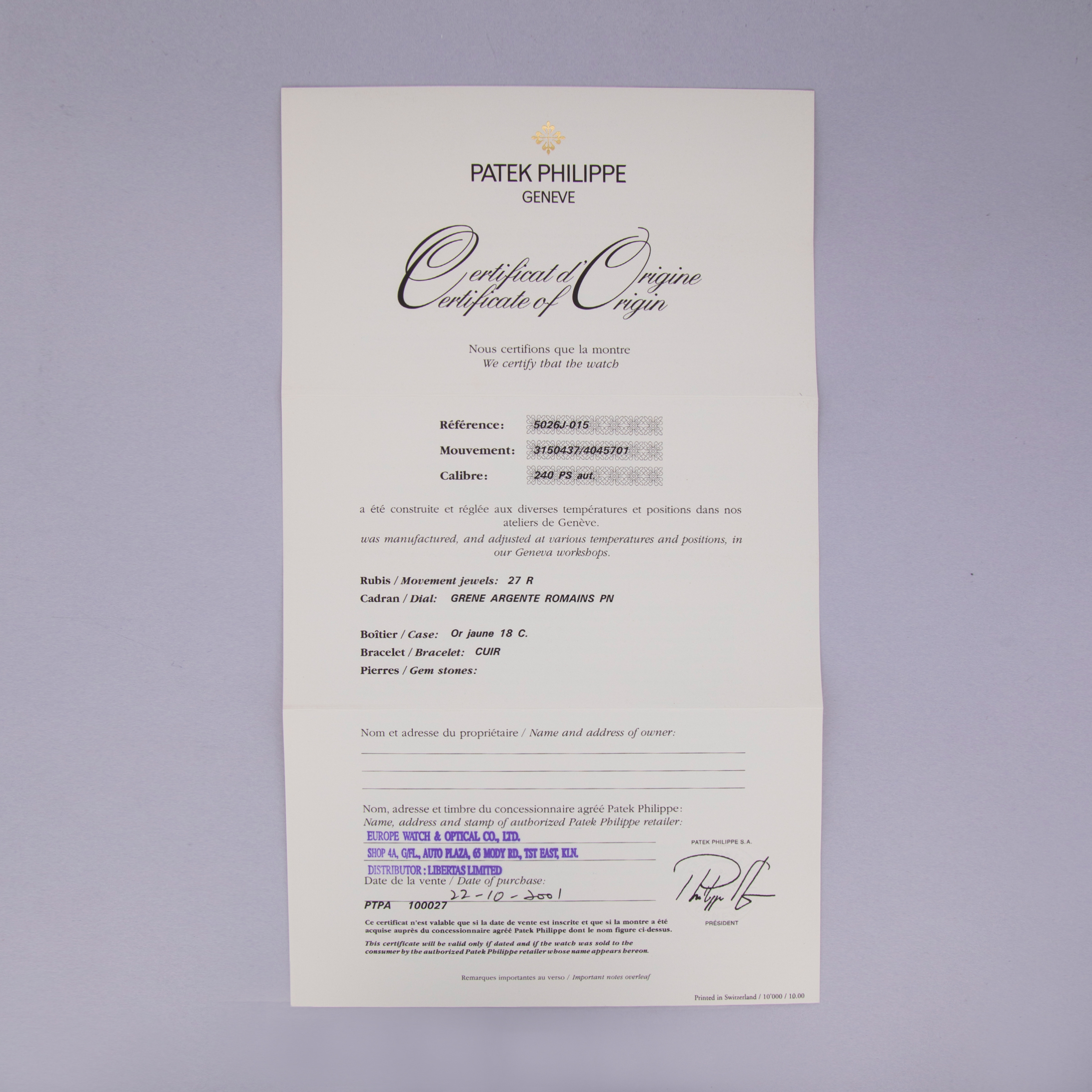 Patek Philippe Calatrava 5026J-015 Millenium Edition Silvered Dial 18k RG