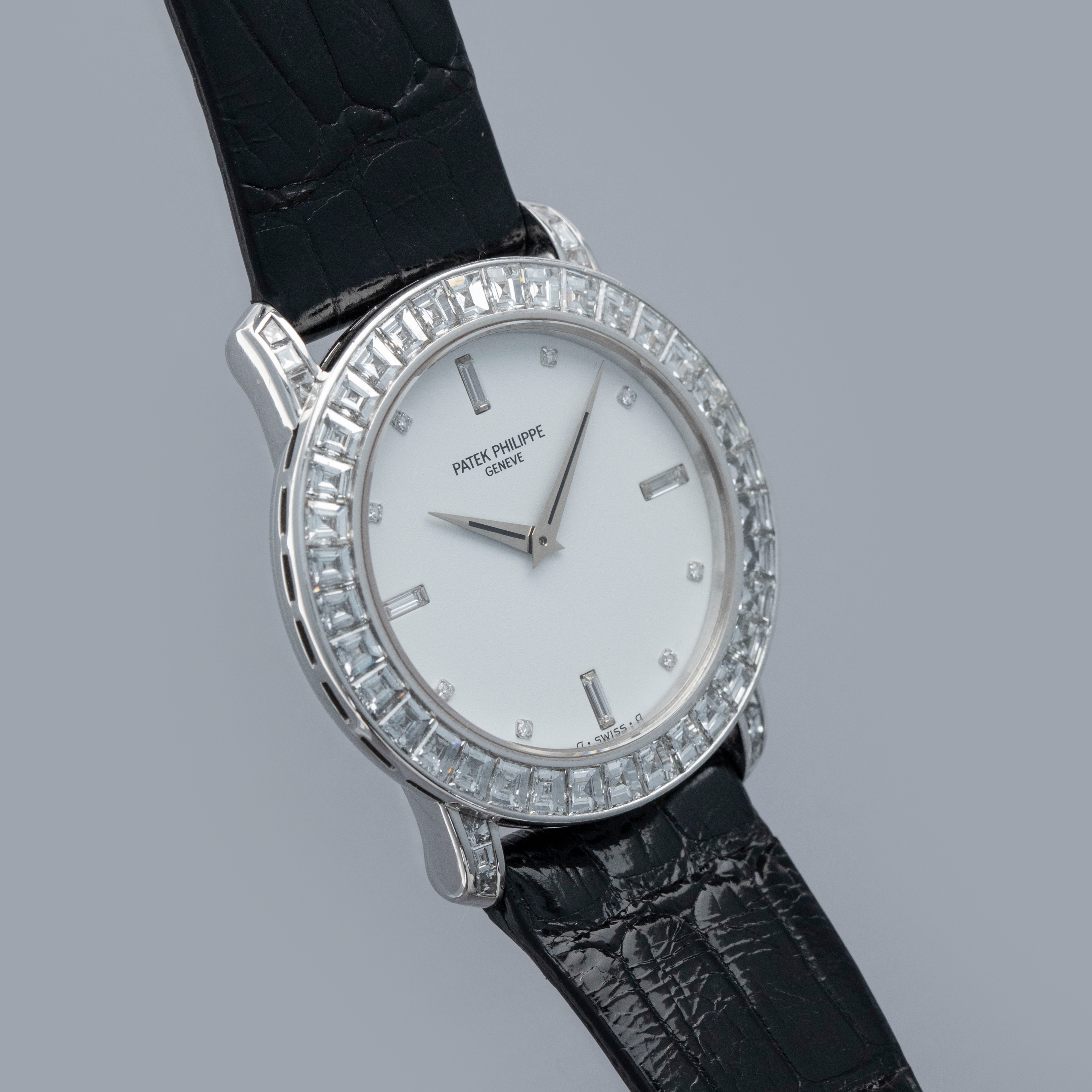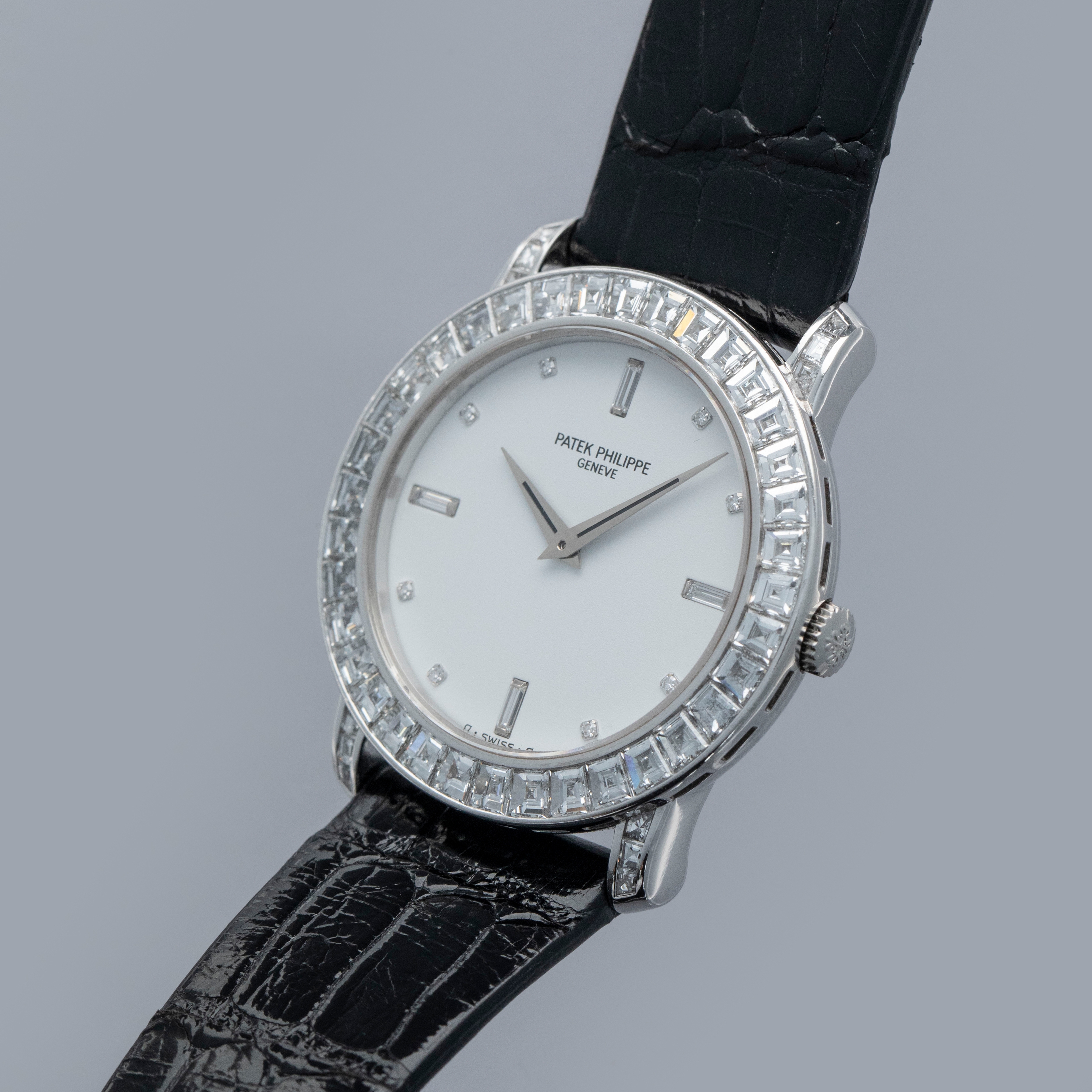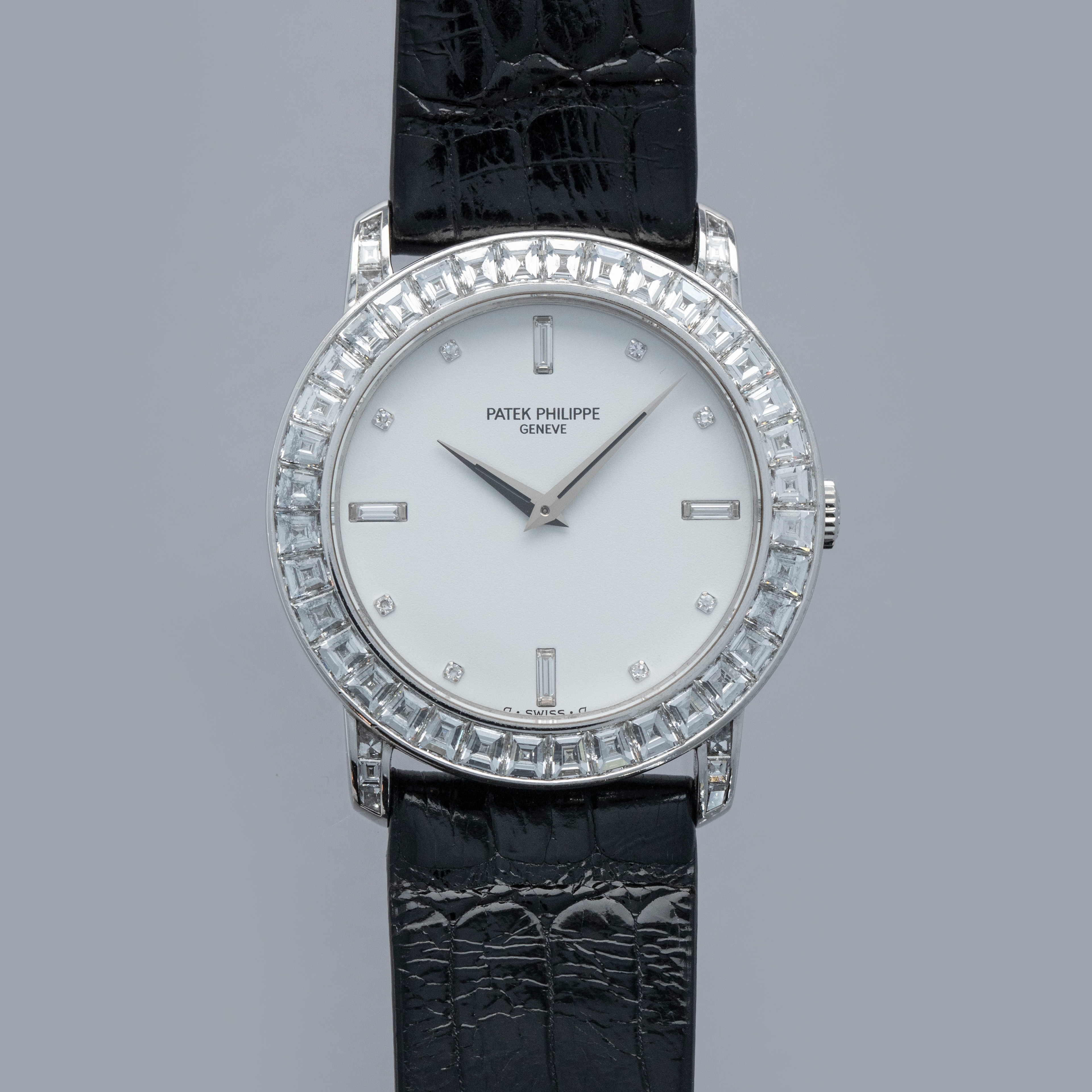 Released in 1932 and named after the cross that the Calatrava Knights paraded around Spain and Portugal during the 12th and 13th centuries, the Patek Philippe Calatrava was released as a simple timepiece with broad appeal that would help secure Patek Philippe's finances following Jean and Charles Henri Stern's investment in the brand in the same year. Designed with a strict Bauhaus-inspired aesthetic in mind, the Calatrava used, and continues to use, simplicity as its means of establishing intrigue around the craftsmanship required to construct such a stunning timepiece. Without a complicated movement or a busy design, collectors gravitate towards the Calatrava's clean aesthetic and practicality, however, every now and again Patek will create a special Calatrava that results from out-of-the-box thinking, which is exactly what we have here, the ref. 5027P. Launched in the mid-1990s, the ref. 5027P was a classically-sized Calatrava variant at 33mm in diameter, but its construction is far from normal. Made of platinum, its entire case is diamond-set with 48 Top Wesselton baguette diamonds weighing a total of 4.01 carats. Fit with a white diamond dial to suit its diamond-set case, this is easily one of the most opulent Calatravas ever made.